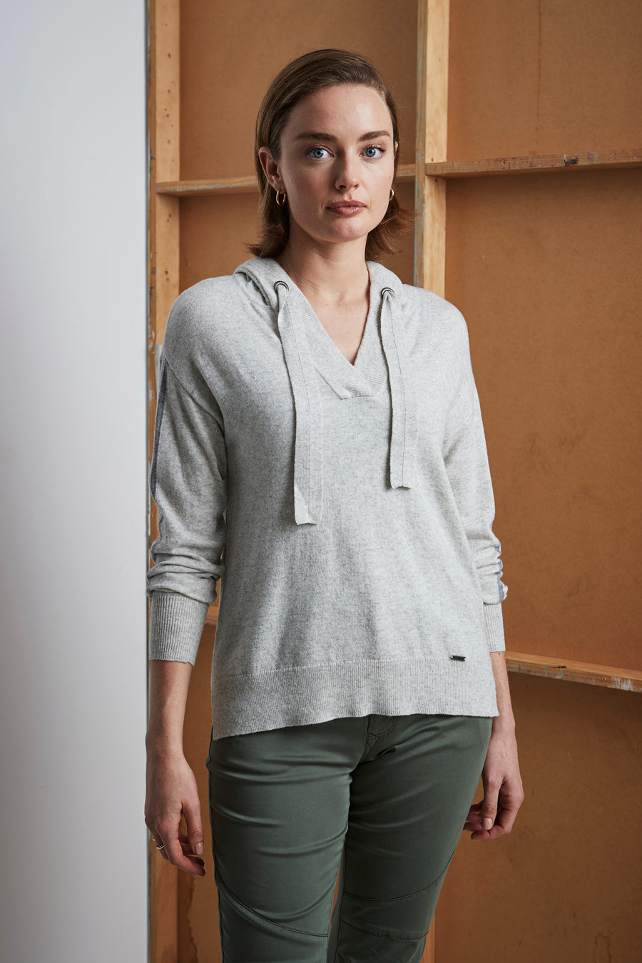 A smart sporty, soft knit sweater — long sleeves, featuring; contrast stripes down the sleeve, and a chunky drawcord at neck. Available in vibrant colours.