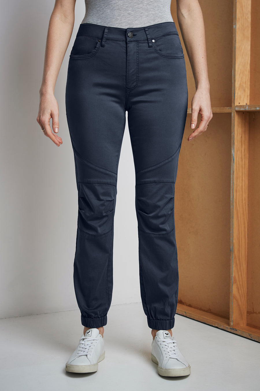 A cool casual slim-fit pant with elasticated hem; jean pocket, fly front detail and panelling at knee. The soft handle and slightly distressed finish is achieved by special garment wash.