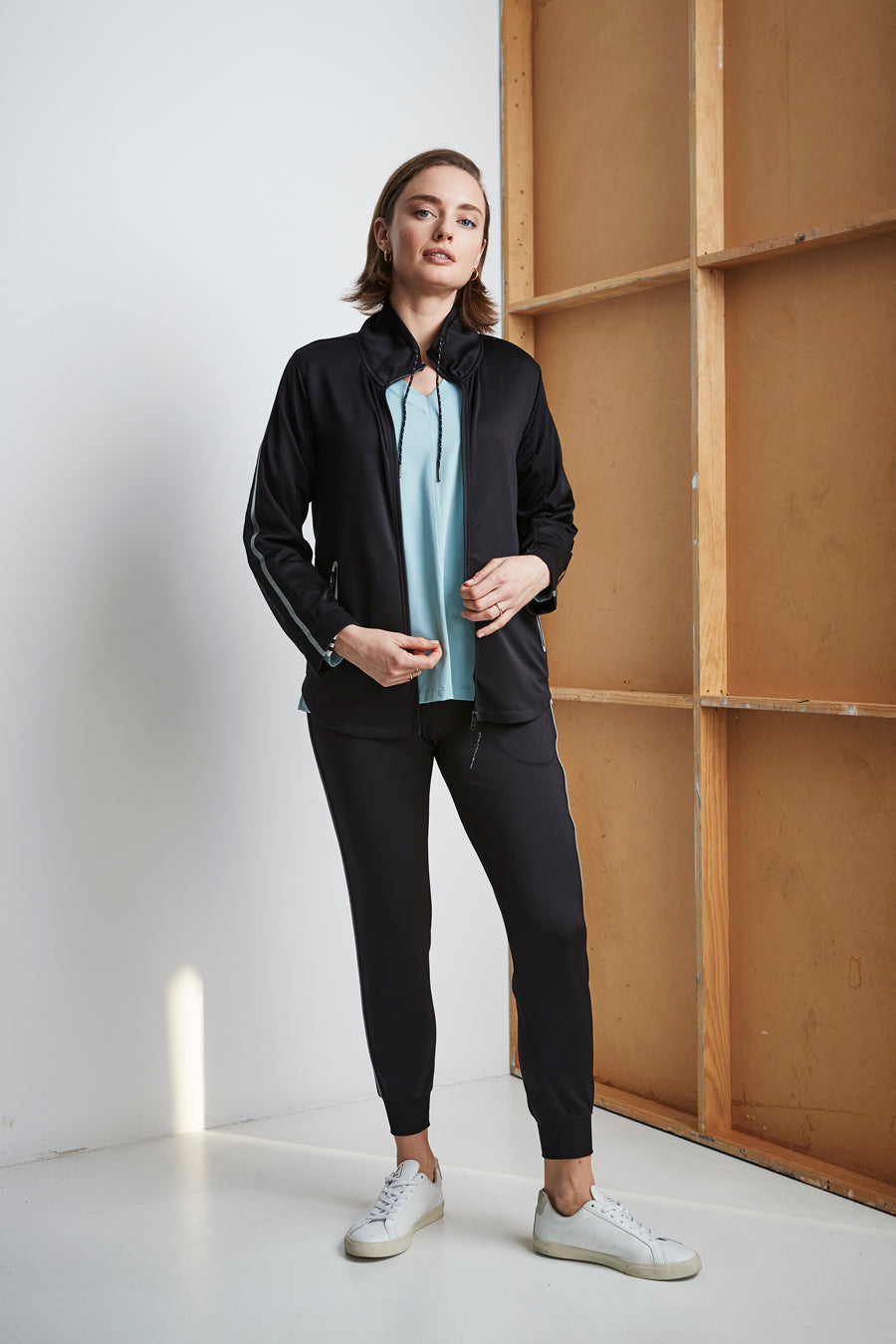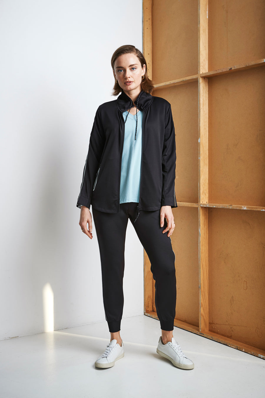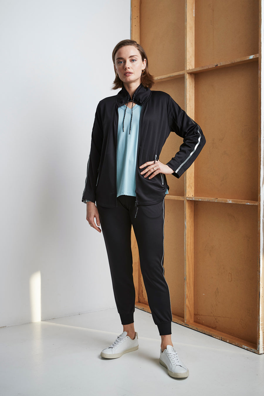A smart sporty shaped jacket; stand up collar and novelty drawcord. Zip pocket with contrast heat seal detailing. Long sleeve with stripe tape and under sleeve rib cuff for extra comfort.