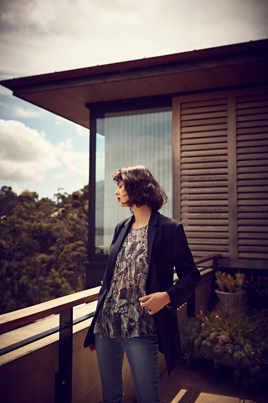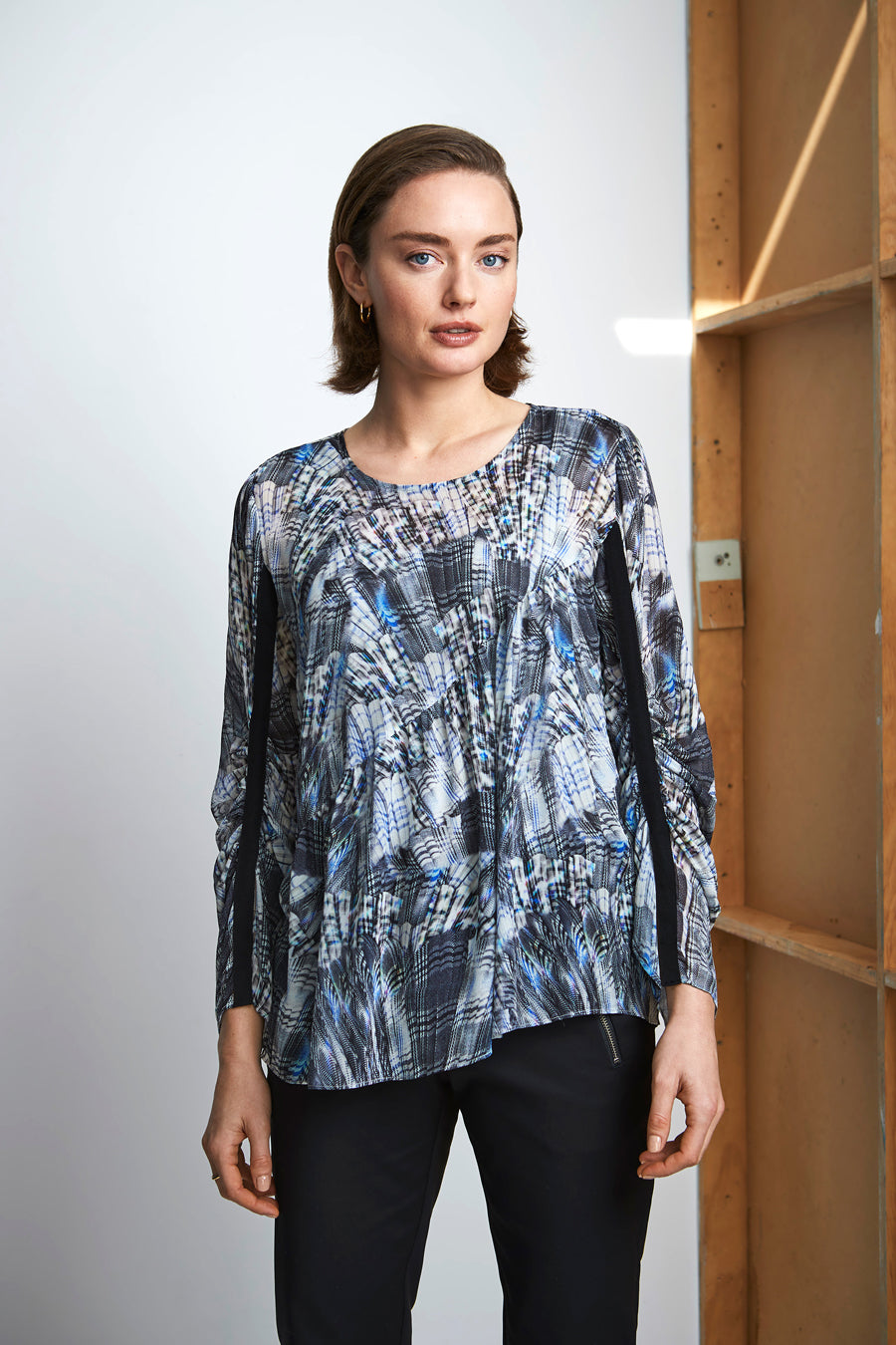 Our plaid around print top in soft sheer viscose — tiered to perfection with asymmetrical frill around the bodice; long sleeves with novelty tape detail.
