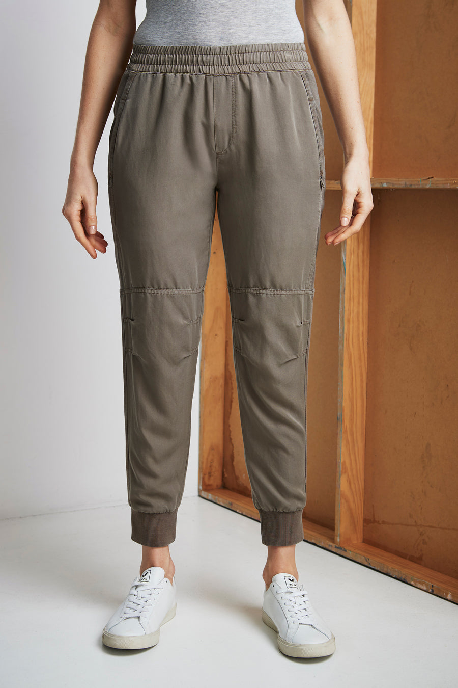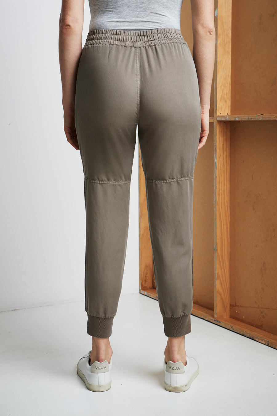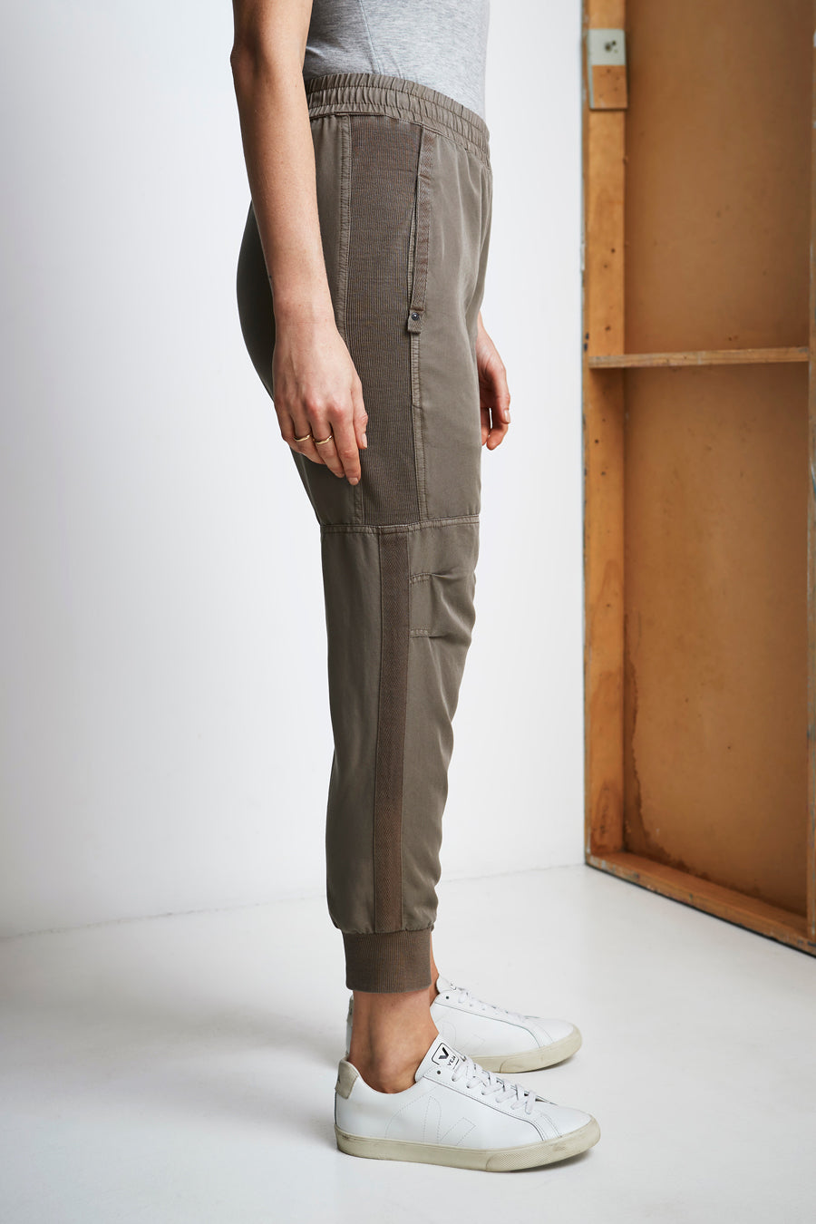 Casual weekend 7/8 pant, easy fit elastic waist, functional front pockets, featured contrast rib side panel and hem cuff. Garment dyed to achieve a distressed look and soft hand feel.