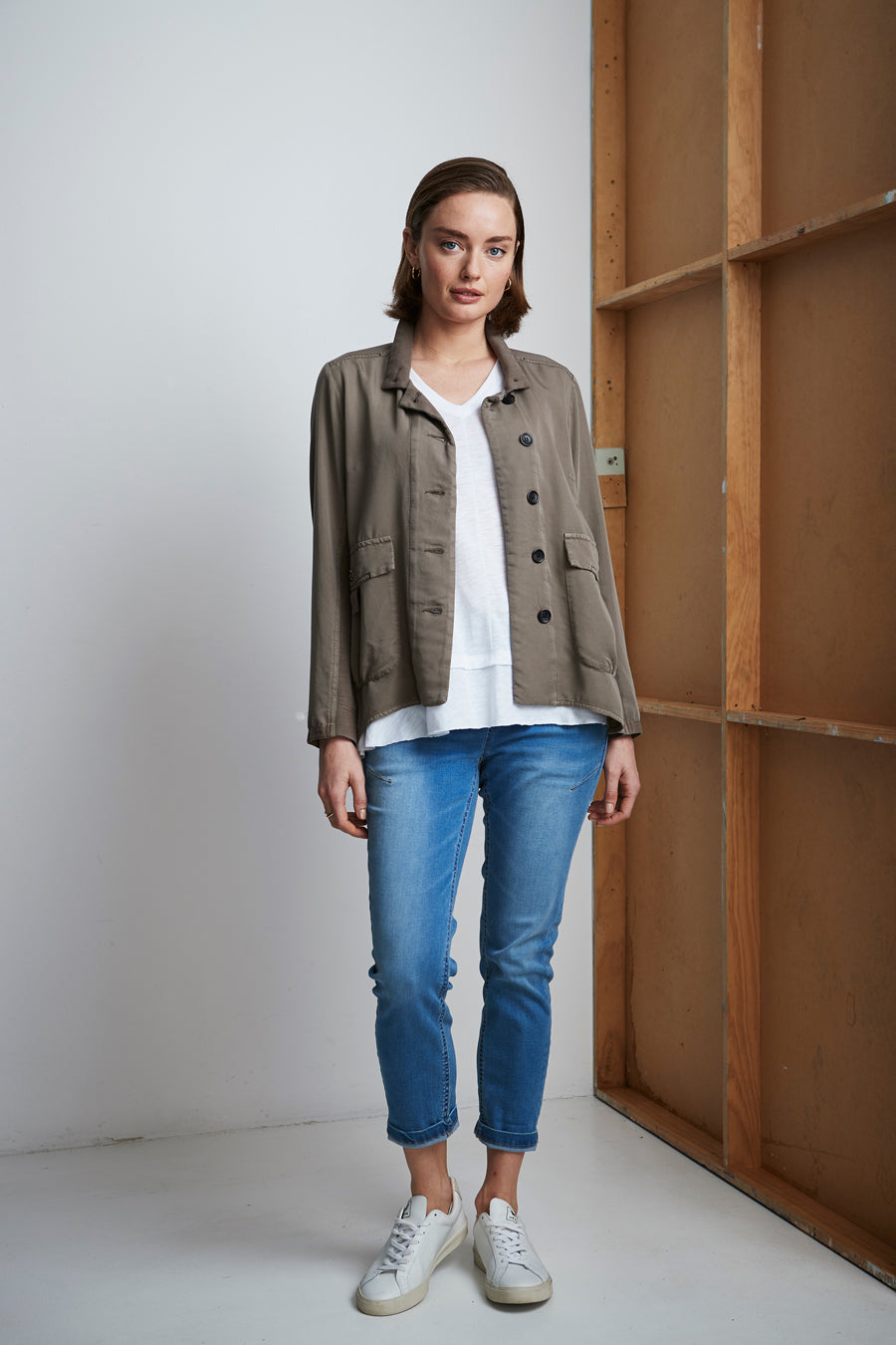 Casual weekend light weight jacket; soft viscose with stretchy rib panels at inner sleeve. Featuring stylish hardware, garment dyed to achieve a distressed look and soft hand feel.