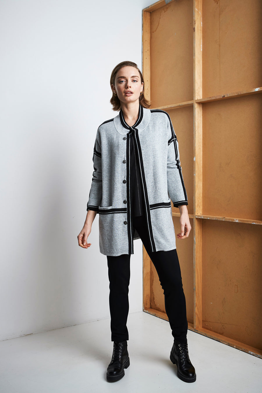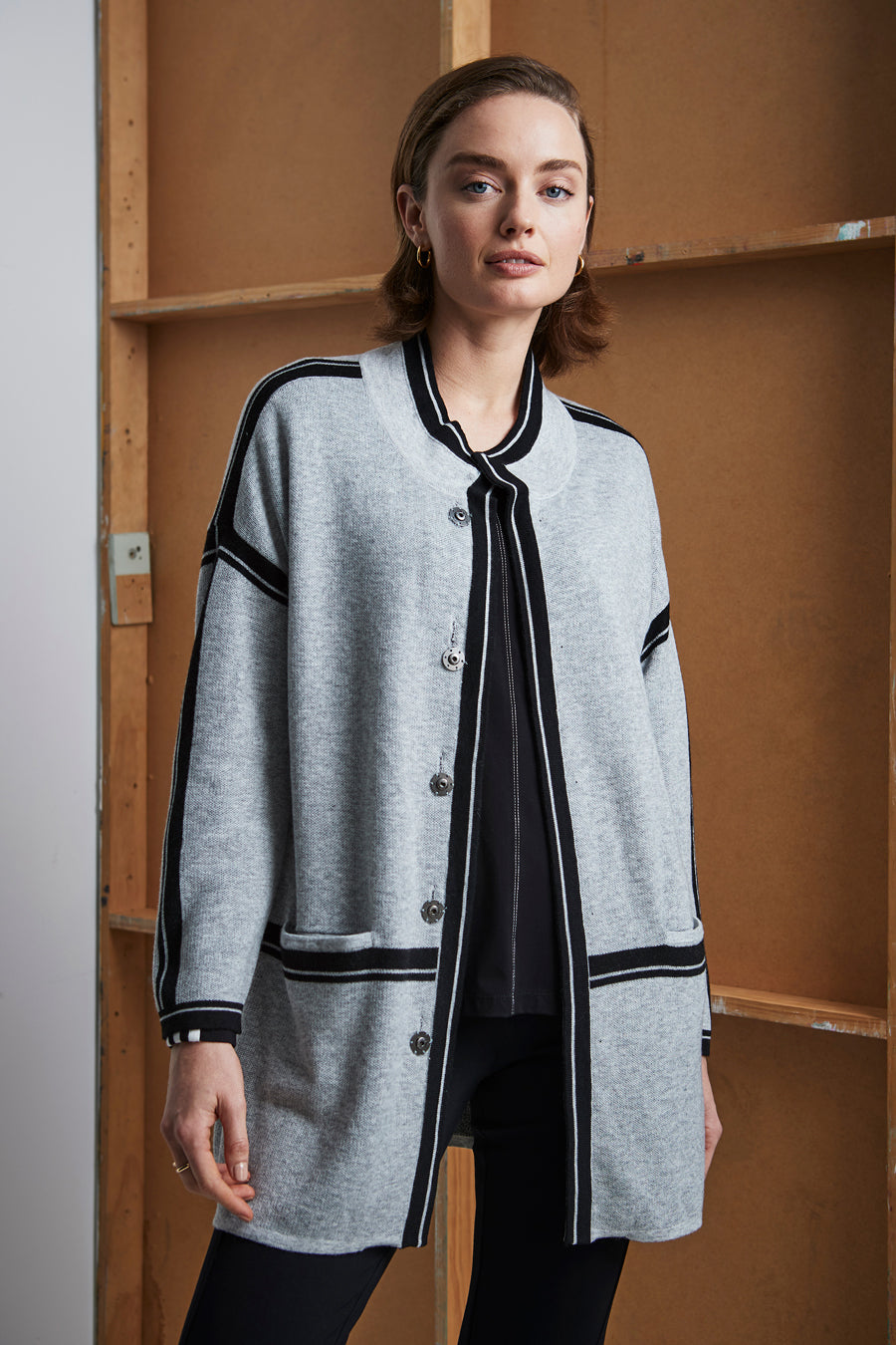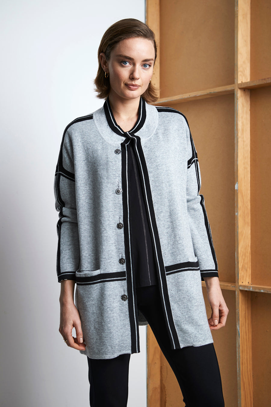 This long line cardi — not-to-be-missed; stand collar, drop shoulder, domed front opening and front pockets. Showcasing clean contrast stripes around collar edge, front opening, centre back, waist and sleeves.