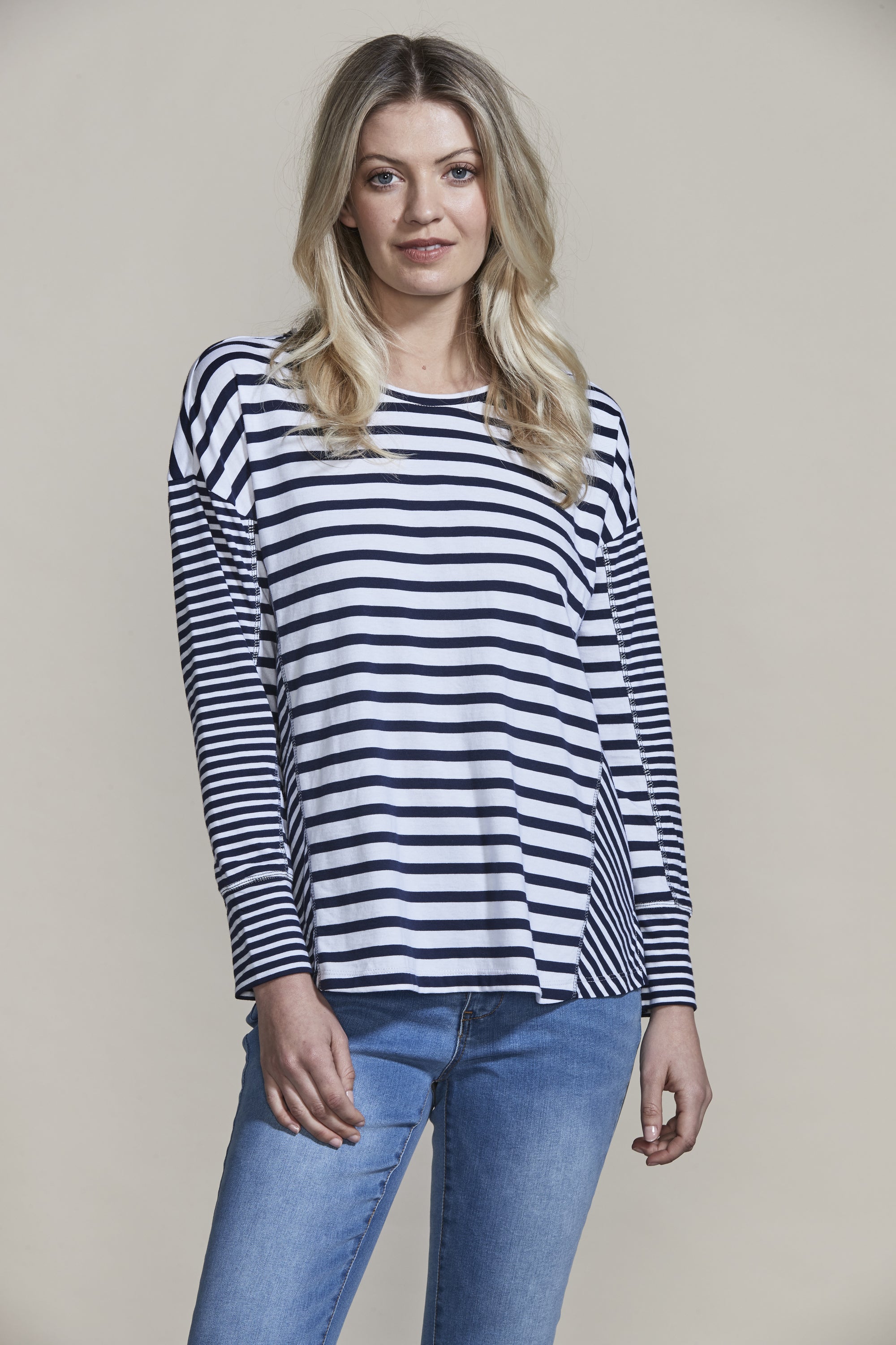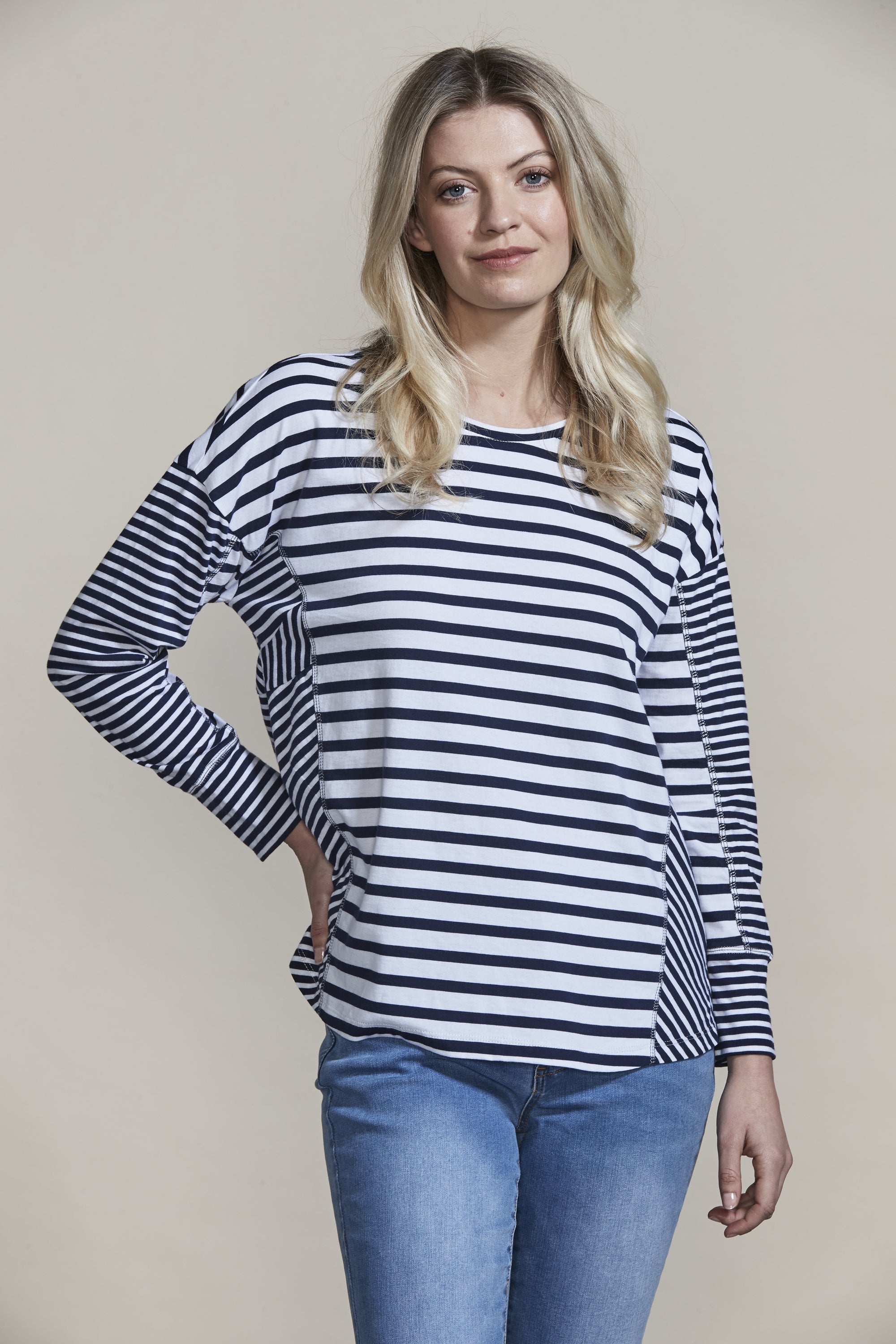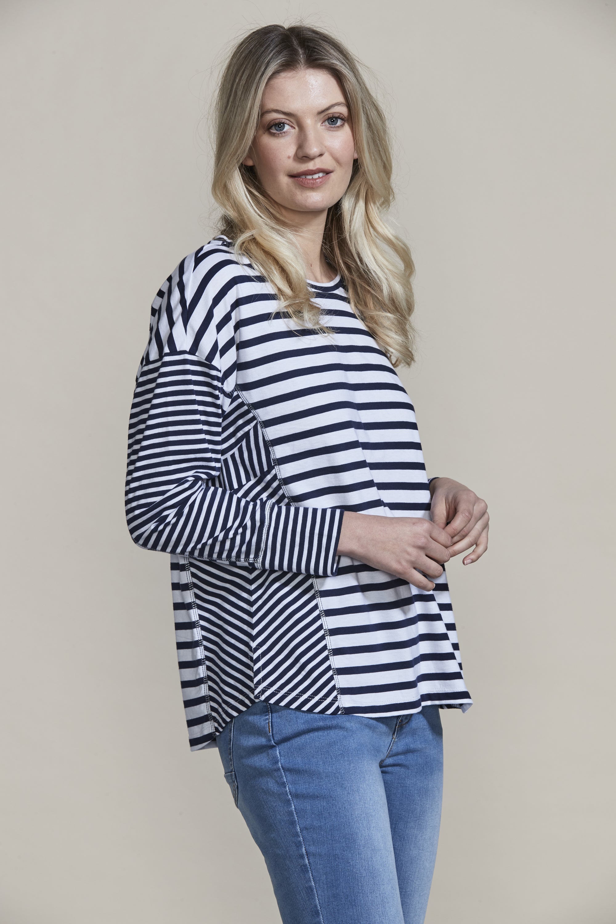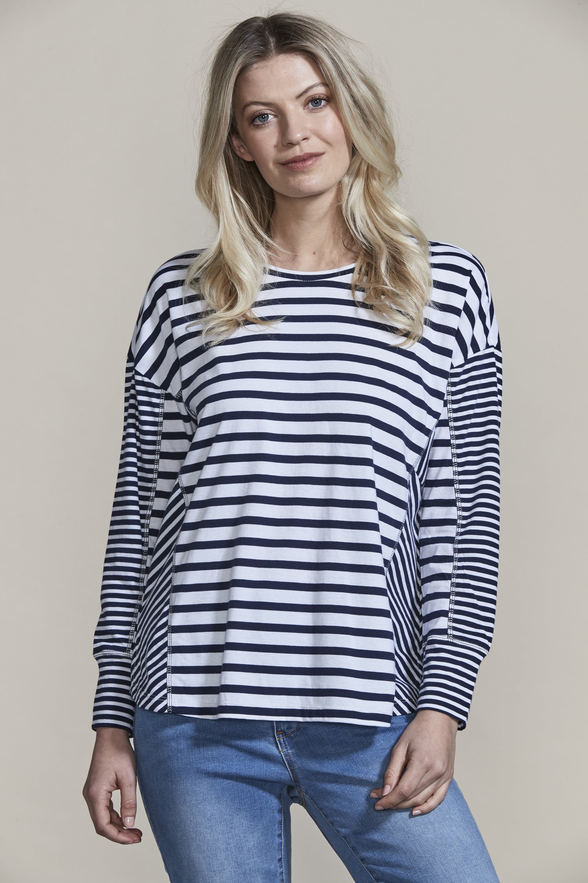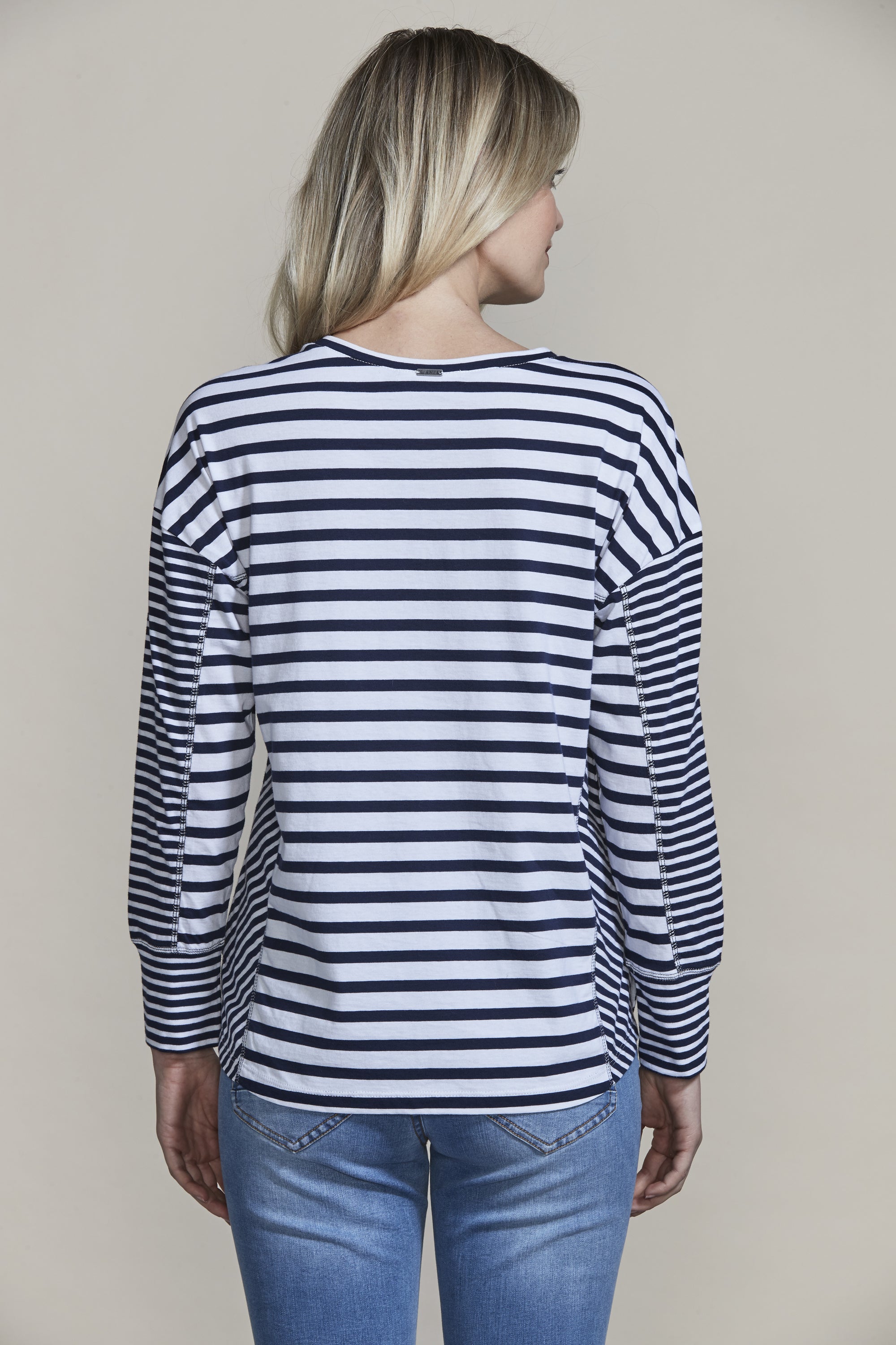 The cuffed long sleeve and drop shoulder is designed with winter comfort in mind, but this stripe cotton jersey is also a great transeasonal piece. The coverstitch detail and varied stripe panelling create a unique sporty feel.
