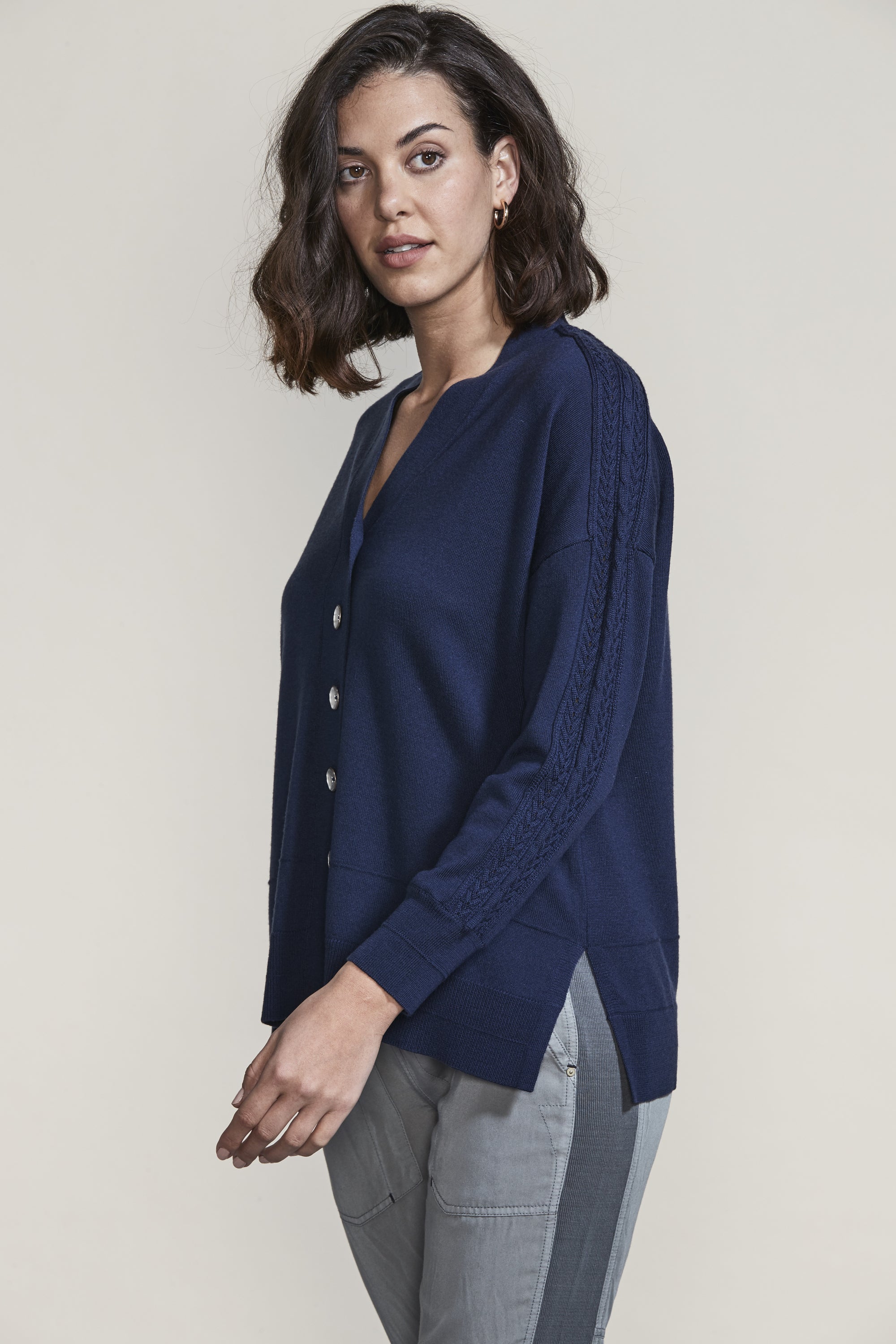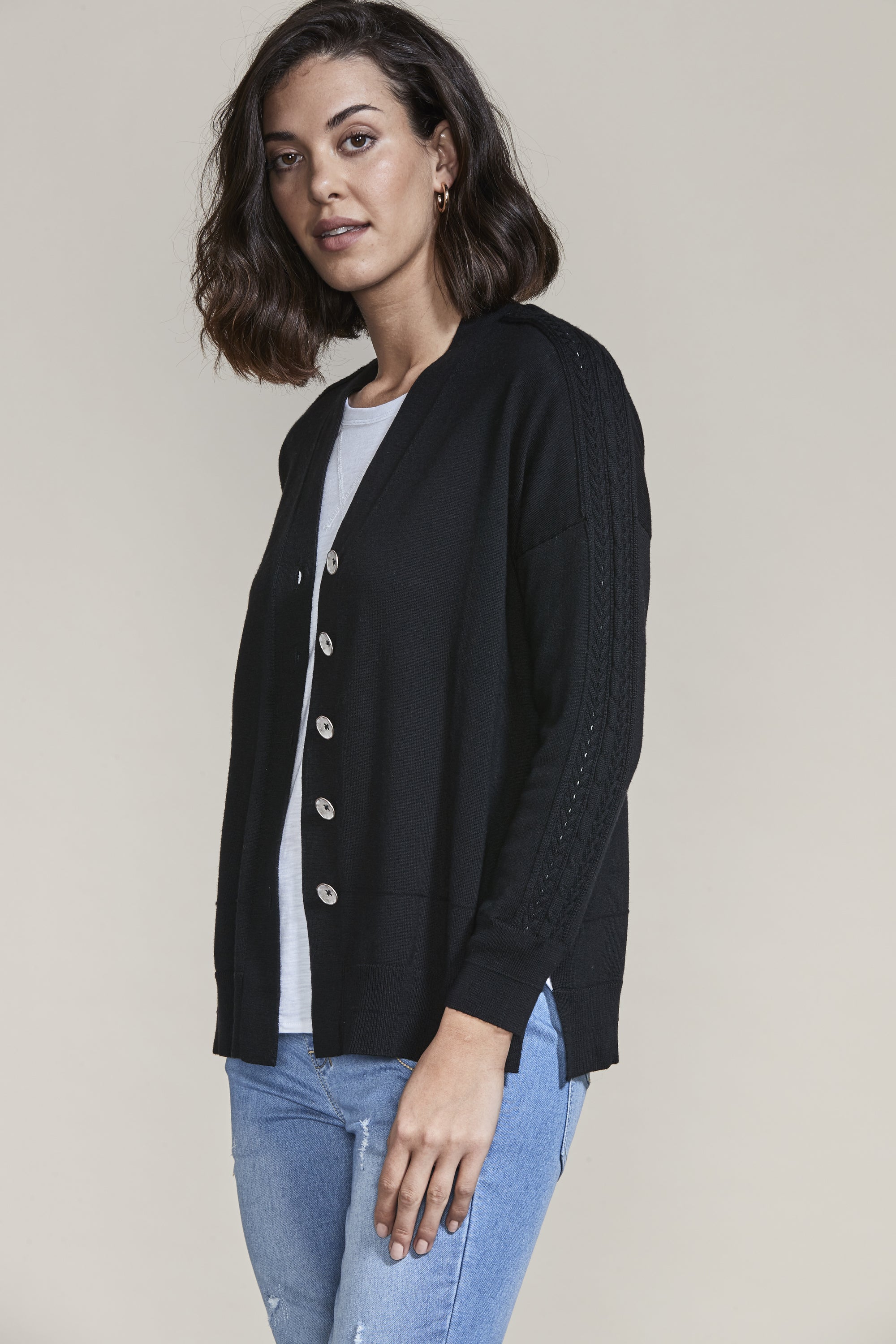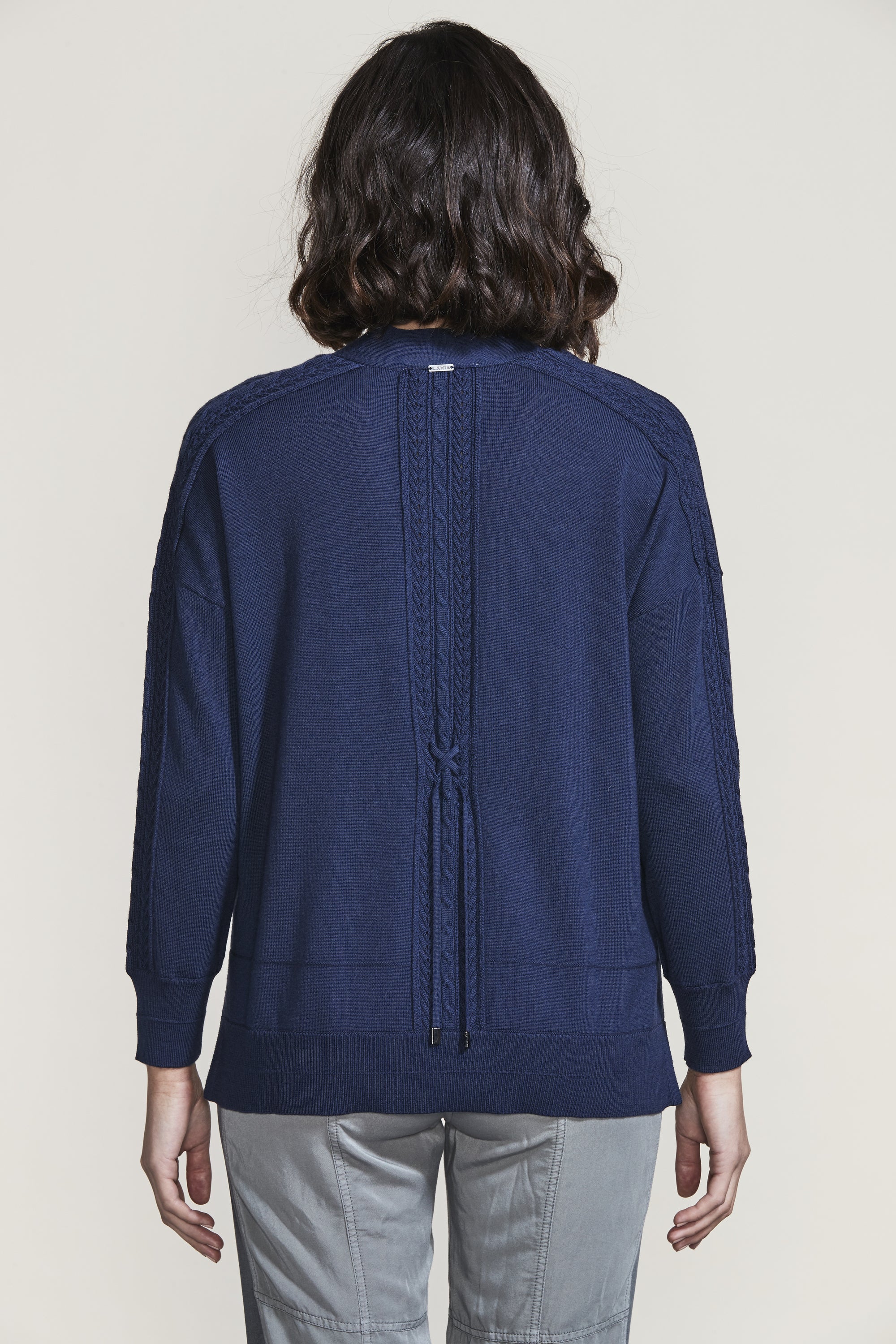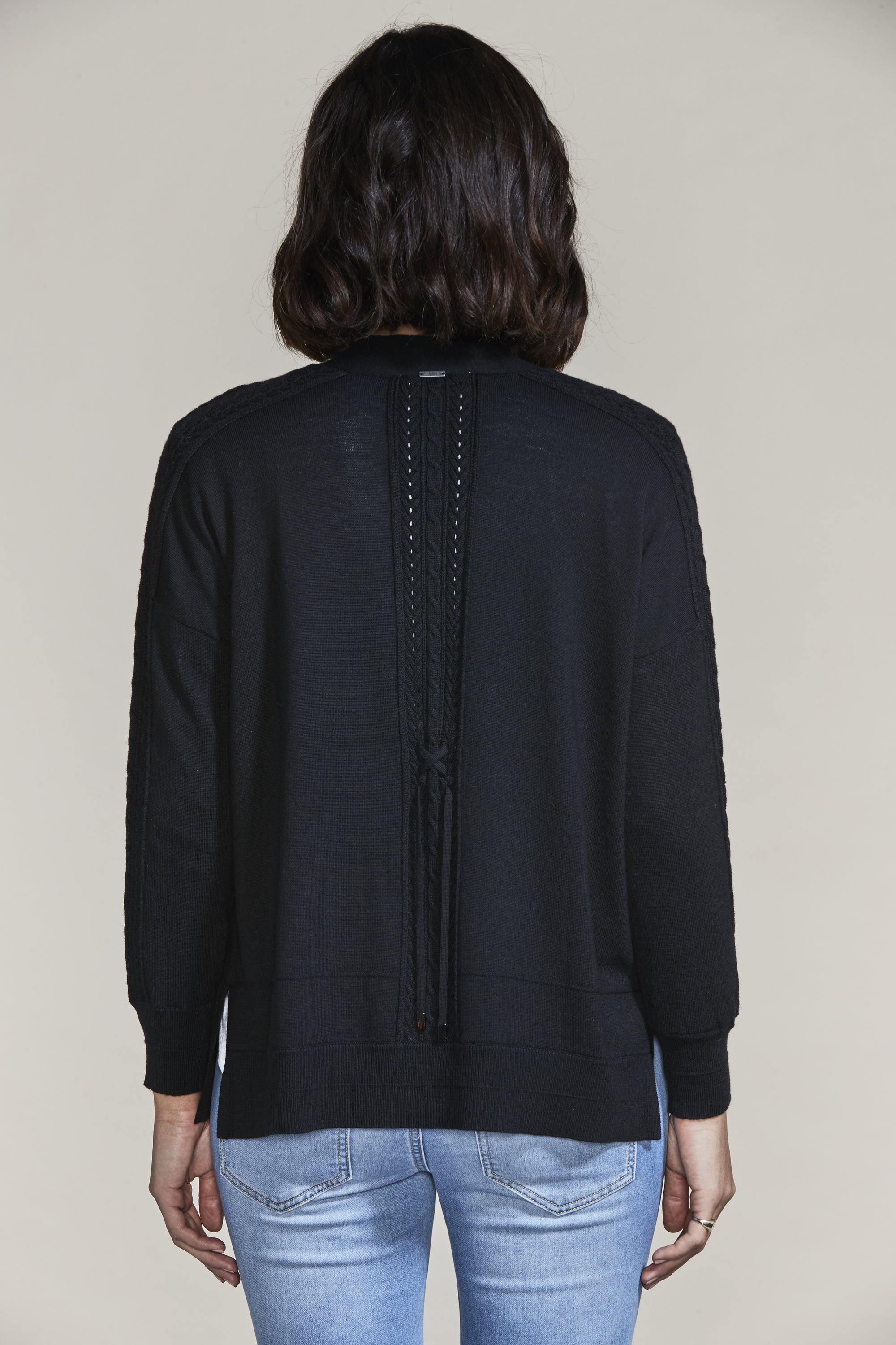 A relaxed fit drop shoulder cardi in soft merino wool. This elevated winter staple comes with a knit cable design at the overarm and centre back, and a decorative lace-up tie with metal ends at the back. The raised stitch detailing at the cuff and hem adds extra finesse to this stunning knit.