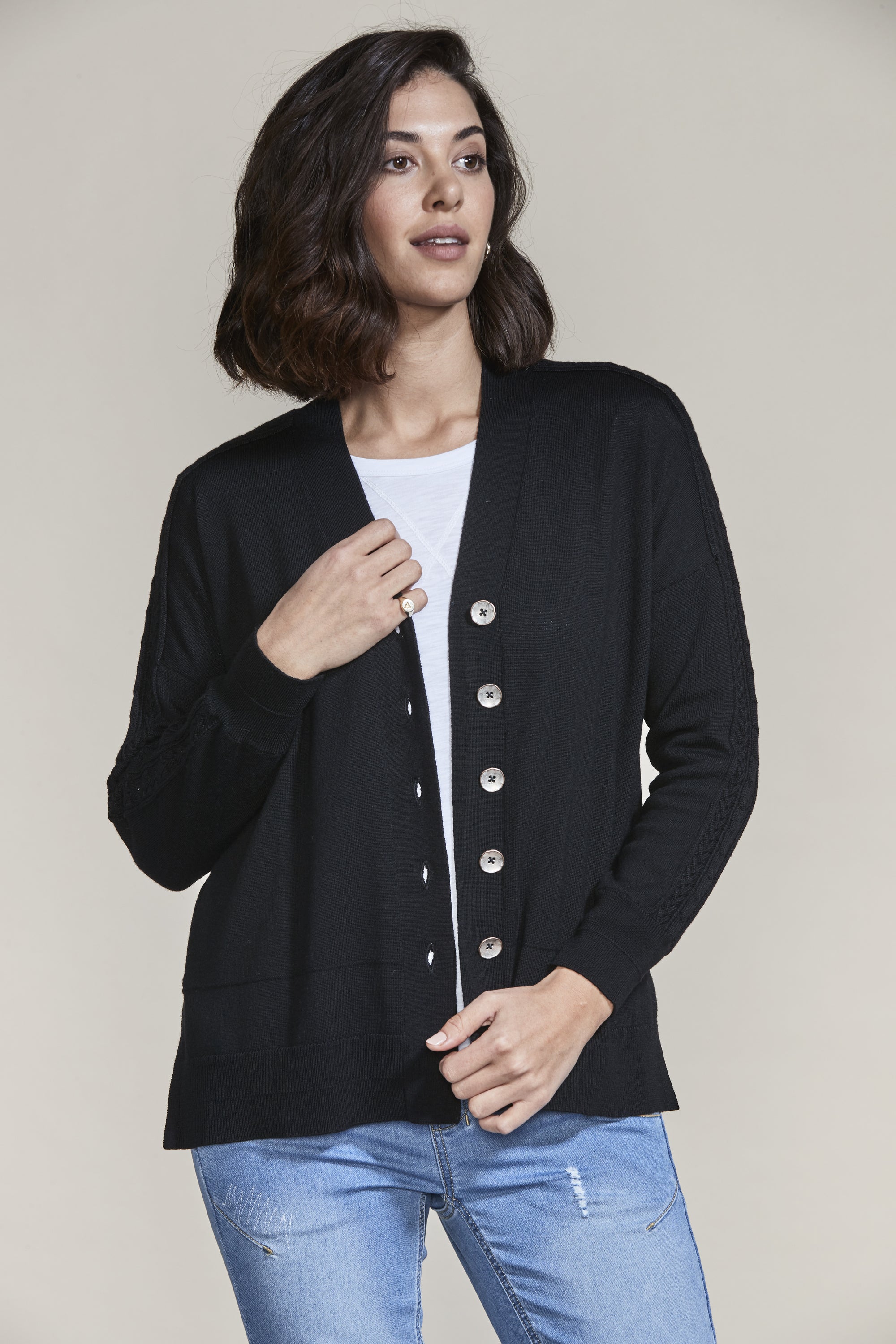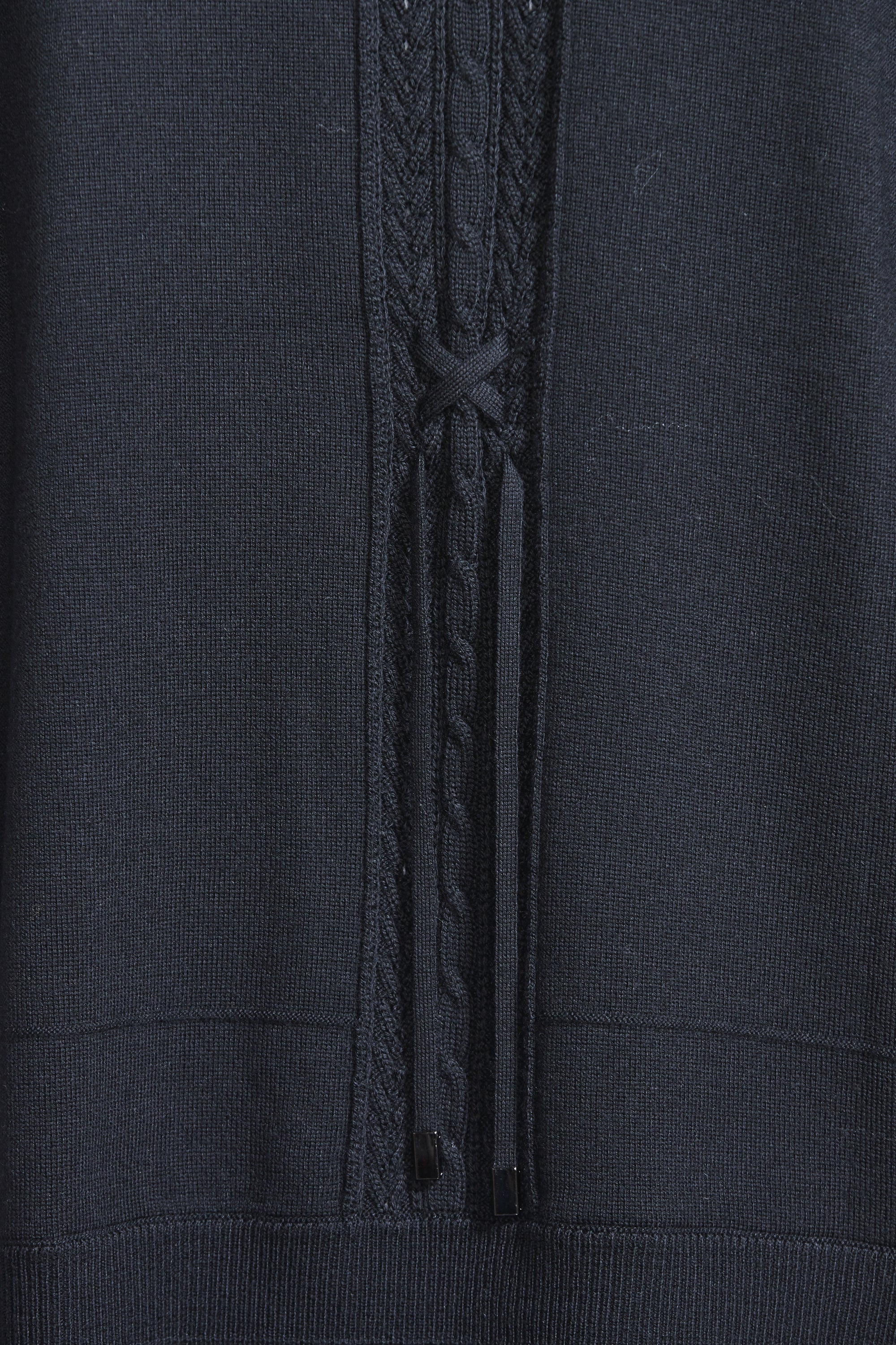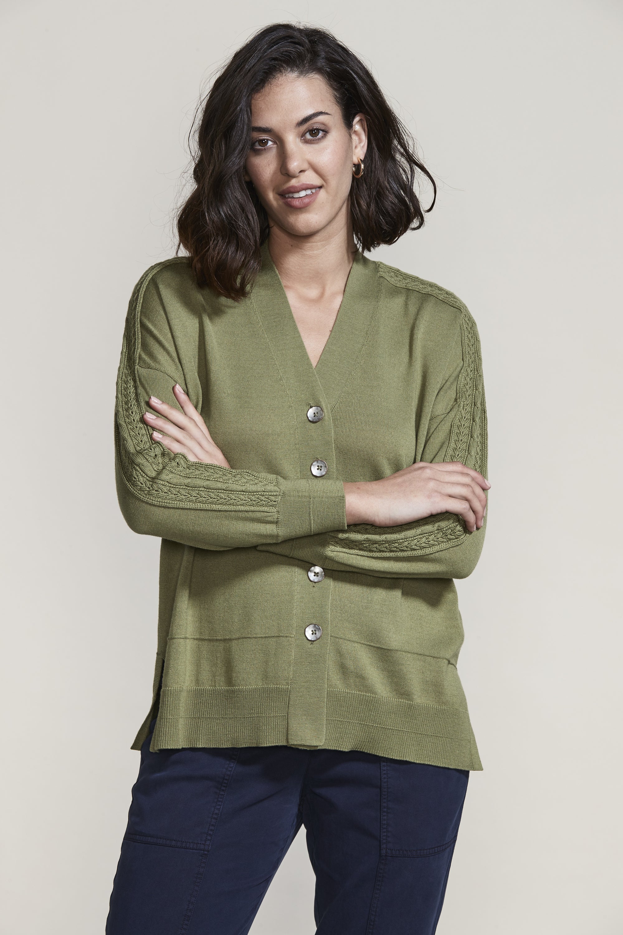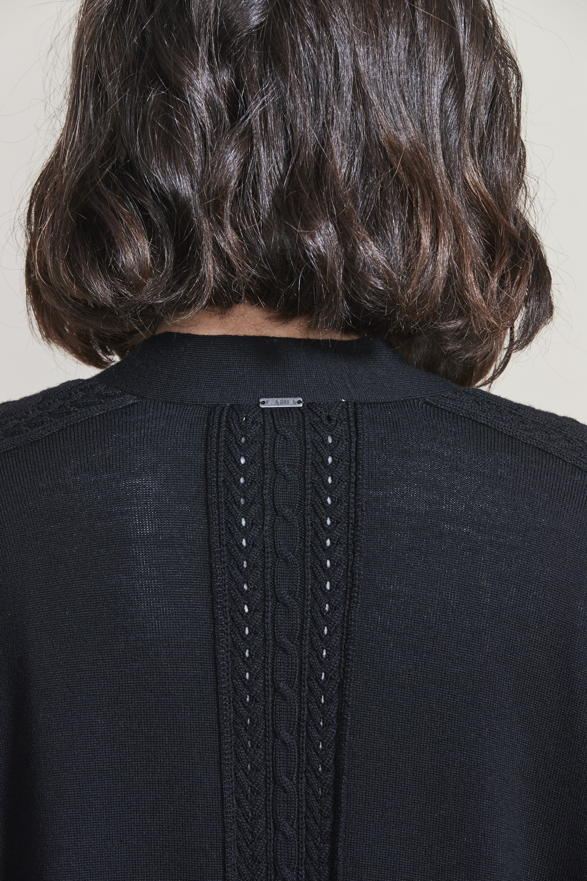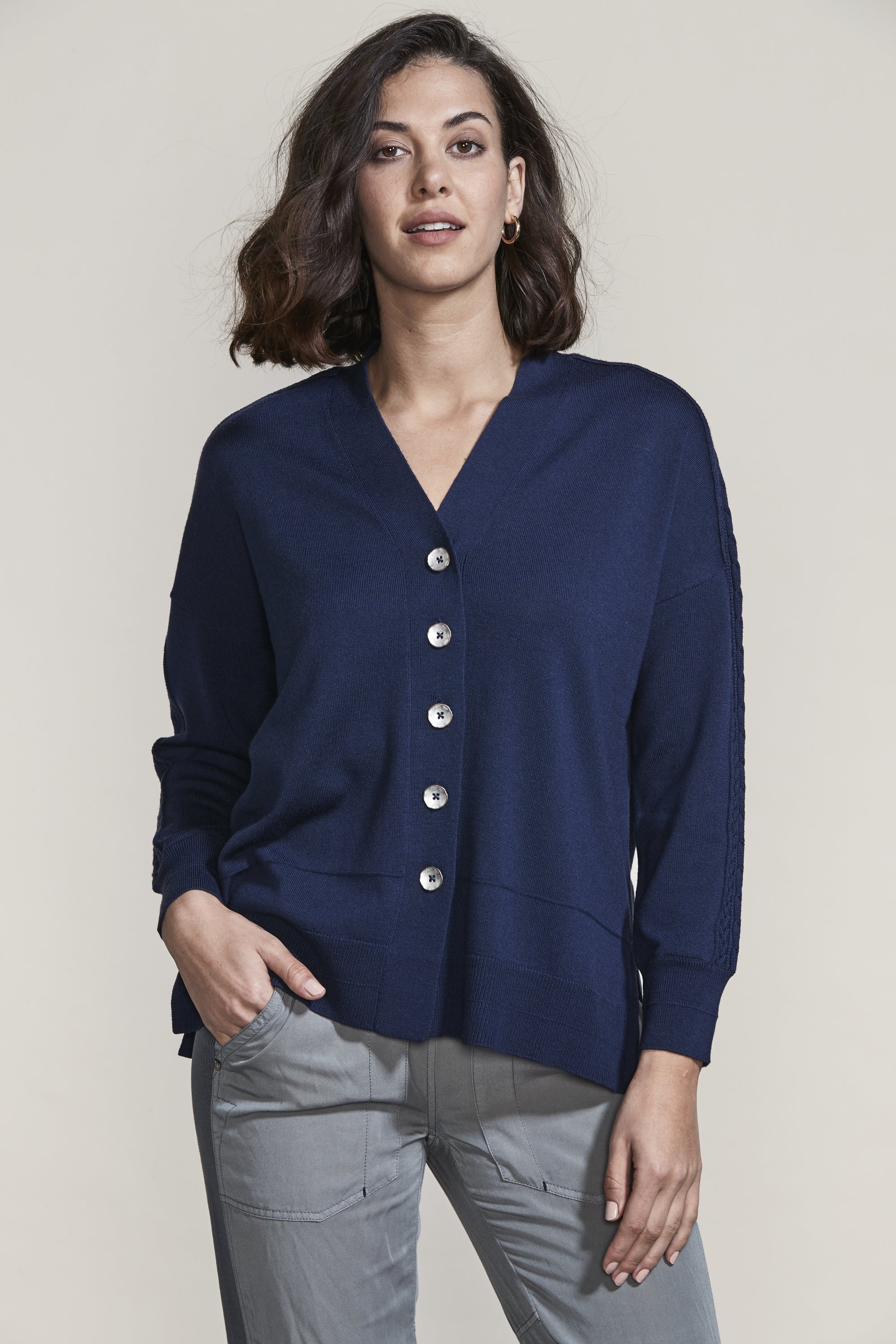 A relaxed fit drop shoulder cardi in soft merino wool. This elevated winter staple comes with a knit cable design at the overarm and centre back, and a decorative lace-up tie with metal ends at the back. The raised stitch detailing at the cuff and hem adds extra finesse to this stunning knit.