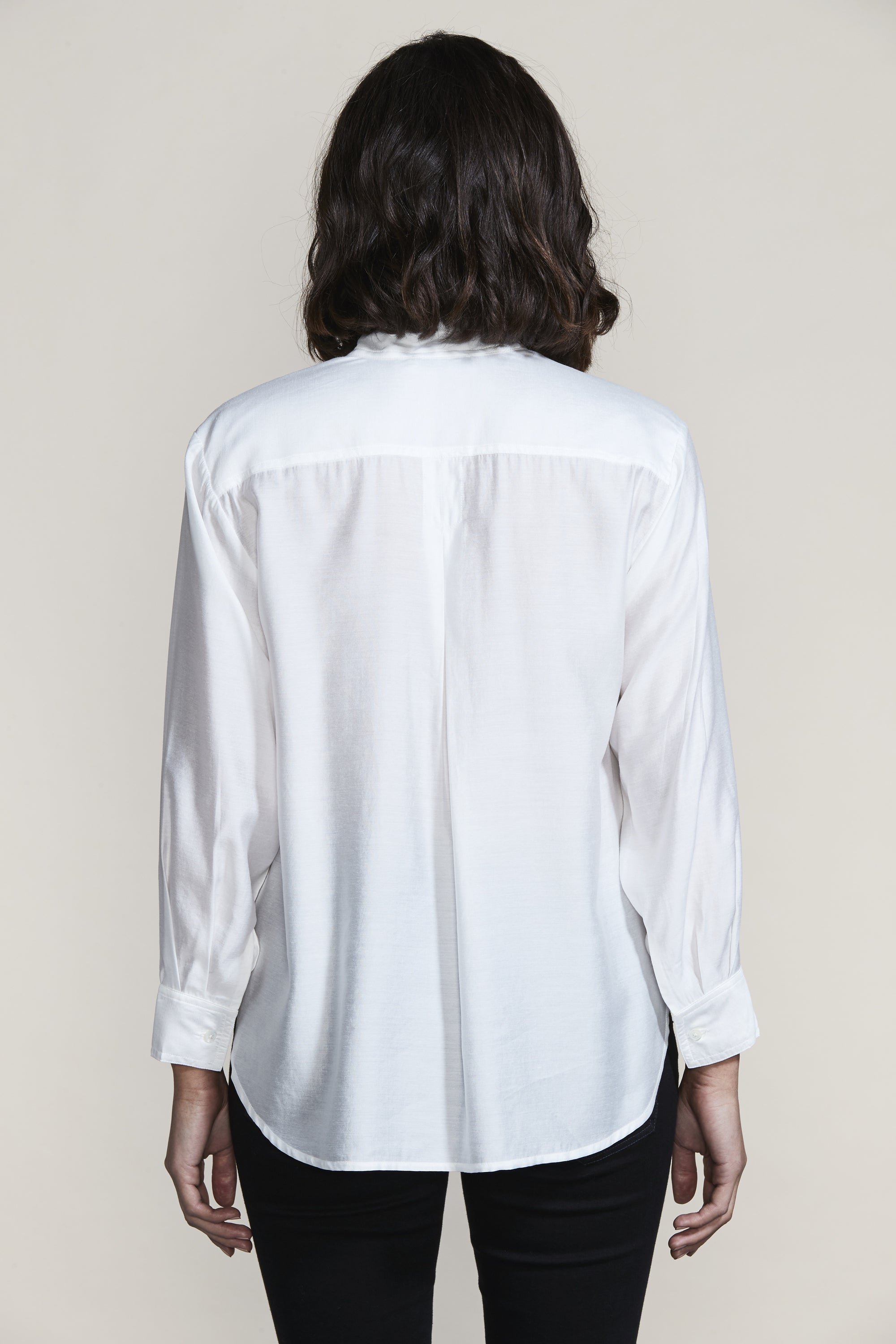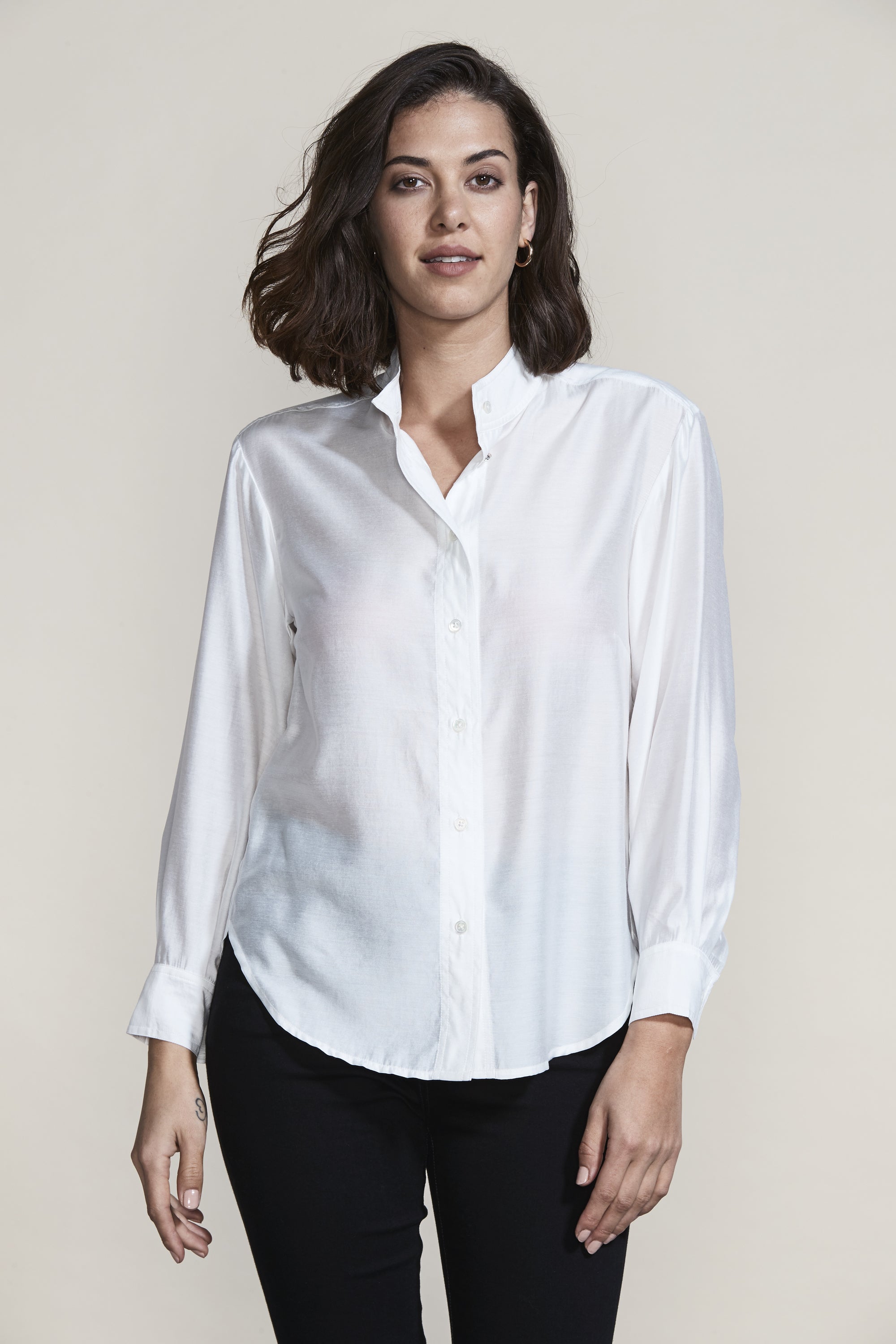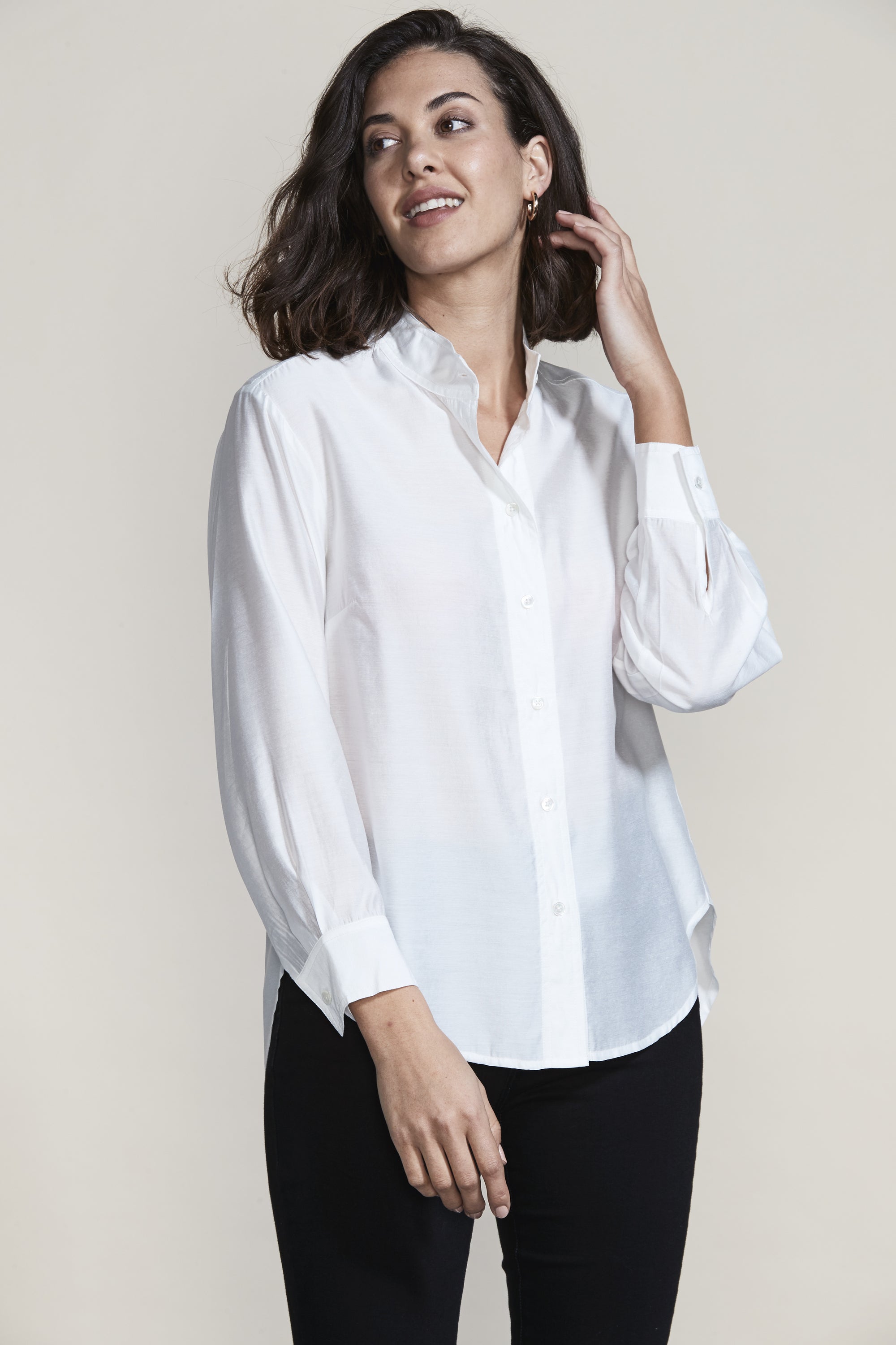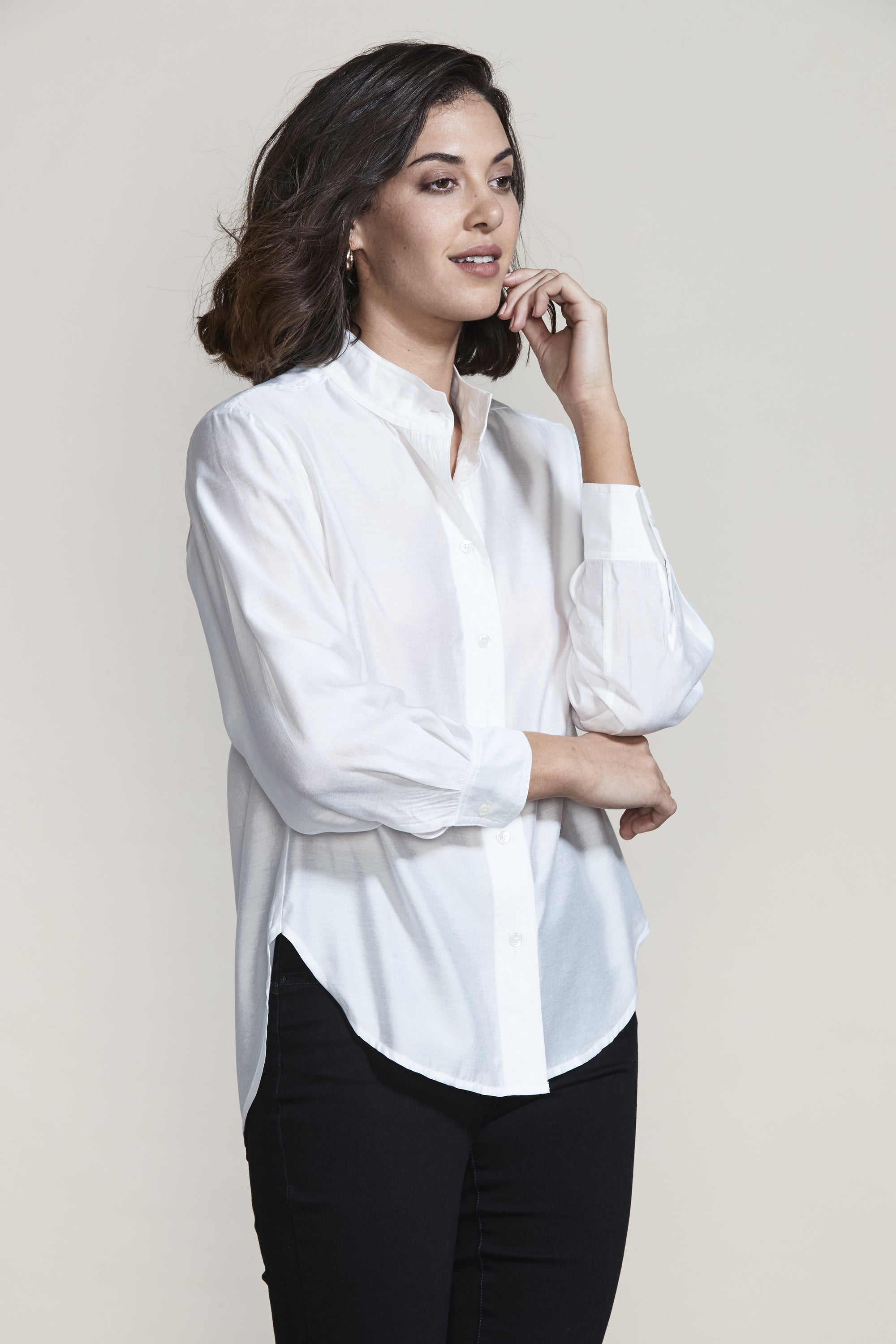 This refined modern shirt featuring stand collar, twin needle topstitching and curved hemline is a great transeasonal piece with endless styling options — it will be on heavy rotation in your autumn/winter wardrobe.