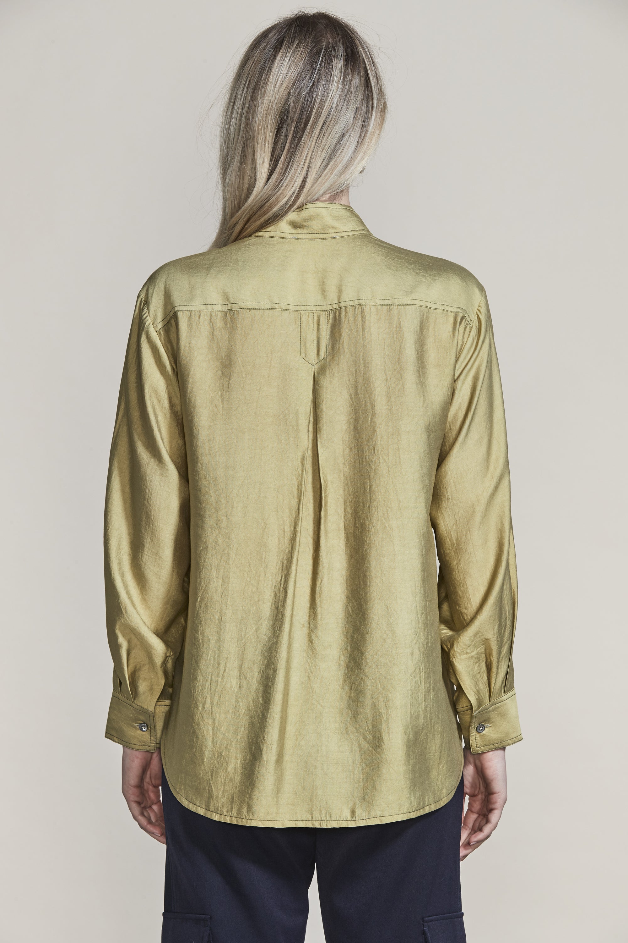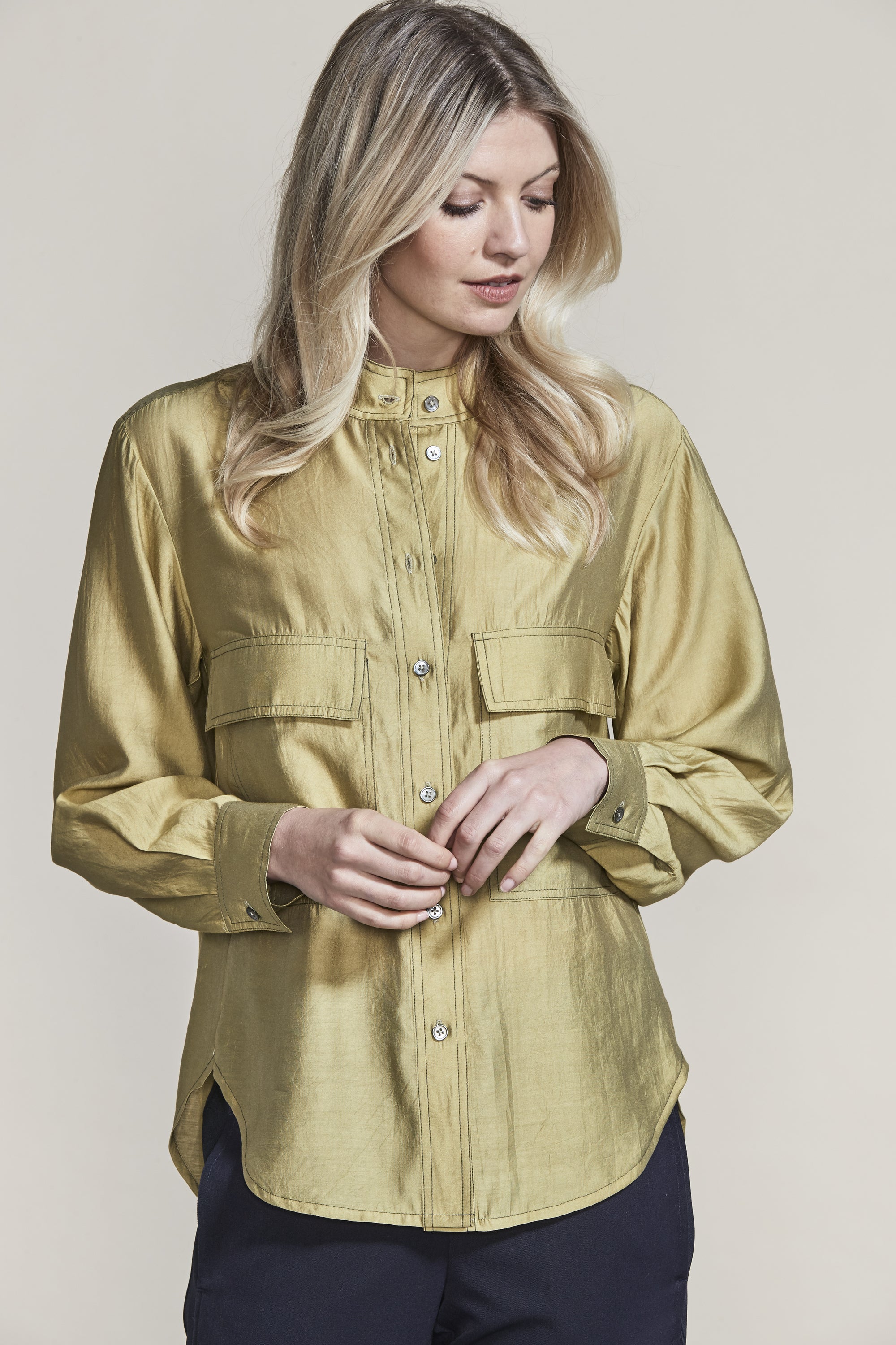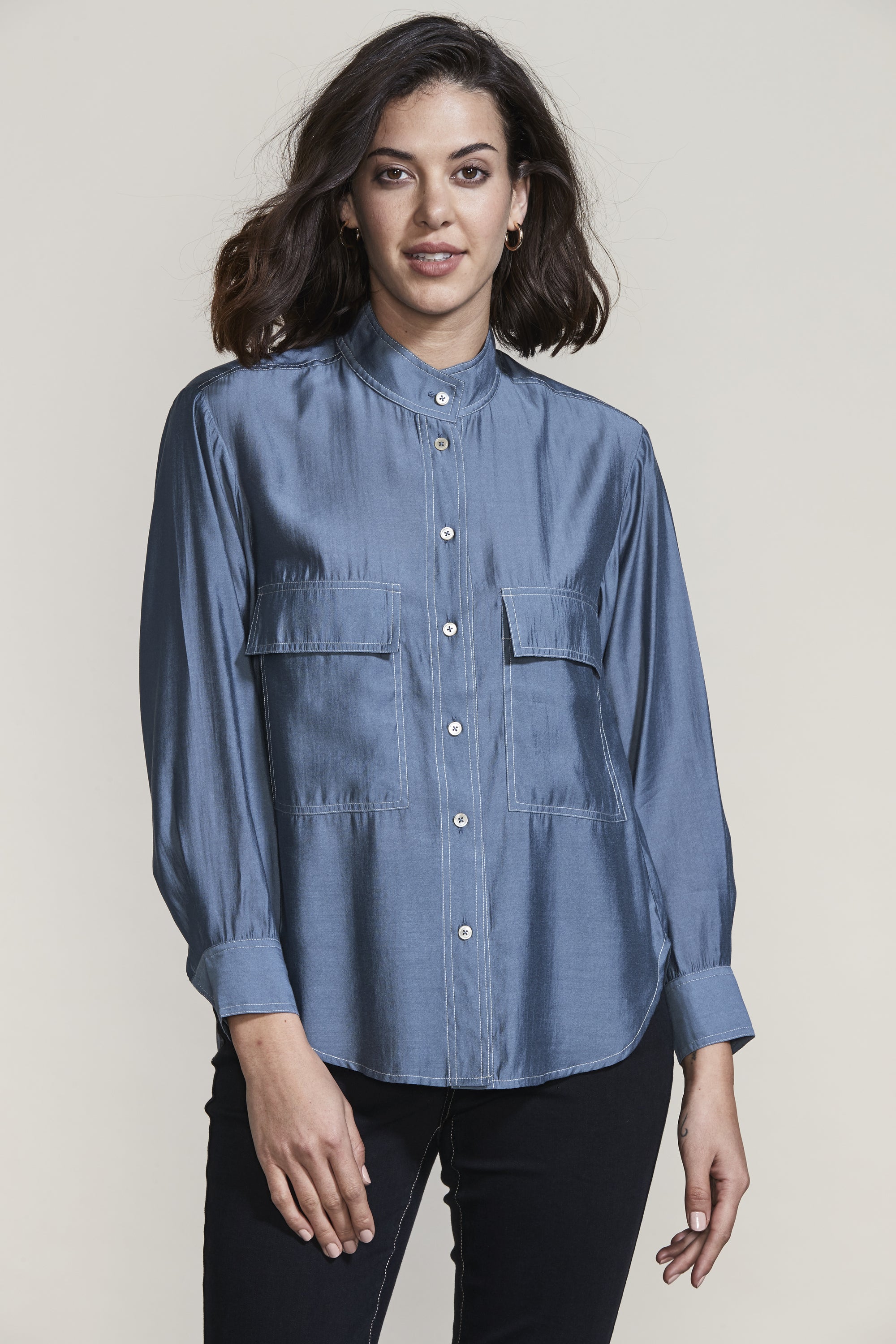 This refined modern shirt featuring stand collar, twin needle topstitching and chest pockets is a great transeasonal piece with endless styling options — it will be on heavy rotation in your autumn/winter wardrobe.