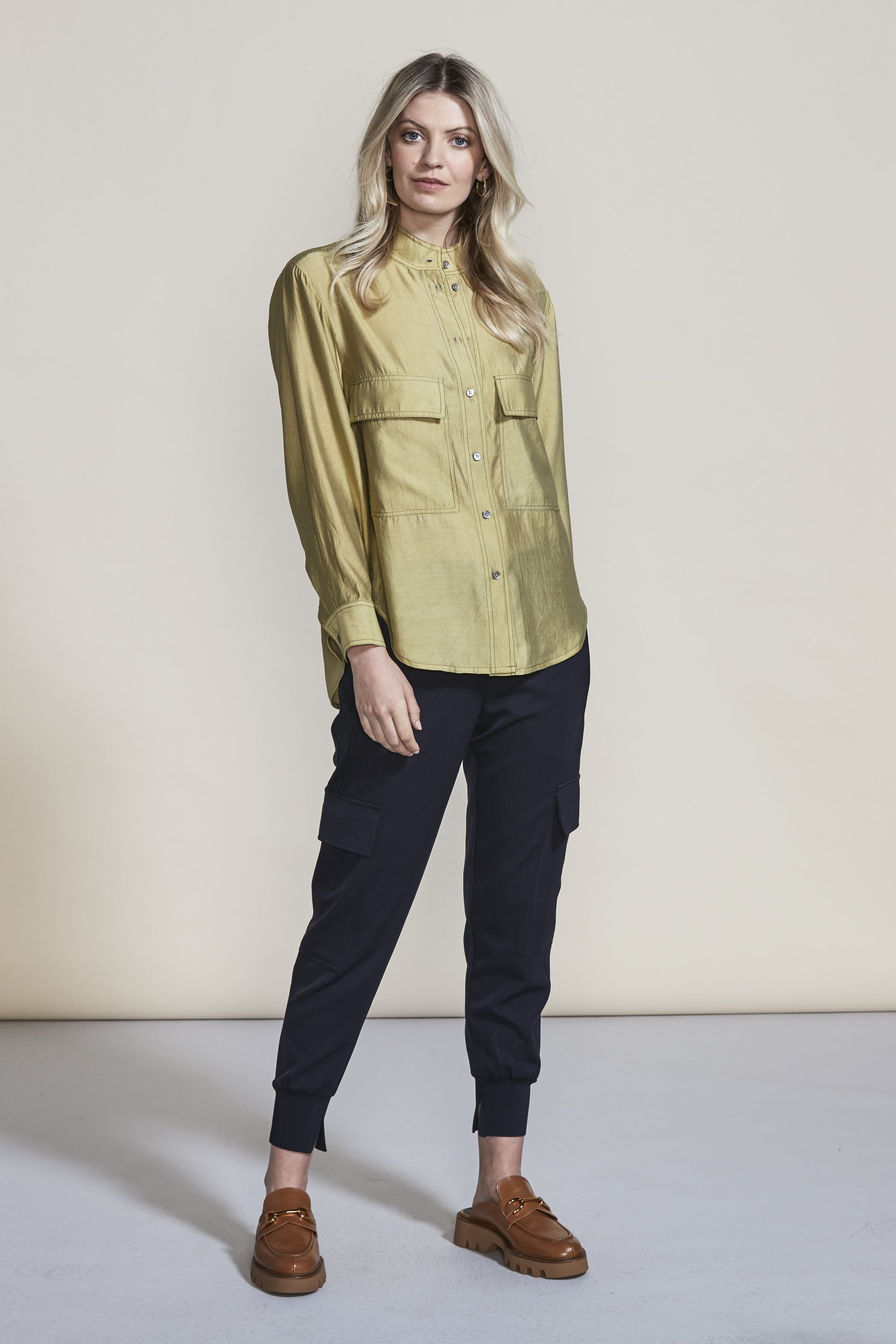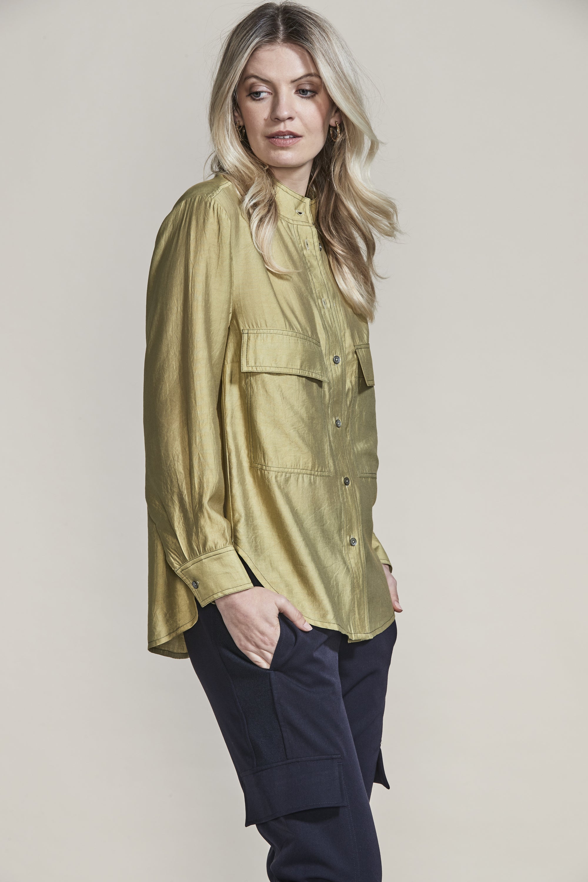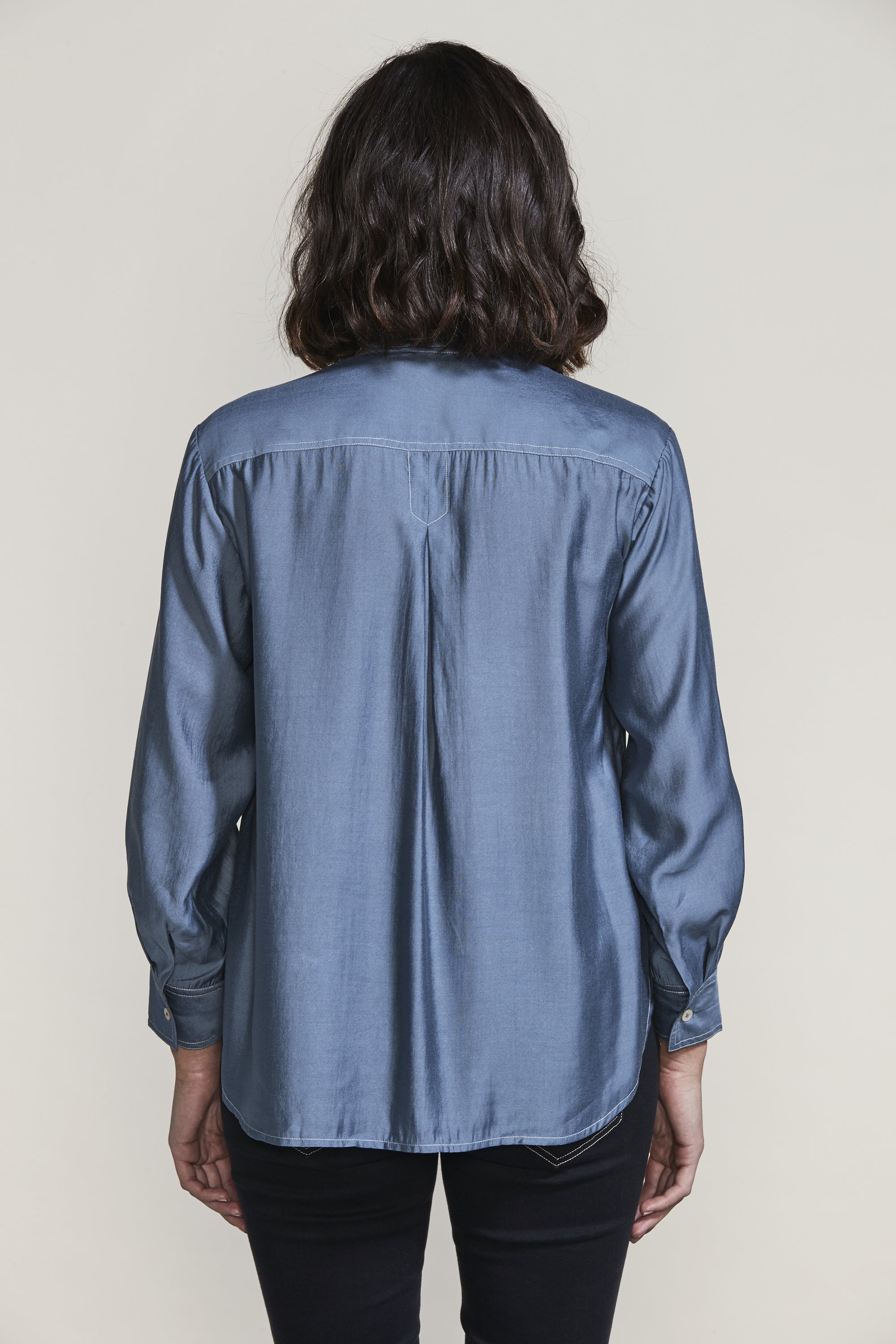 This refined modern shirt featuring stand collar, twin needle topstitching and chest pockets is a great transeasonal piece with endless styling options — it will be on heavy rotation in your autumn/winter wardrobe.