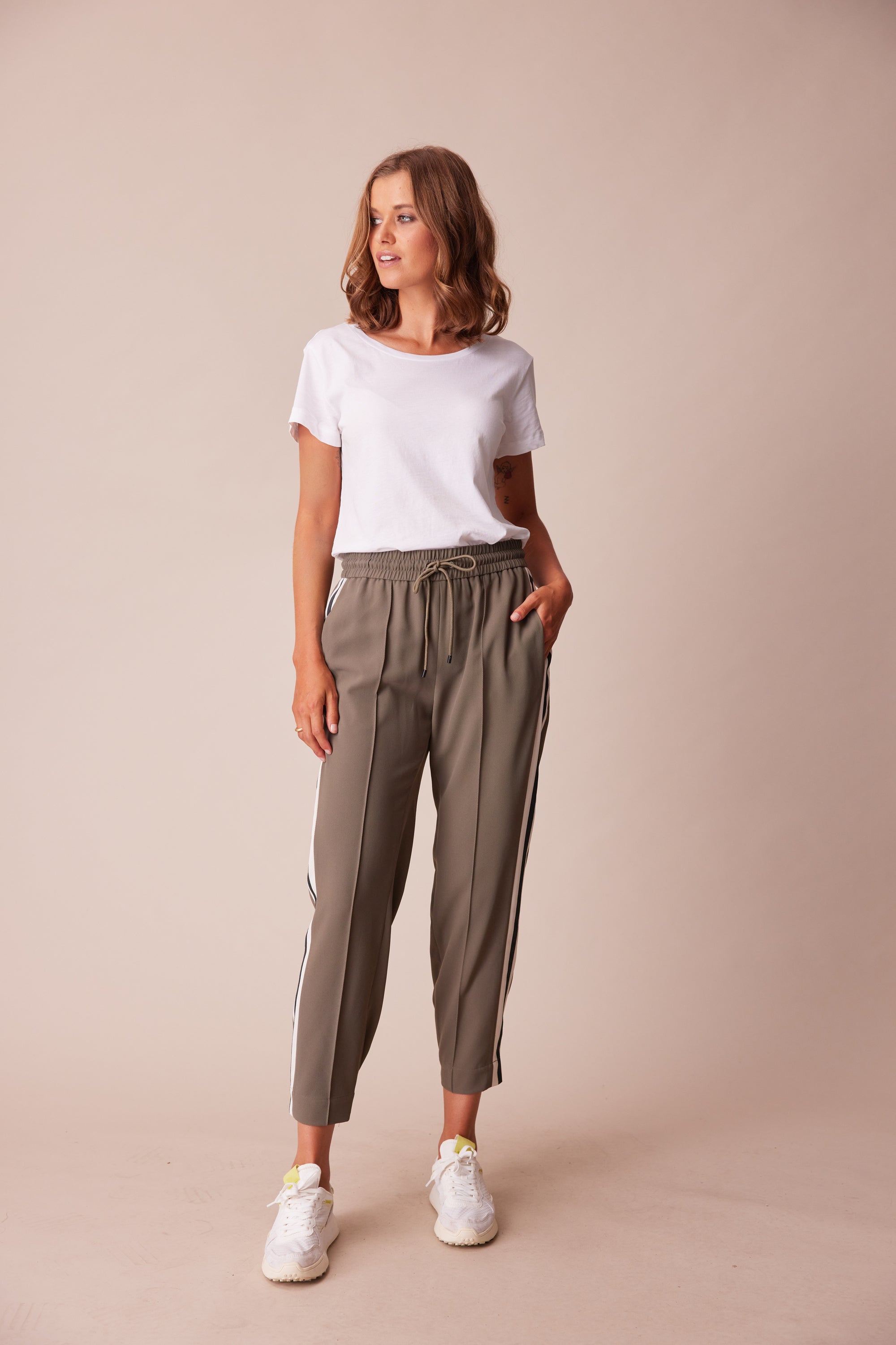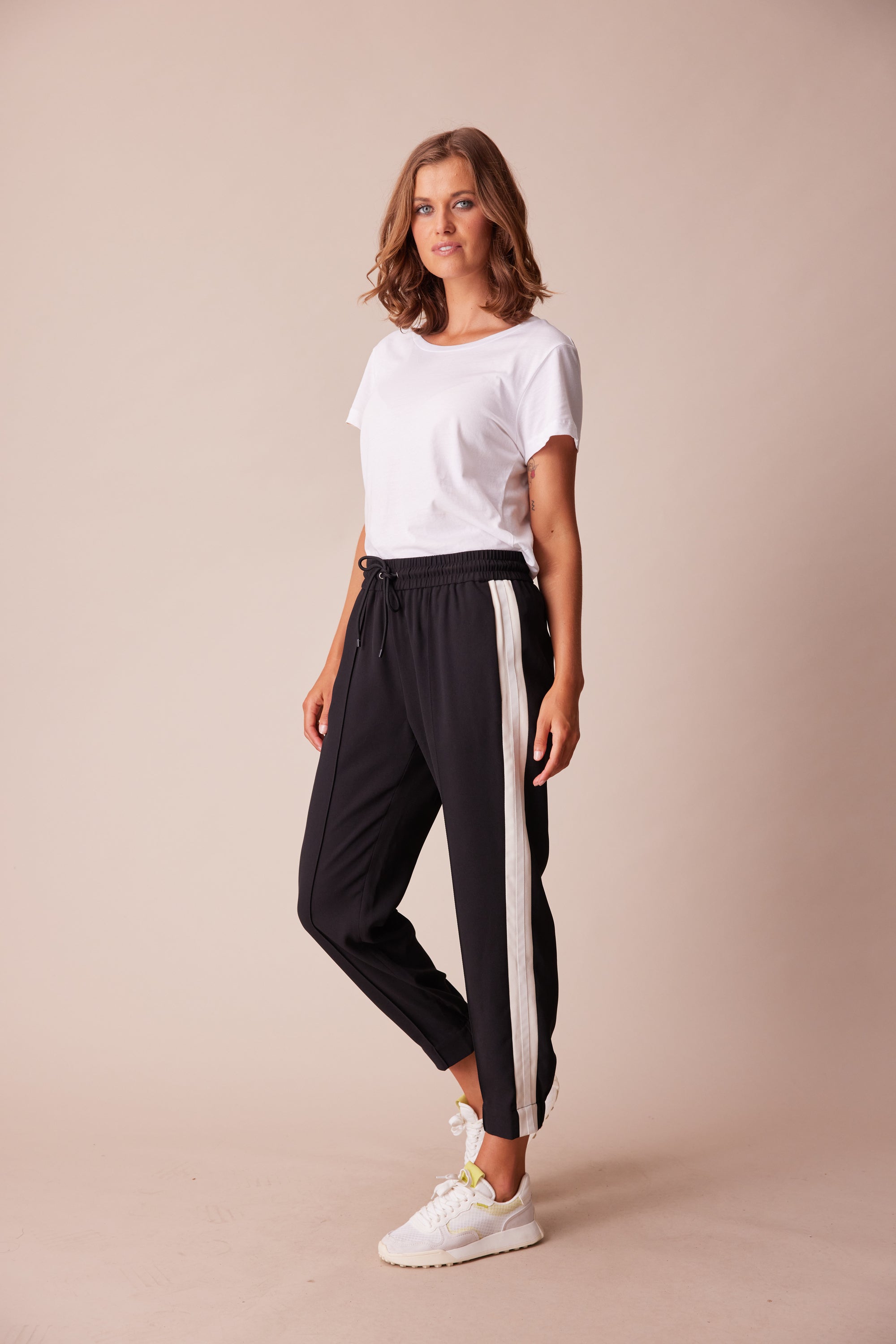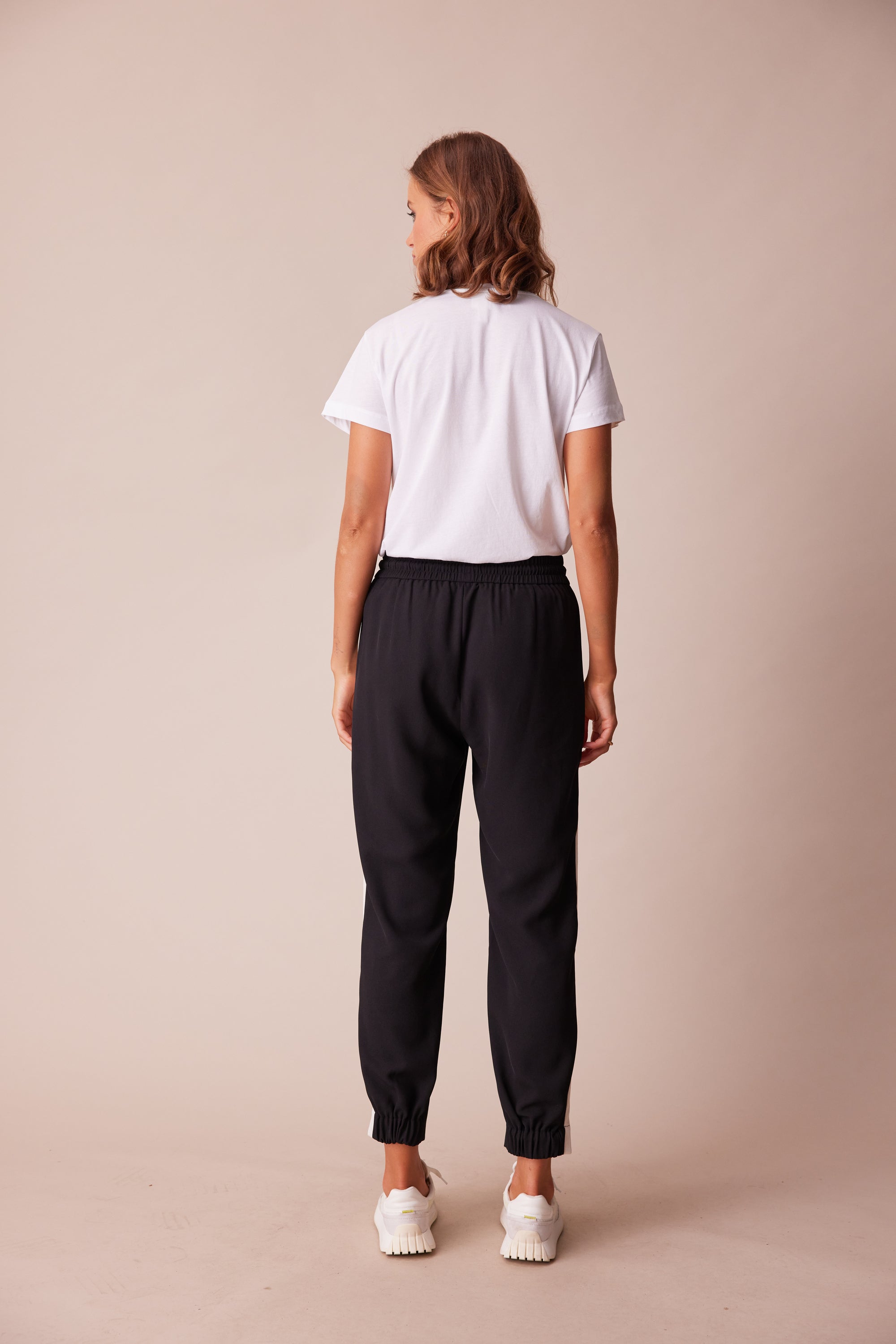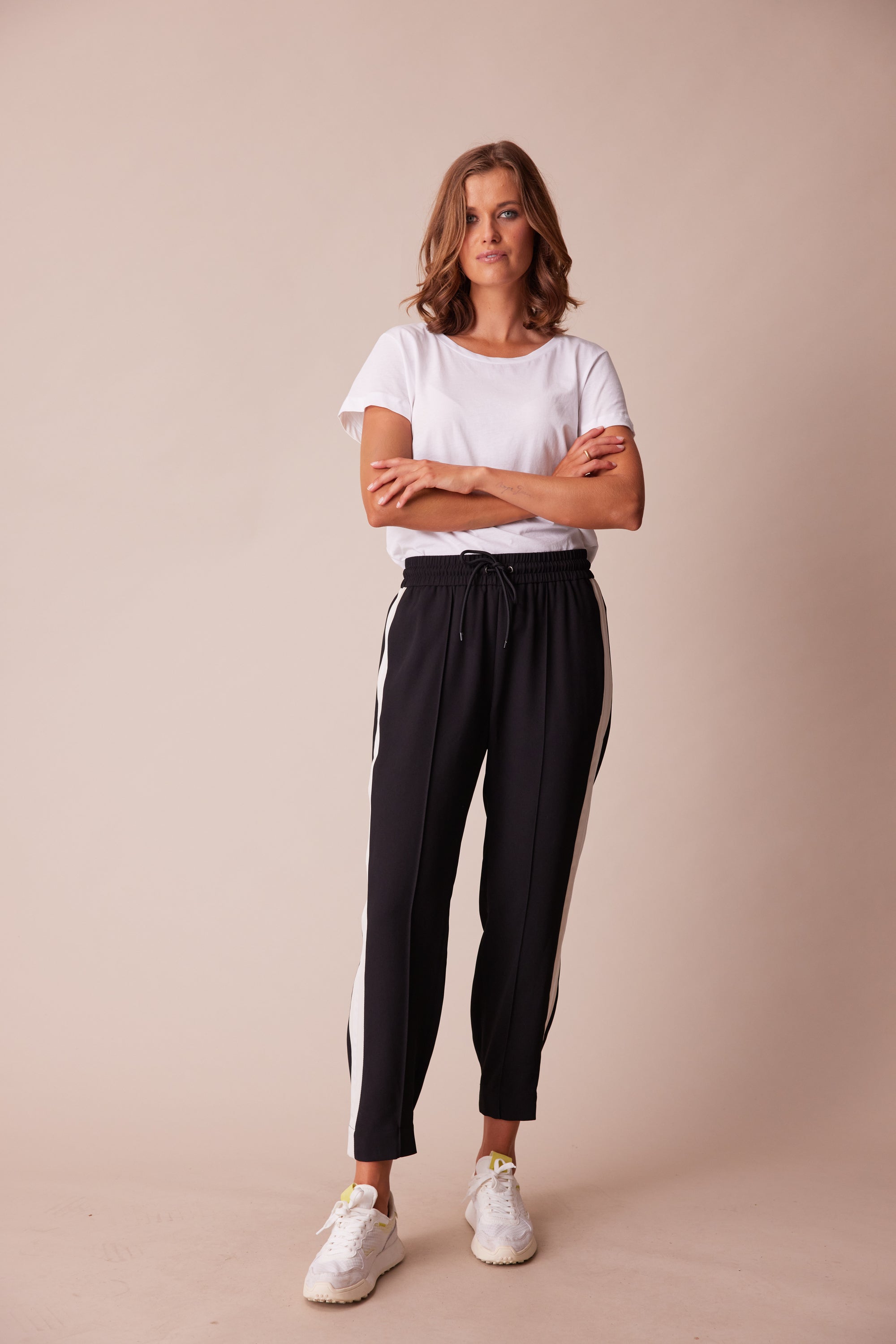 This tailored jogger pant comes with sporty side stripes and centre leg pintucks. The elasticated waist and relaxed leg make it the go-to pant for days when you want to feel comfortable without sacrificing style. Wear with oversized knits and sneakers.