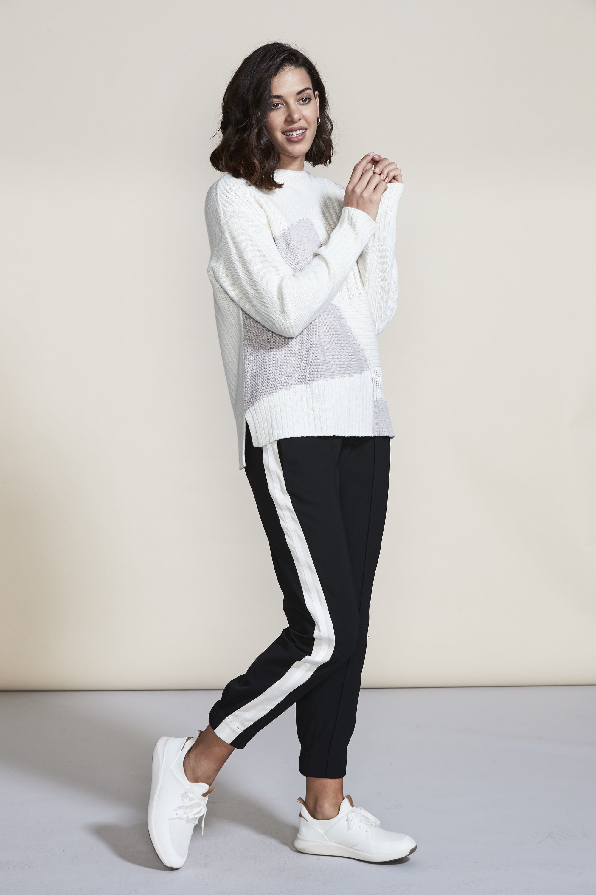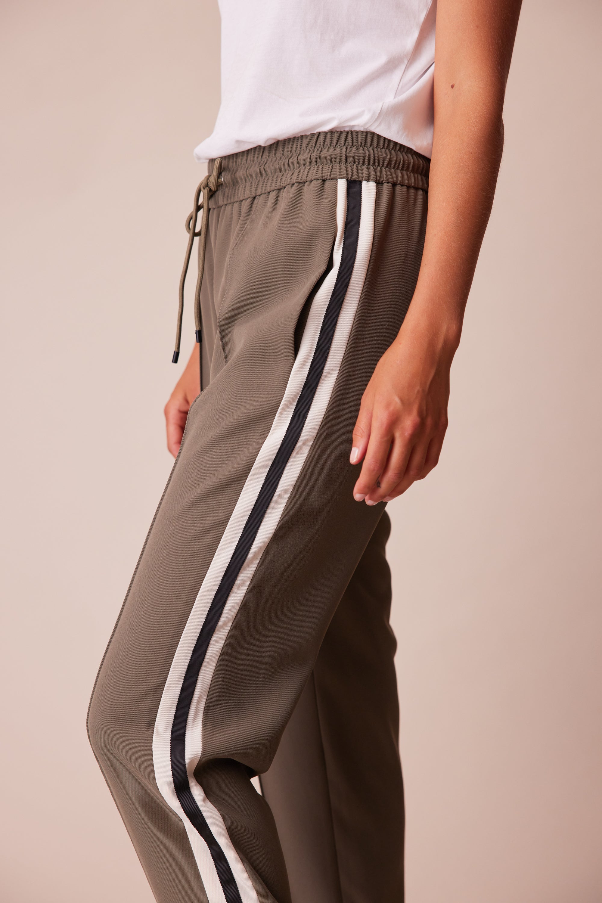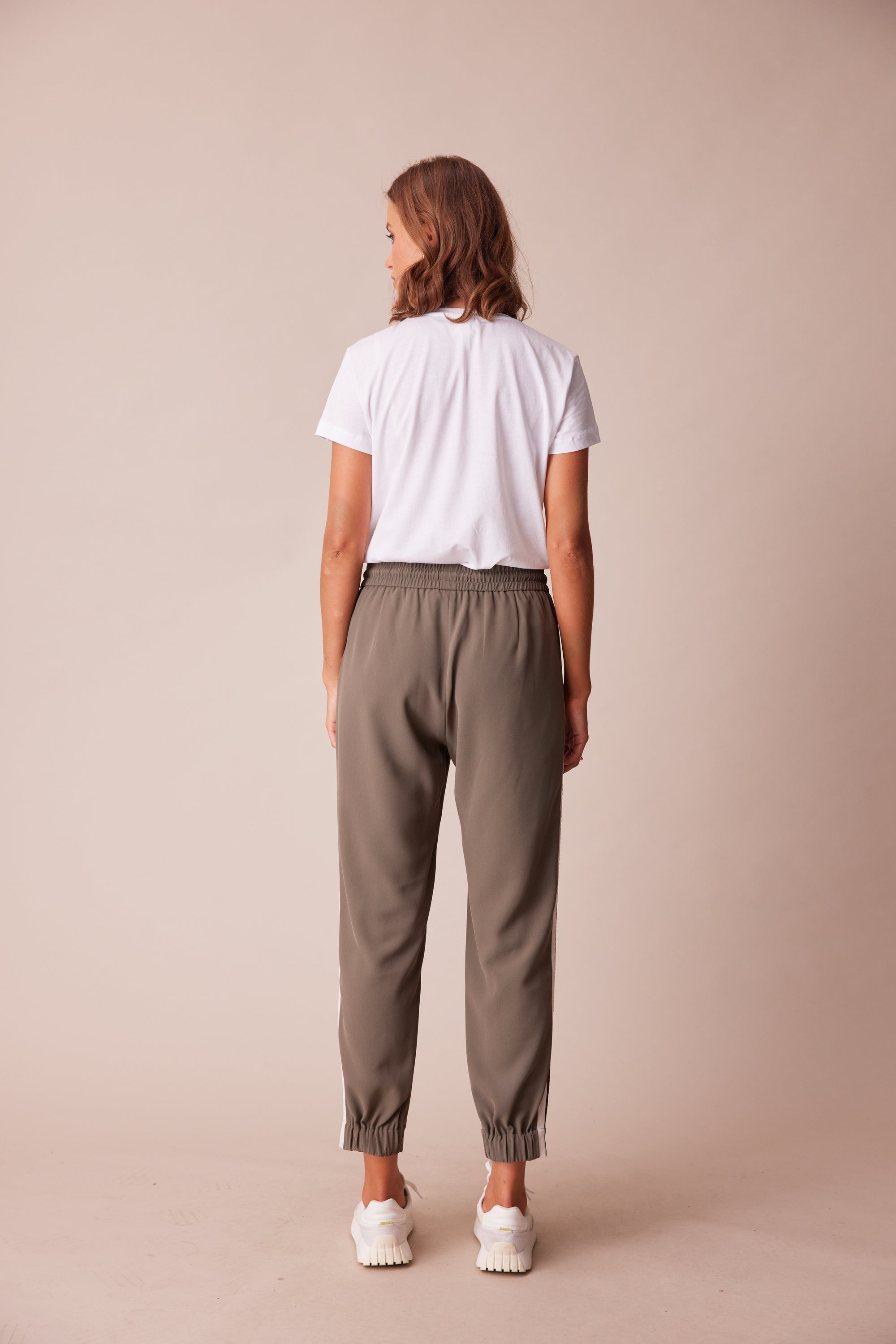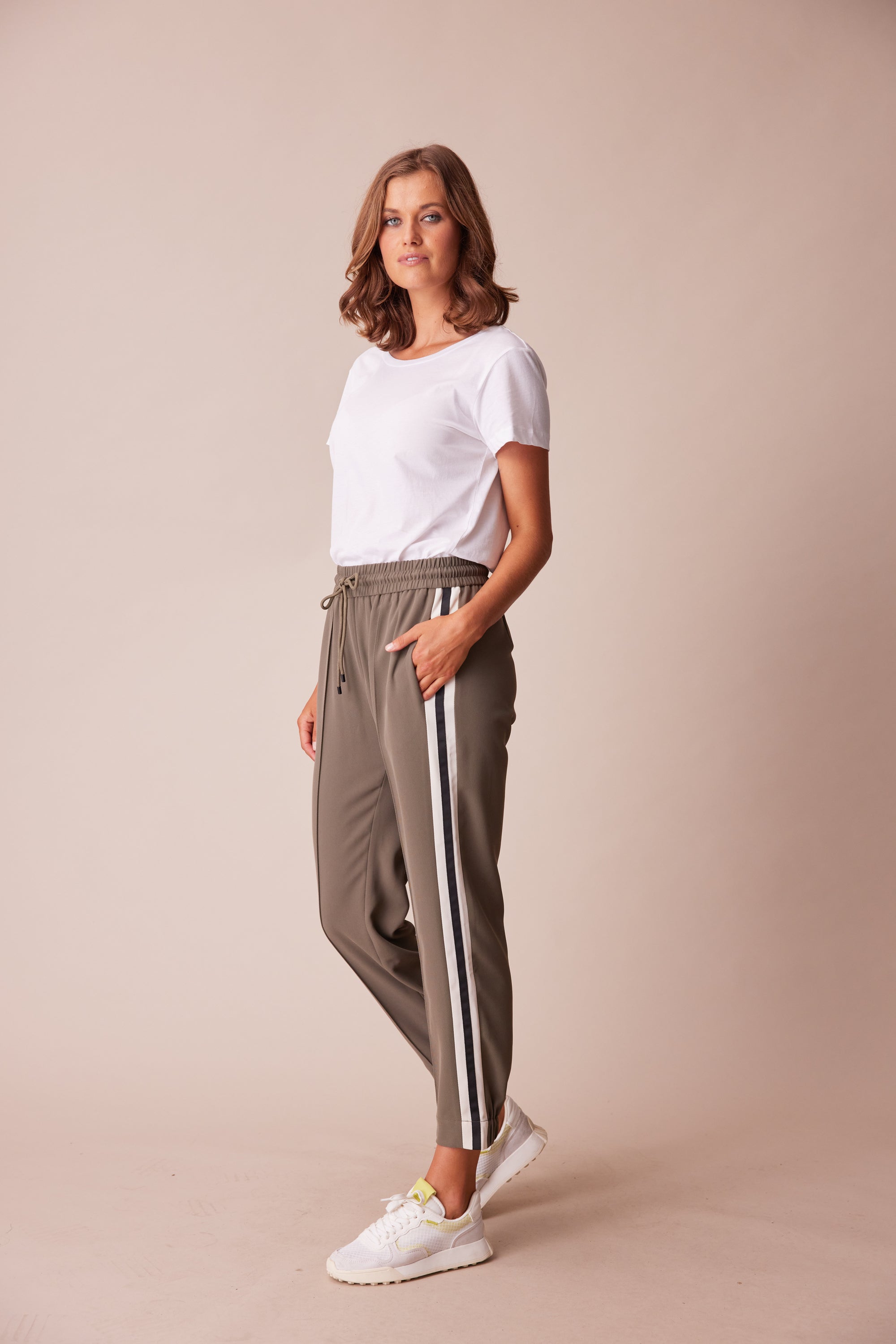 This tailored jogger pant comes with sporty side stripes and centre leg pintucks. The elasticated waist and relaxed leg make it the go-to pant for days when you want to feel comfortable without sacrificing style. Wear with oversized knits and sneakers.