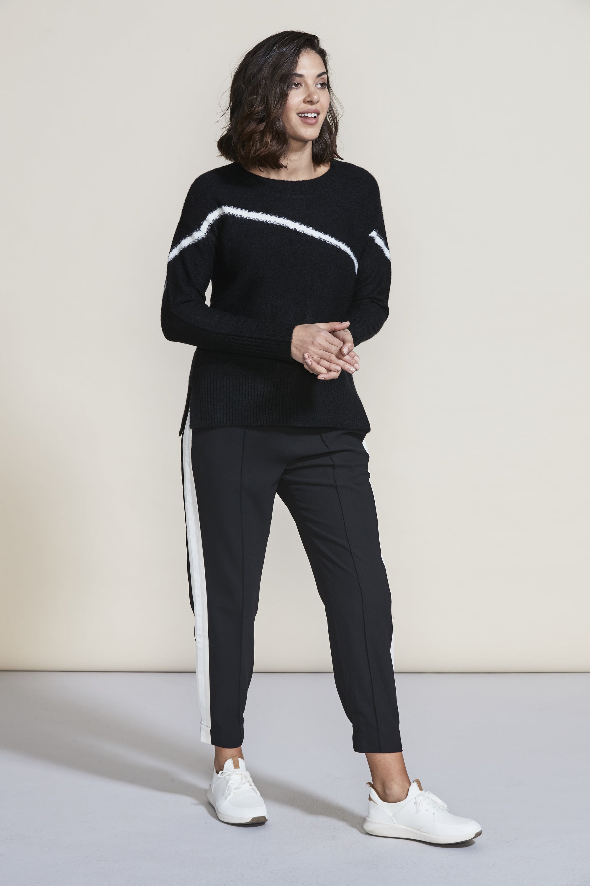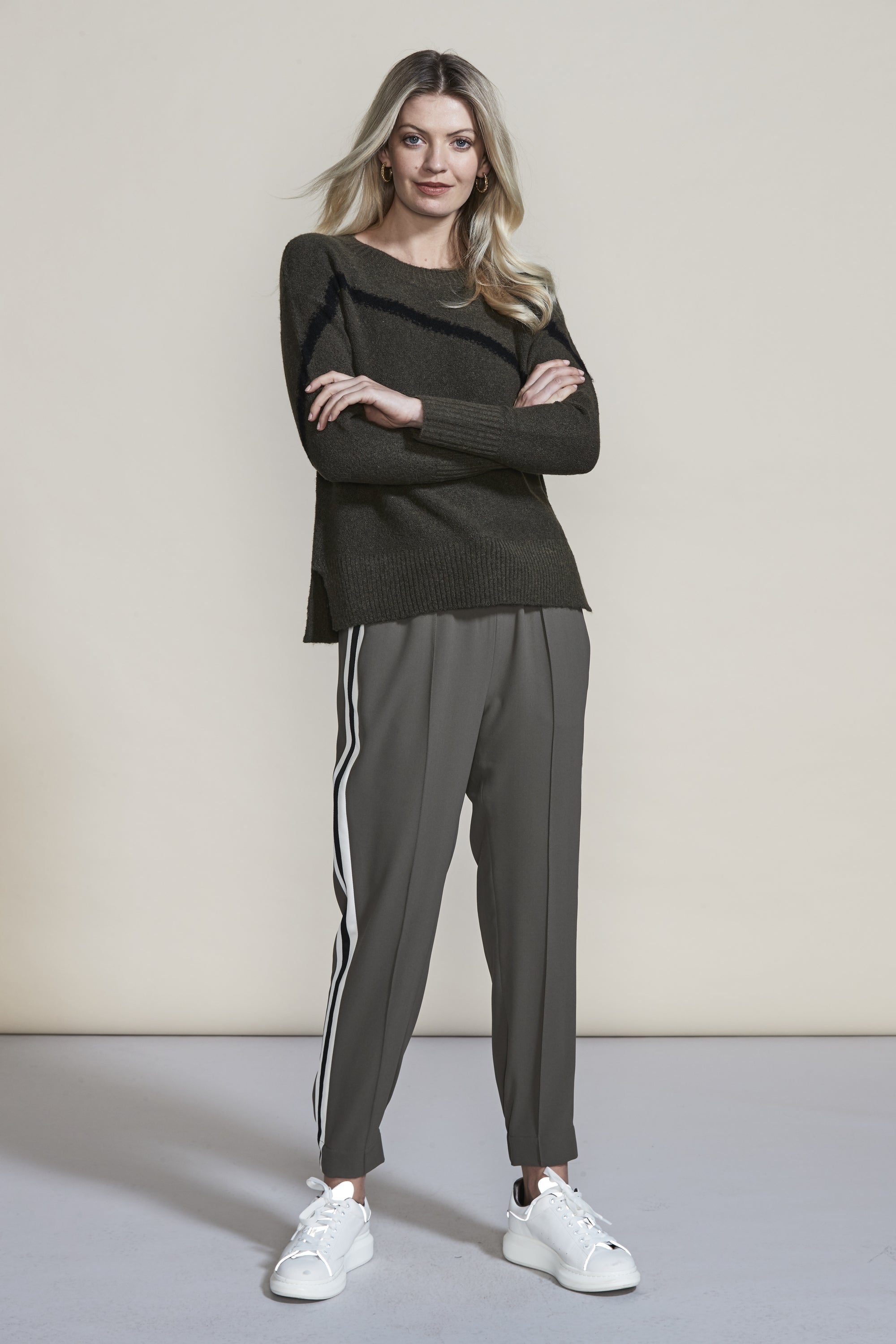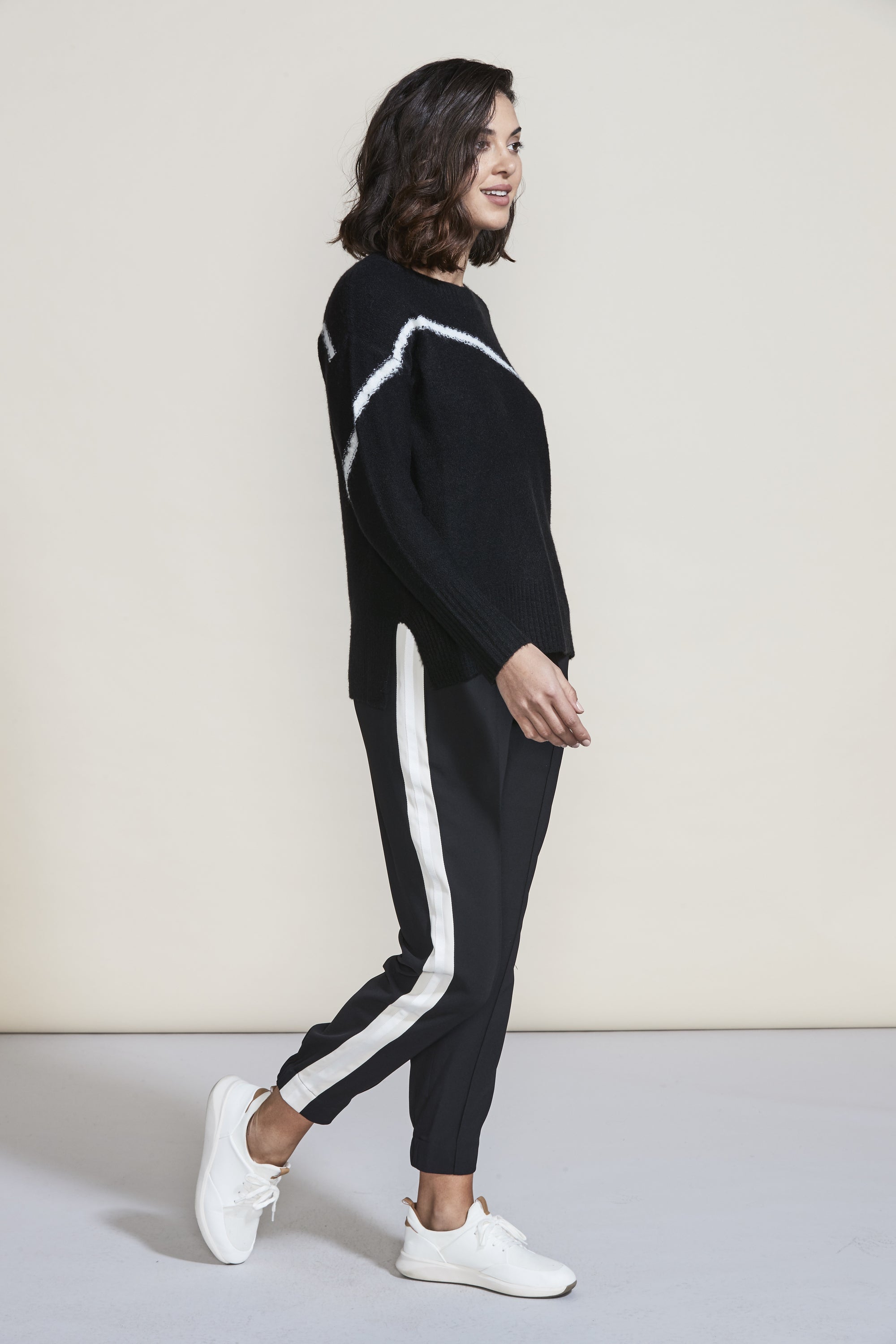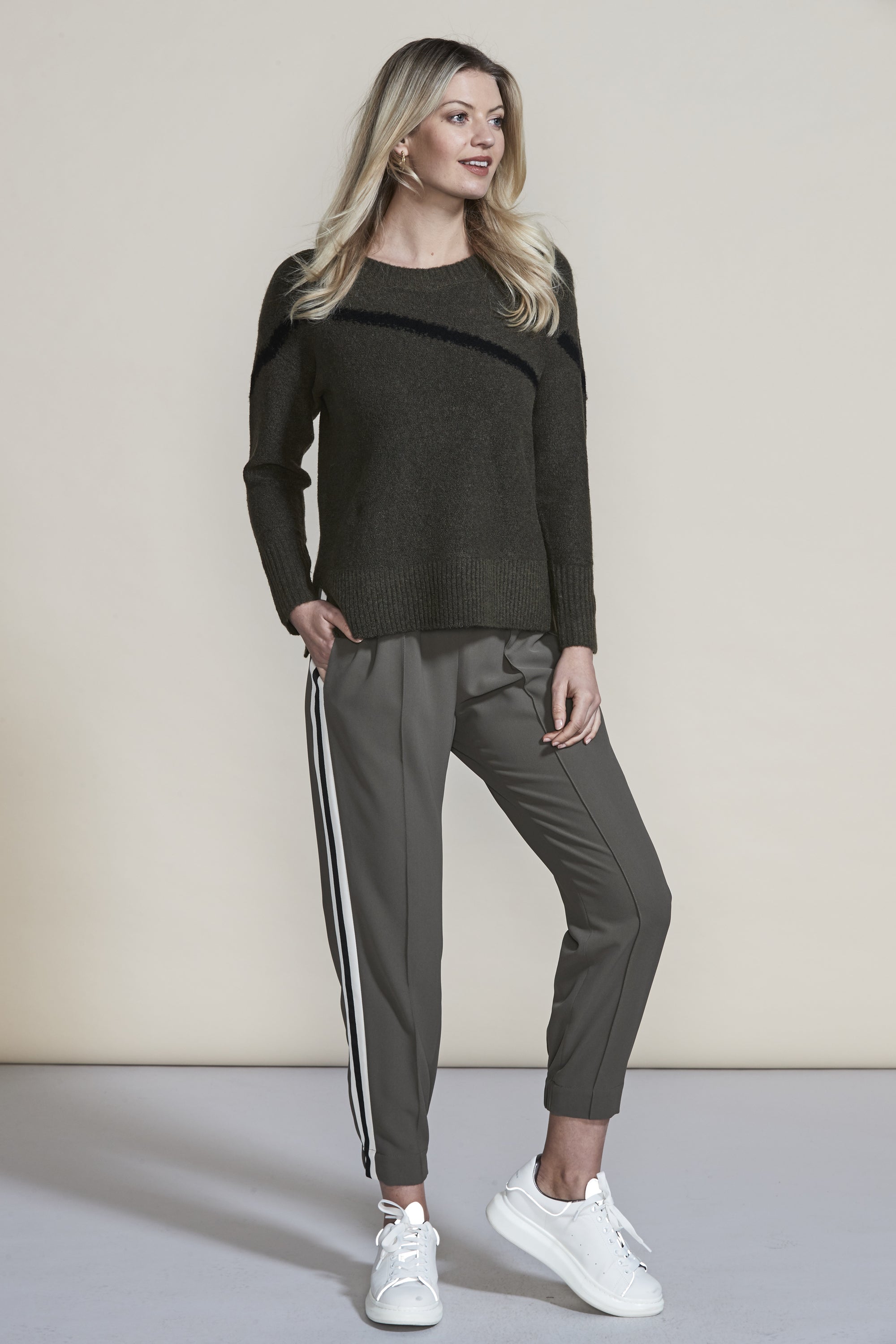 This tailored jogger pant comes with sporty side stripes and centre leg pintucks. The elasticated waist and relaxed leg make it the go-to pant for days when you want to feel comfortable without sacrificing style. Wear with oversized knits and sneakers.