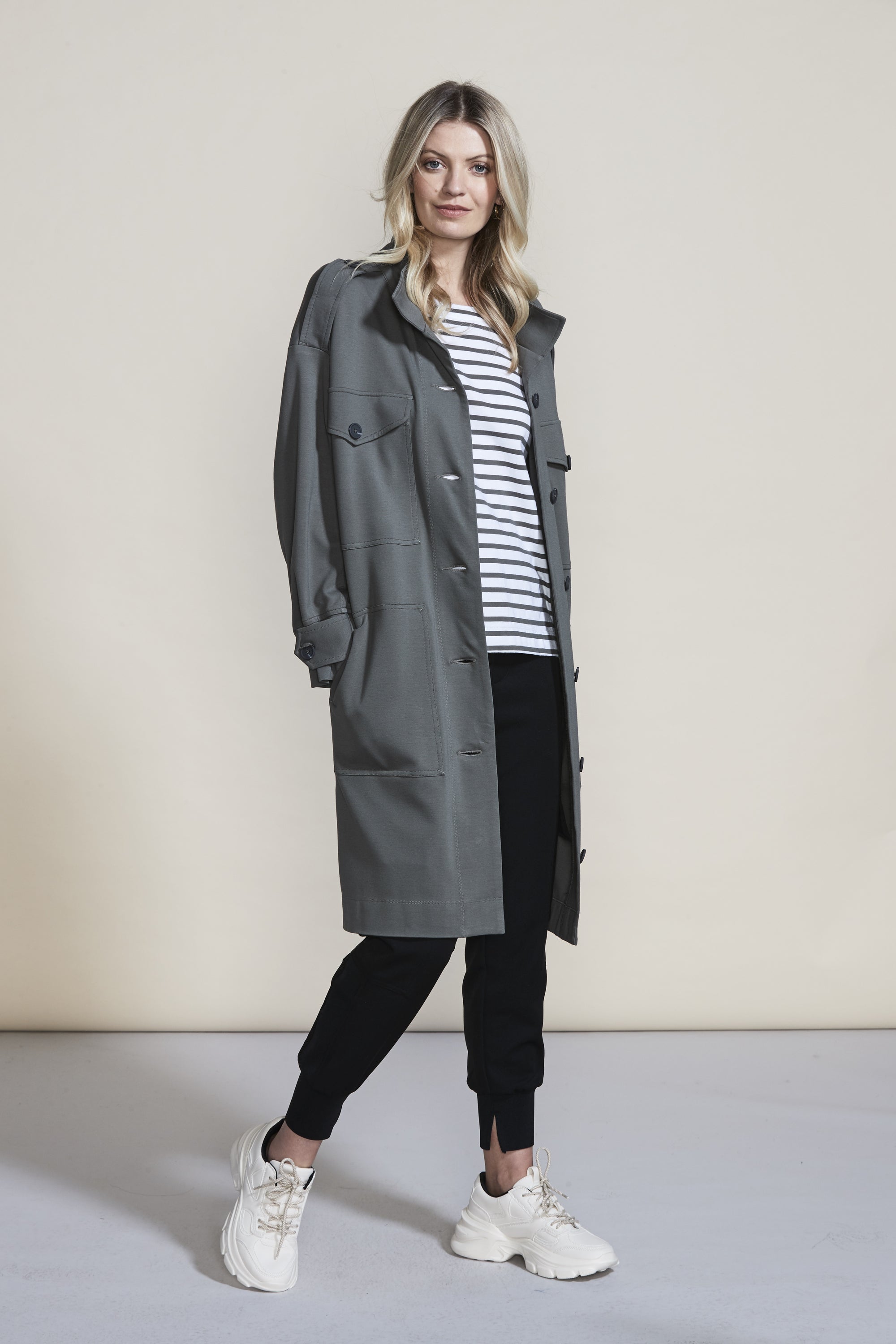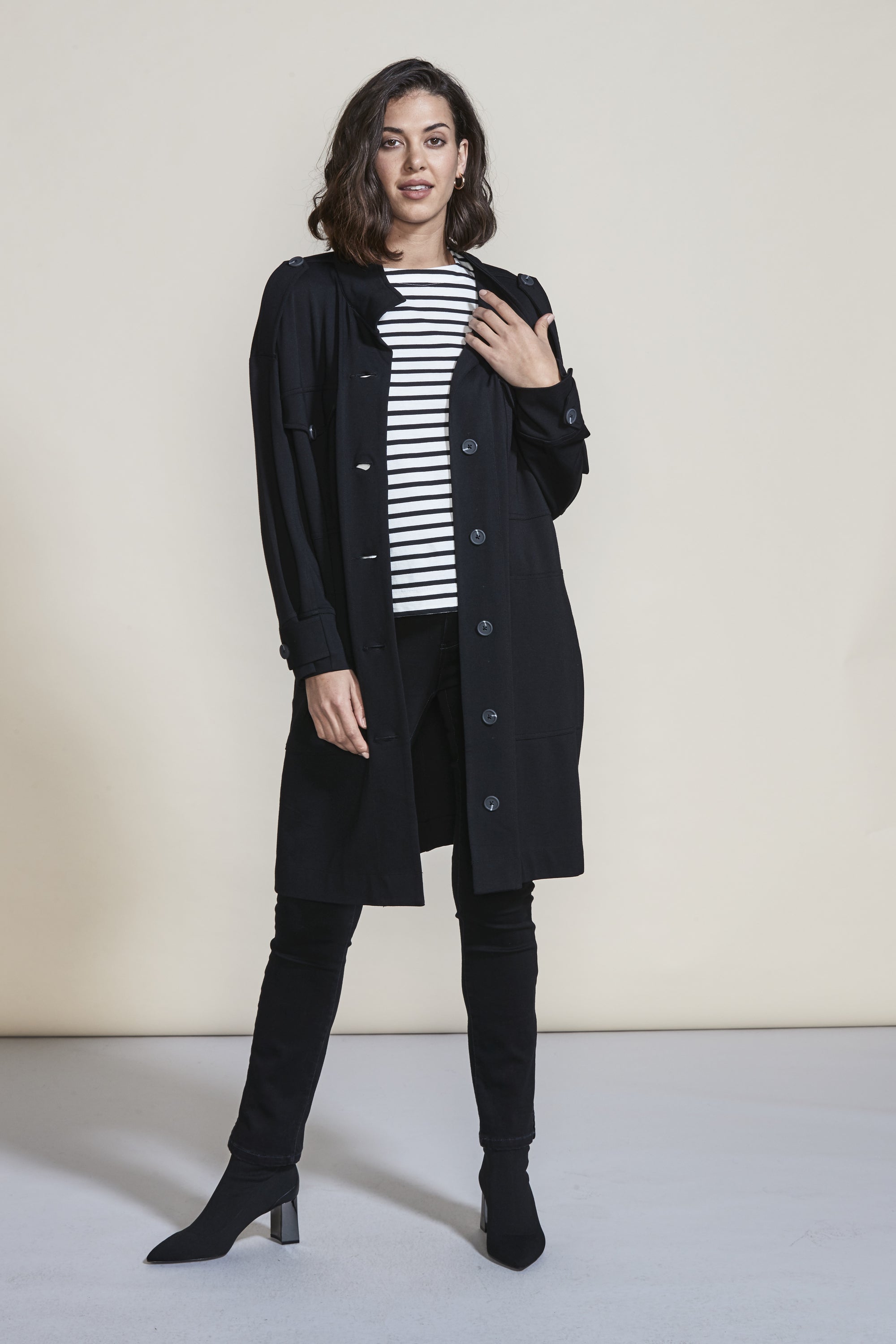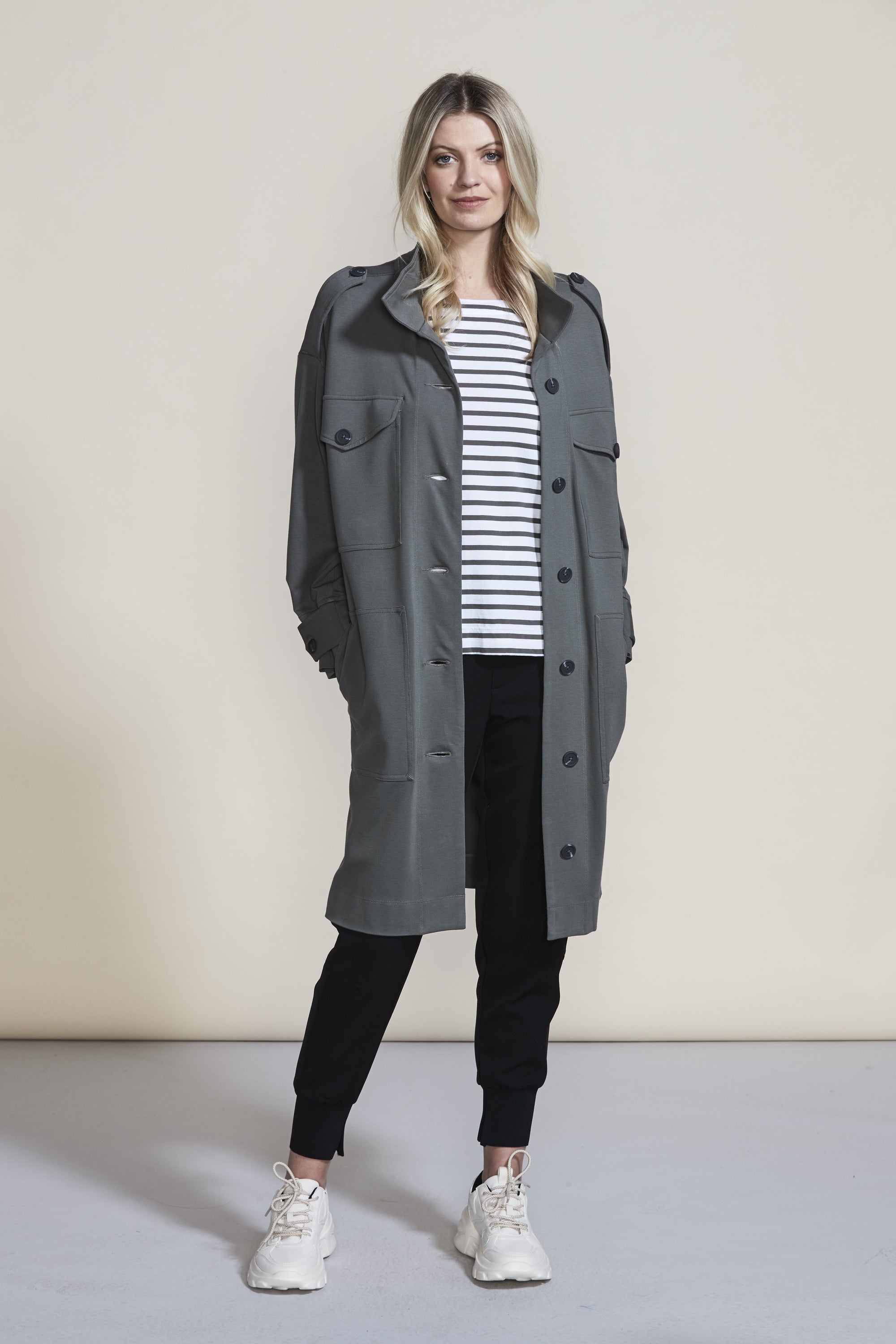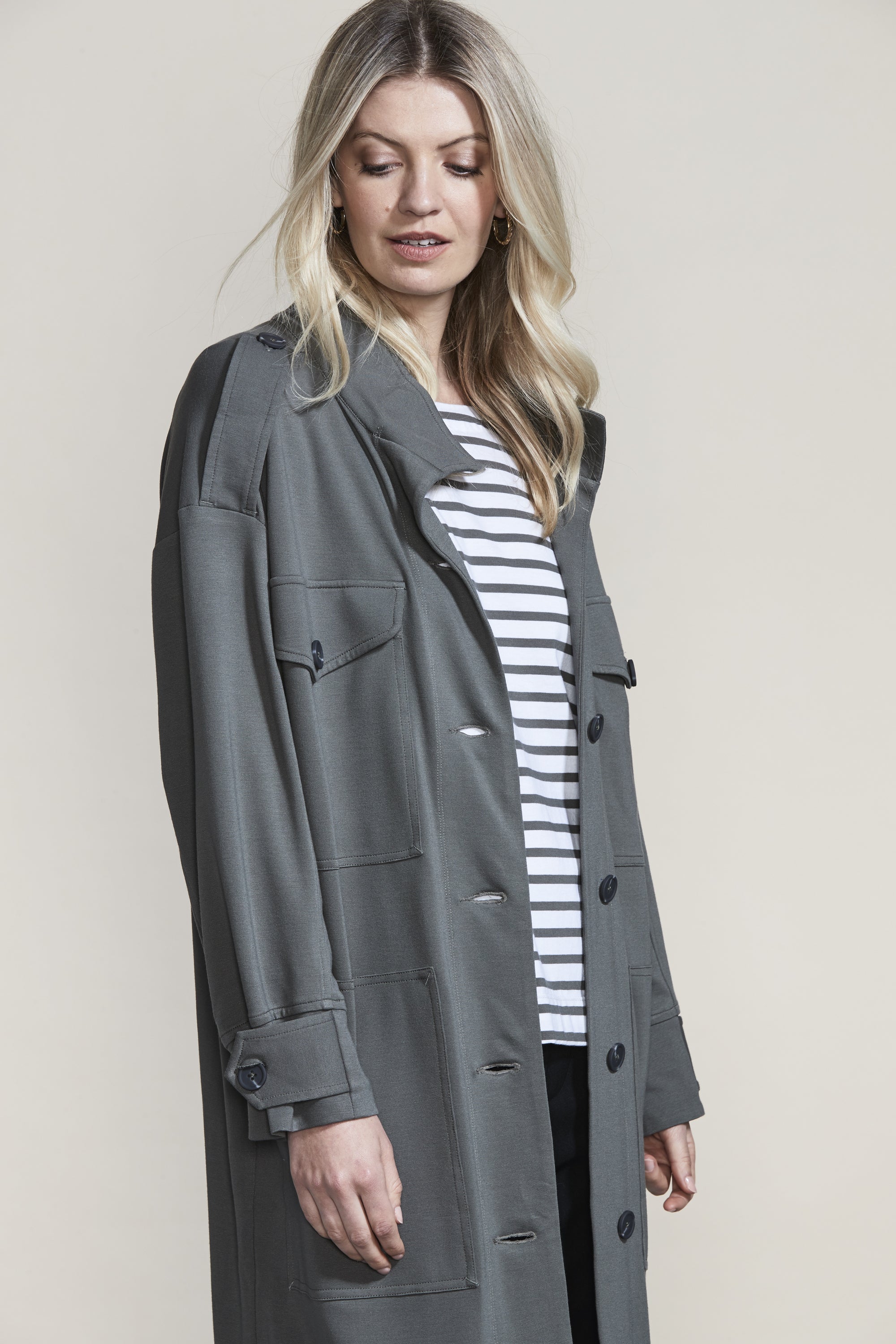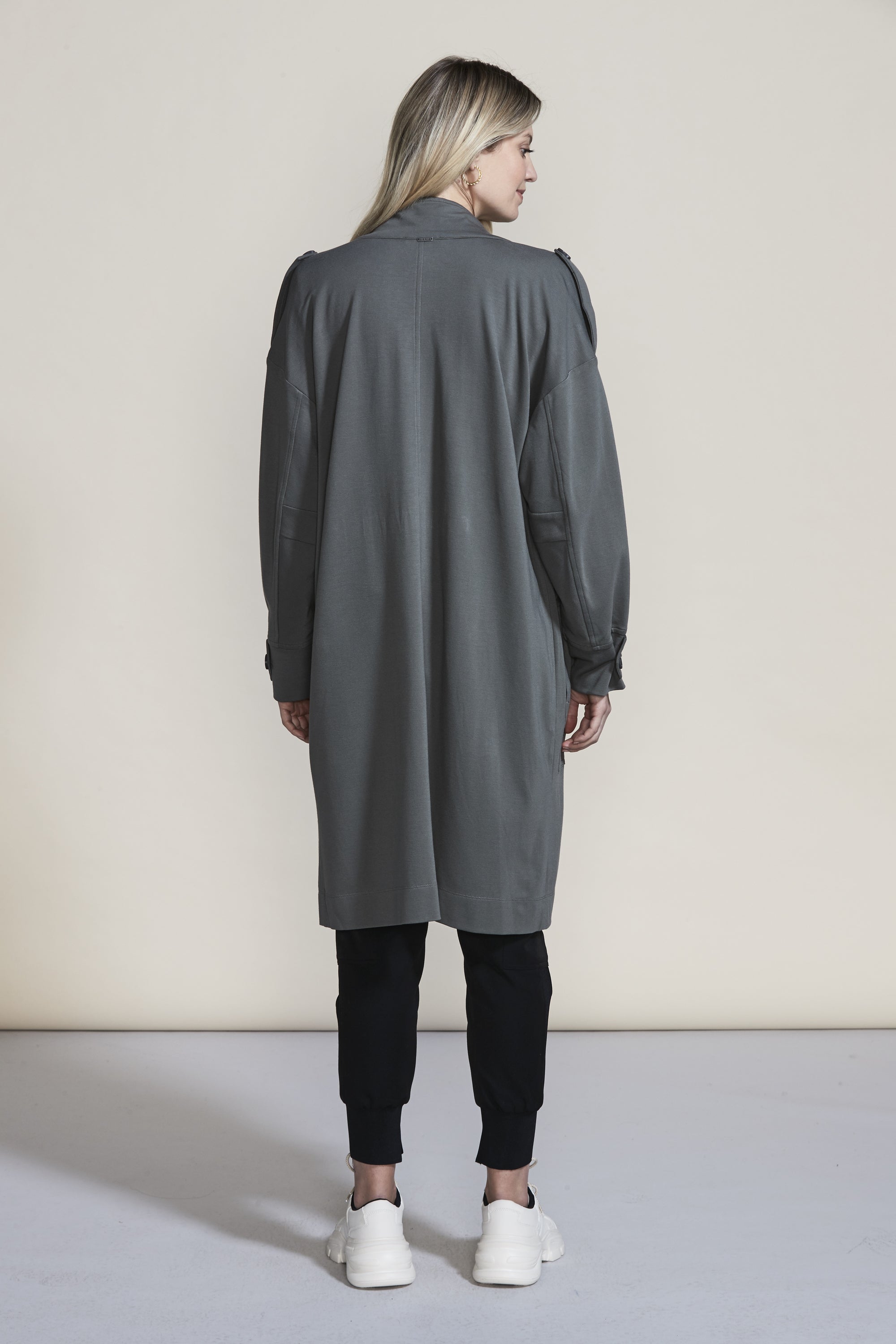 Our oversized military style coat is perfect for colder days. Wide epaulettes, sleeve tabs and patch pockets are topstitched for a classic outerwear finish in a slouchy mid-weight ponti knit.
