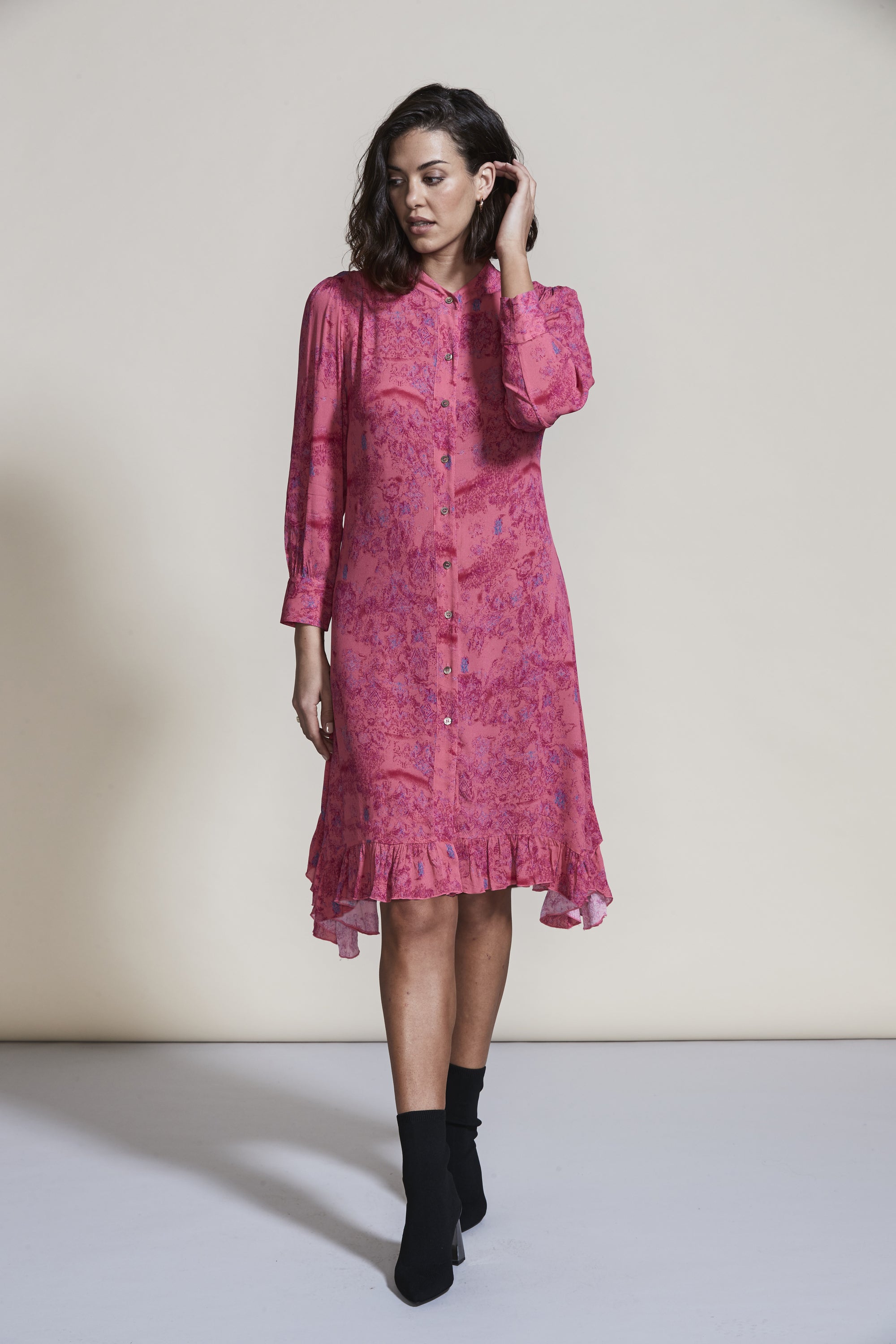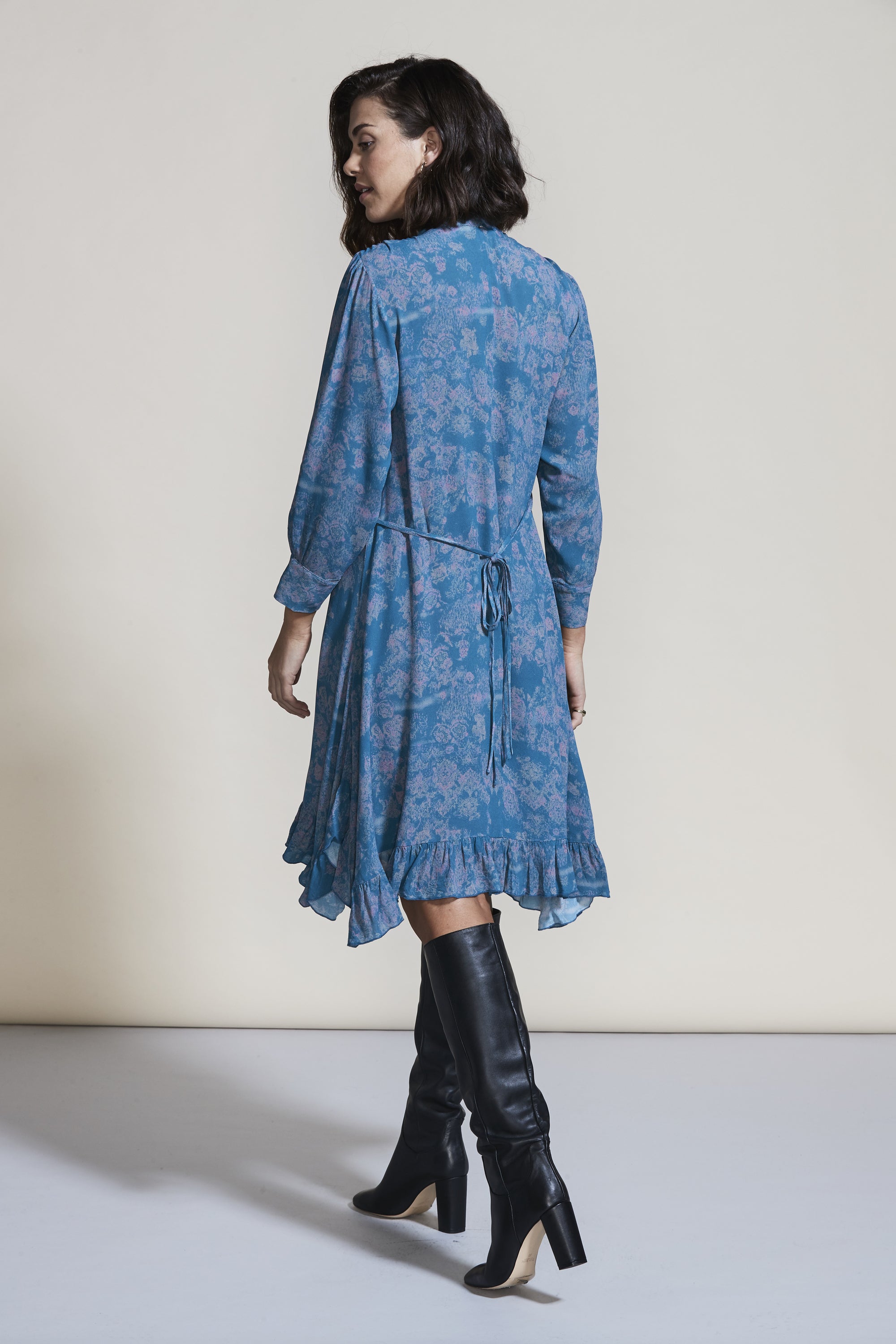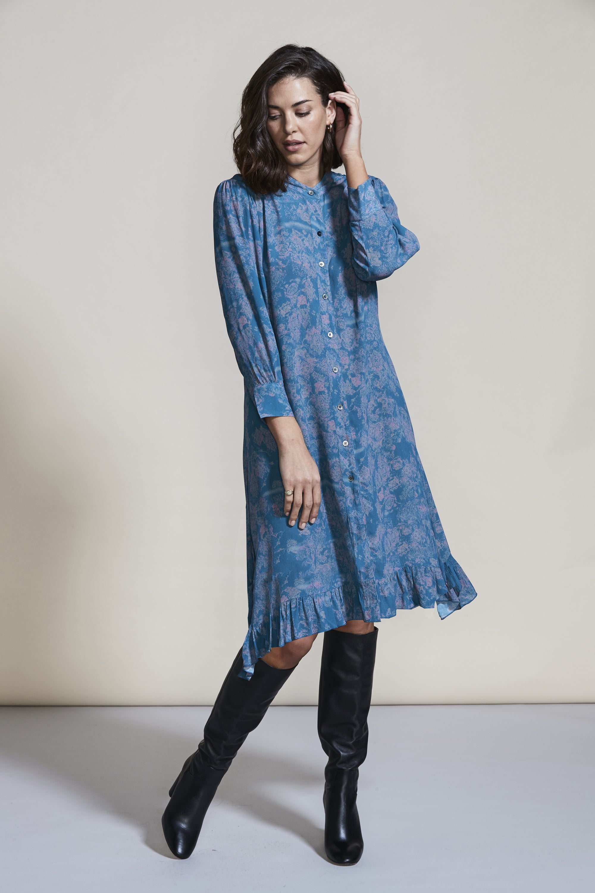 A button-through shirt dress in our ornate Easton Print. Designed with a voluminous high-low hemline, hem frill and sleeve gathers for a feminine elegance. Step into a pair of heeled boots to complete the look.