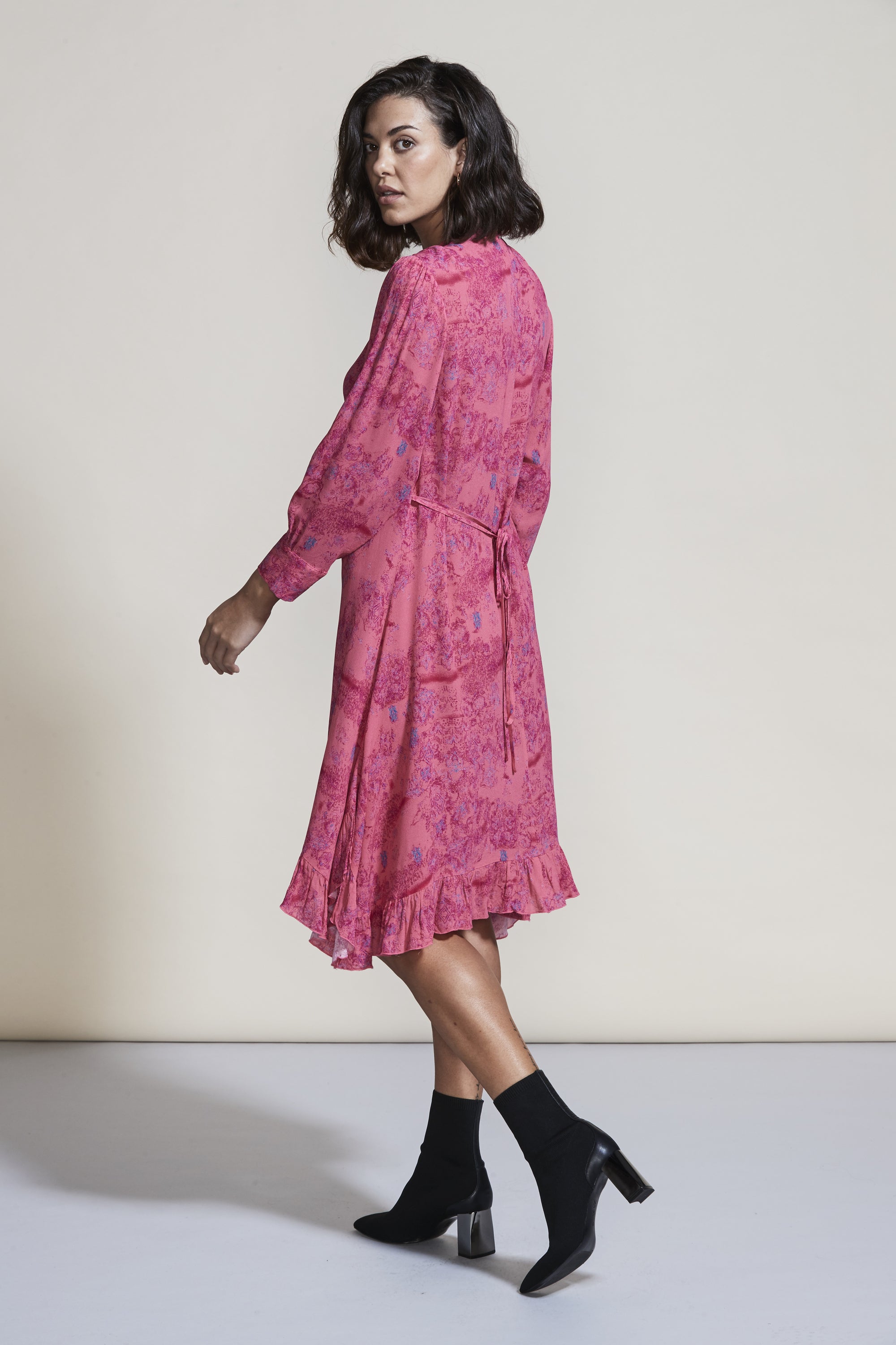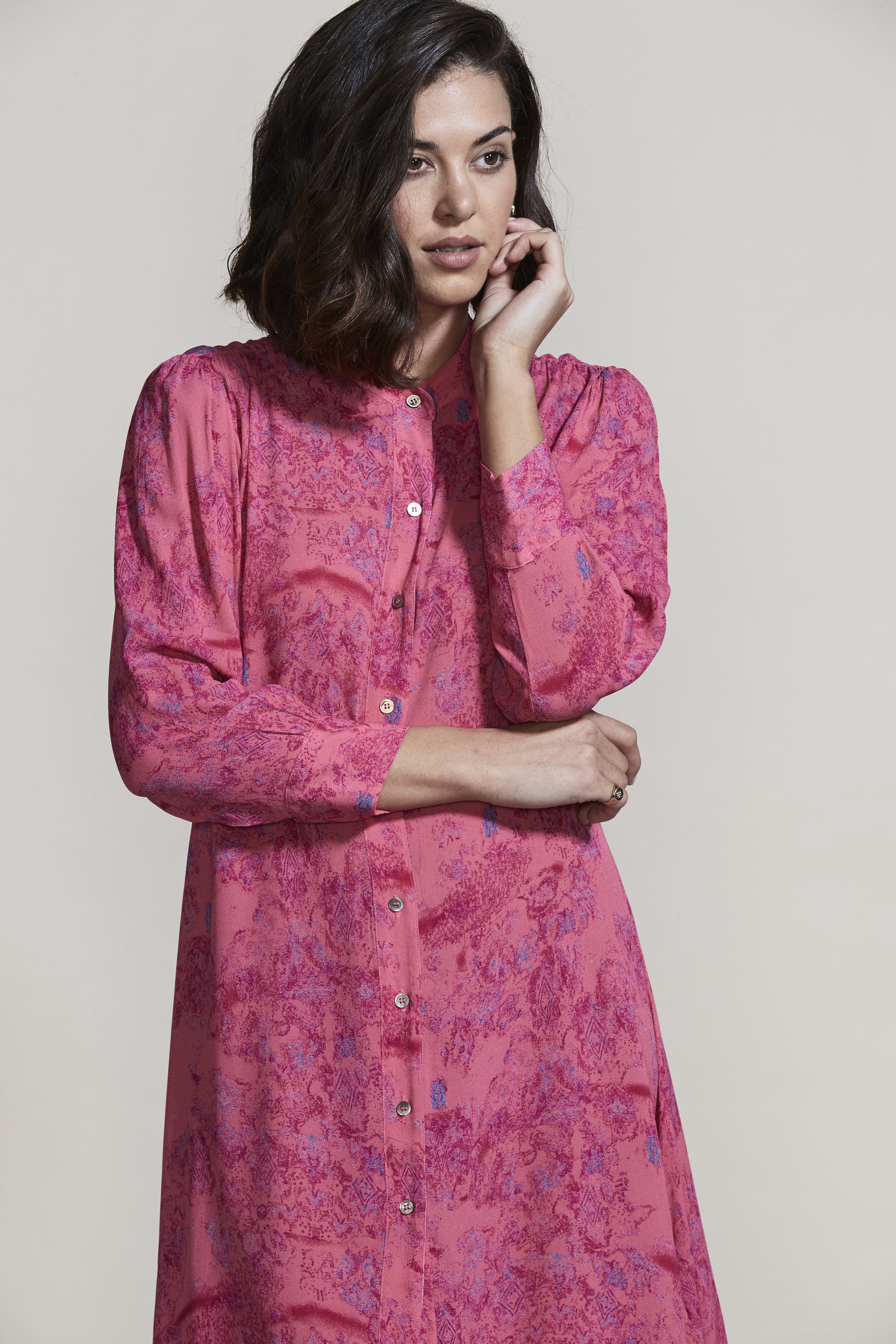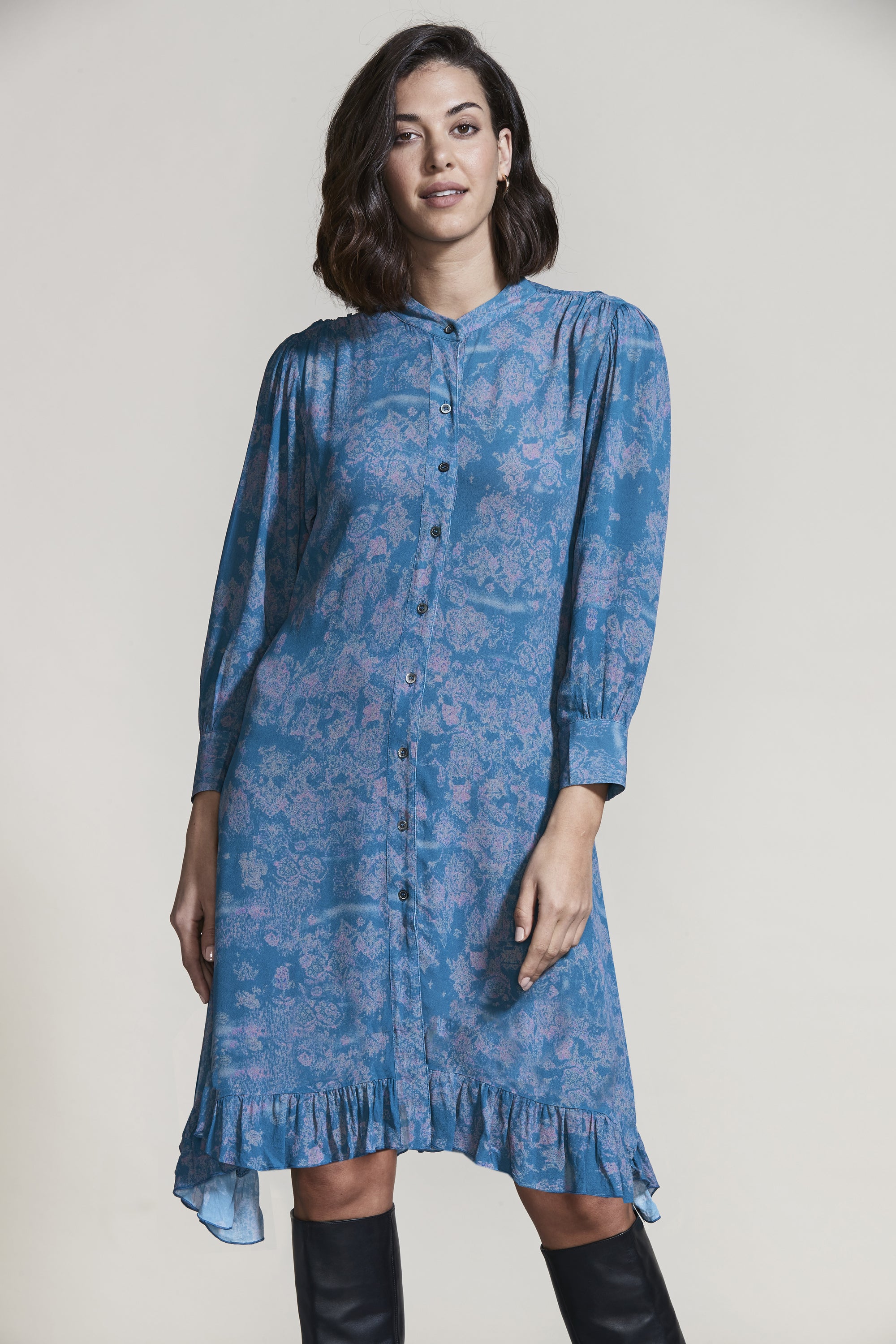 A button-through shirt dress in our ornate Easton Print. Designed with a voluminous high-low hemline, hem frill and sleeve gathers for a feminine elegance. Step into a pair of heeled boots to complete the look.