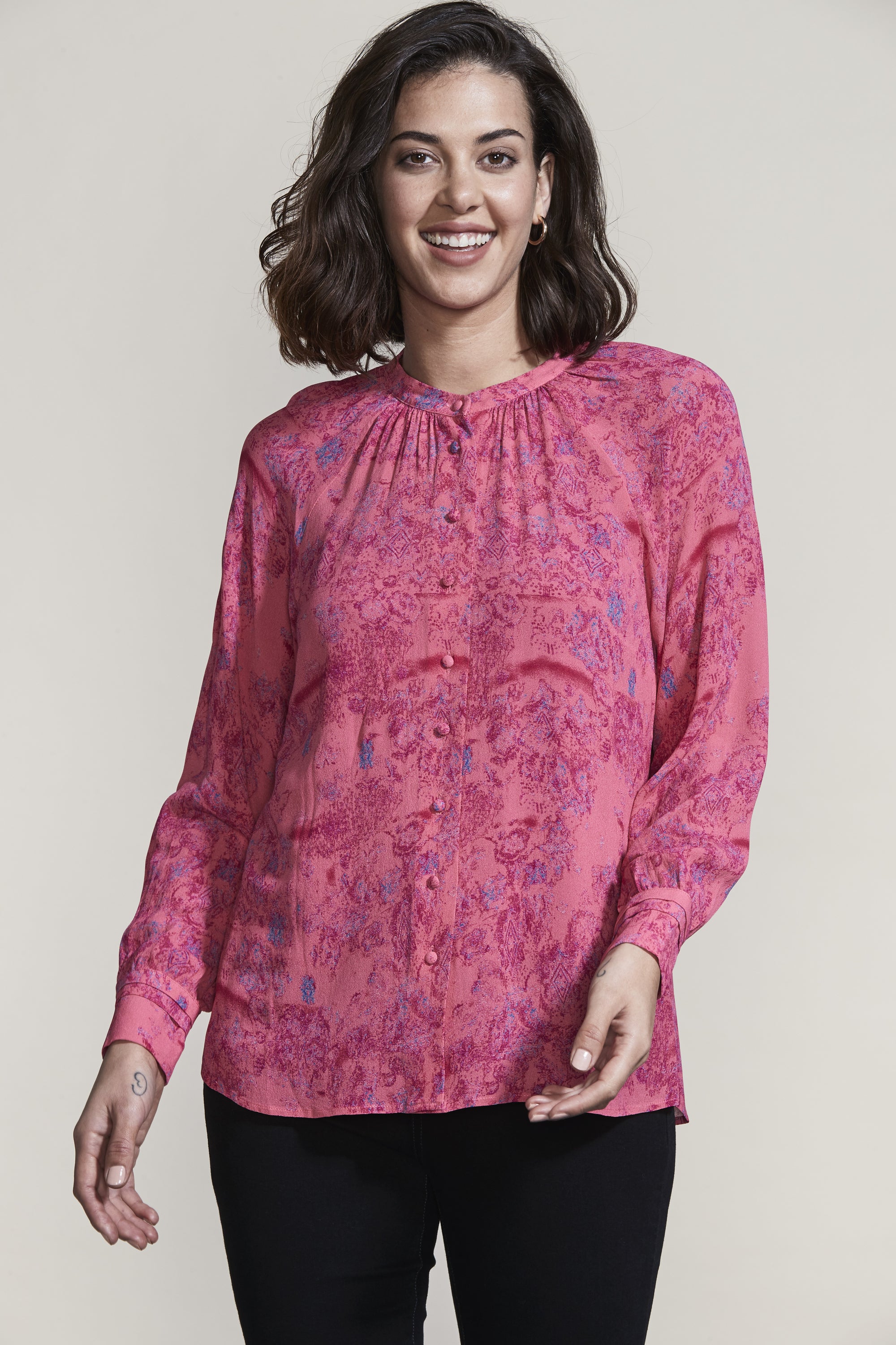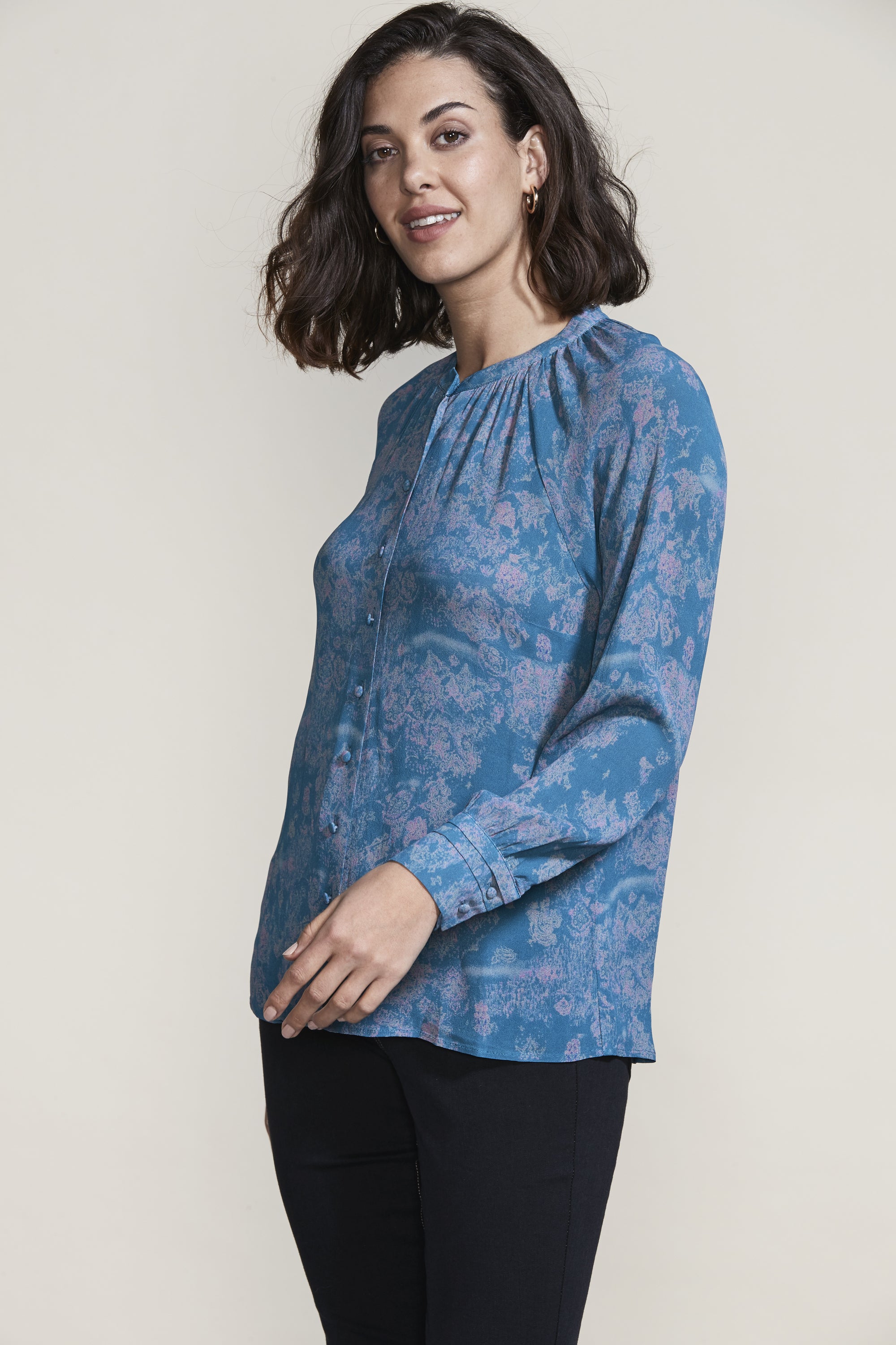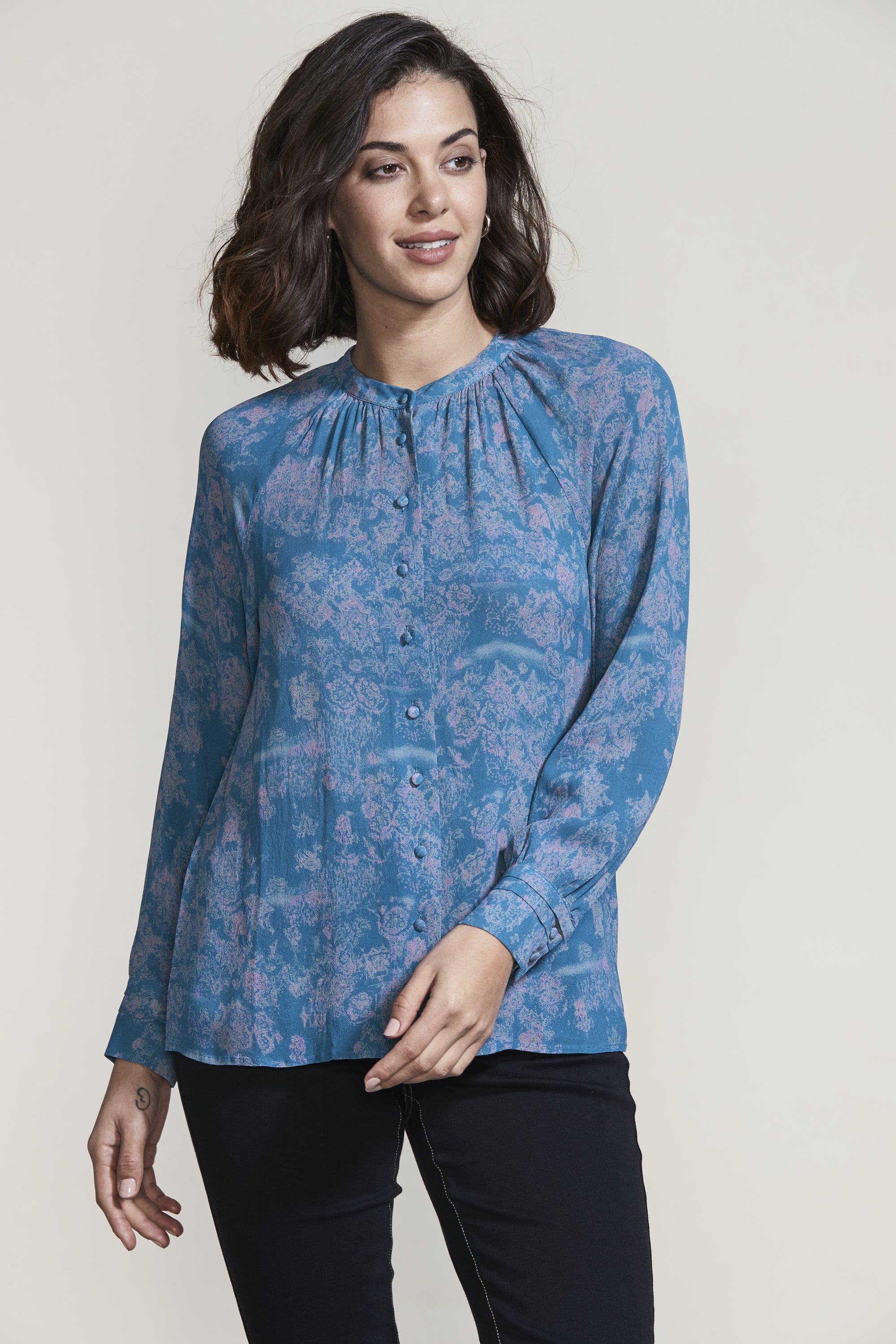 The gathering and tucks of the Easton Shirt compliment the ornate Easton Print beautifully. The French front placket and covered shank buttons create an elegant feel to this relaxed fit blouse.