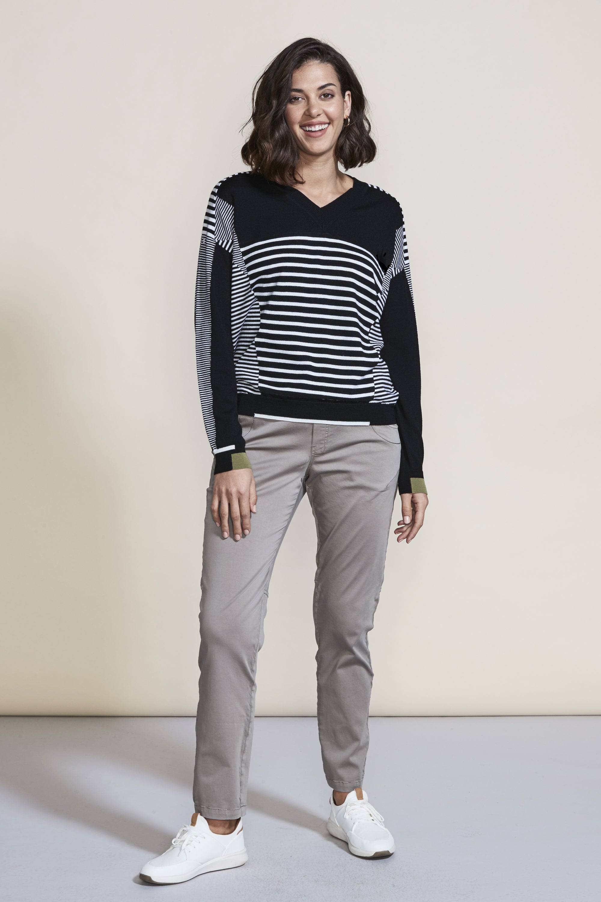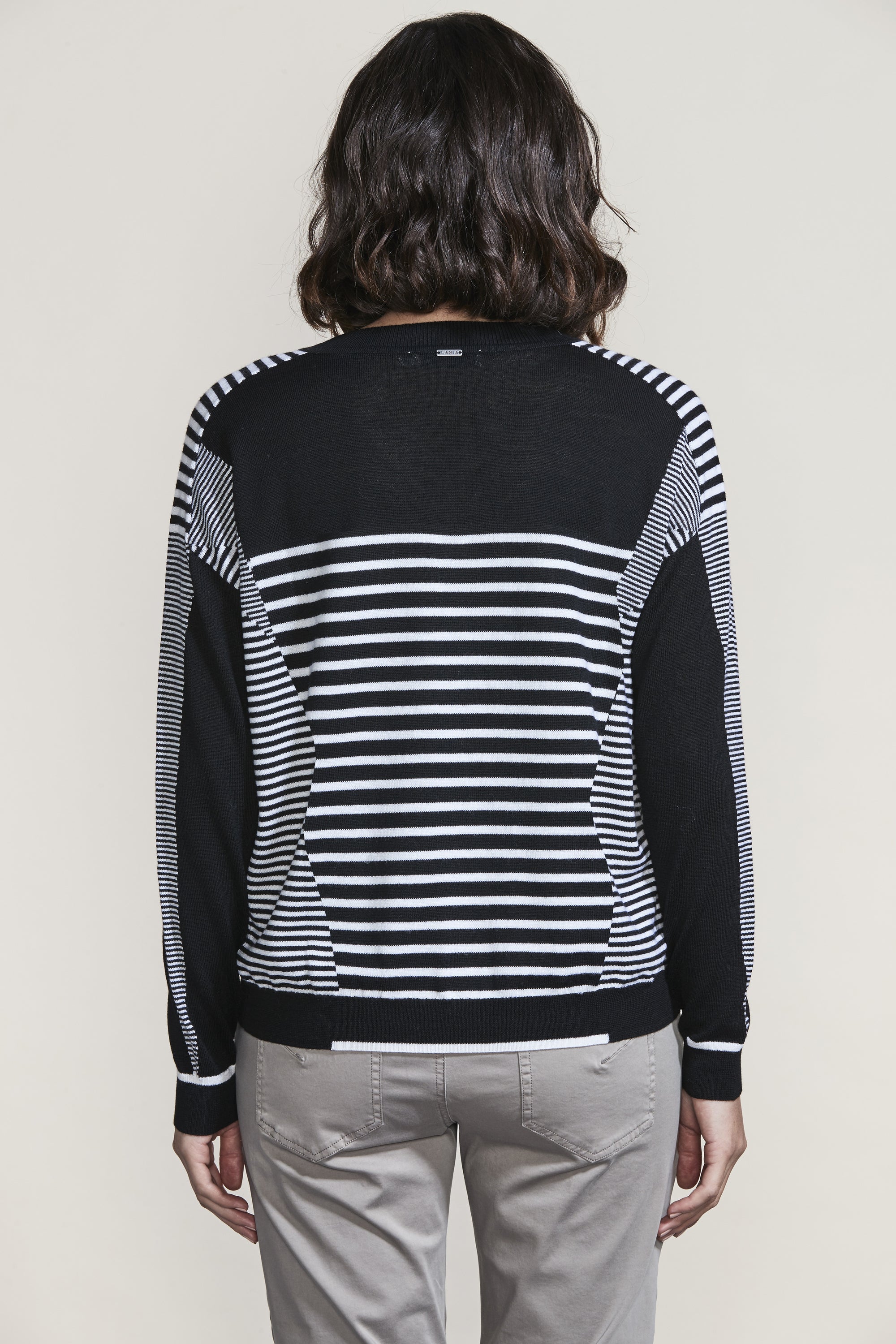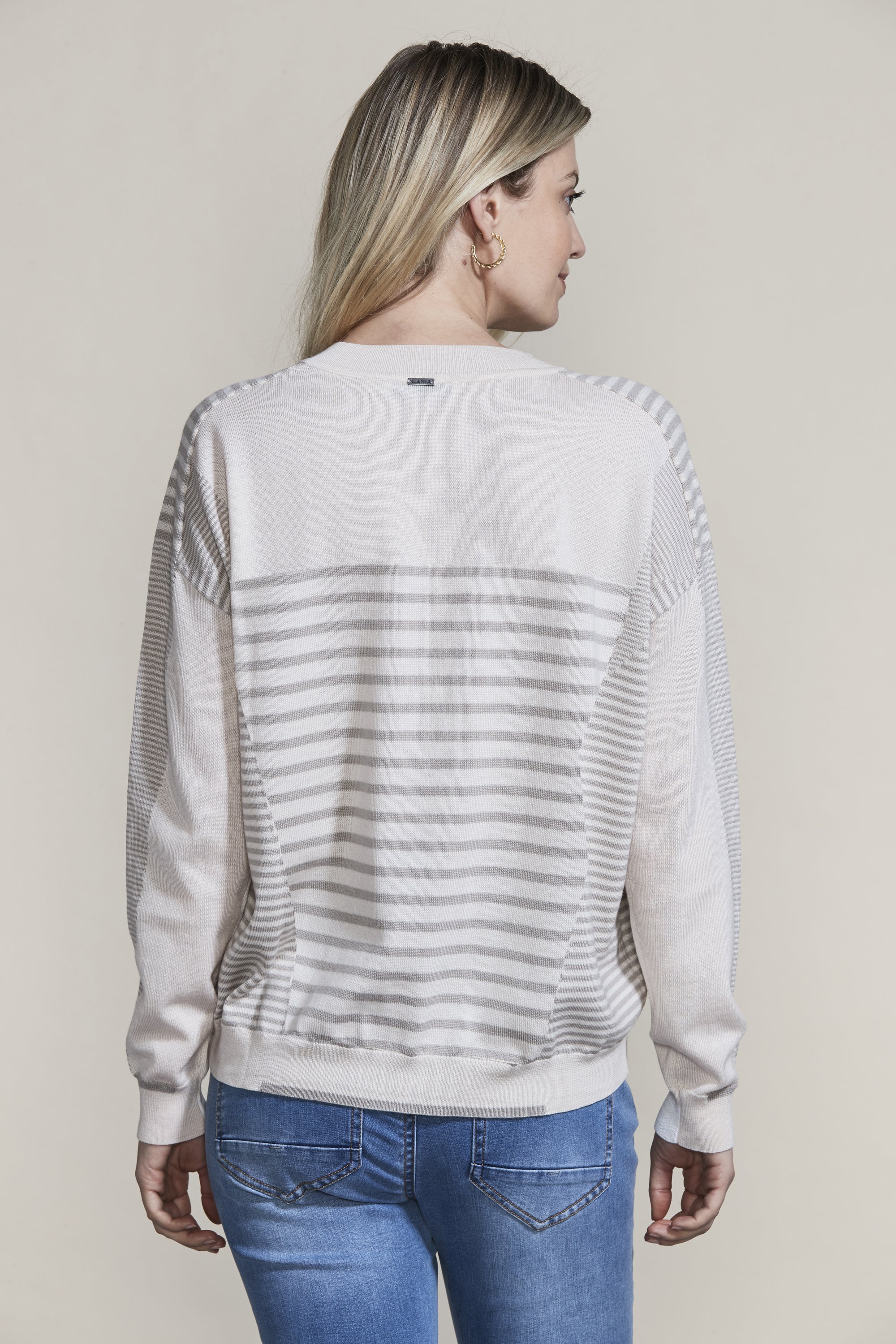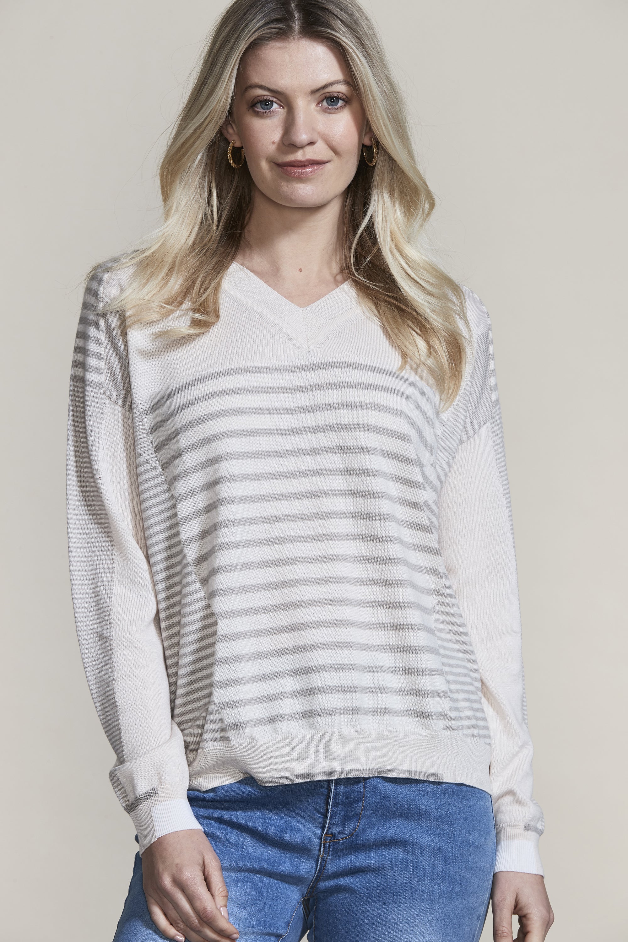 A relaxed fit V-neck sweater in superfine merino yarn. Mixed stripe panelling and a contrast cuff add a sporty twist to this winter essential.