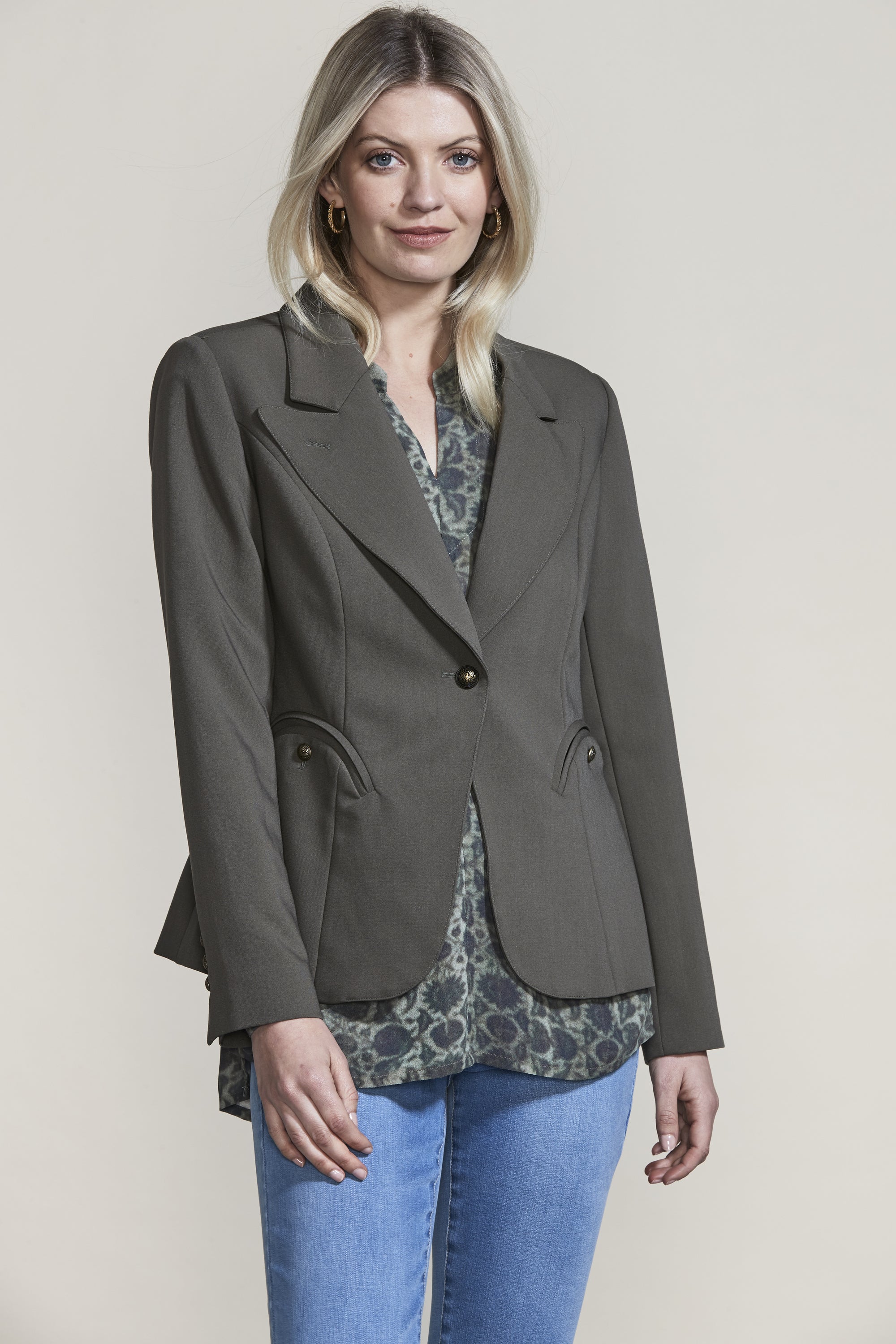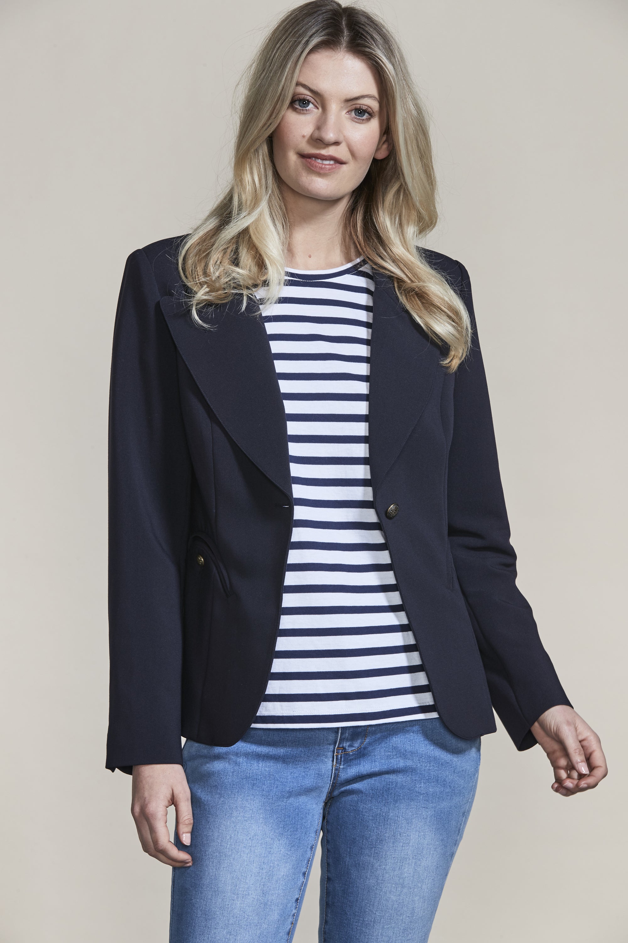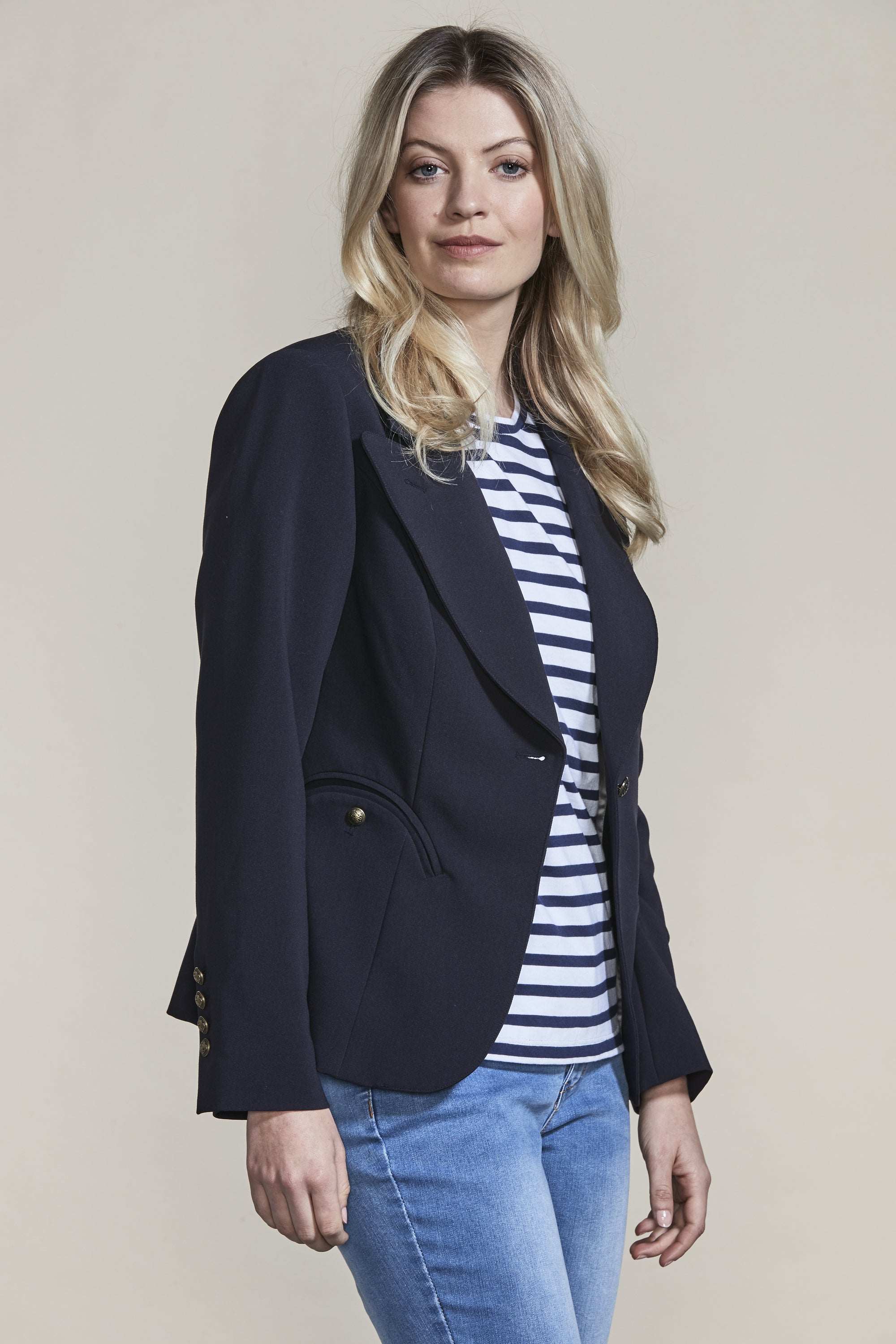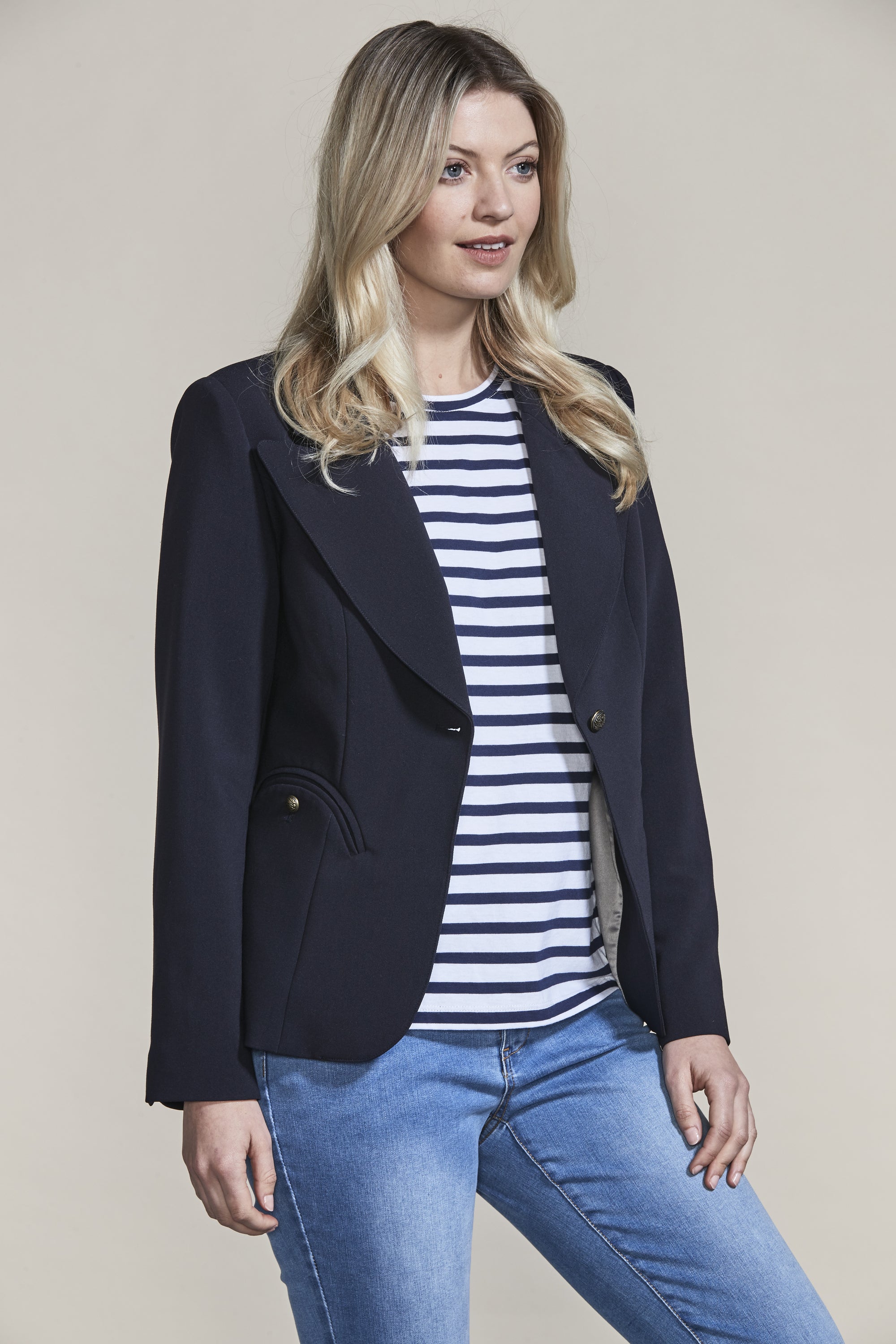 A classic slim fit blazer with a twist — designed with a wide peak lapel, cuff placket and decorative curved jetted pockets. Engraved shank buttons add a sense of luxury to this style.
