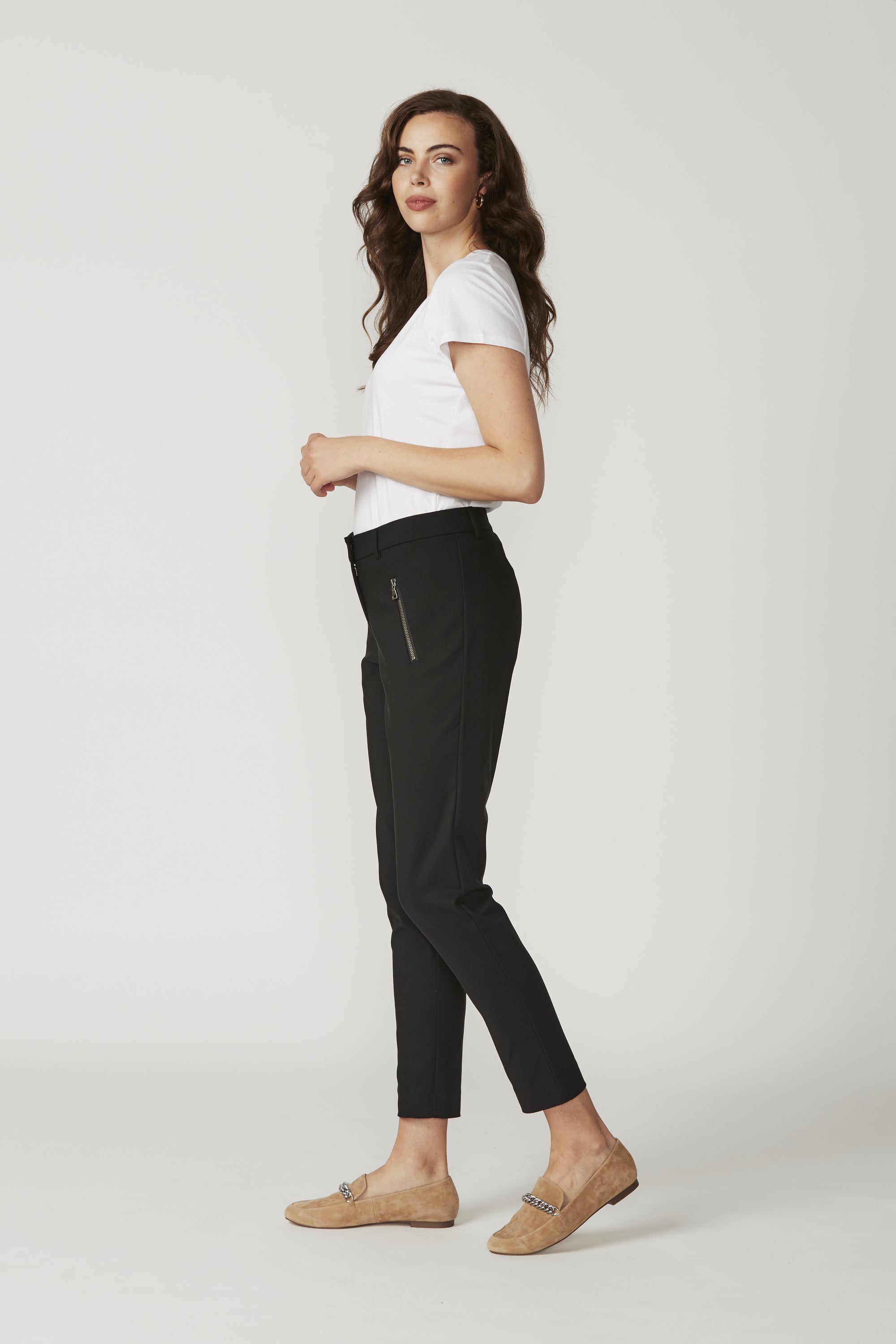 Suit up with our Jolie Pant, sitting mid to high-waisted with centre back elastic panel, slim leg and chunky exposed zipped pockets.