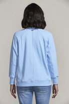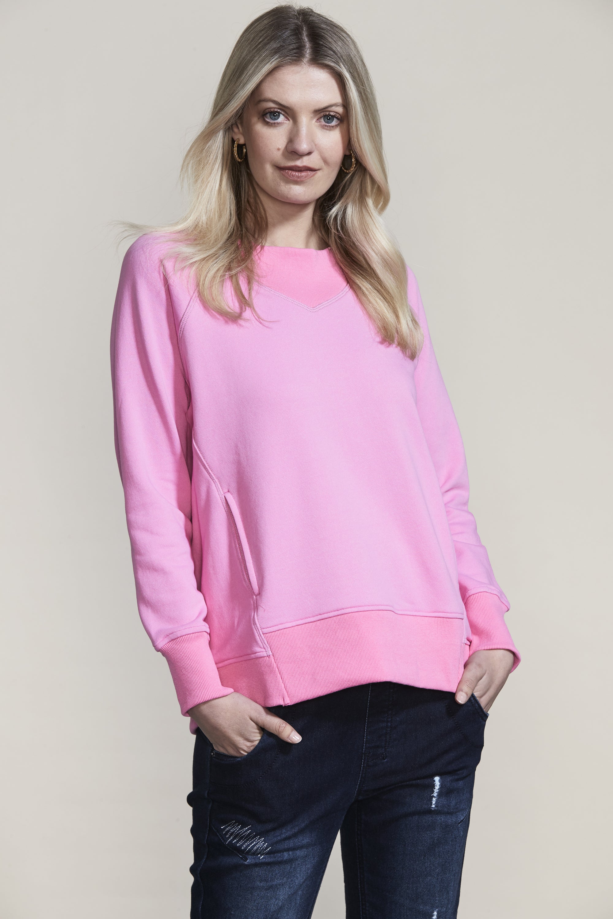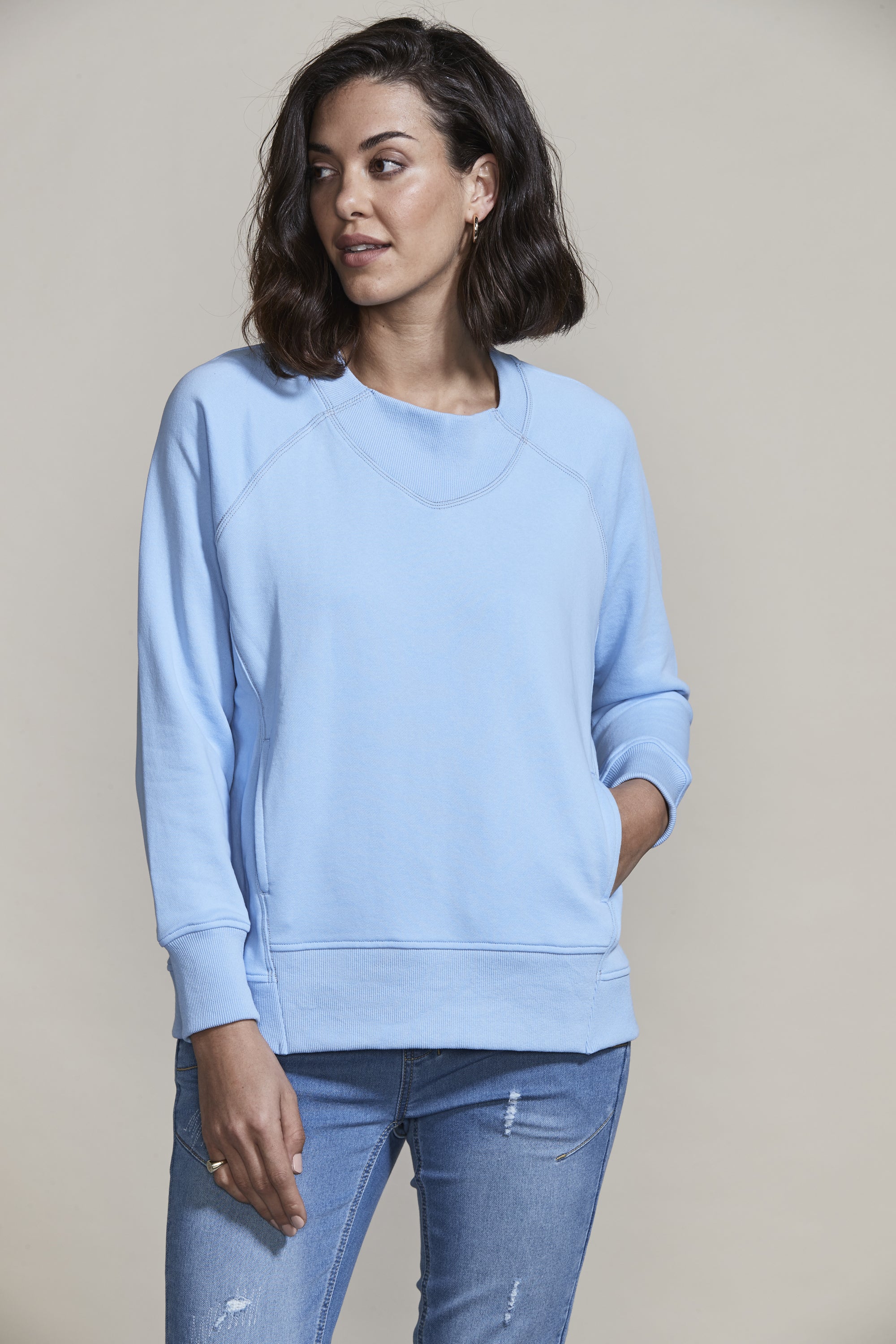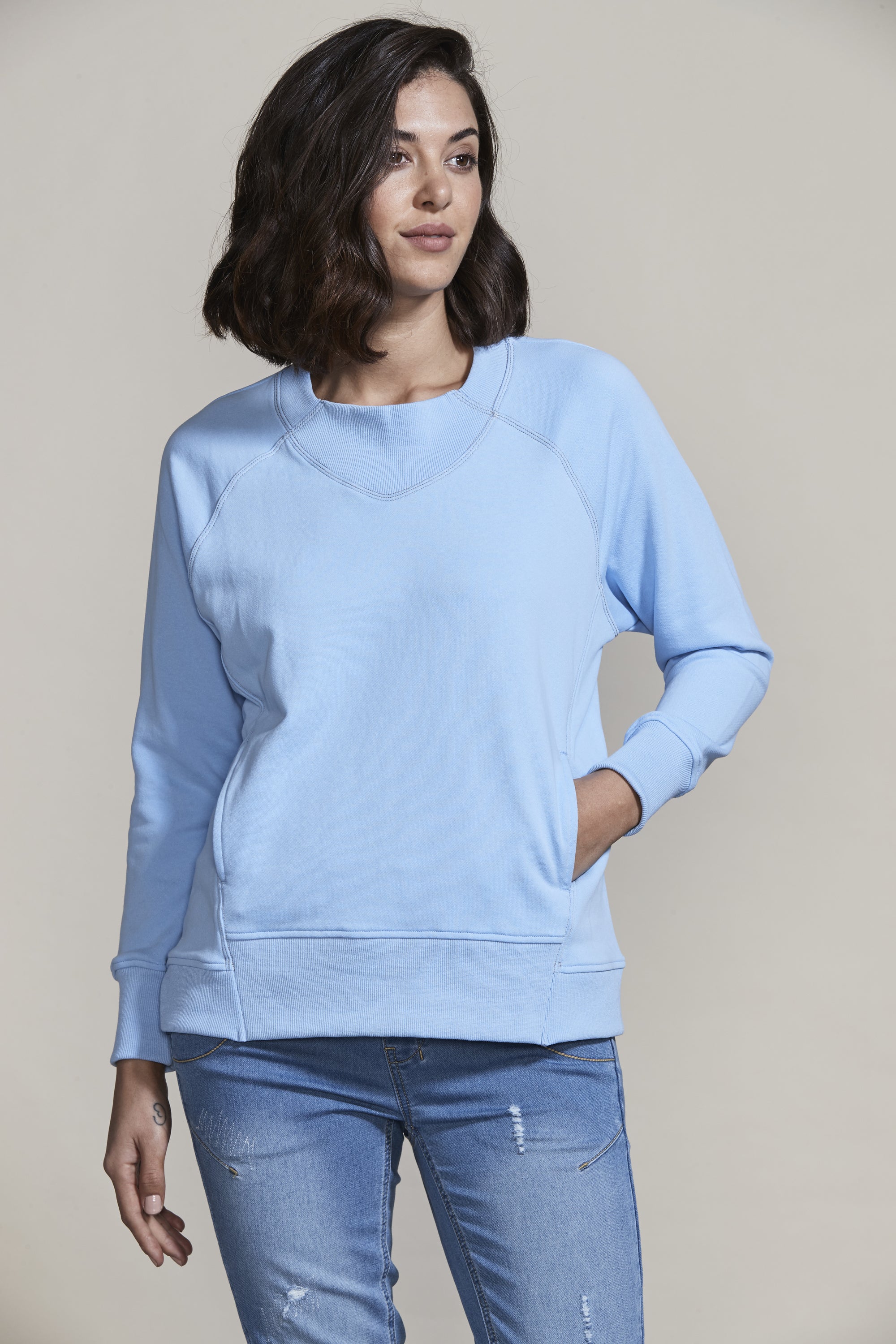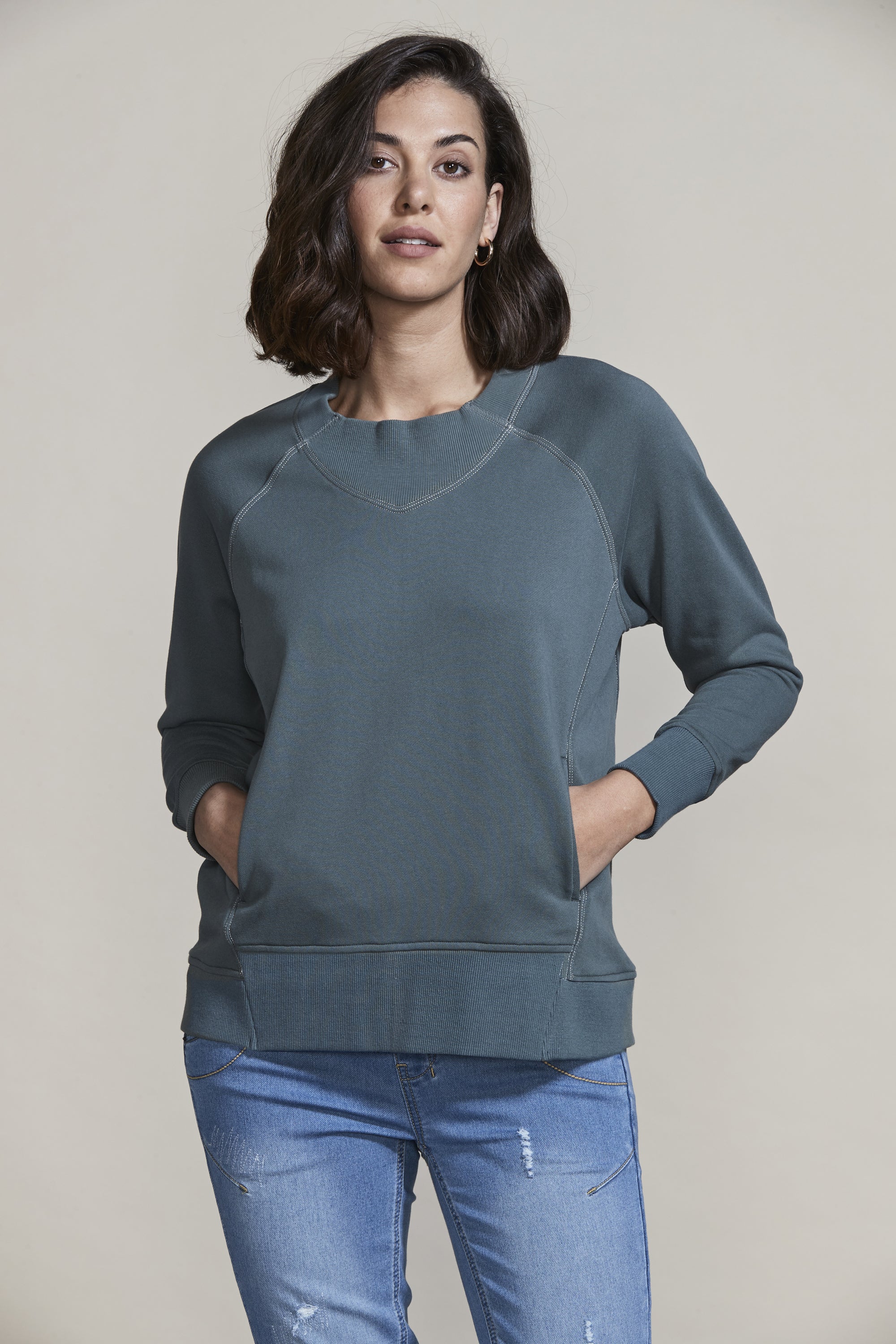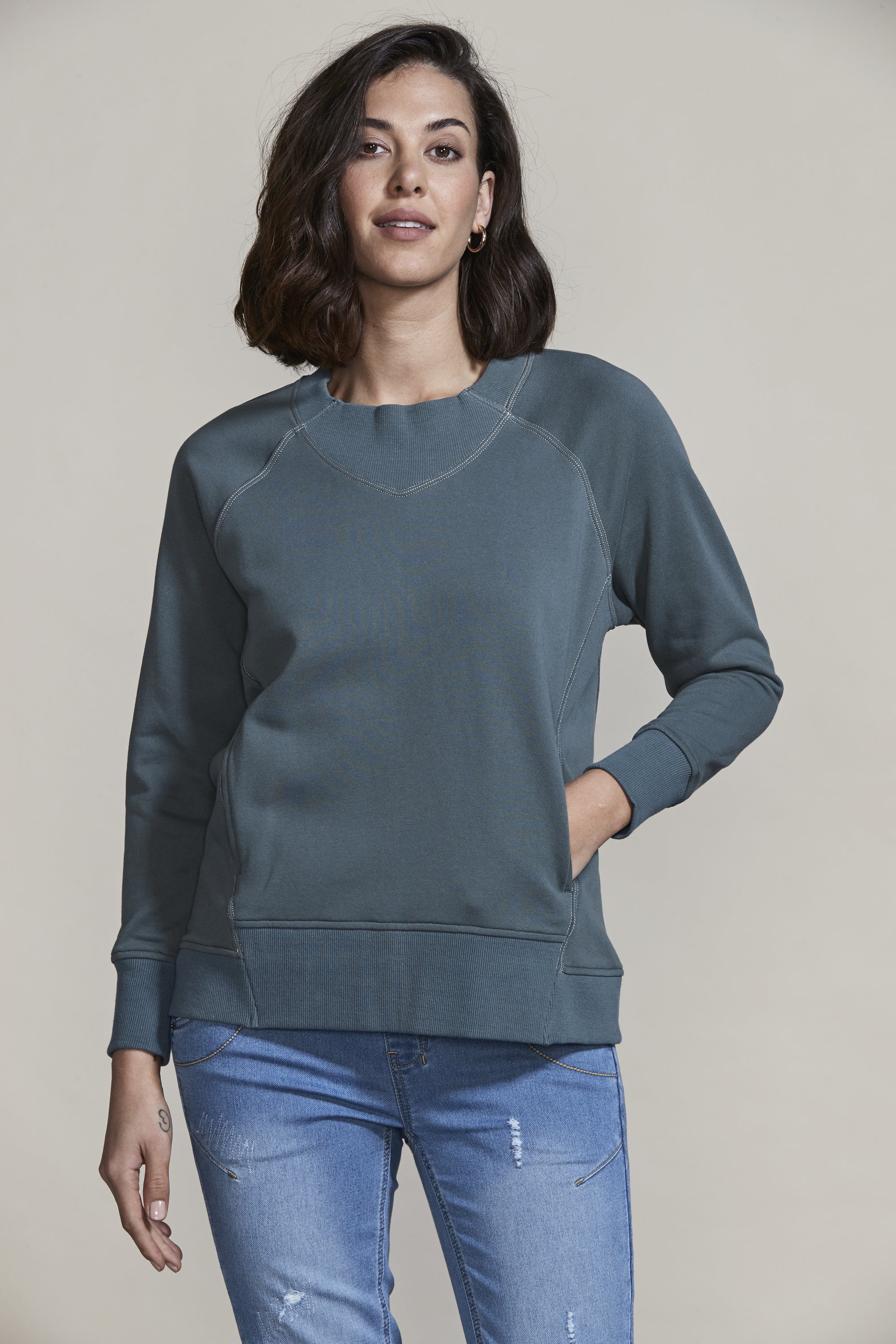 A modern raglan sleeve sweater with rib neckband, cuff and hem band. In-seam pockets and triple needle contrast topstitching add a touch of personality. Pair with our boyfriend jean and sneakers for an effortless off-duty look.