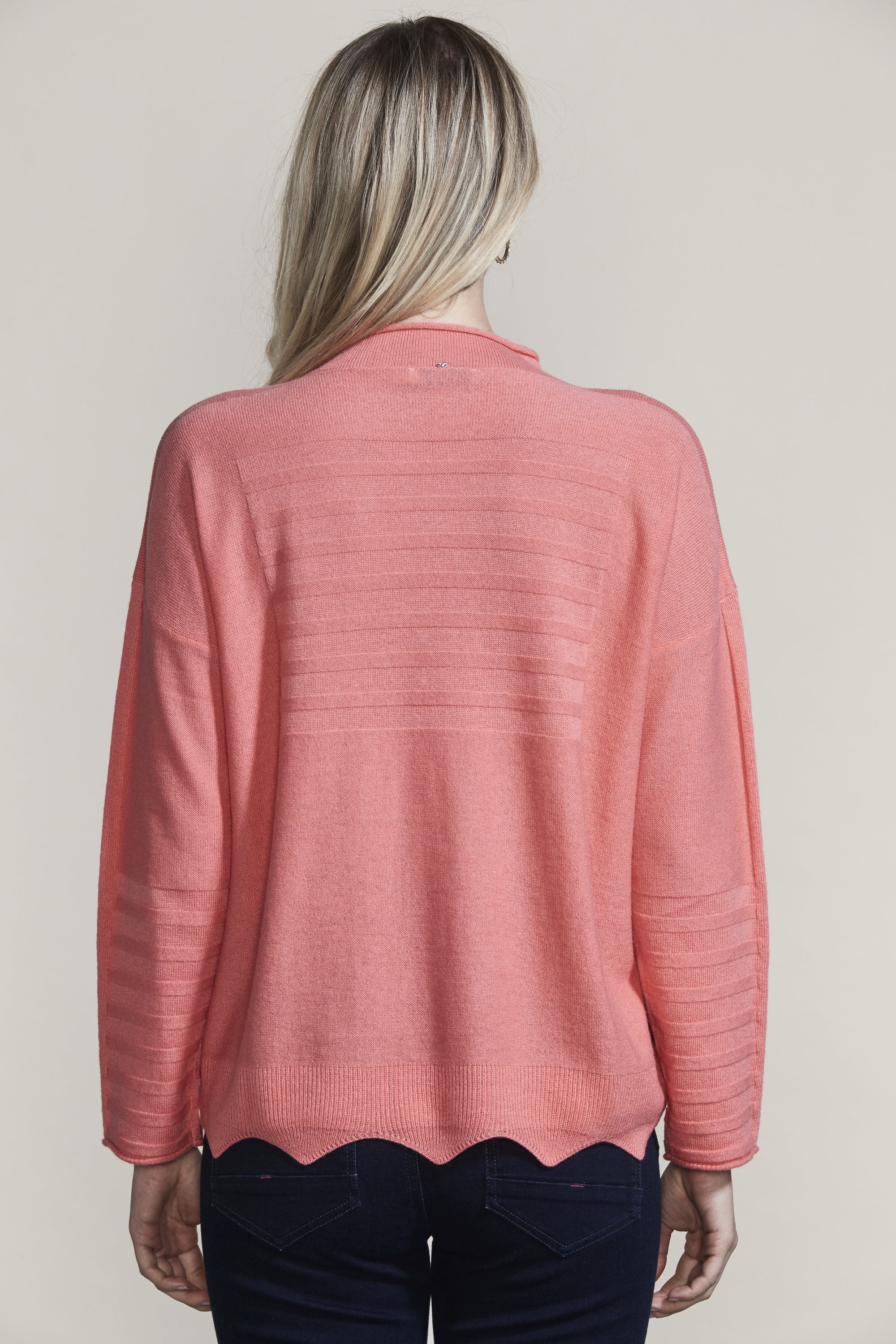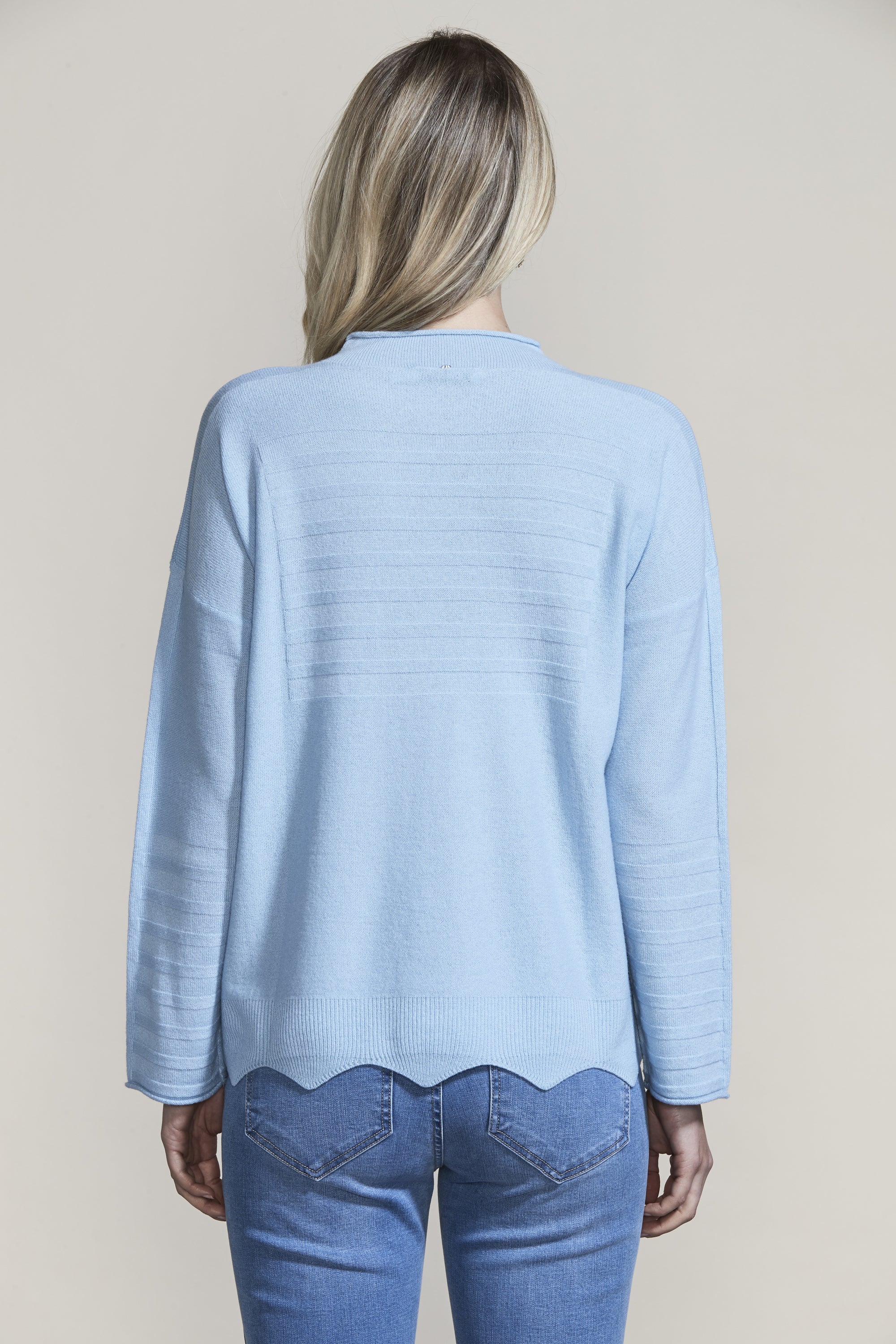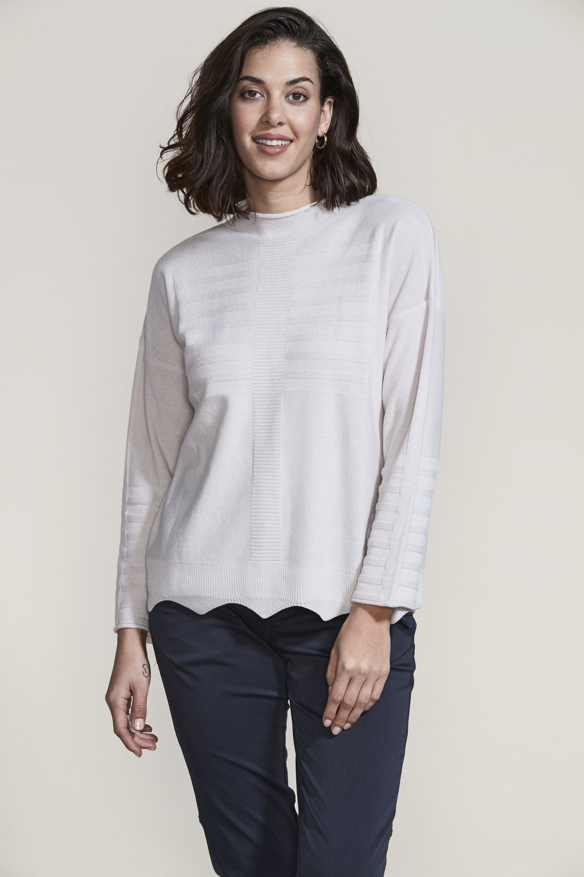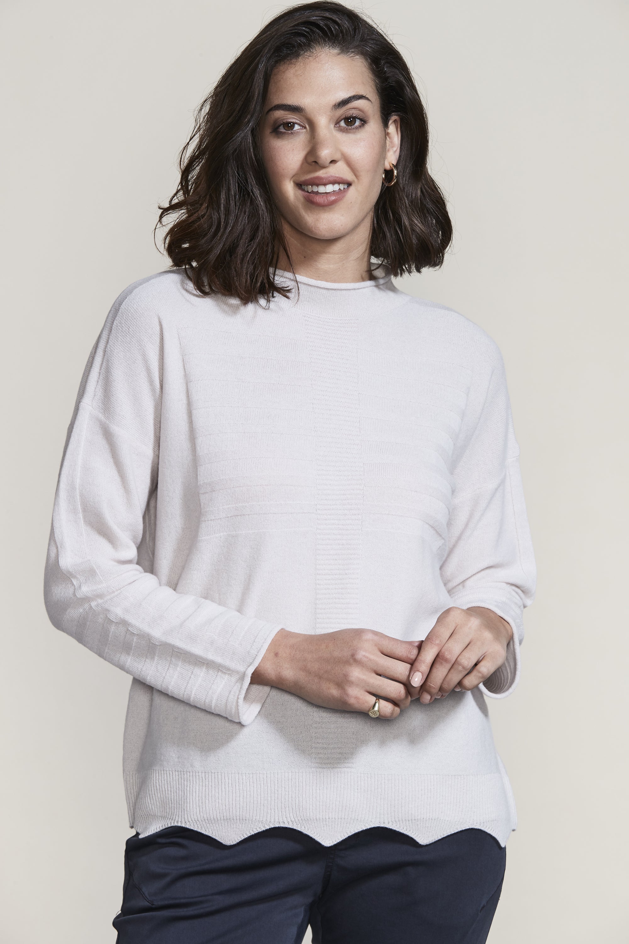 The scallop hem and knit rib design add intrigue to our Pearl Sweater in the luxurious merino and cashmere blend yarn. The flattering funnel neck and drop-shoulder will keep you stylish and warm this winter.