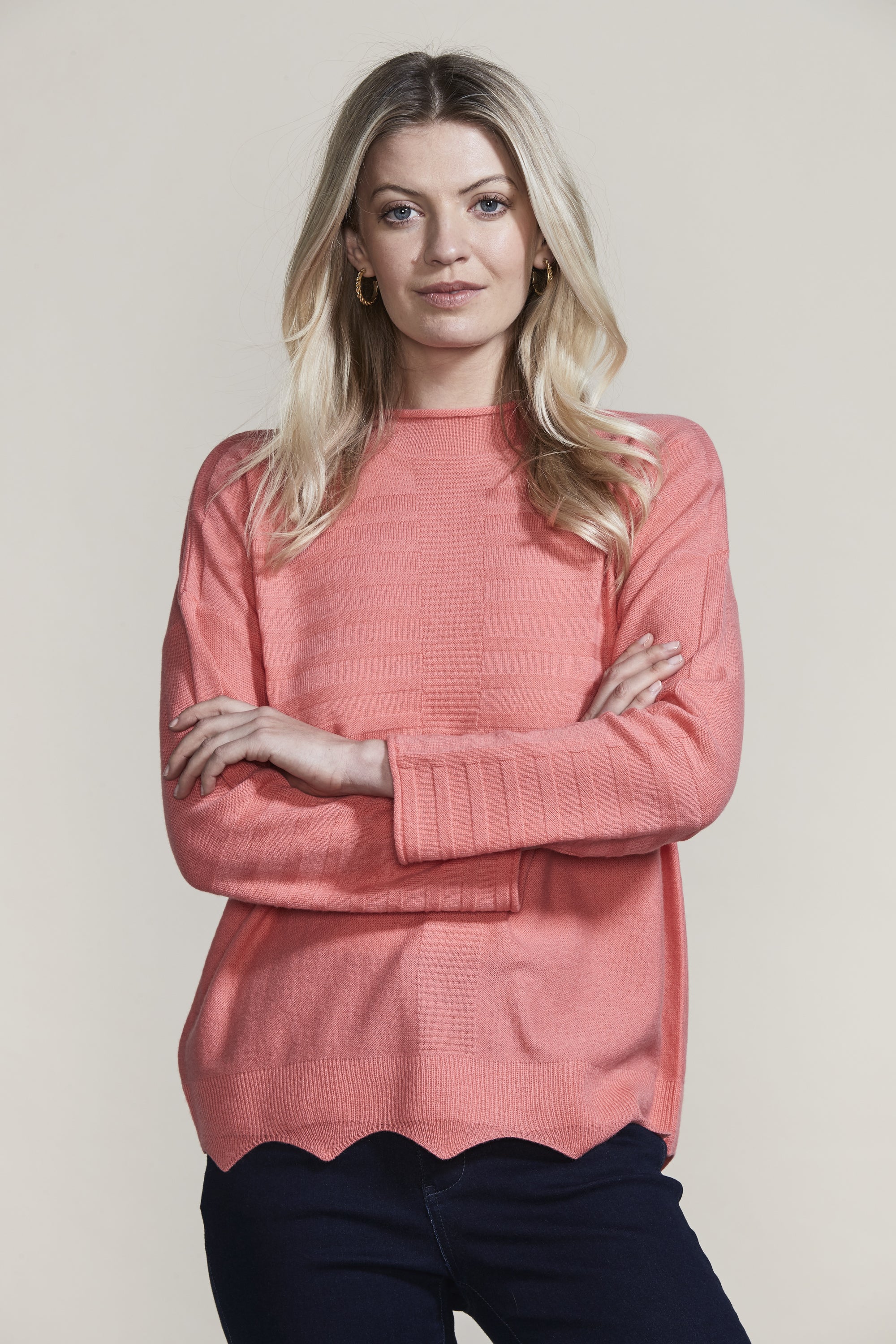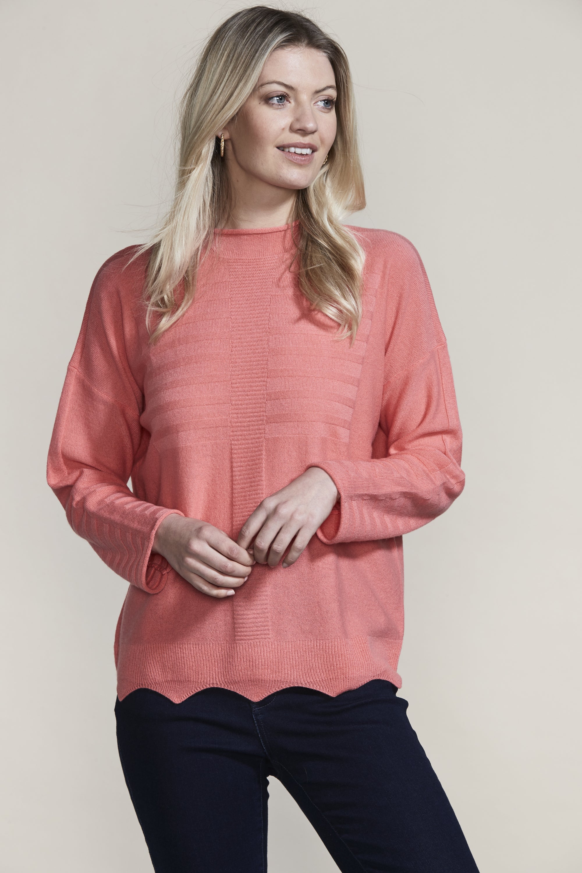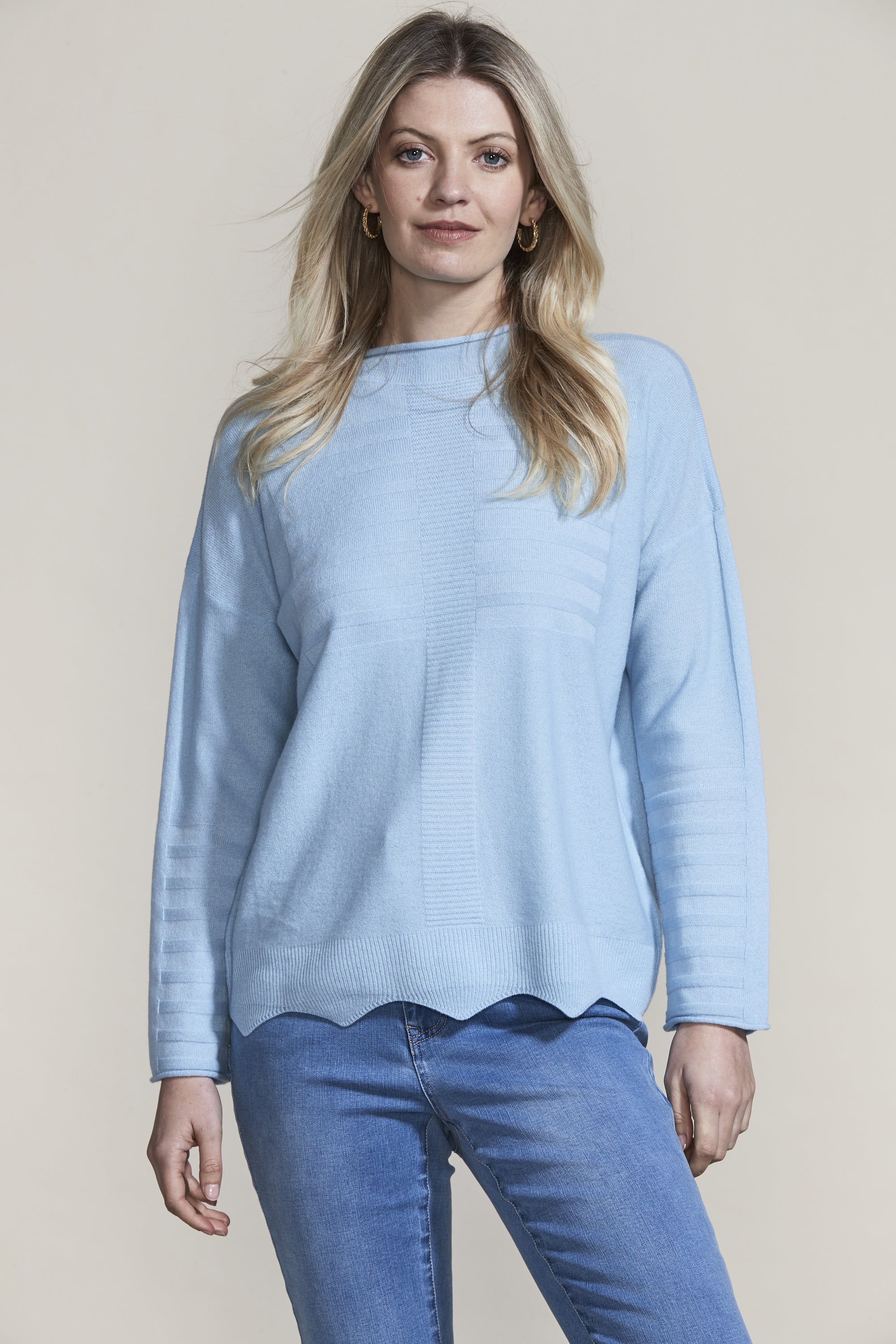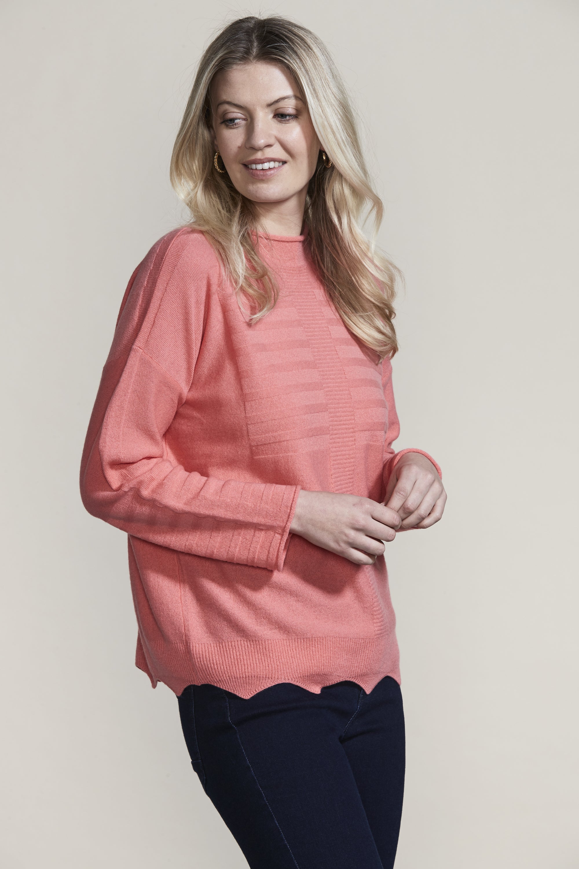 The scallop hem and knit rib design add intrigue to our Pearl Sweater in the luxurious merino and cashmere blend yarn. The flattering funnel neck and drop-shoulder will keep you stylish and warm this winter.