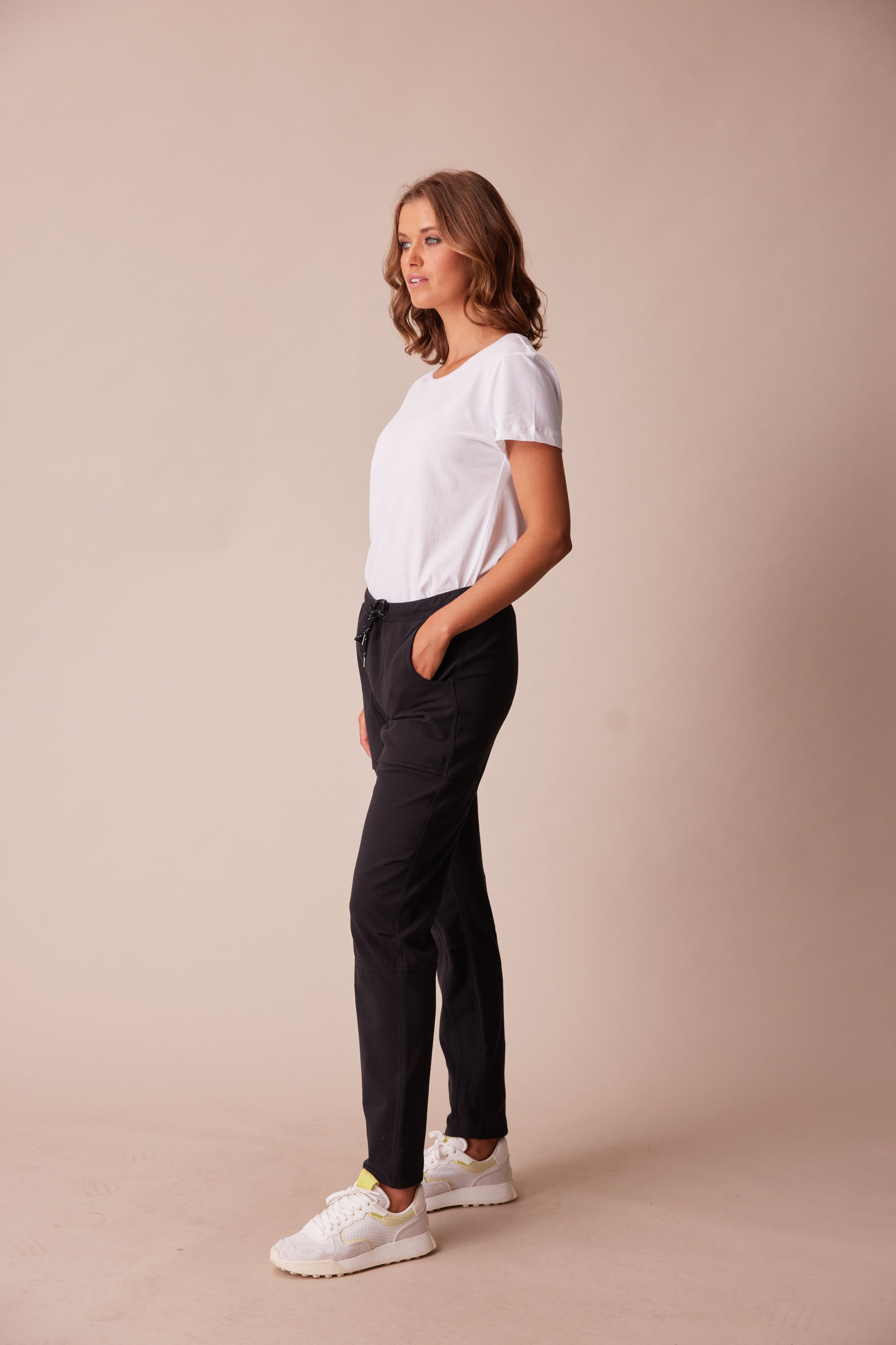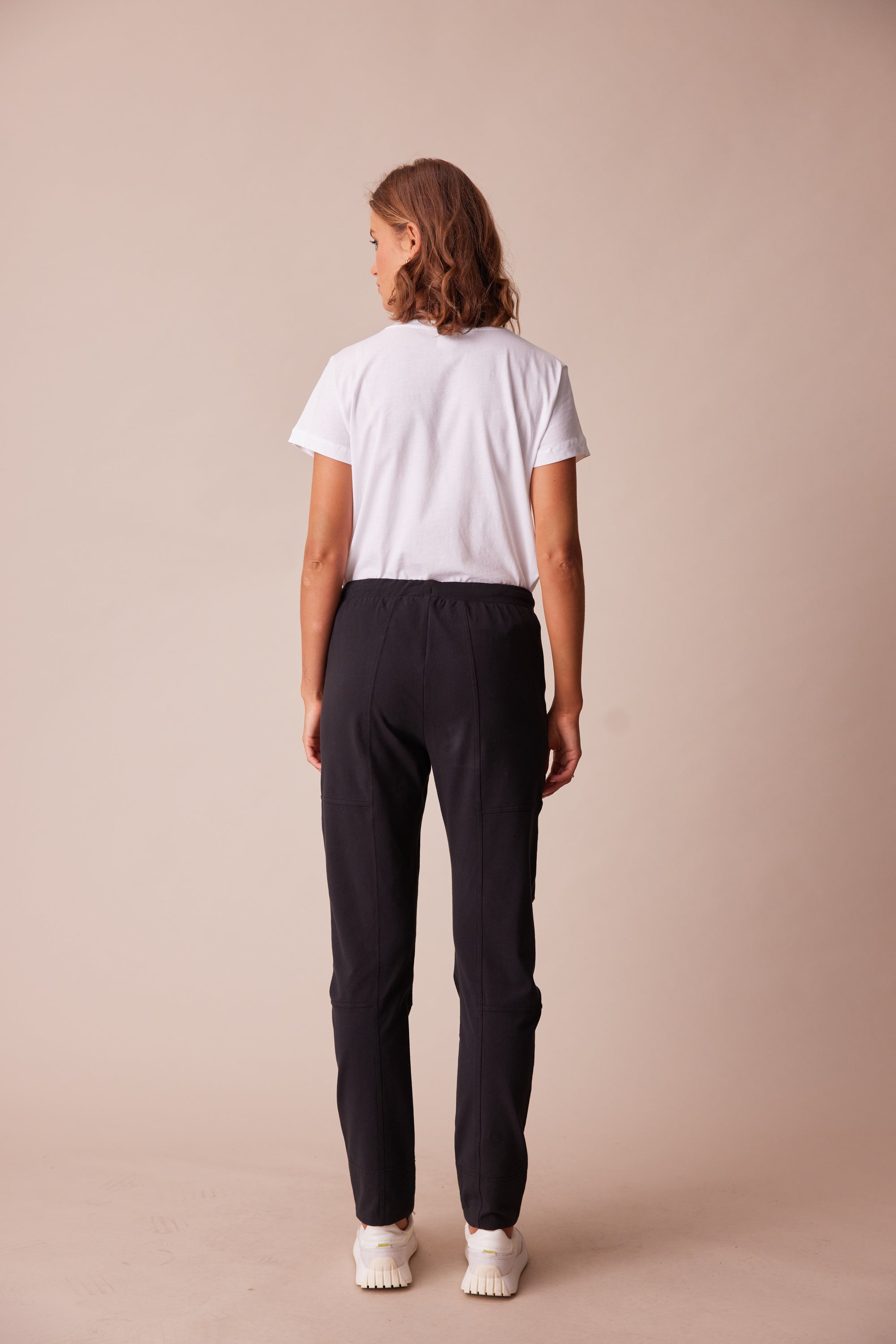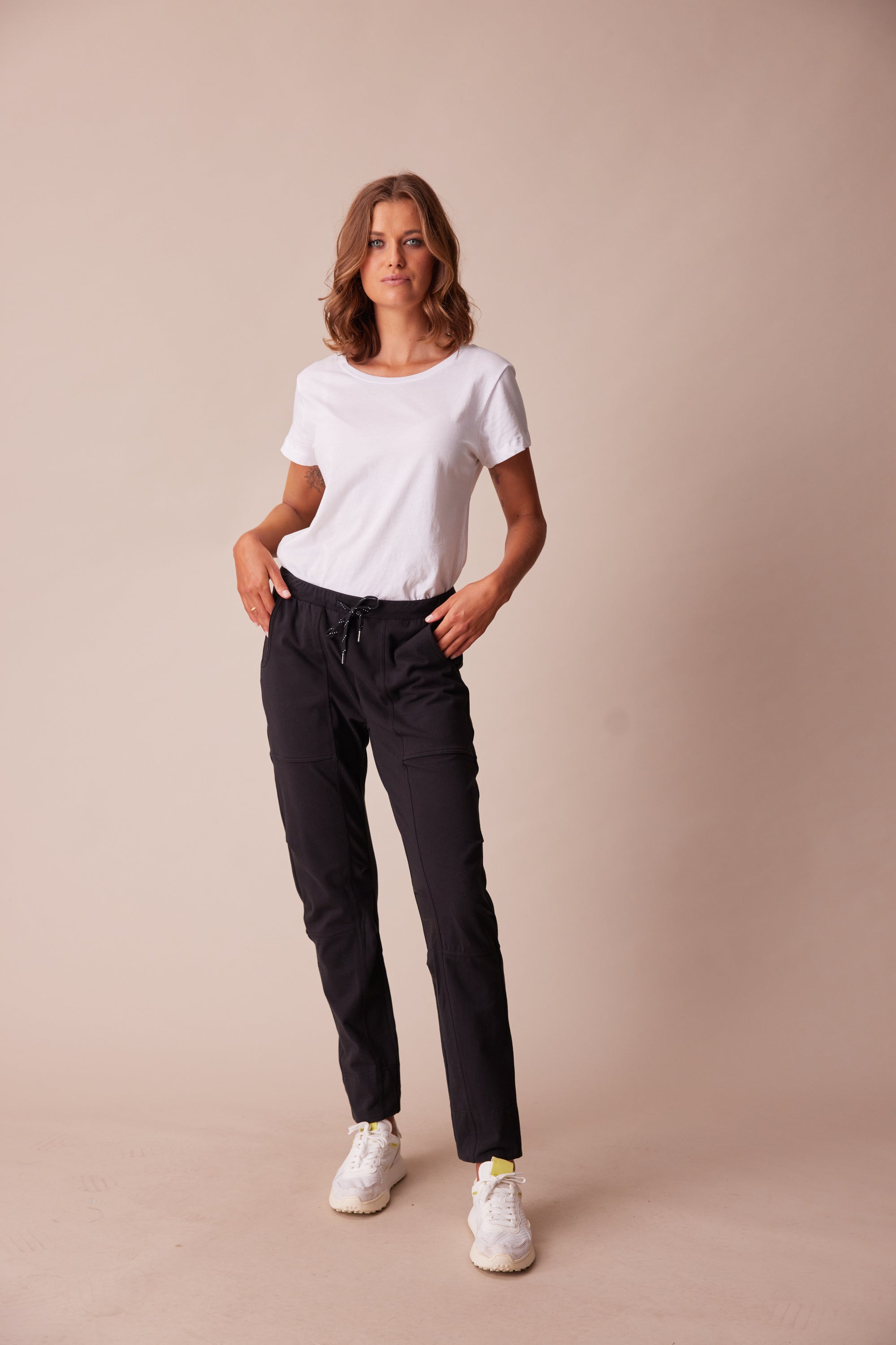 A casual jersey pant with patch pockets, dart detailing and a contrast hem turn up. Perfect for weekend strolls or lounging at home. Wear with the Retreat Jacket to complete the look.