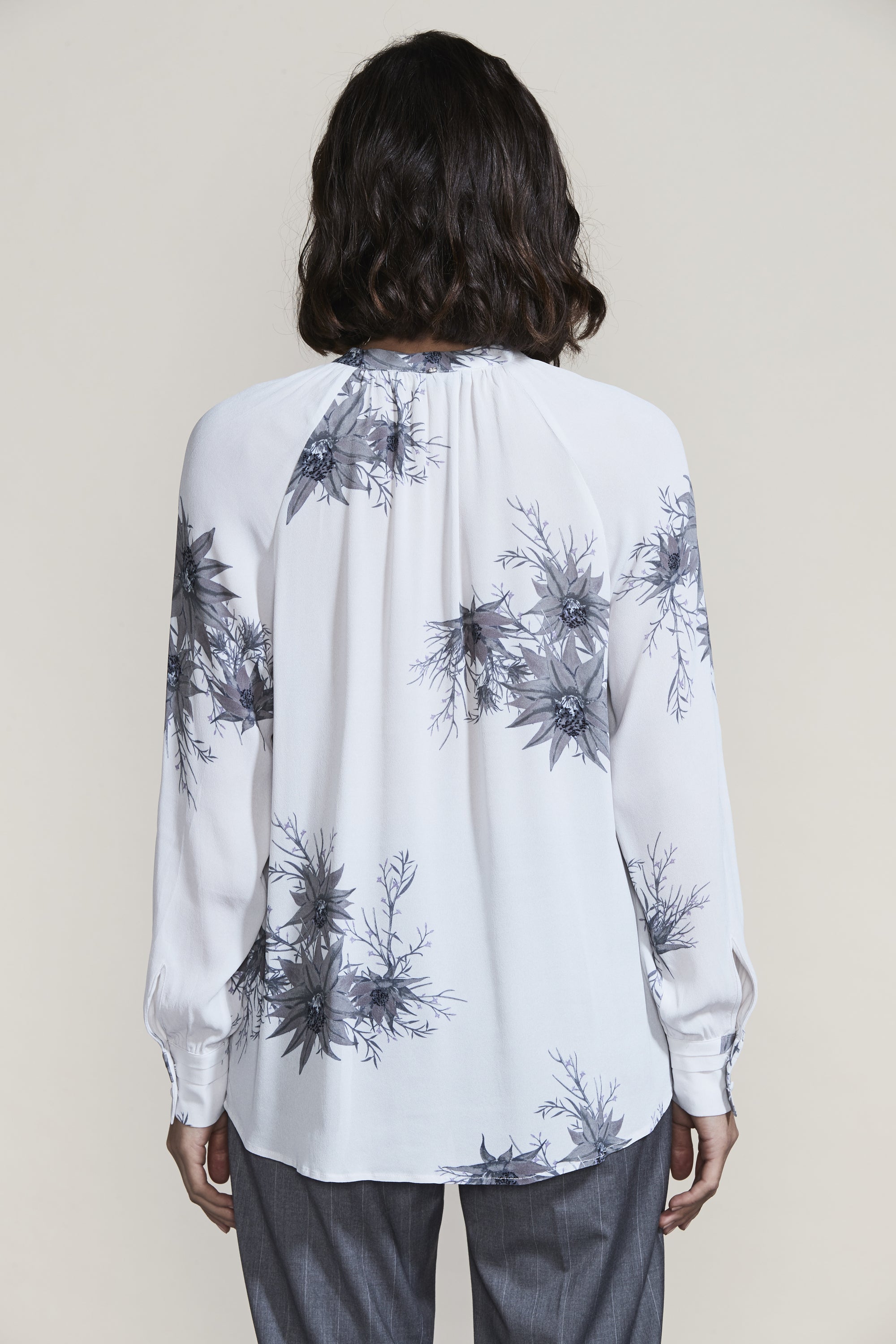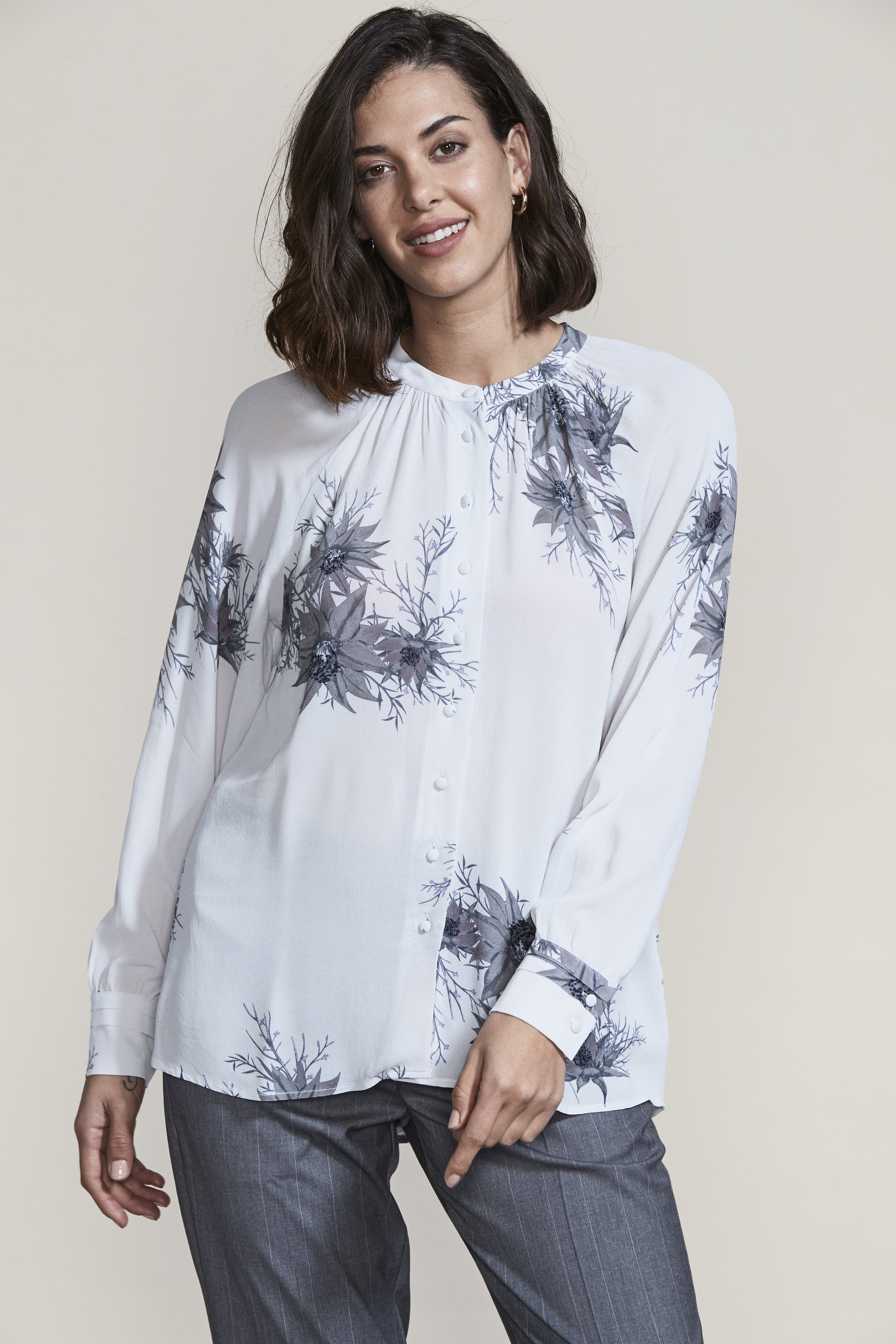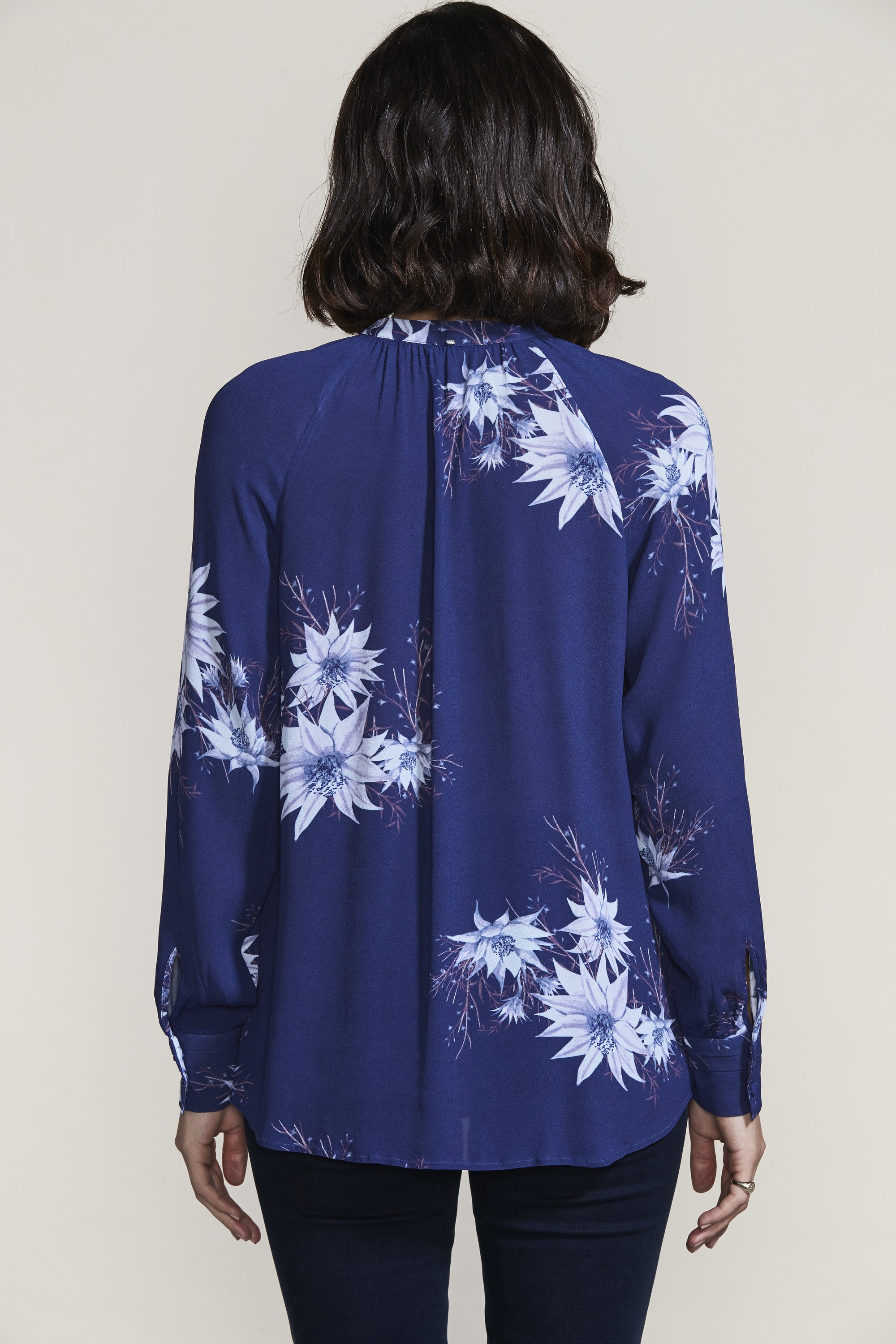 The gathering and tucks of the Reve Shirt compliment the intricate floral Reve Print beautifully. The French front placket and covered shank buttons create an elegant feel to this relaxed fit blouse.