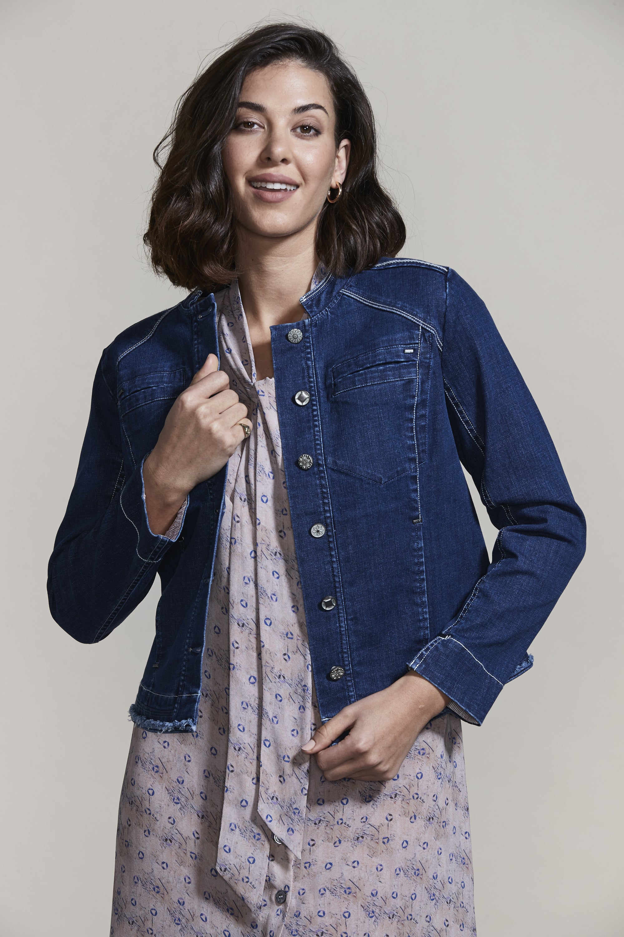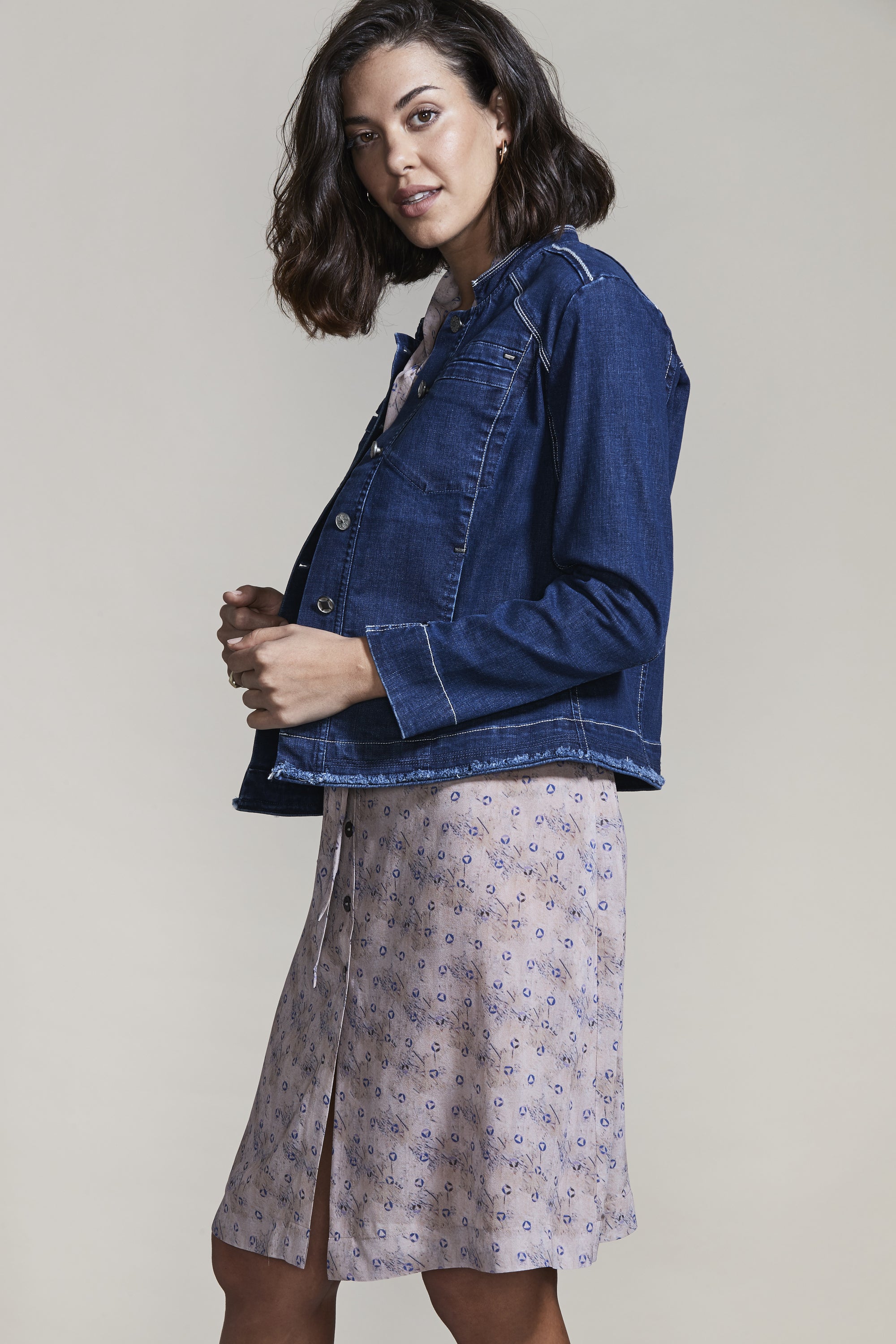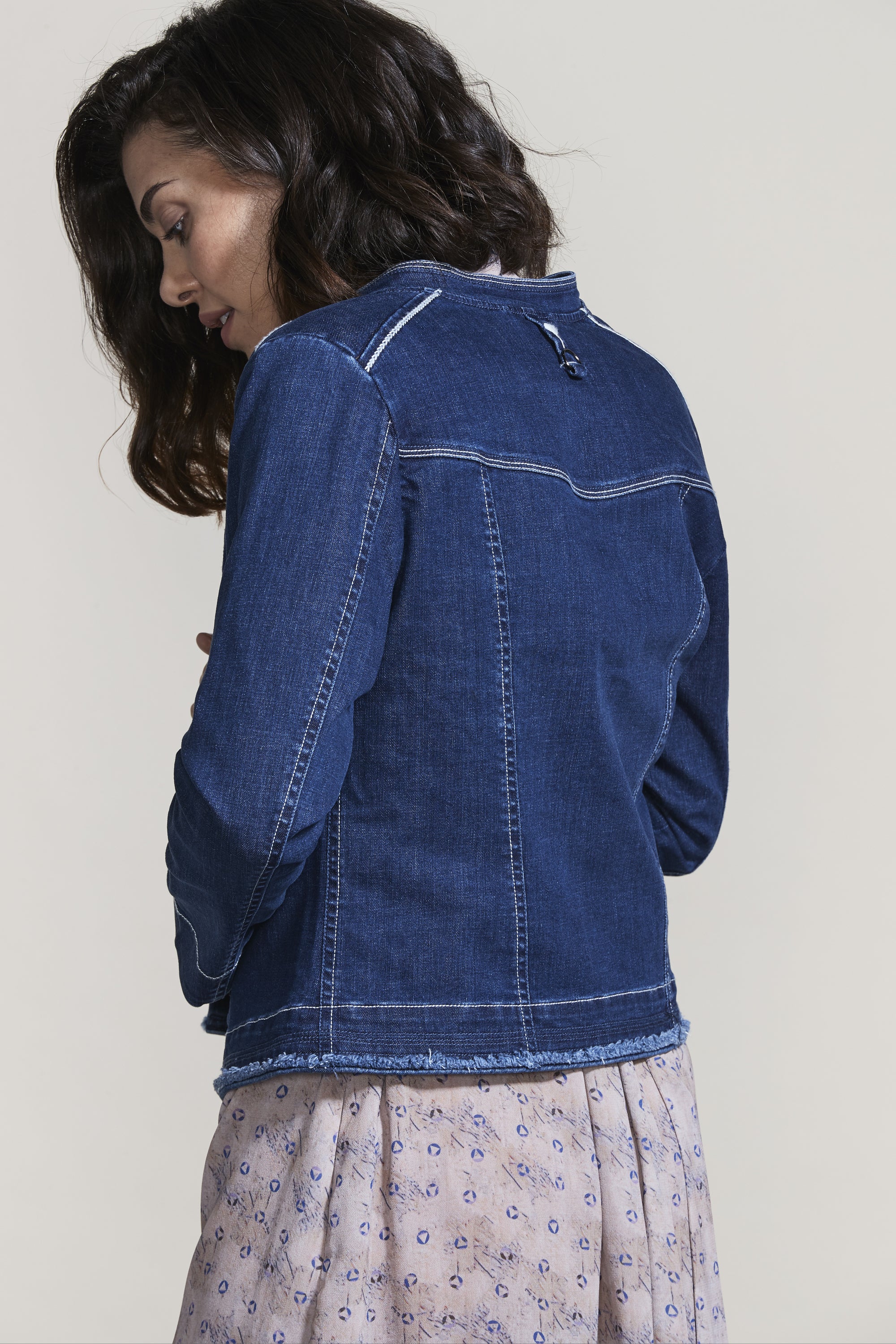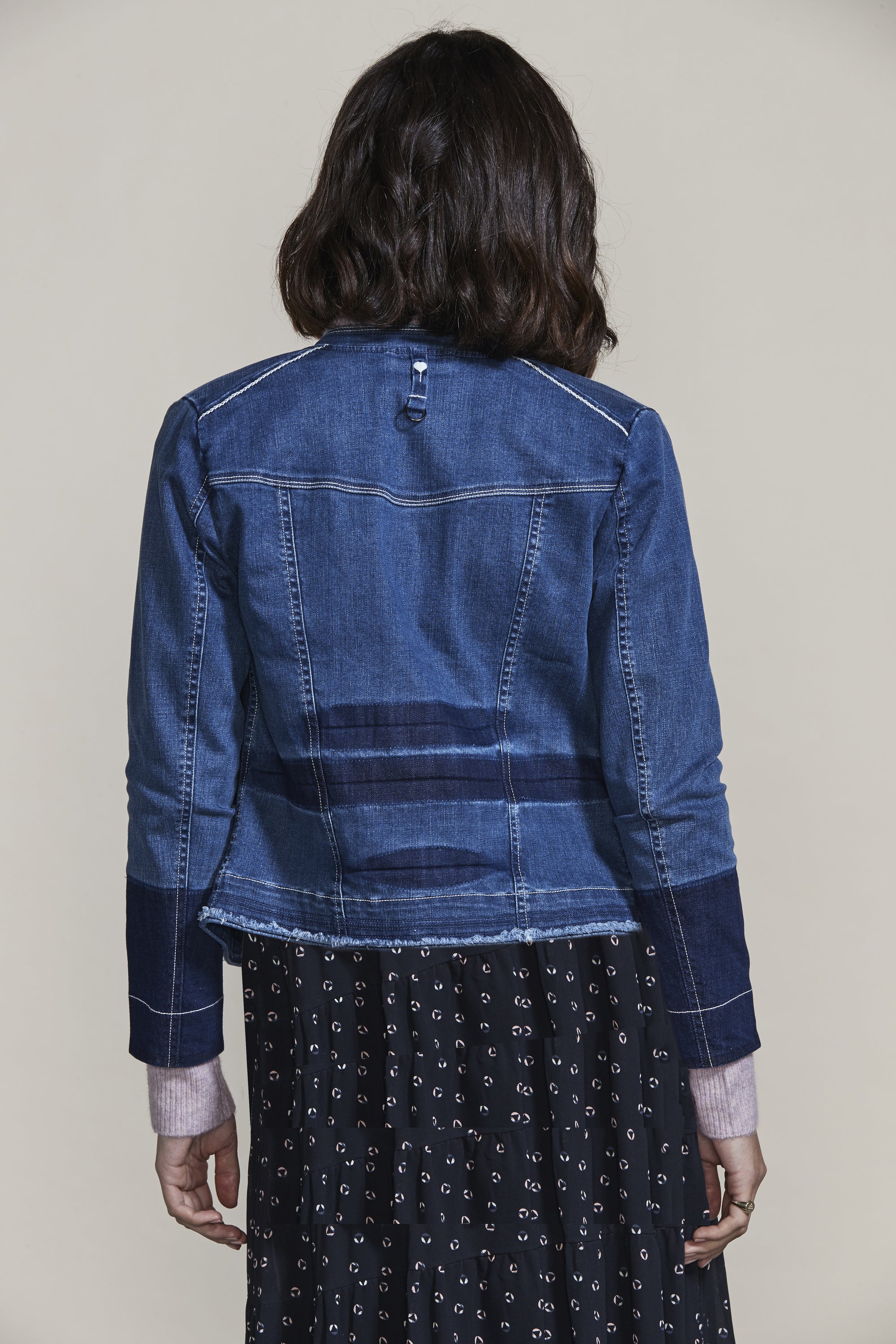 Our neat fit jacket in stretch denim is a great transeasonal piece. Design details such as frayed edges, embroidery stitching and the mix and match tack buttons bring this style to life. Wear with our chunky turtleneck Cabin Sweater, or slip on over a dress for added warmth in the colder months.