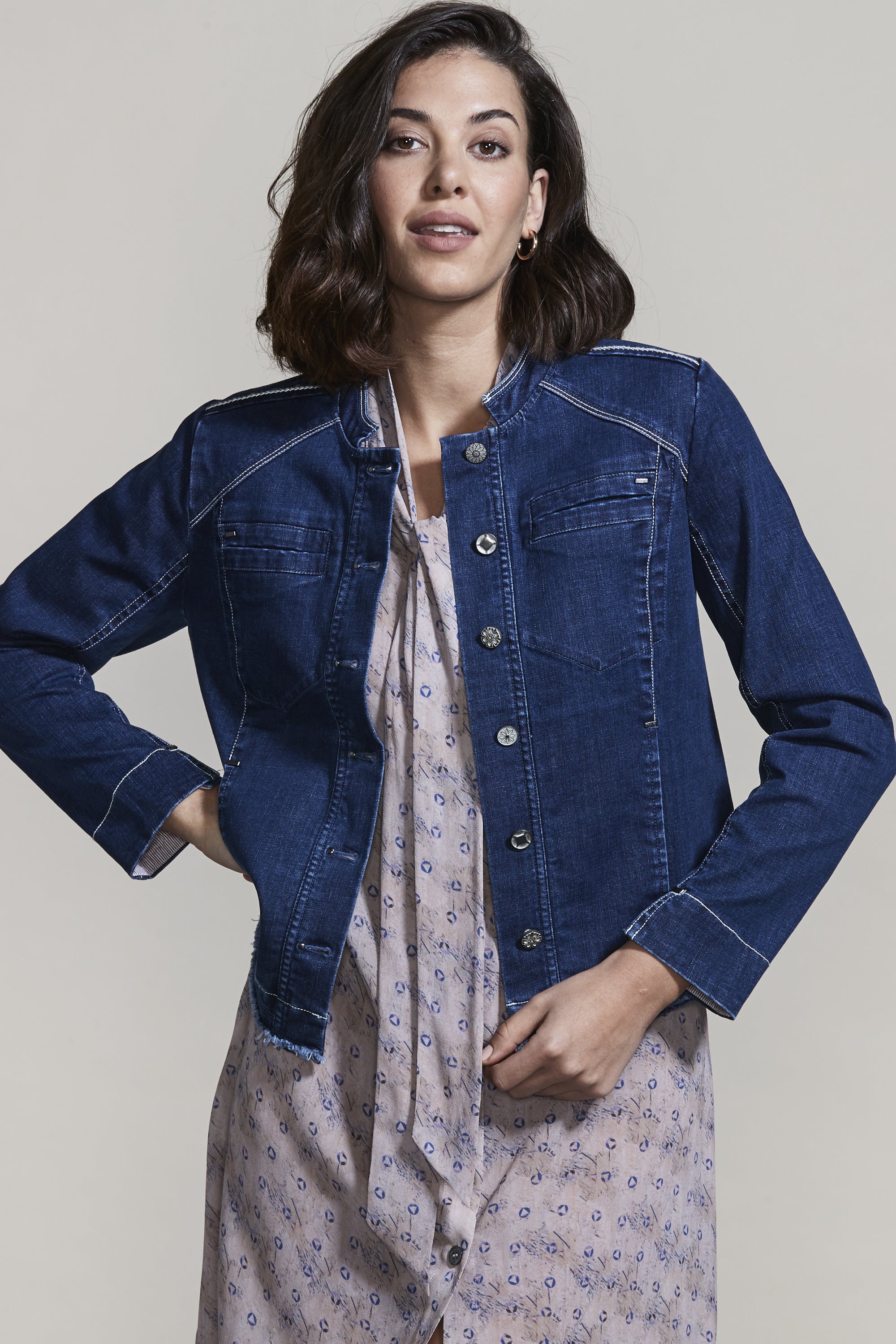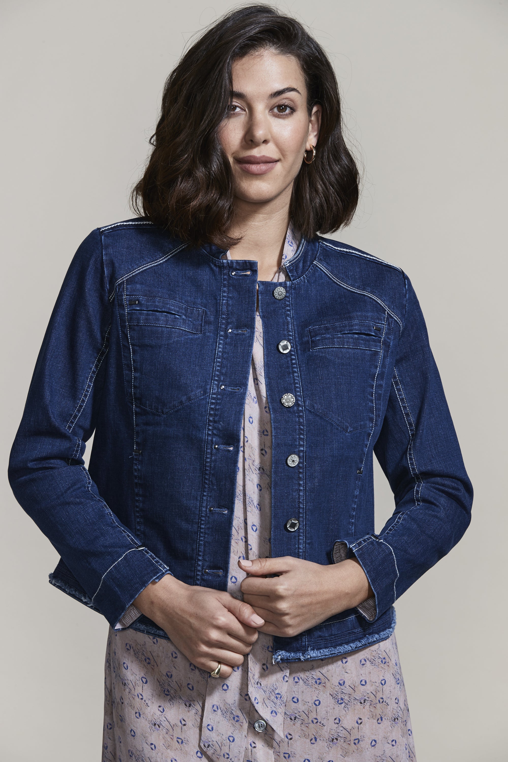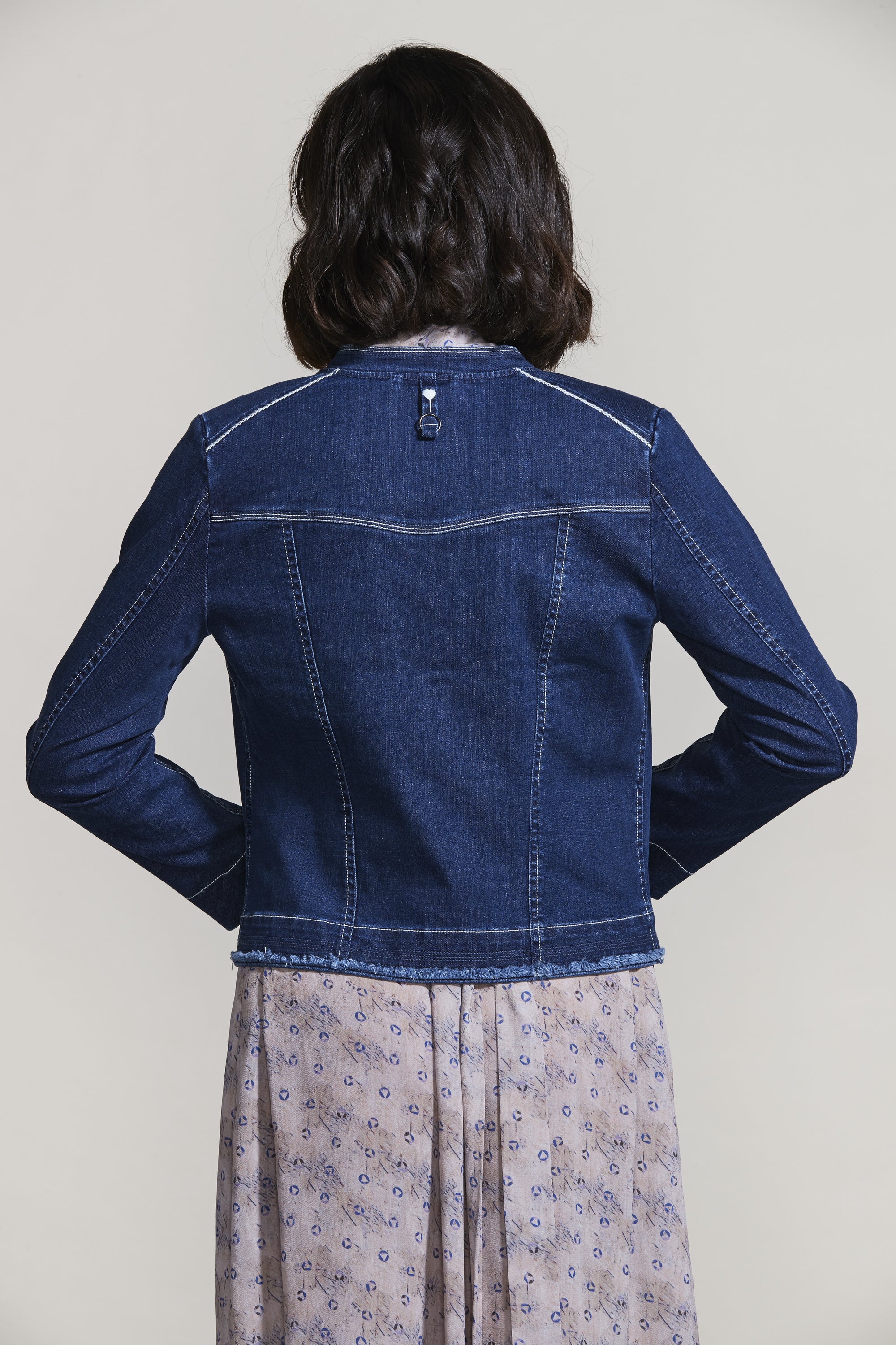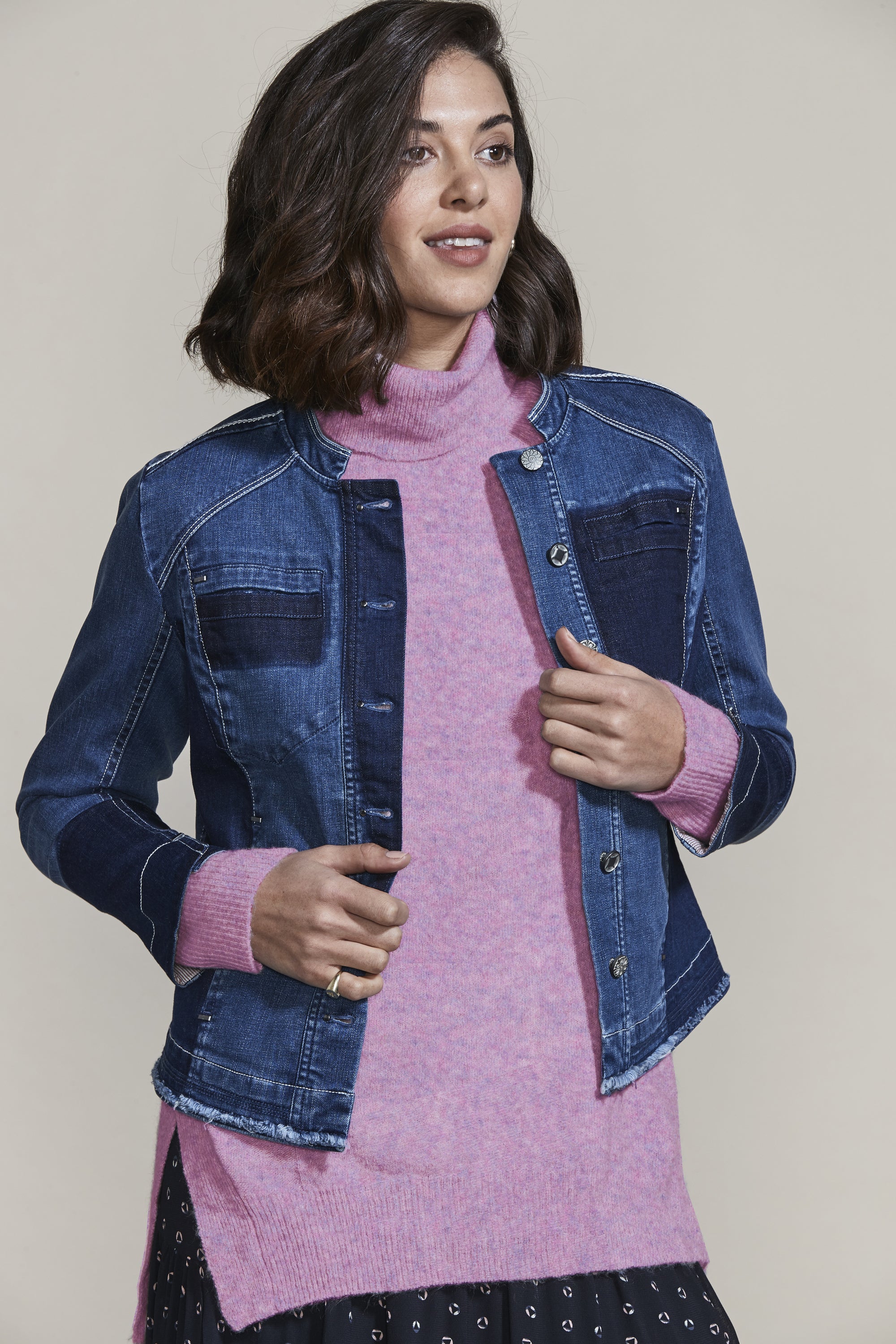 Our neat fit jacket in stretch denim is a great transeasonal piece. Design details such as frayed edges, embroidery stitching and the mix and match tack buttons bring this style to life. Wear with our chunky turtleneck Cabin Sweater, or slip on over a dress for added warmth in the colder months.