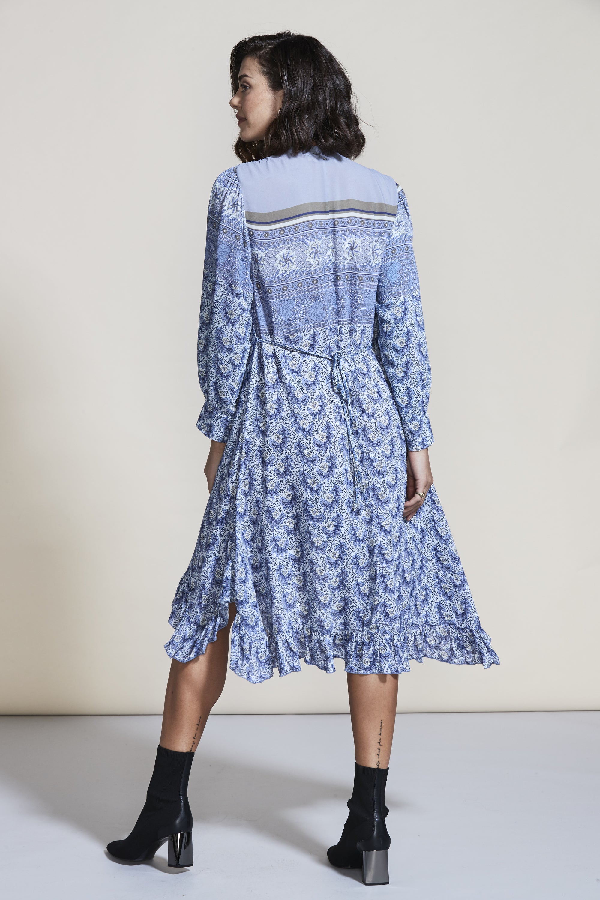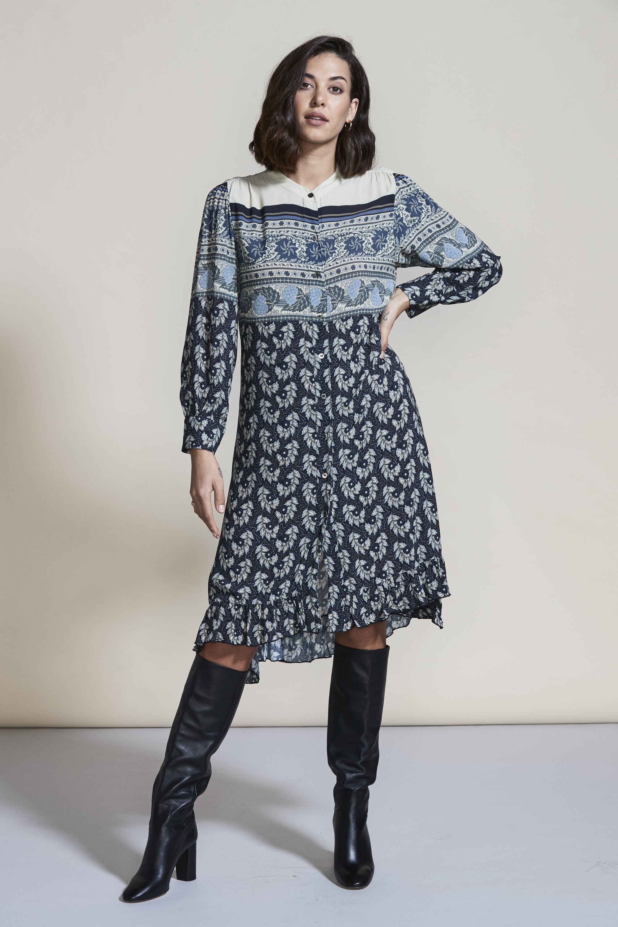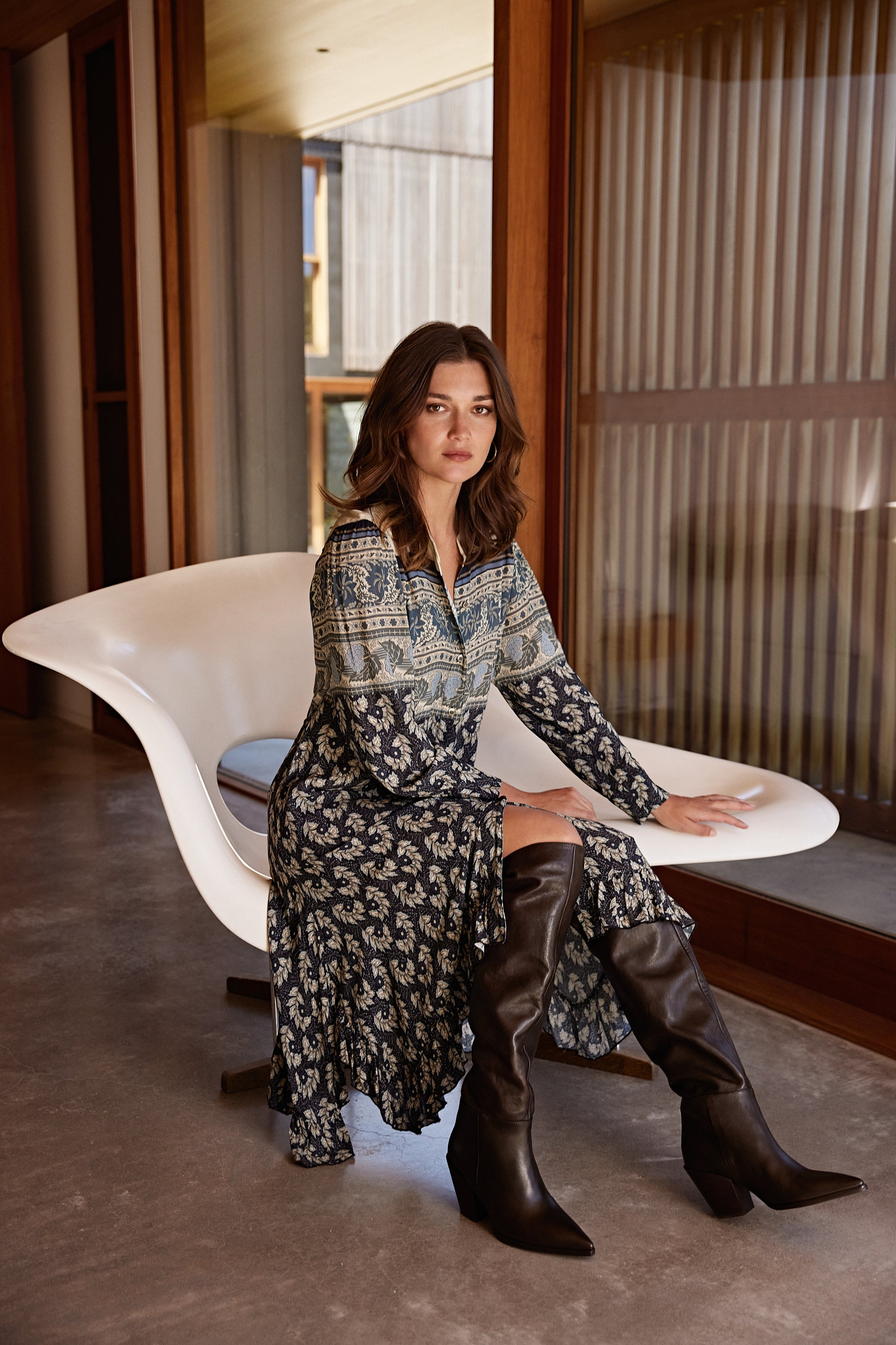 The Vintage print is an intricate design inspired by winter botanicals. It's border makes up the bodice of the Vintage Dress — a button-through shirt dress designed with a voluminous high-low hemline, hem frill and sleeve gathers. Step into a pair of heeled boots to complete the look.