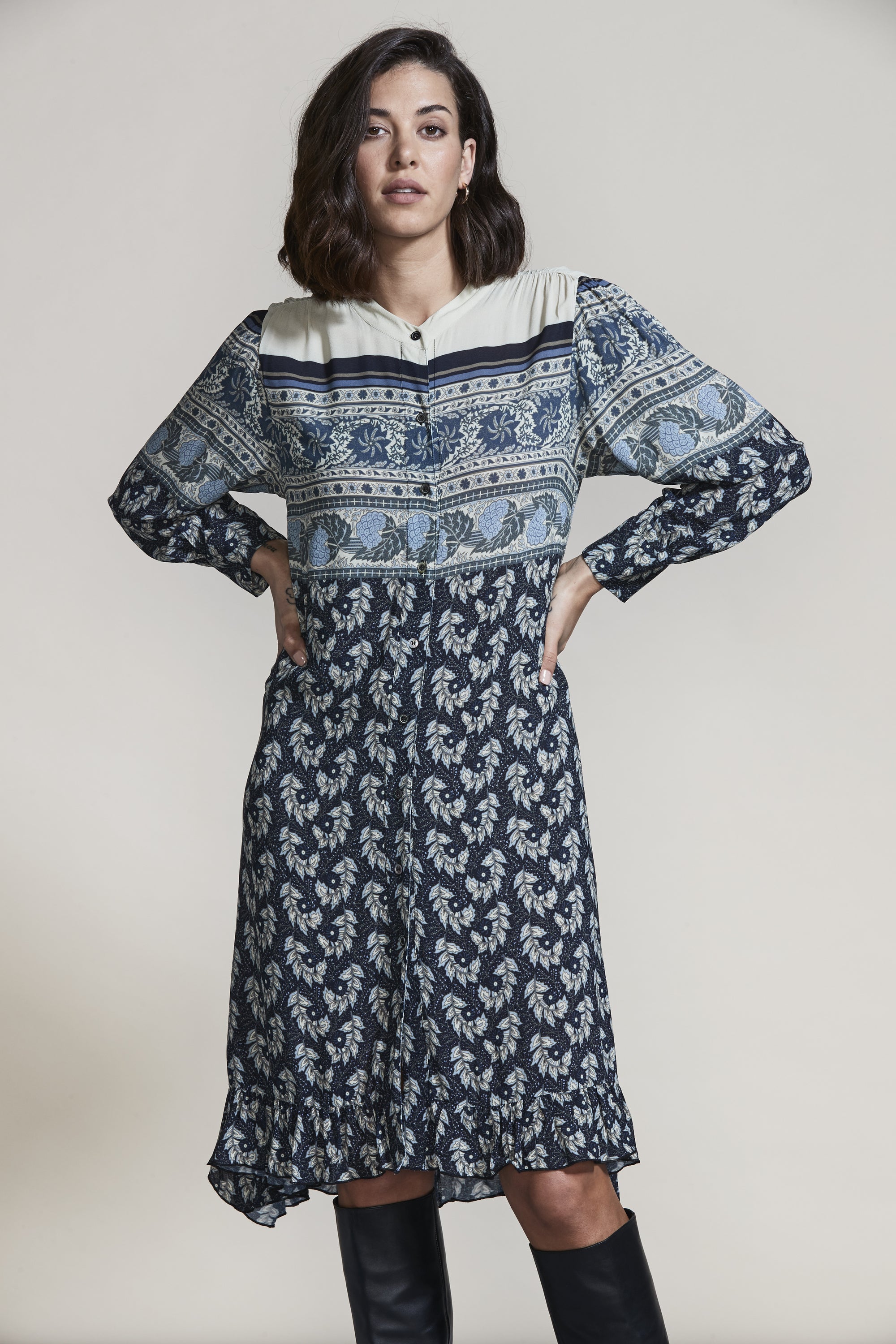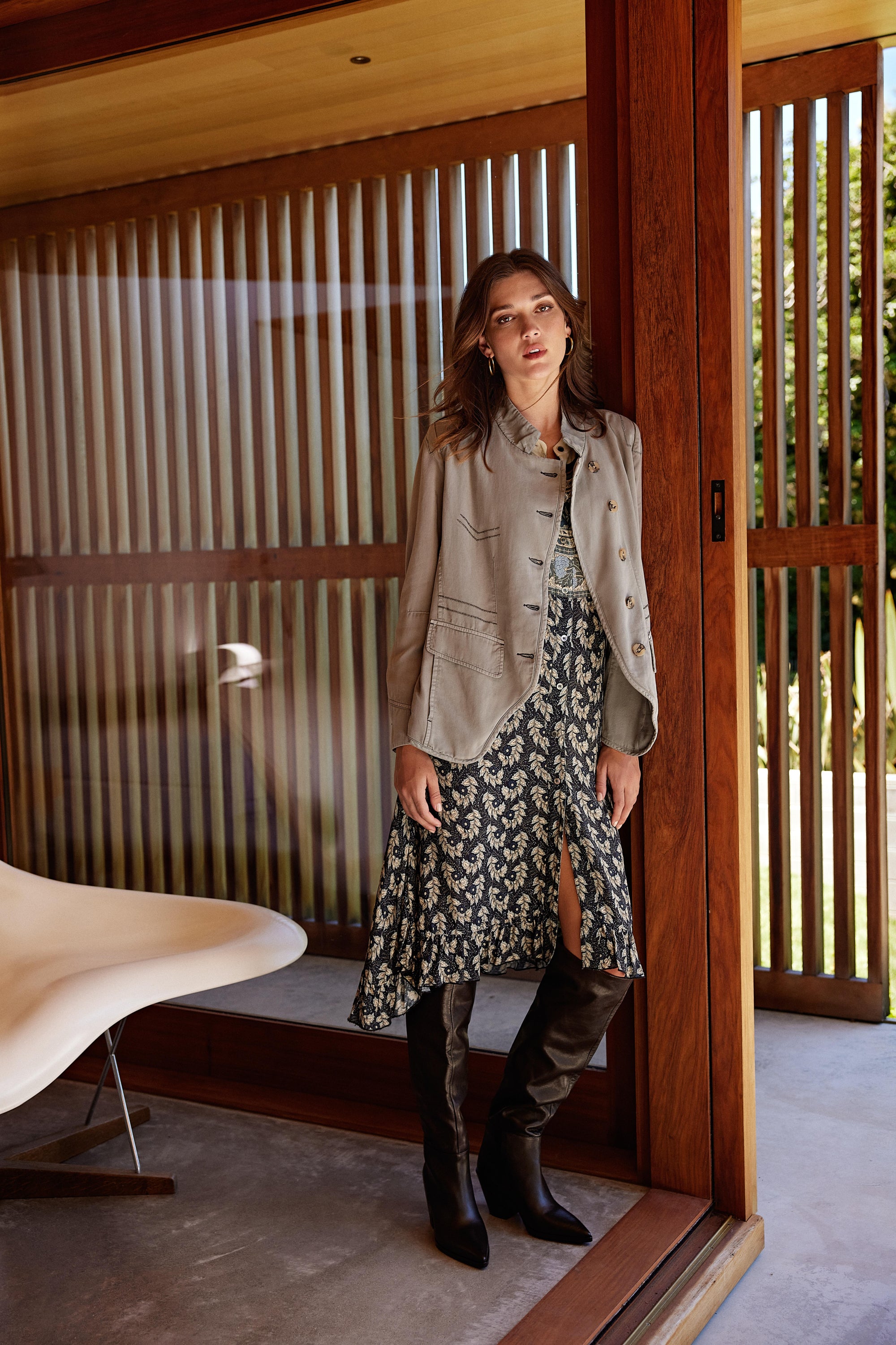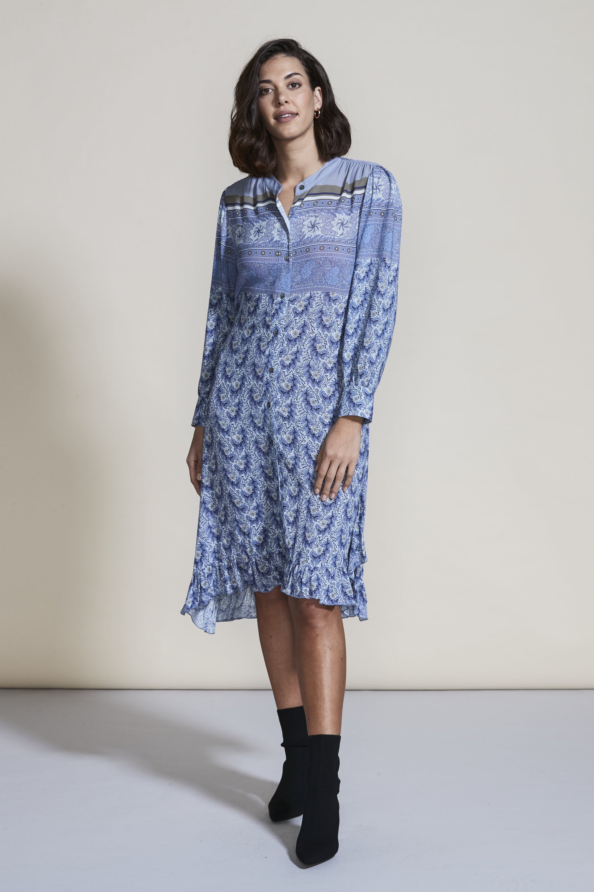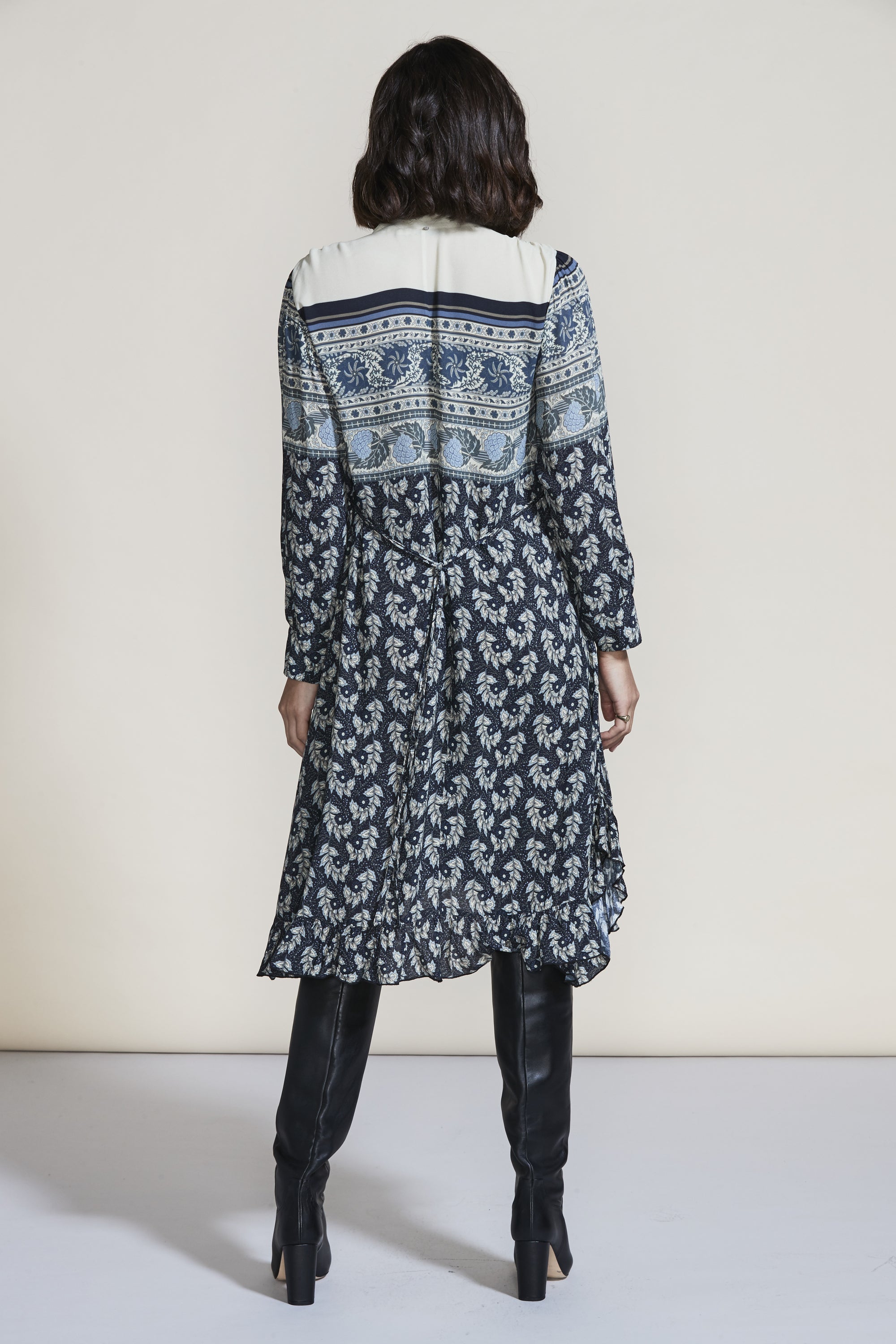 The Vintage print is an intricate design inspired by winter botanicals. It's border makes up the bodice of the Vintage Dress — a button-through shirt dress designed with a voluminous high-low hemline, hem frill and sleeve gathers. Step into a pair of heeled boots to complete the look.