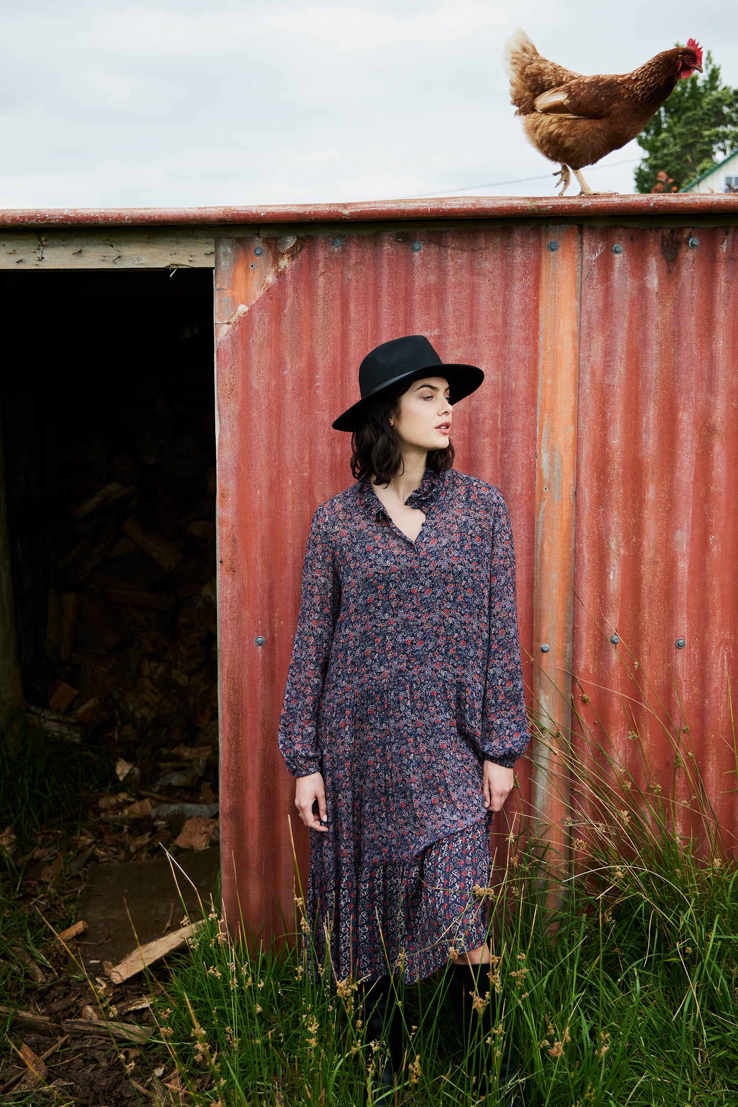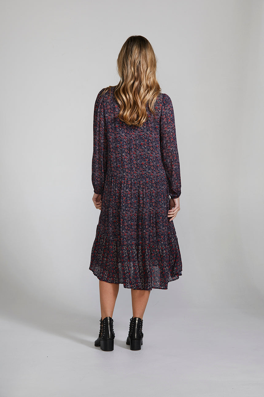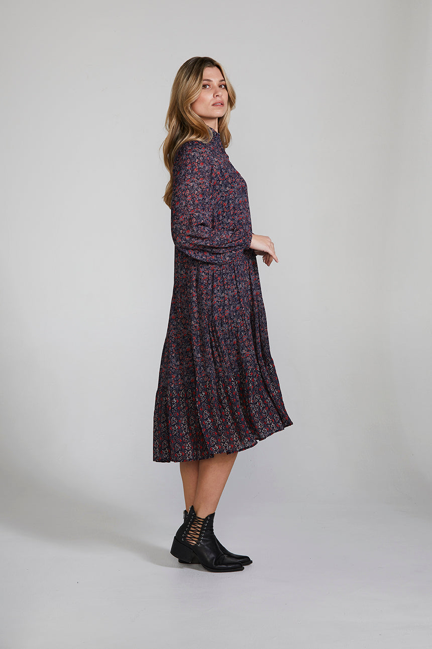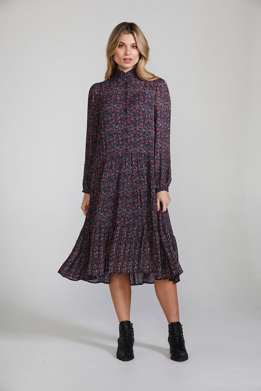 The Avenue Dress is an elevated style featuring a delicate and feminine floral print, front button bodice, and lightly gathered tiered skirt with contrast print at the lower skirt panel. The ruffled collar is the epitome of classic elegance.