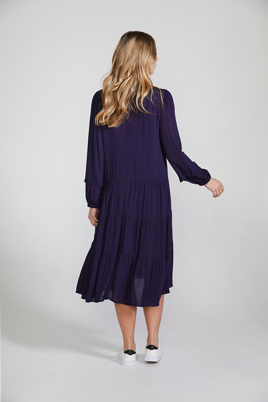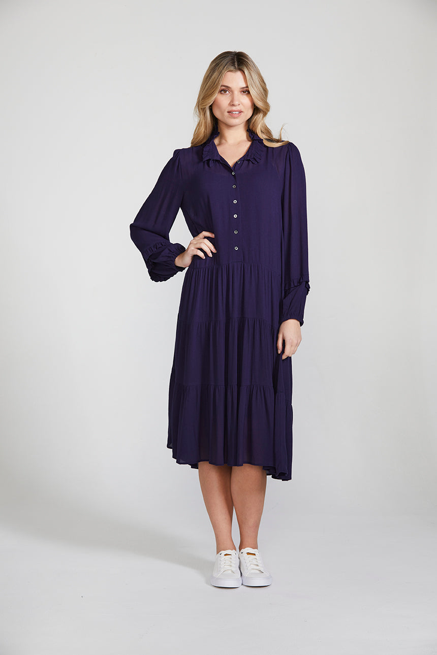 The Bella Dress crafted in lightweight viscose will bring bold elegance to your winter wardrobe. This easy-fit dress features a double frill collar detail and self-covered eyelet buttons at the centre front placket. A tiered skirt lends a romantic edge. Wear yours with boots or a fine heel for a simple, feminine style.