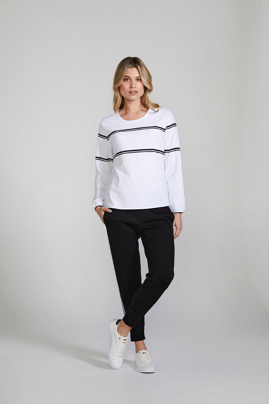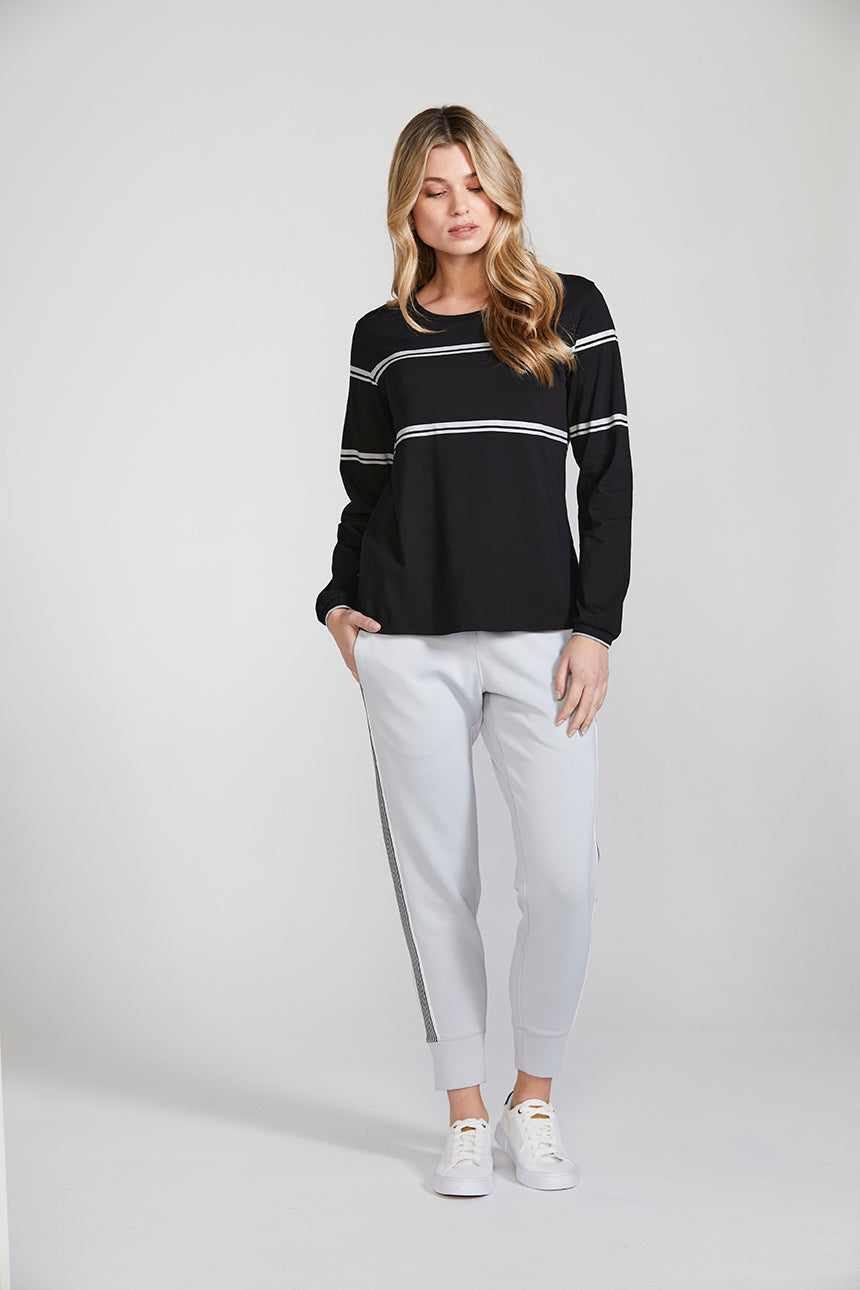 Soft cotton top featuring long sleeves, crew neck, and contrast stripes print detail. Pair it with our Dodge Pant to achieve the perfect sporty look.