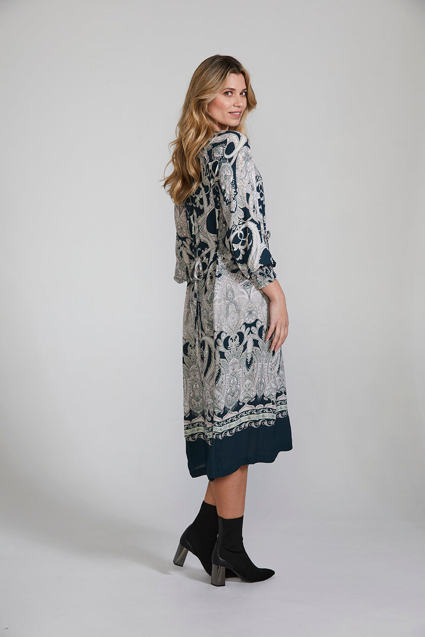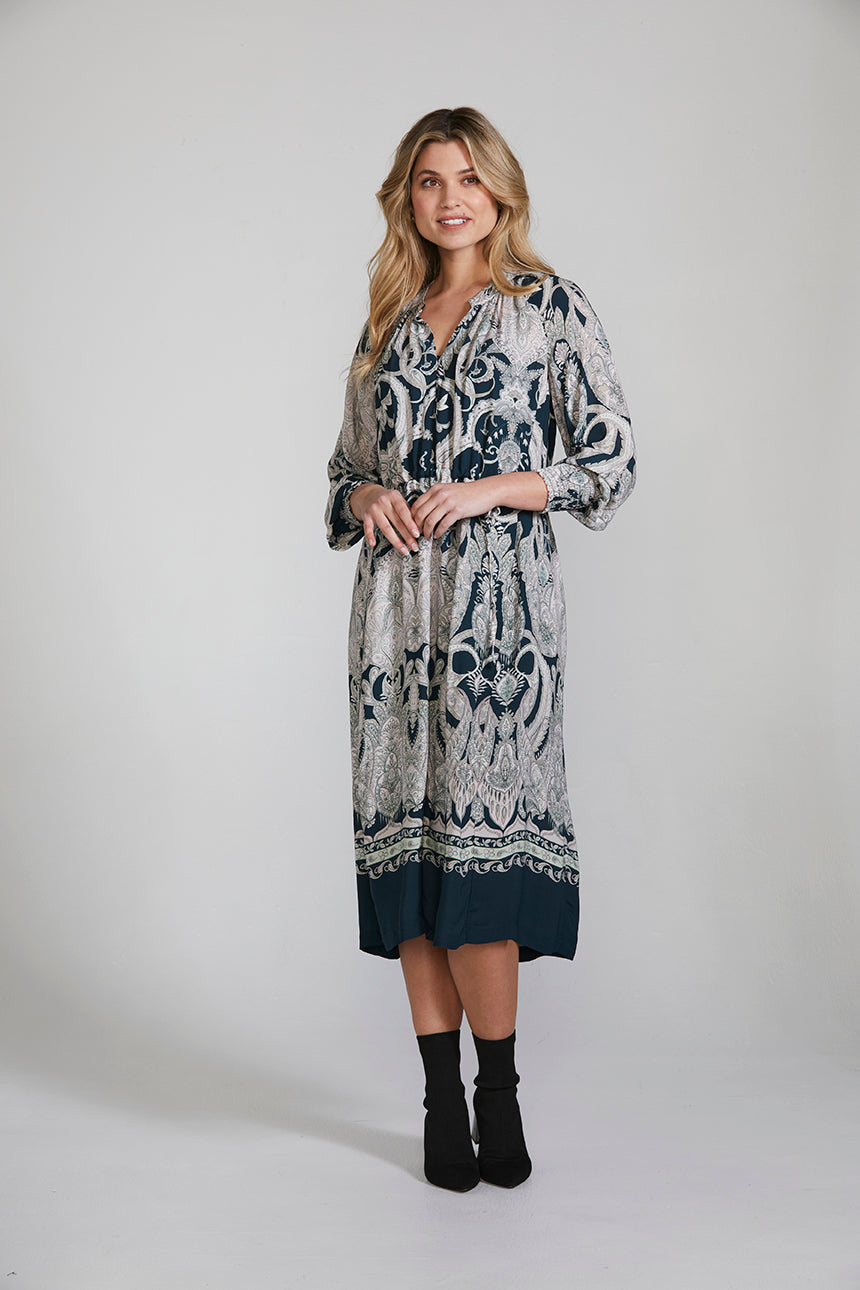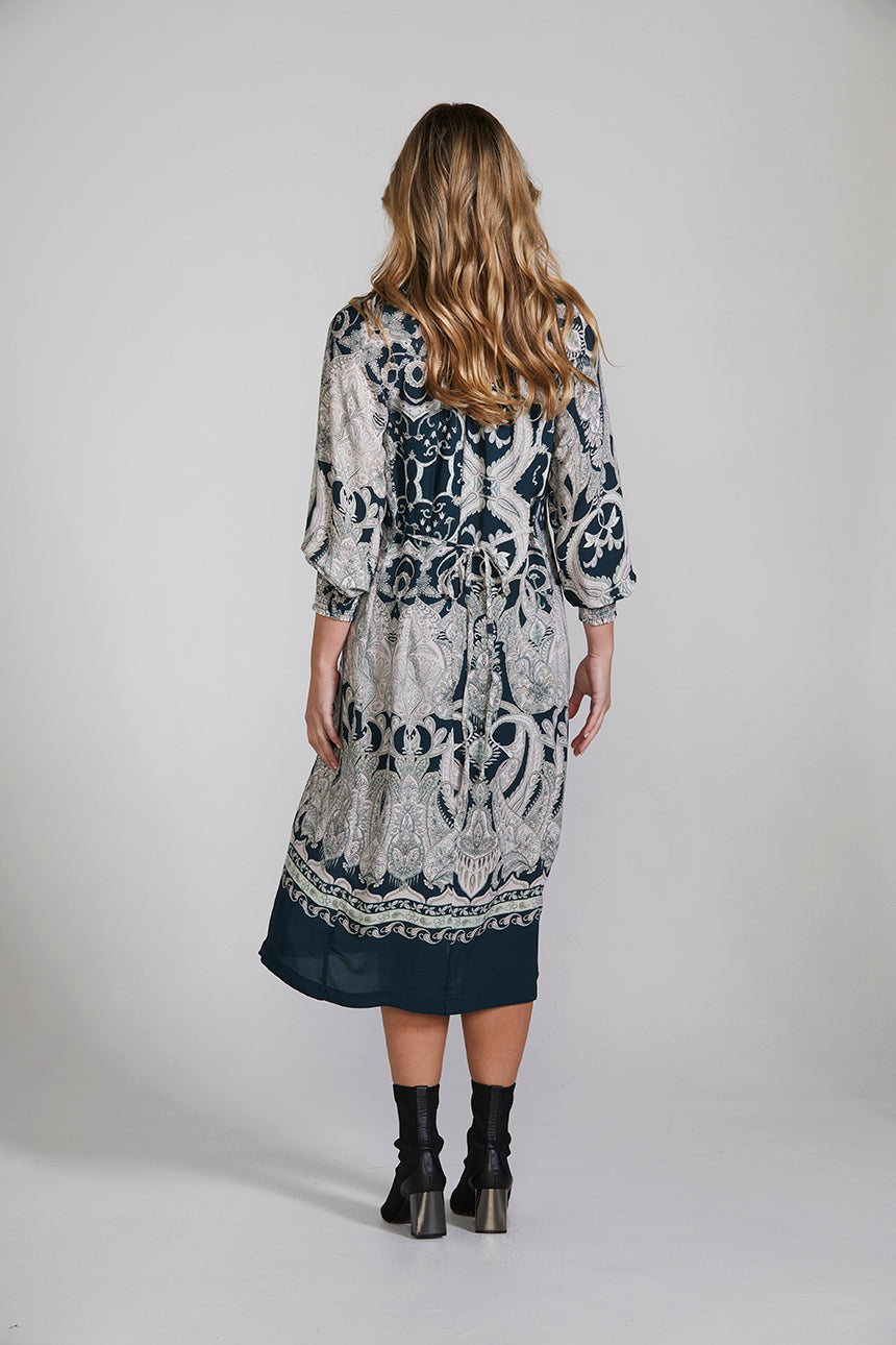 Gathers around the shoulders and neckline add a soft fluidity to the Damask Dress. The adjustable drawstring detail at the front waist adds a beautiful flare to this flattering silhouette, making it the perfect occasion dress.