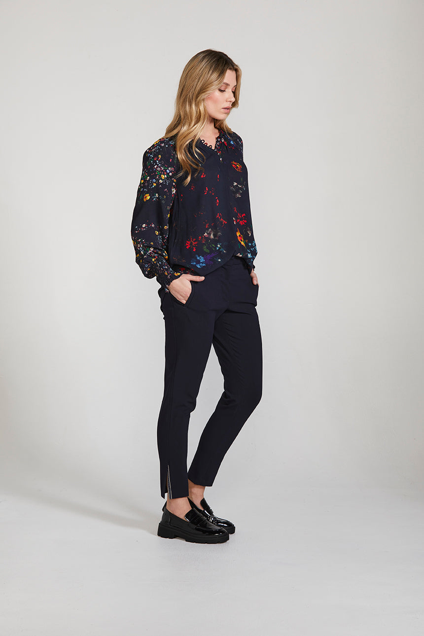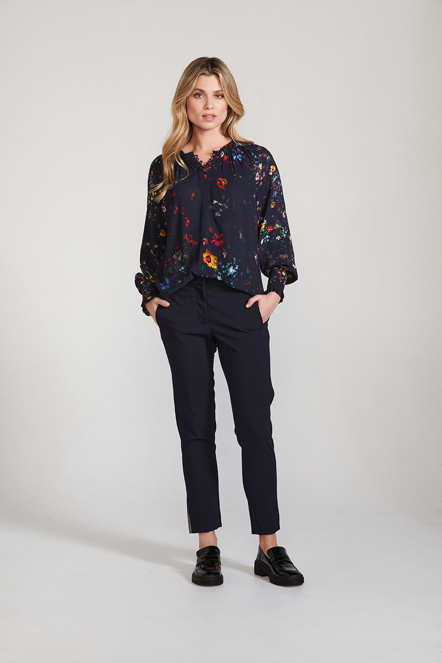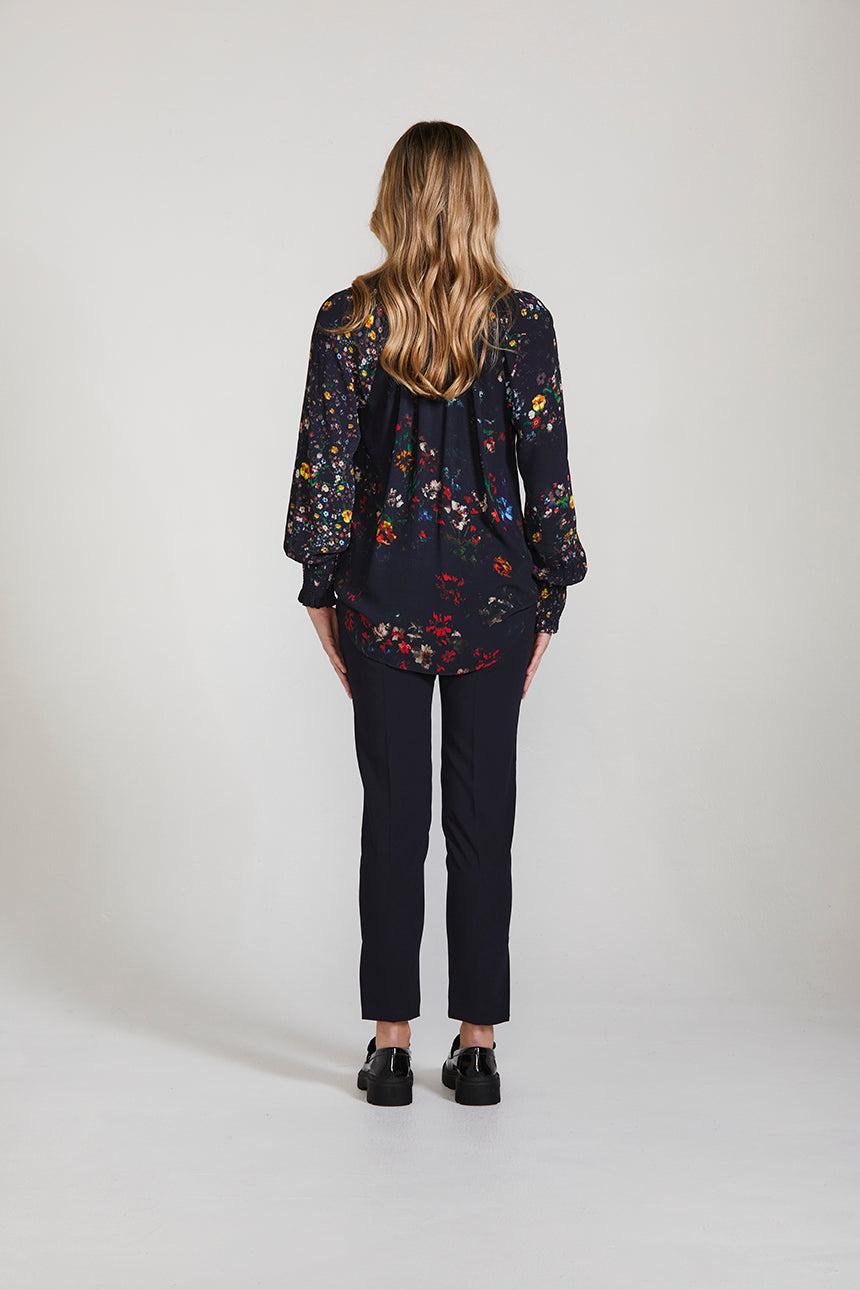 The contemporary Duchess print beautifully loose-fitting silhouette of the Duchess Top, the unique style features gathering around the neckline and shirred cuffs for a romantic yet modern mood. The rouleau loops at the front opening and self-covered buttons with metal dragonfly detail elevate this effortless style.