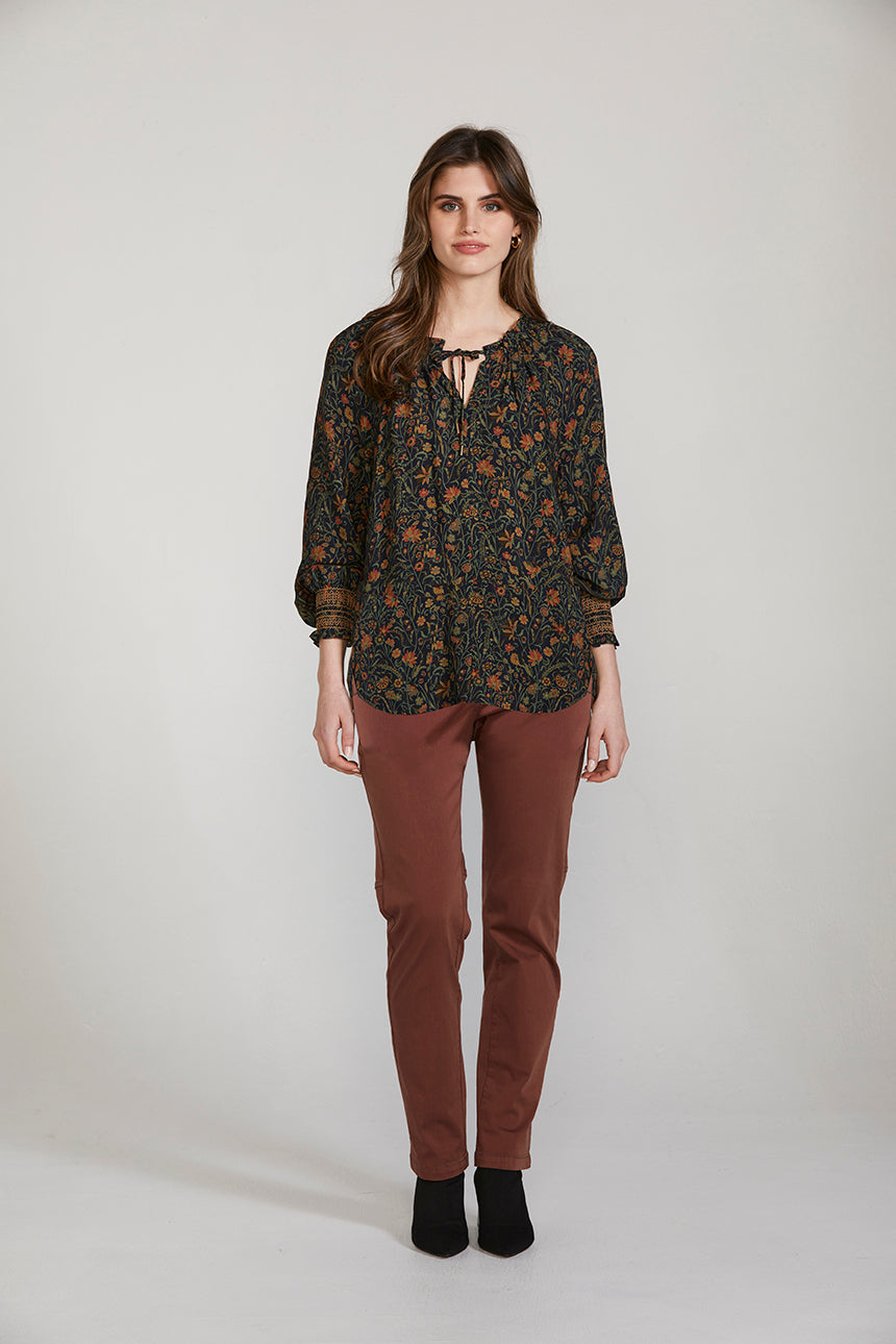 Crafted in a viscose rayon blend, the Eden Top features an intricate botanical print. This elevated style showcases a frill detail and delicate self-fabric ties on the neckline. The long raglan sleeve gathers into a cuff with contrast embroidery thread detail.