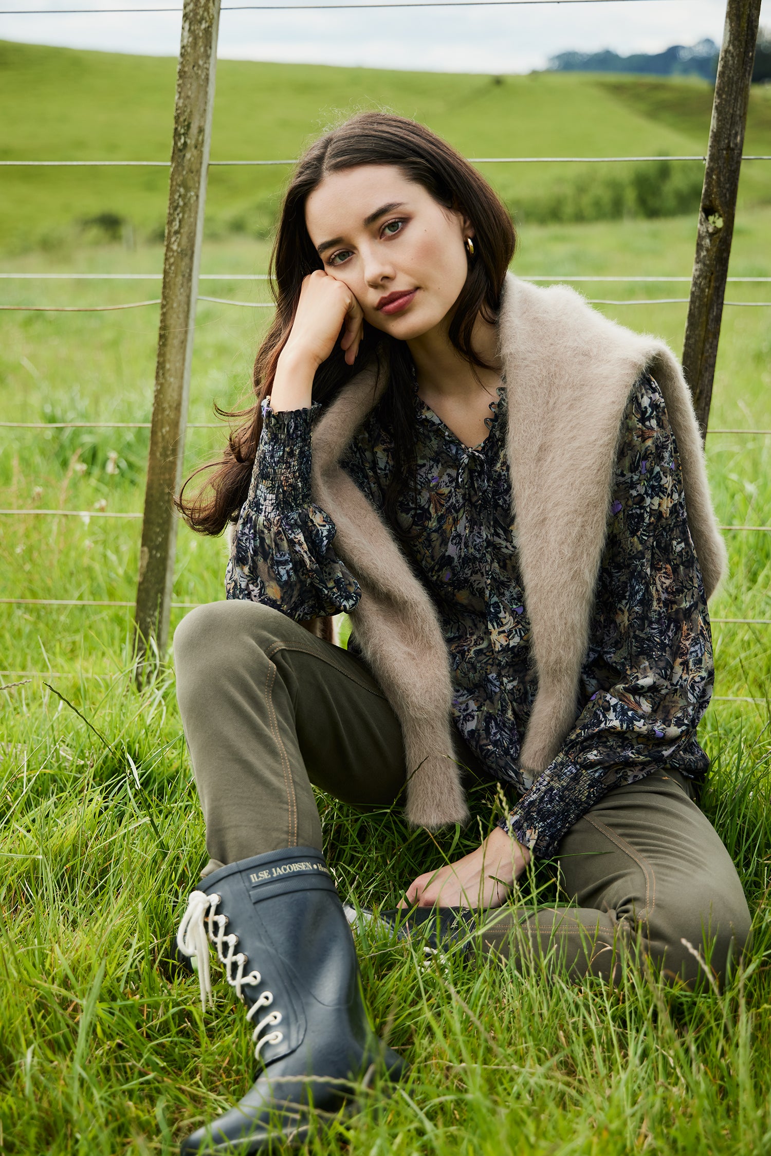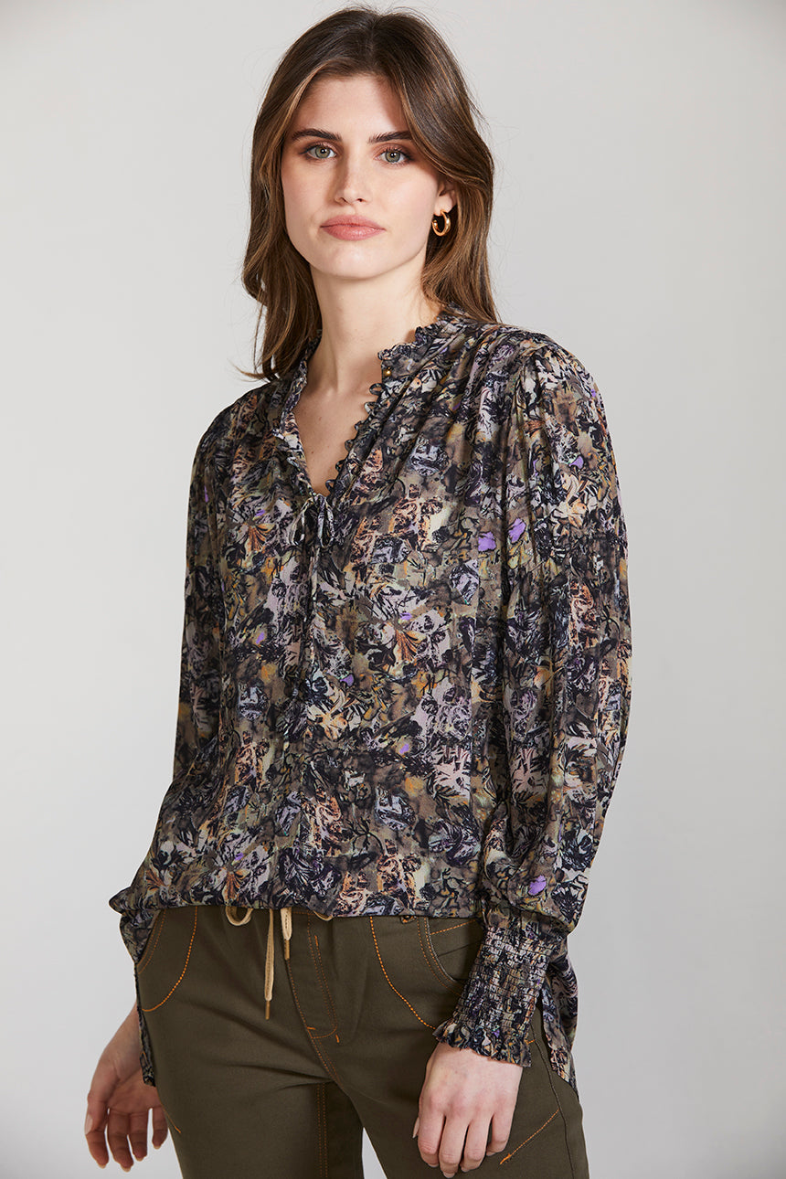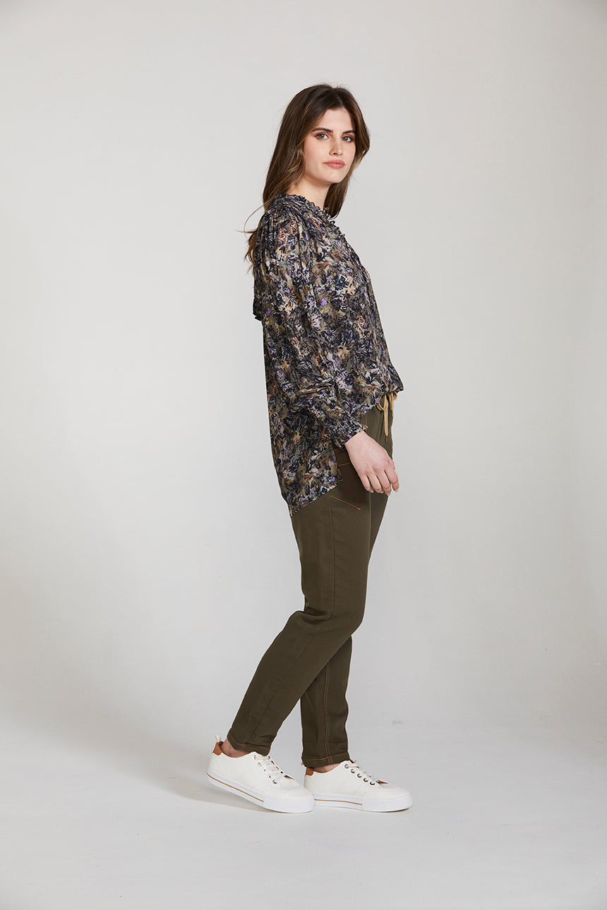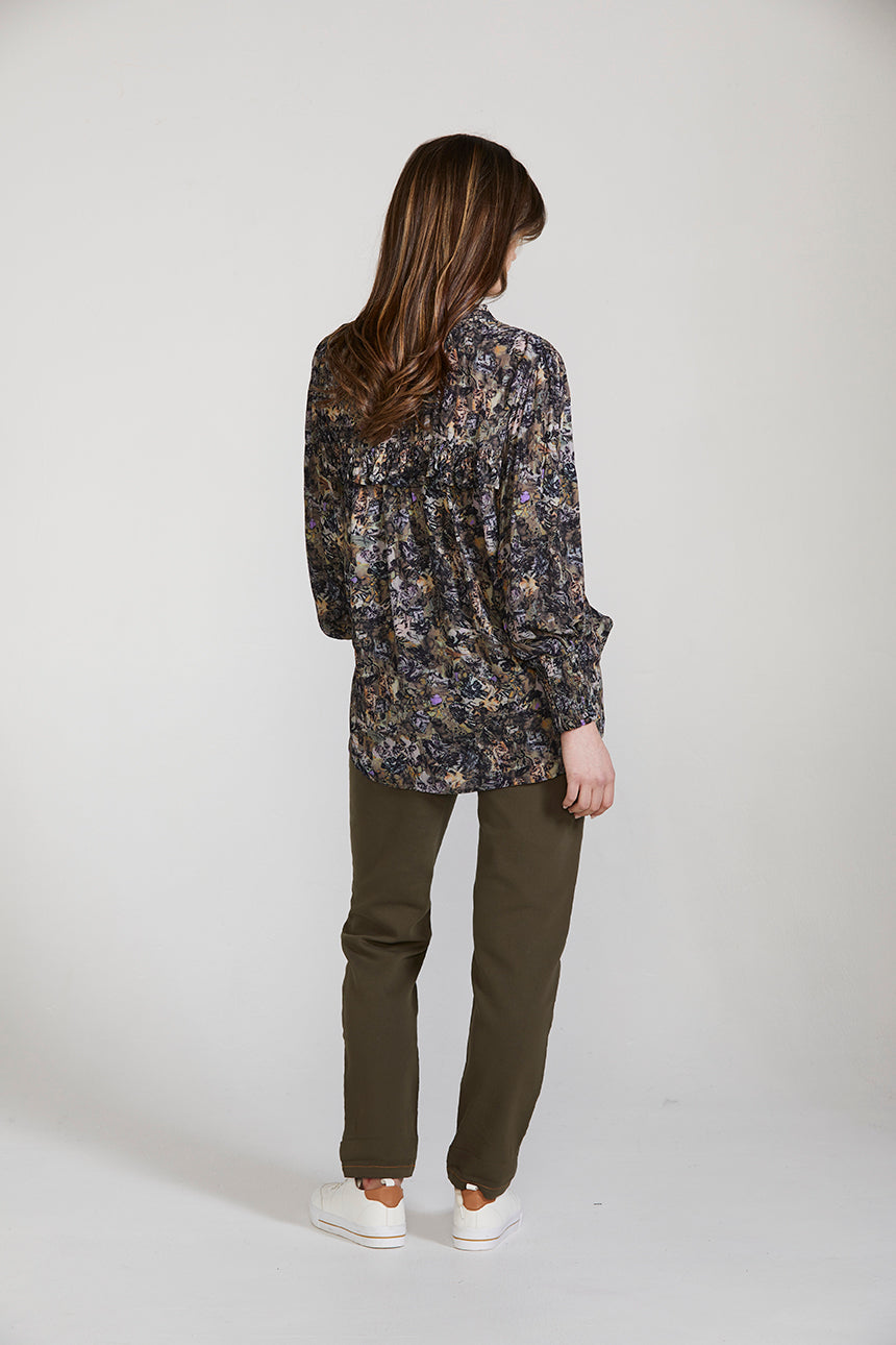 The Harvest Shirt is a unique style featuring gathers around the shoulders and sleeves creating a flattering loose silhouette. The shirred cuffs, rouleau loops and tie detail at the centre front opening elevate this style.