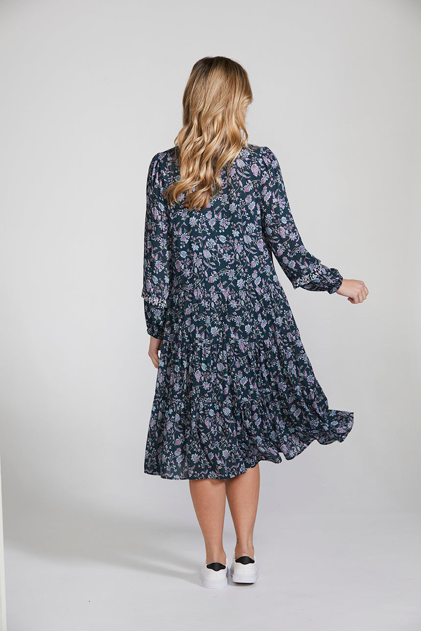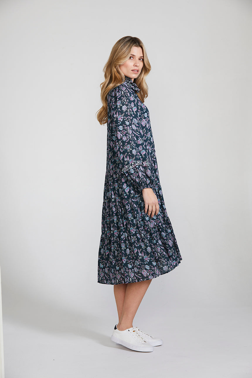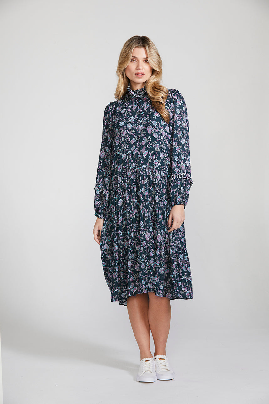 The intricate floral print of the Isabella Dress will bring bold elegance to your winter wardrobe. This easy-fit dress features a double frill collar detail and self-covered eyelet buttons at the centre front placket. The tiered ruching detail at the skirt lends a romantic edge. Wear yours with boots or with white sneakers for that weekend look.