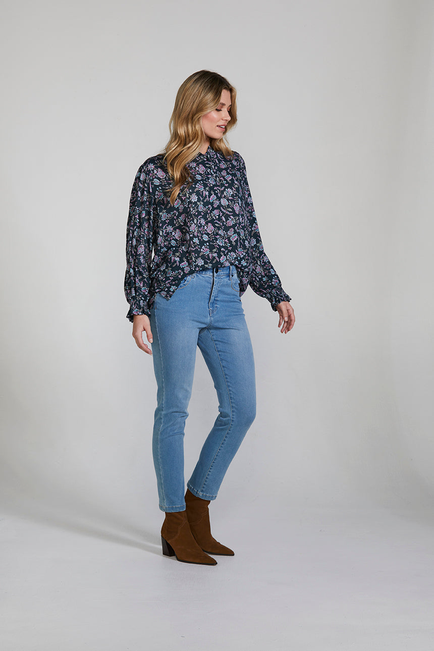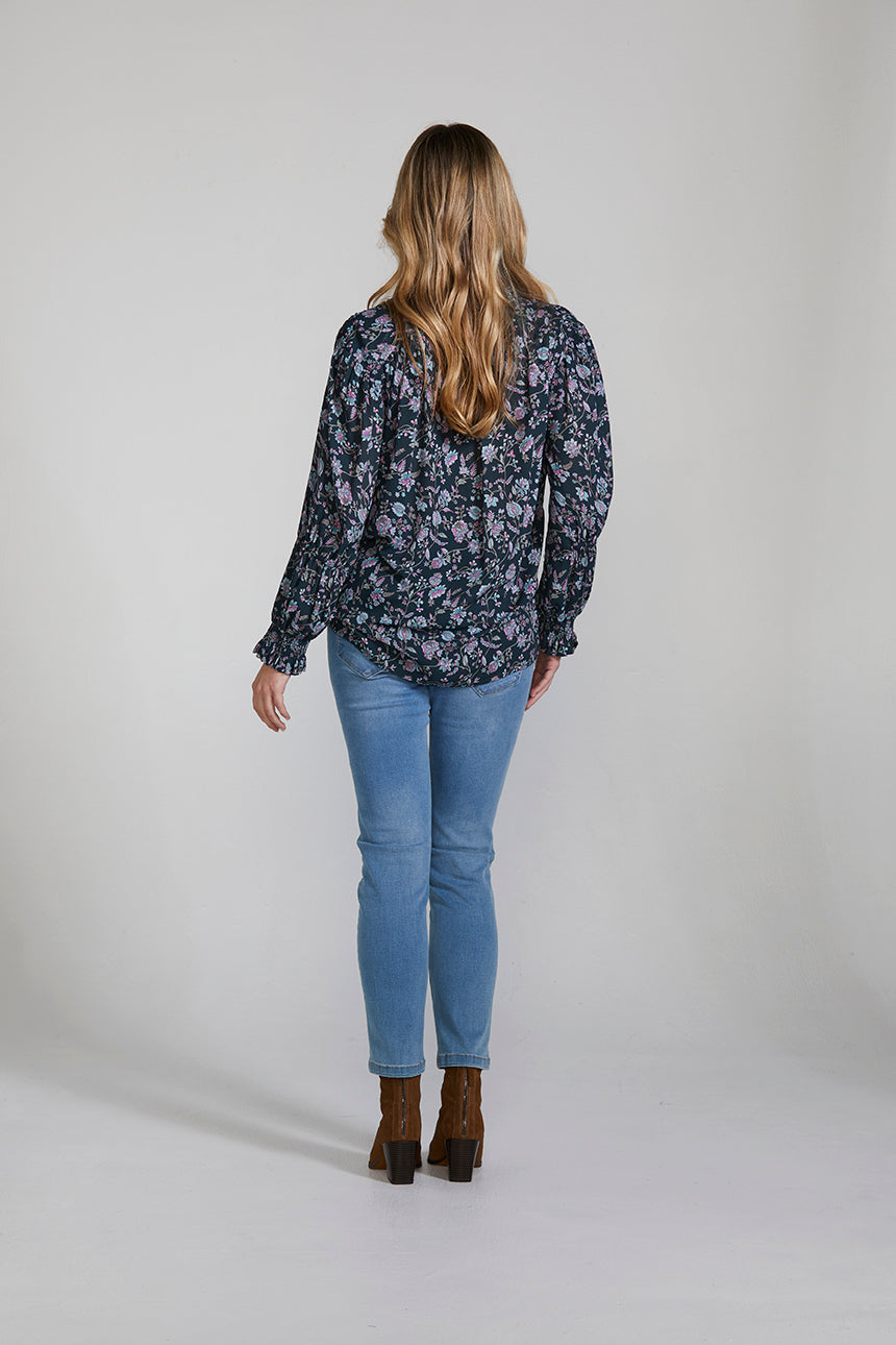 Gathering around the shoulders and sleeves creates an effortless design for Isabella Floral Shirt. This elevated styling features; a feminine floral print and self-covered buttons with metal dragonfly detail. Versatile for day or night.