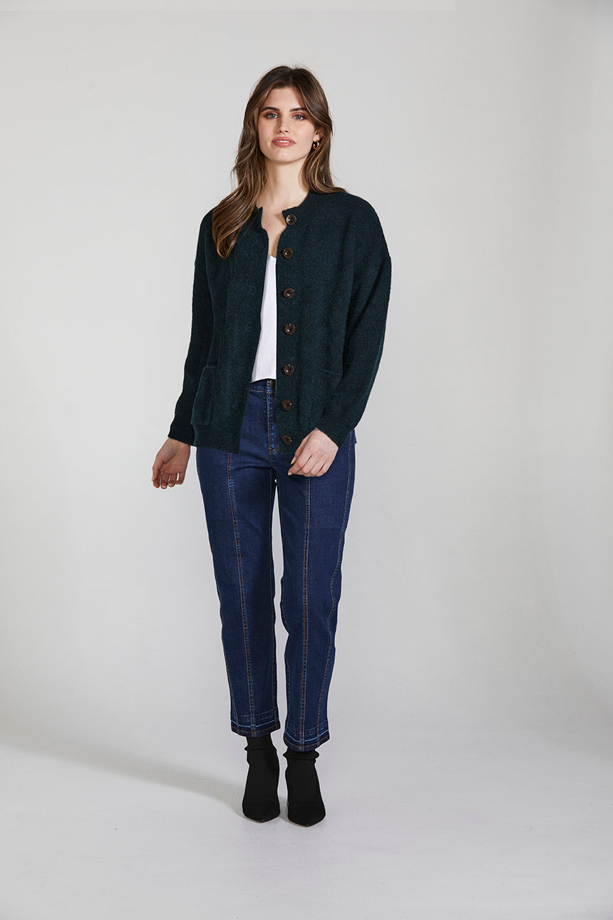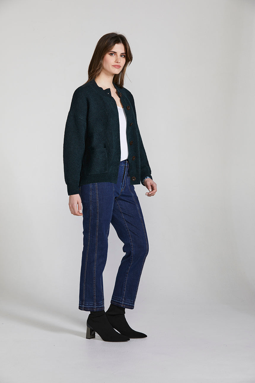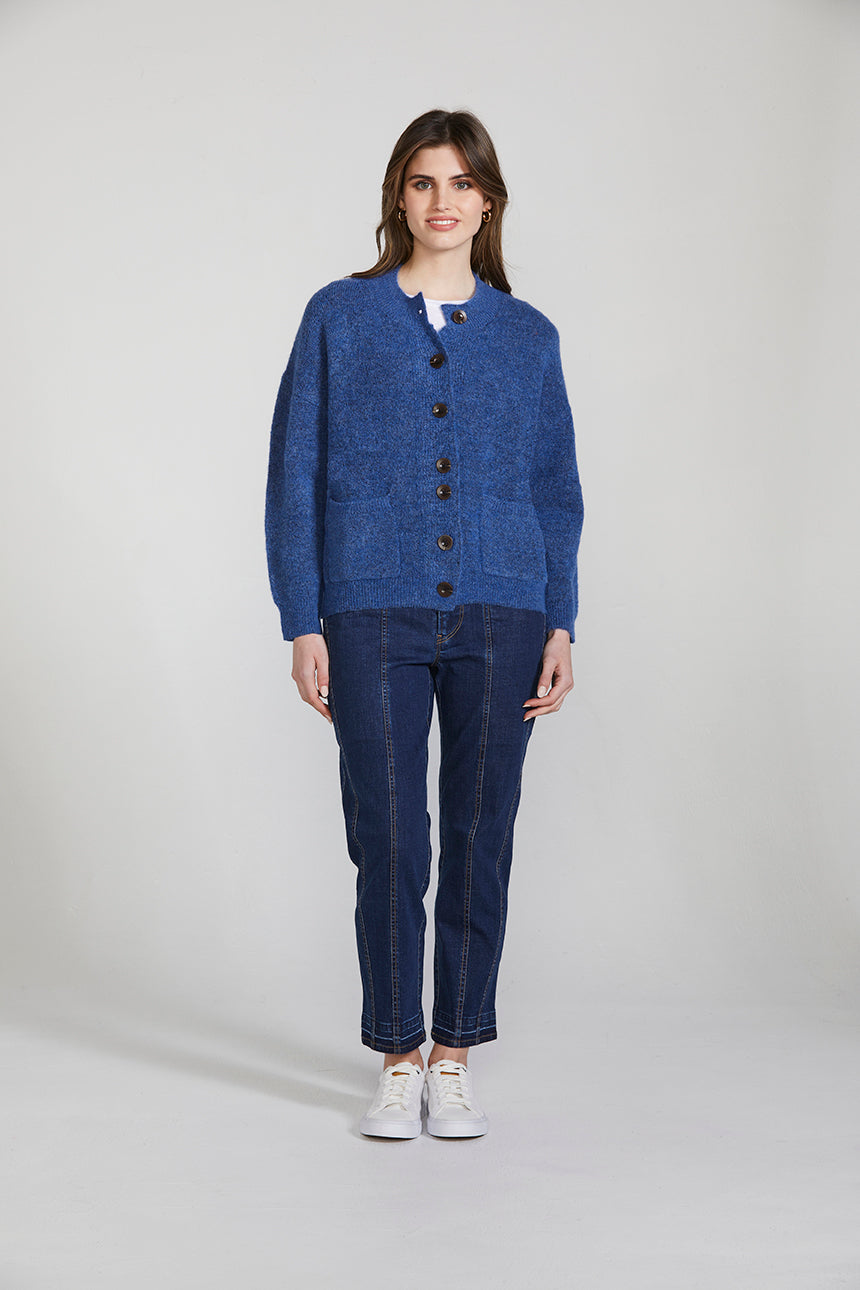 This mohair and wool blend knit cardi is the perfect layering piece for cold days. This winter essential is a classic buttoned-down cardi with statement buttons and functional front pockets. Wear it over our dresses for a cozy winter look, or pair it with jeans and sneakers to achieve a casual weekend look.