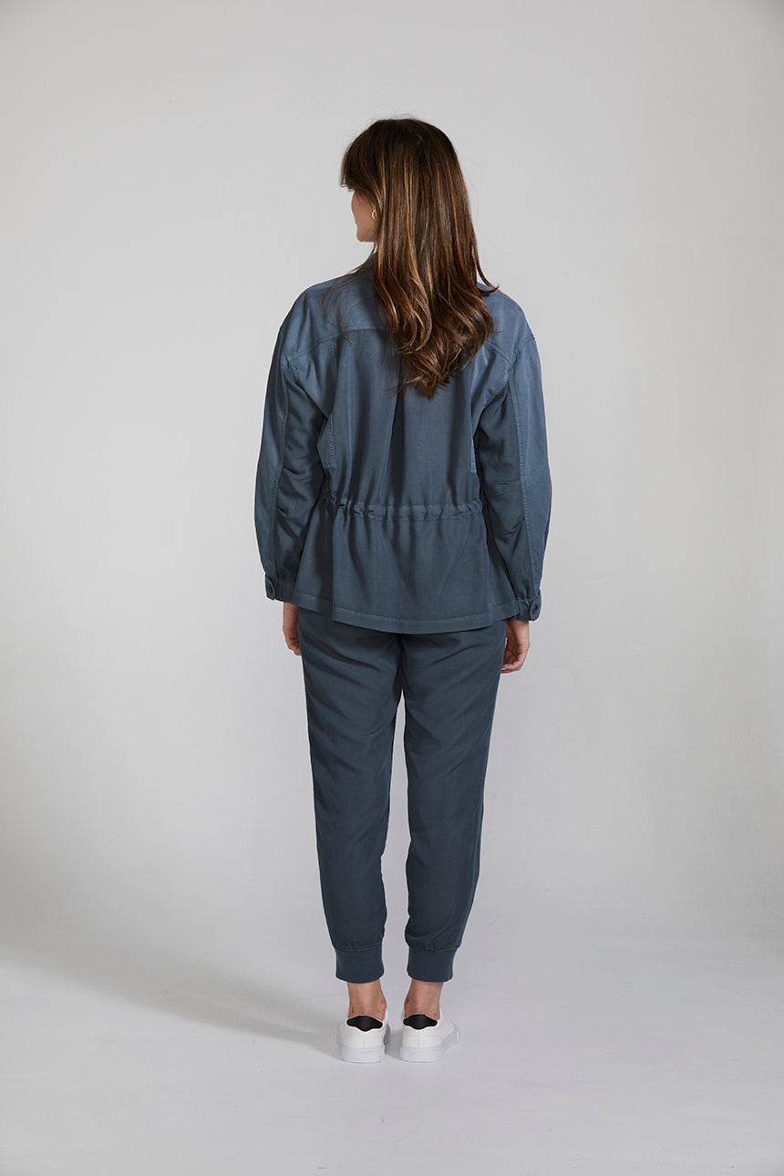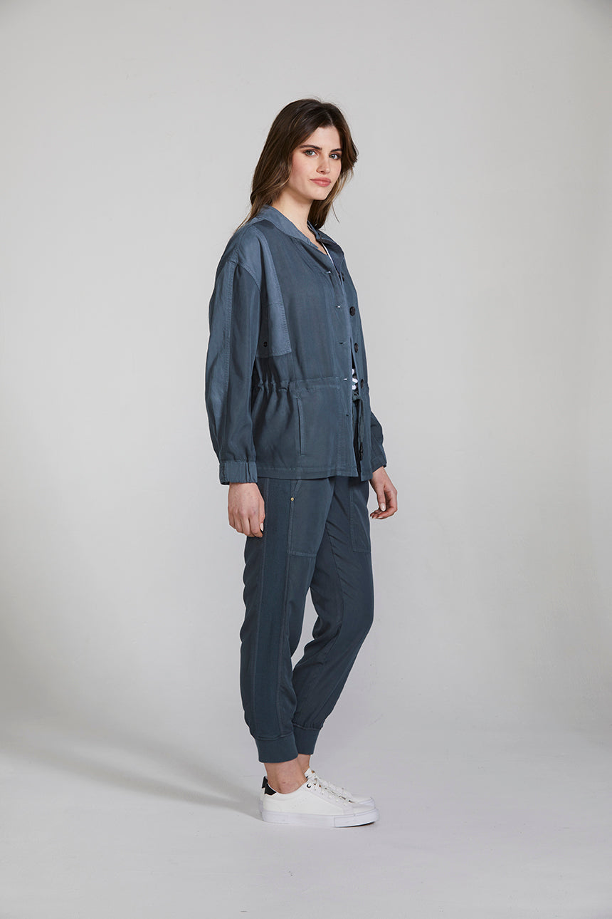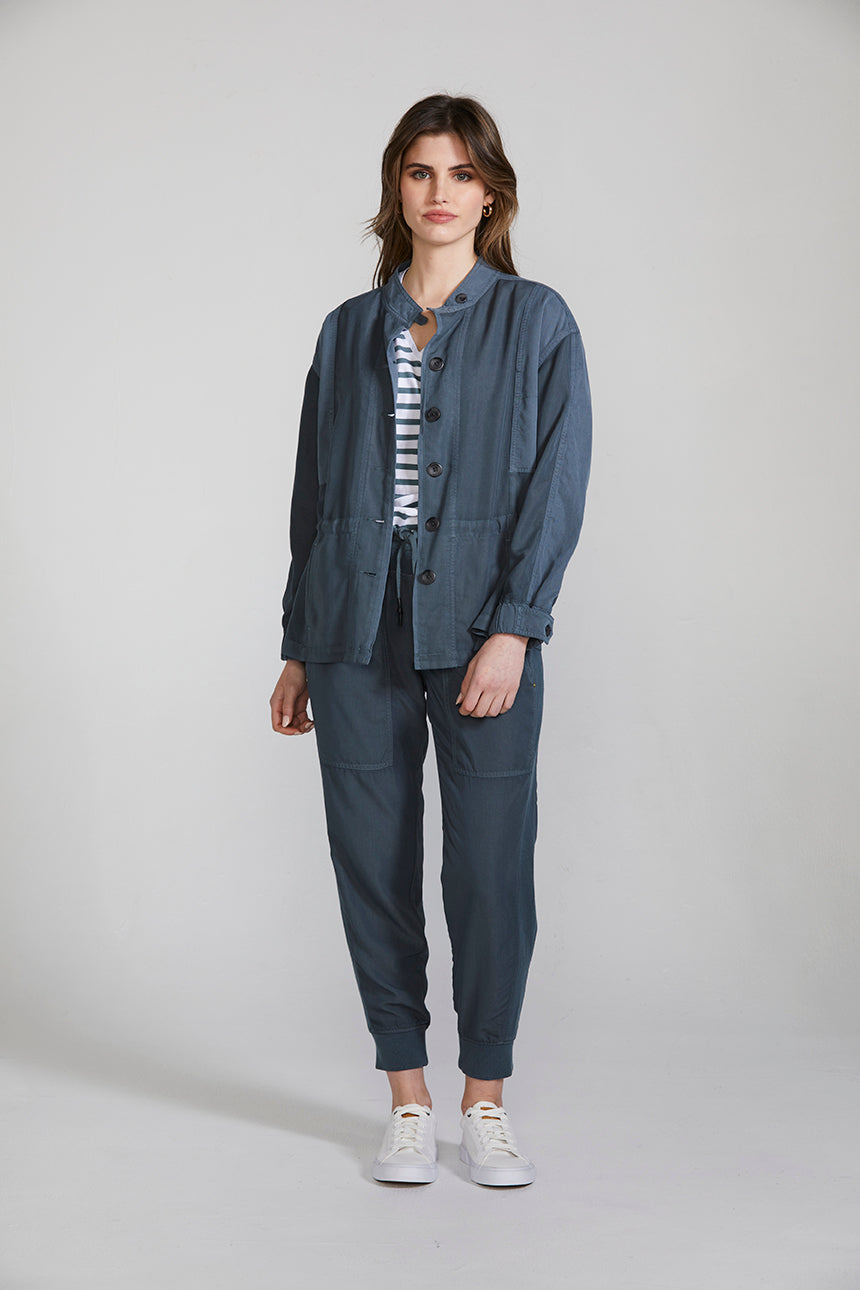 A casual weekend jacket crafted in a lightweight viscose blend, featuring contrast panelling, heavy topstitch detailing and two-tone horn buttons. The drawstring around the waist cinches in to create shape. This jacket can be worn as a set with the Marriott Jogger or separately with your favourite jeans and a white tee.