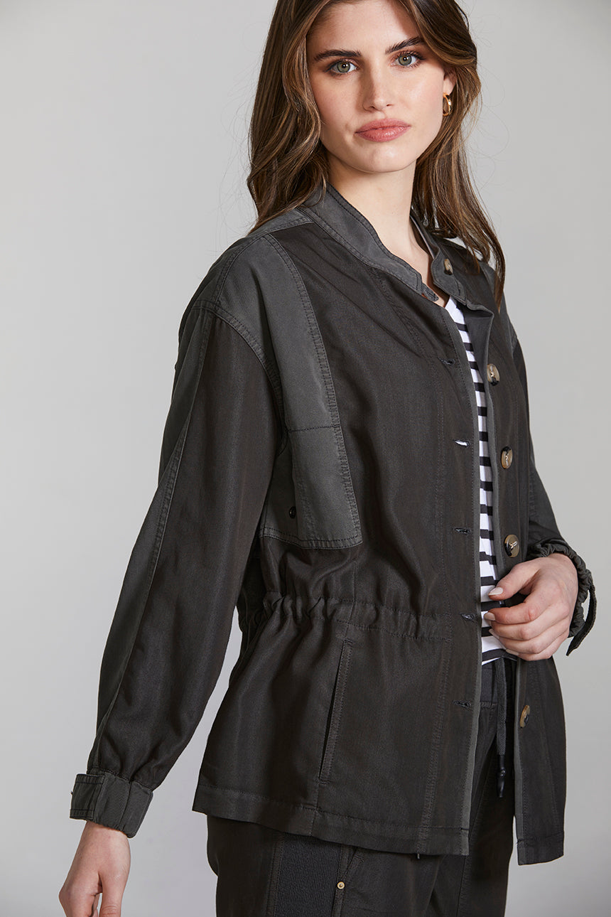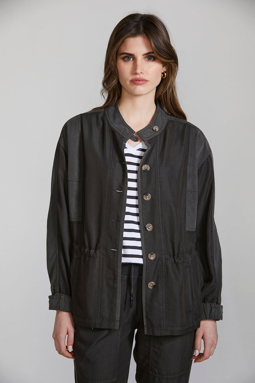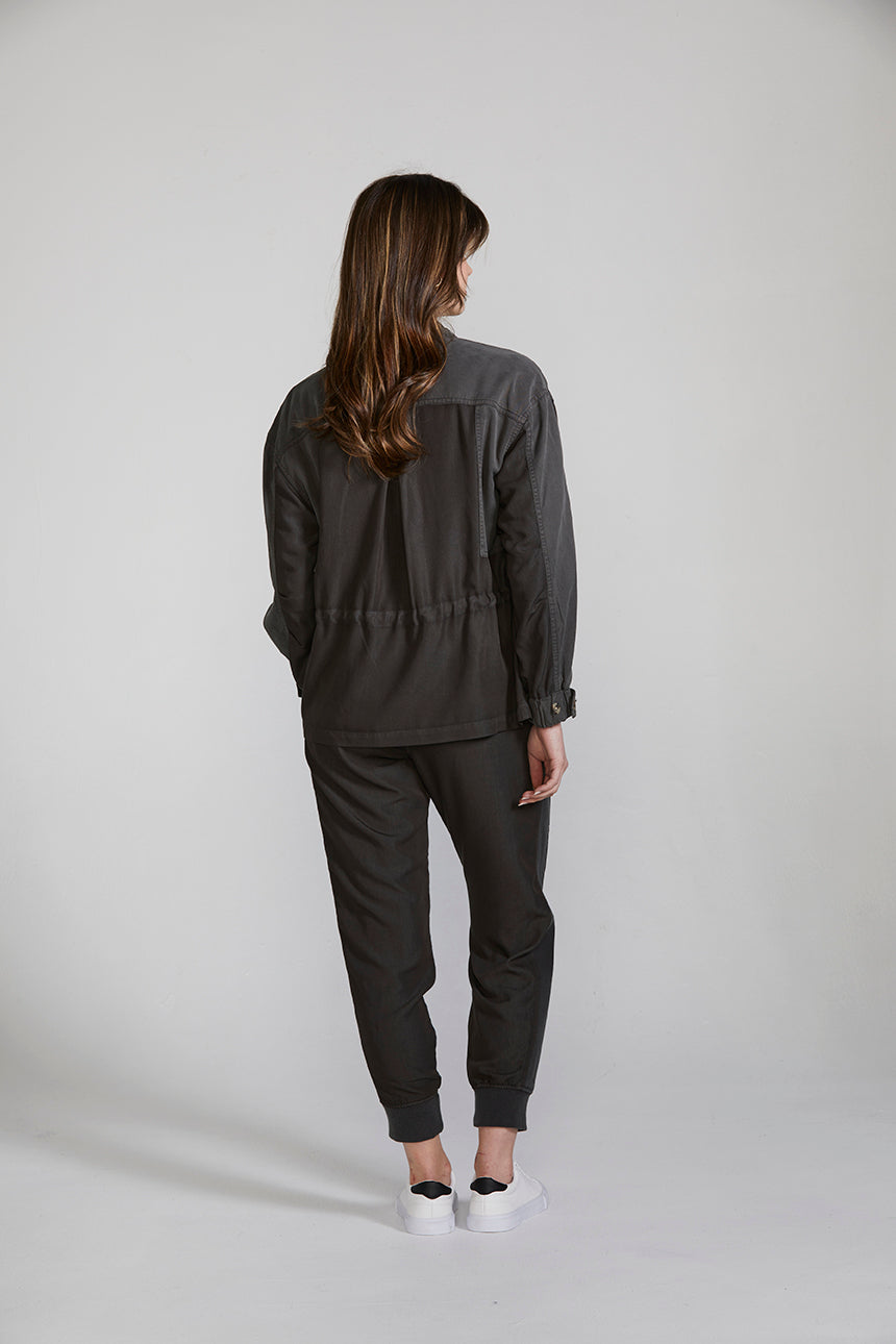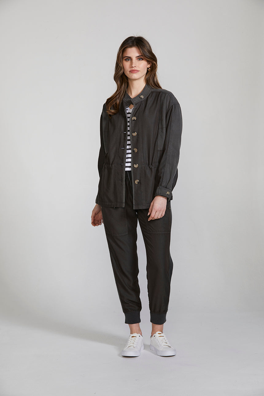 A casual weekend jacket crafted in a lightweight viscose blend, featuring contrast panelling, heavy topstitch detailing and two-tone horn buttons. The drawstring around the waist cinches in to create shape. This jacket can be worn as a set with the Marriott Jogger or separately with your favourite jeans and a white tee.