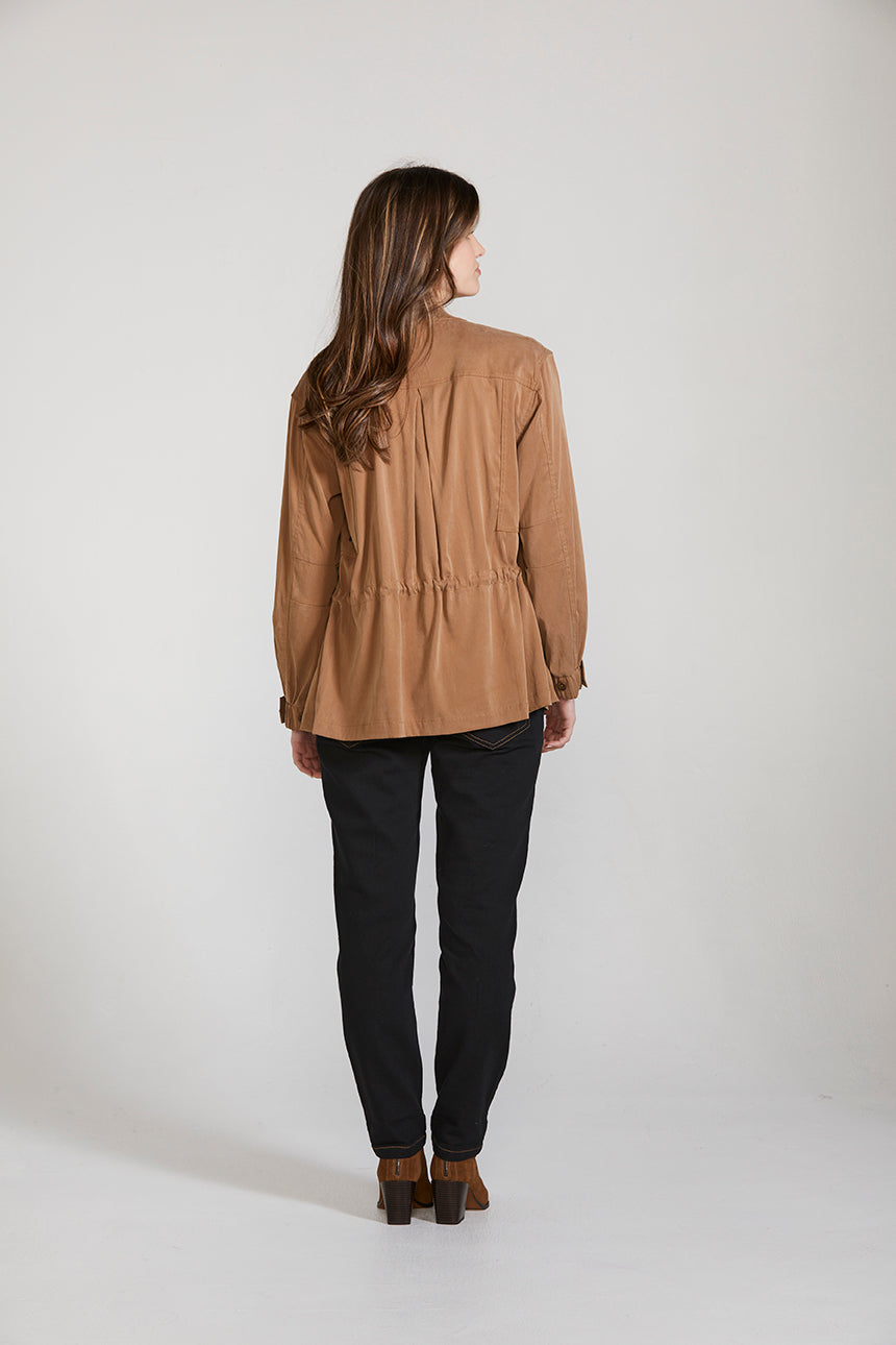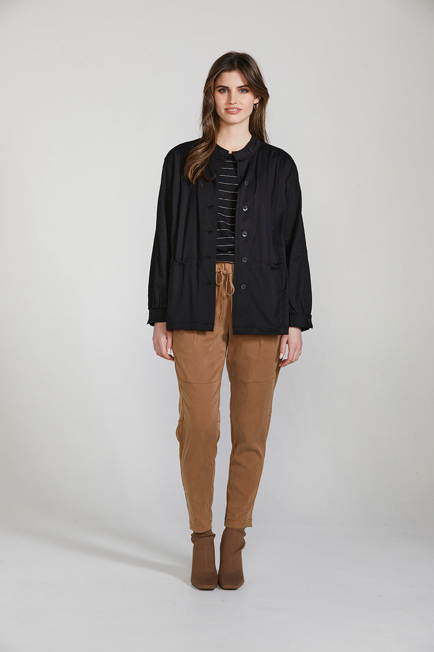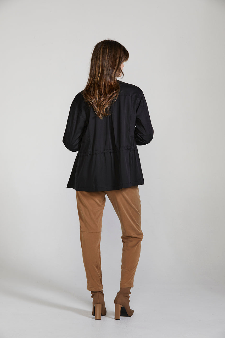 A casual weekend jacket in a lightweight cupro and viscose-blend, featuring relaxed dropped shoulders, heavy topstitch detailing and irregular shape buttons. The drawstring around the waist cinched in creates shape. This jacket can be worn as a set with the Steel Pant or separately with your favourite jeans and a white tee.