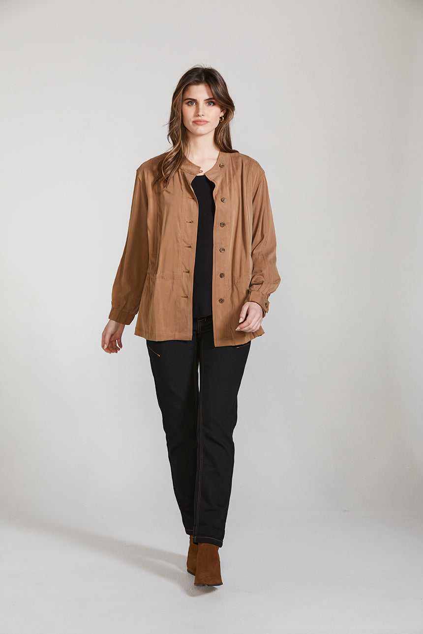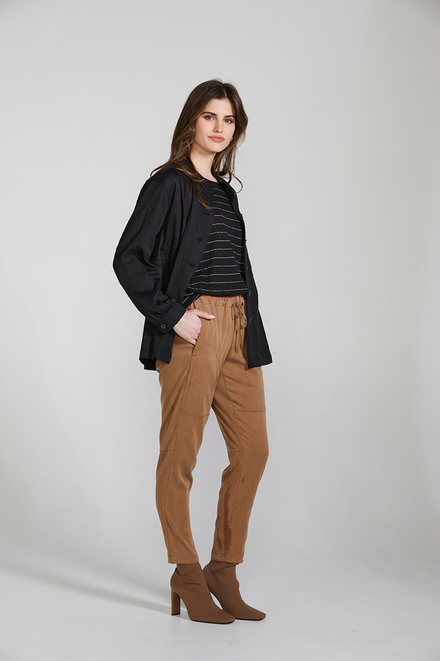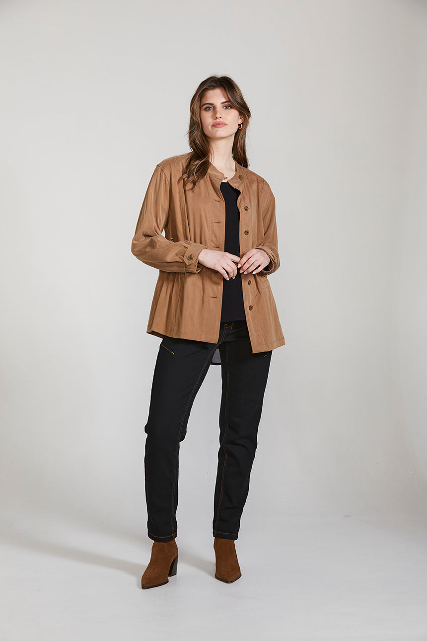 A casual weekend jacket in a lightweight cupro and viscose-blend, featuring relaxed dropped shoulders, heavy topstitch detailing and irregular shape buttons. The drawstring around the waist cinched in creates shape. This jacket can be worn as a set with the Steel Pant or separately with your favourite jeans and a white tee.