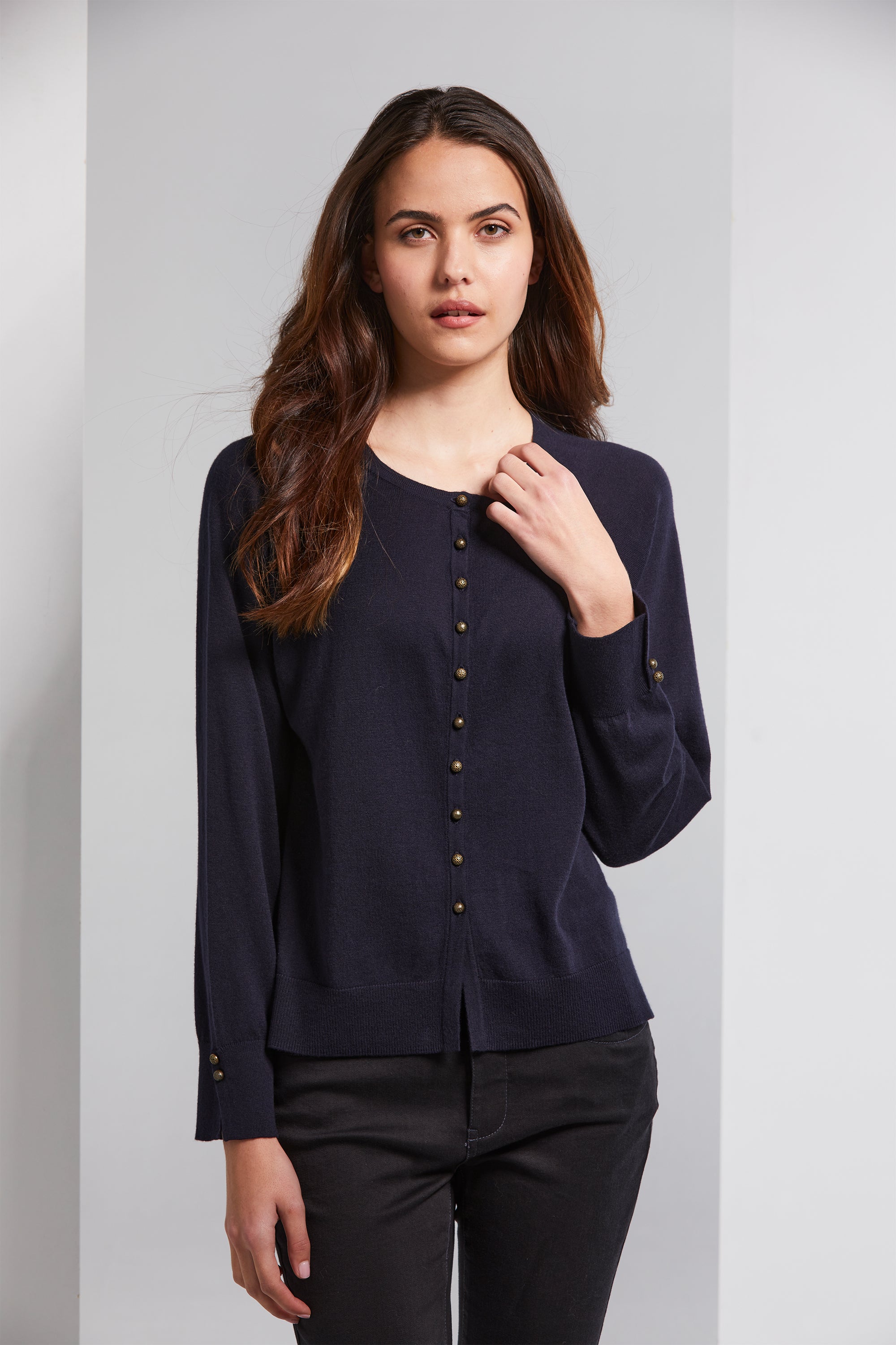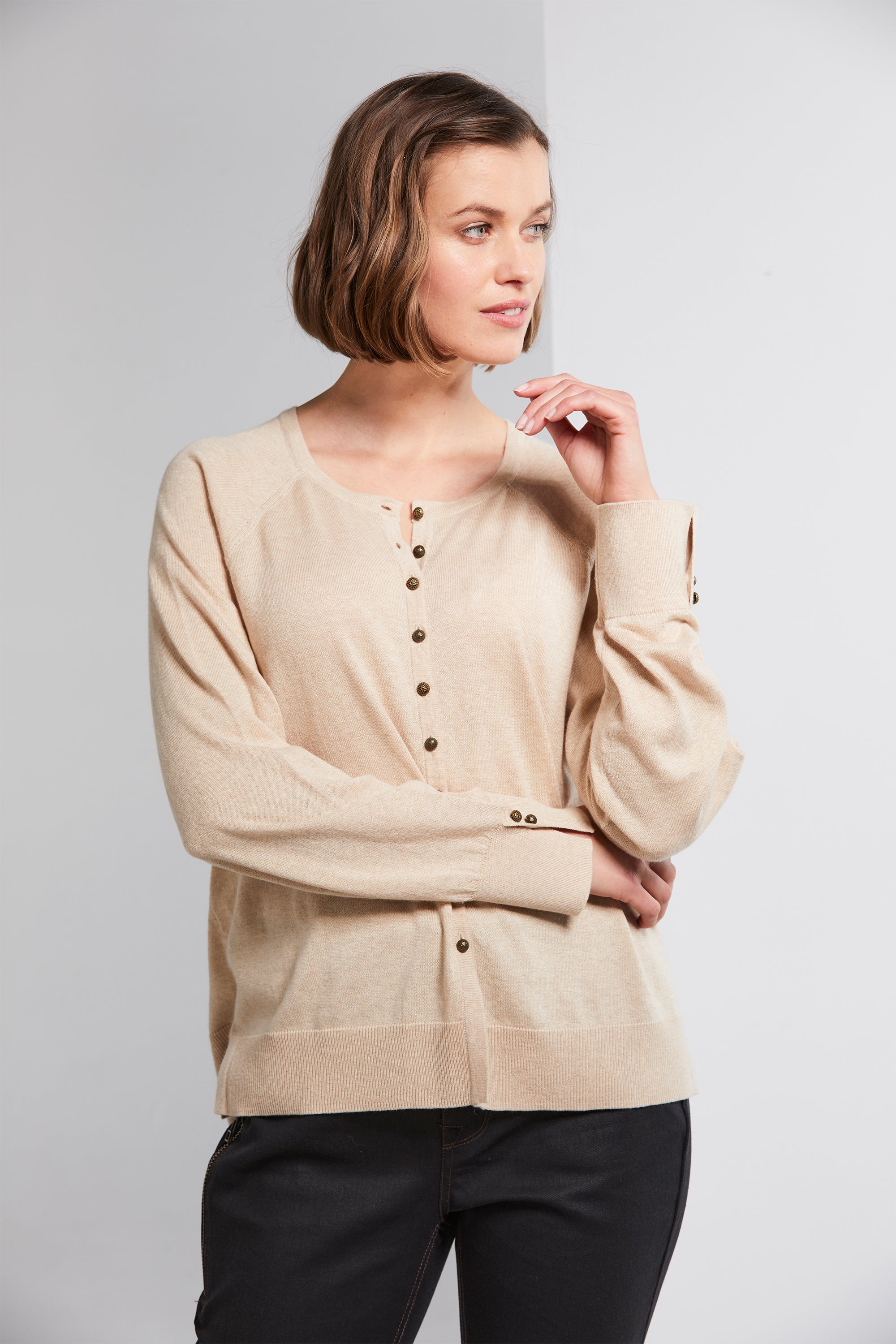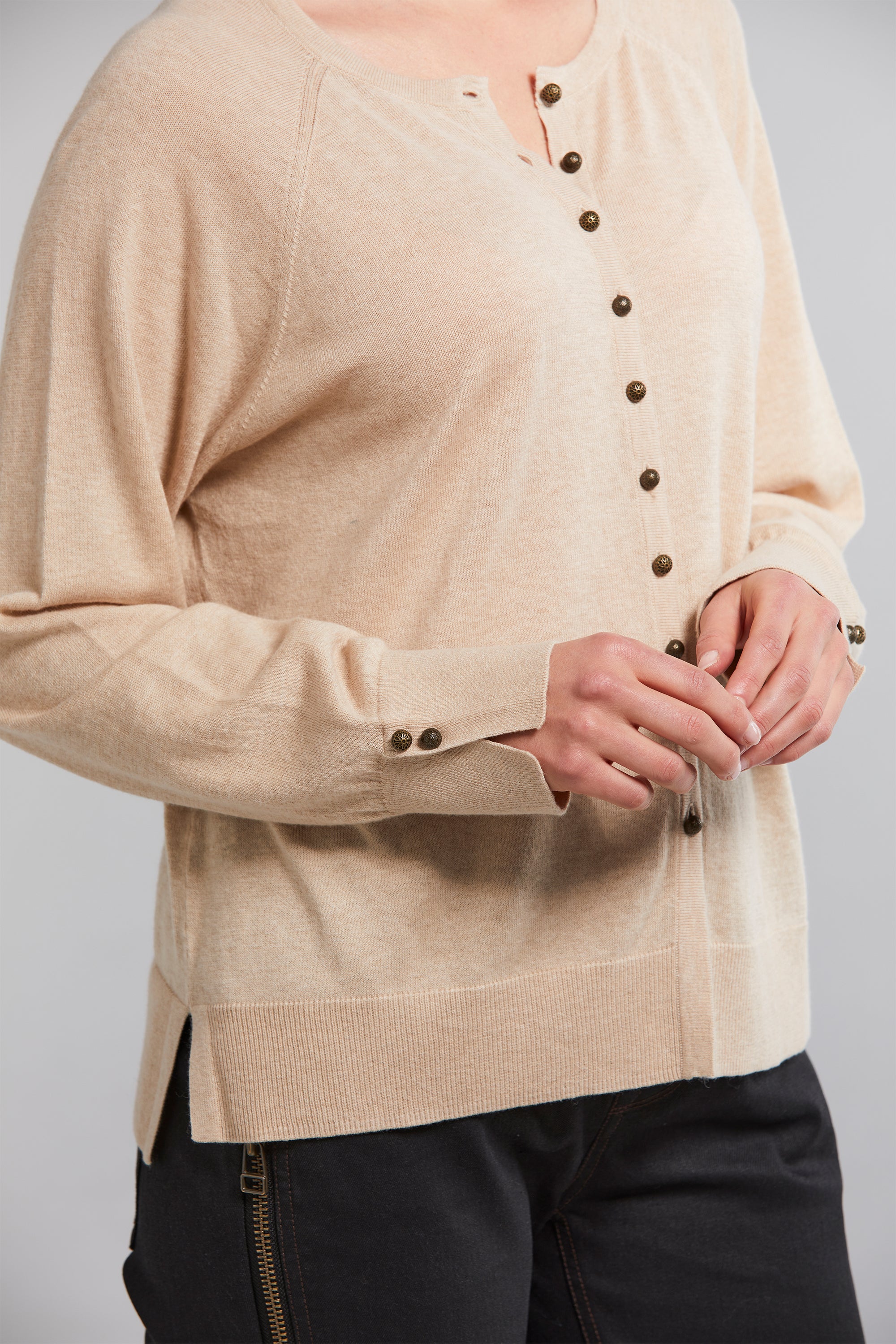The Brussel Cardi combines elegance with comfort. Crafted from a soft organic cotton and cashmere blend, it boasts antique brass engraved metal buttons that grace the front and cuffs. The round neckline adds a classic element, while rib cuffs and hemline offer a comfortable fit. Side splits complete the look, making it a versatile and cozy addition to your wardrobe.