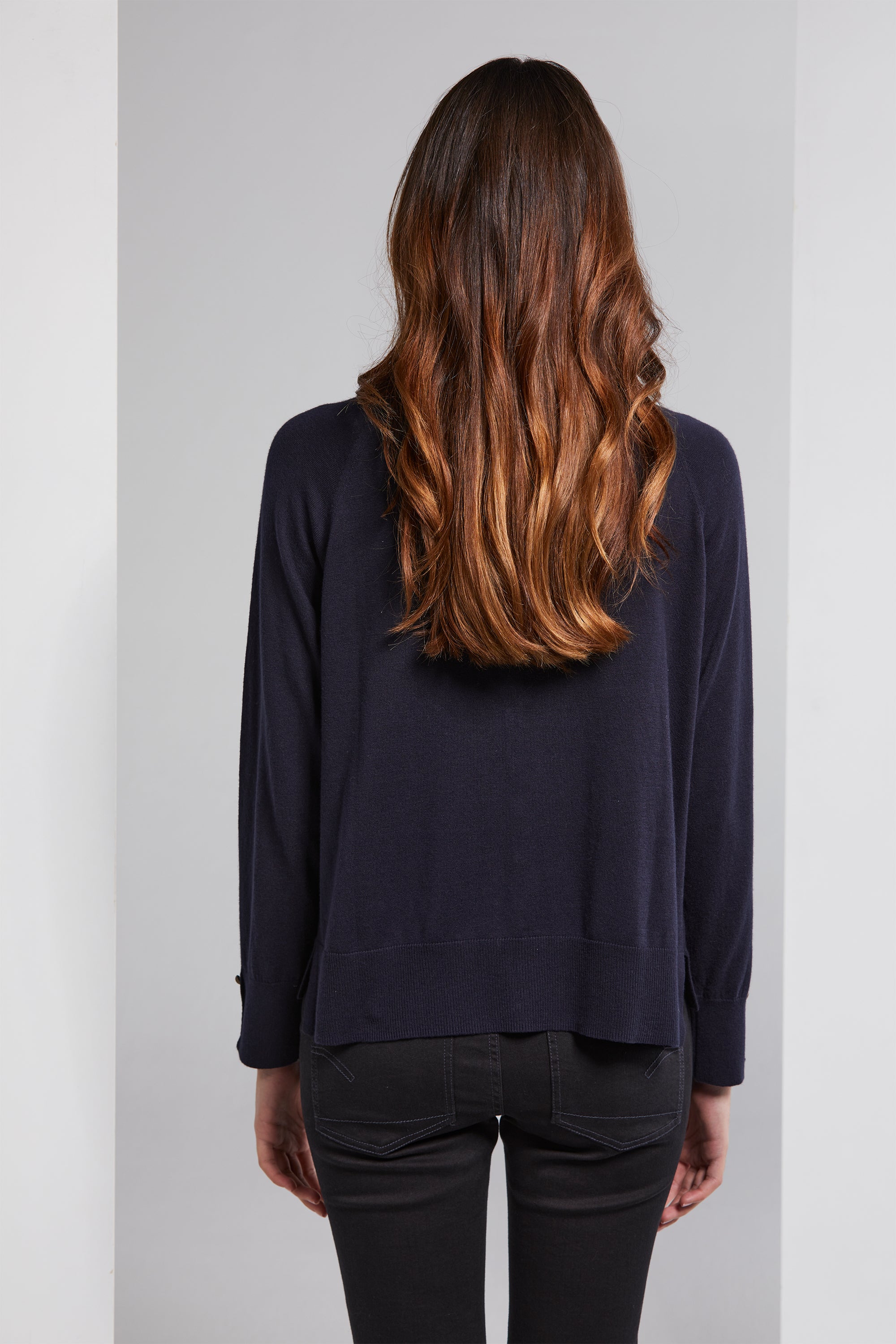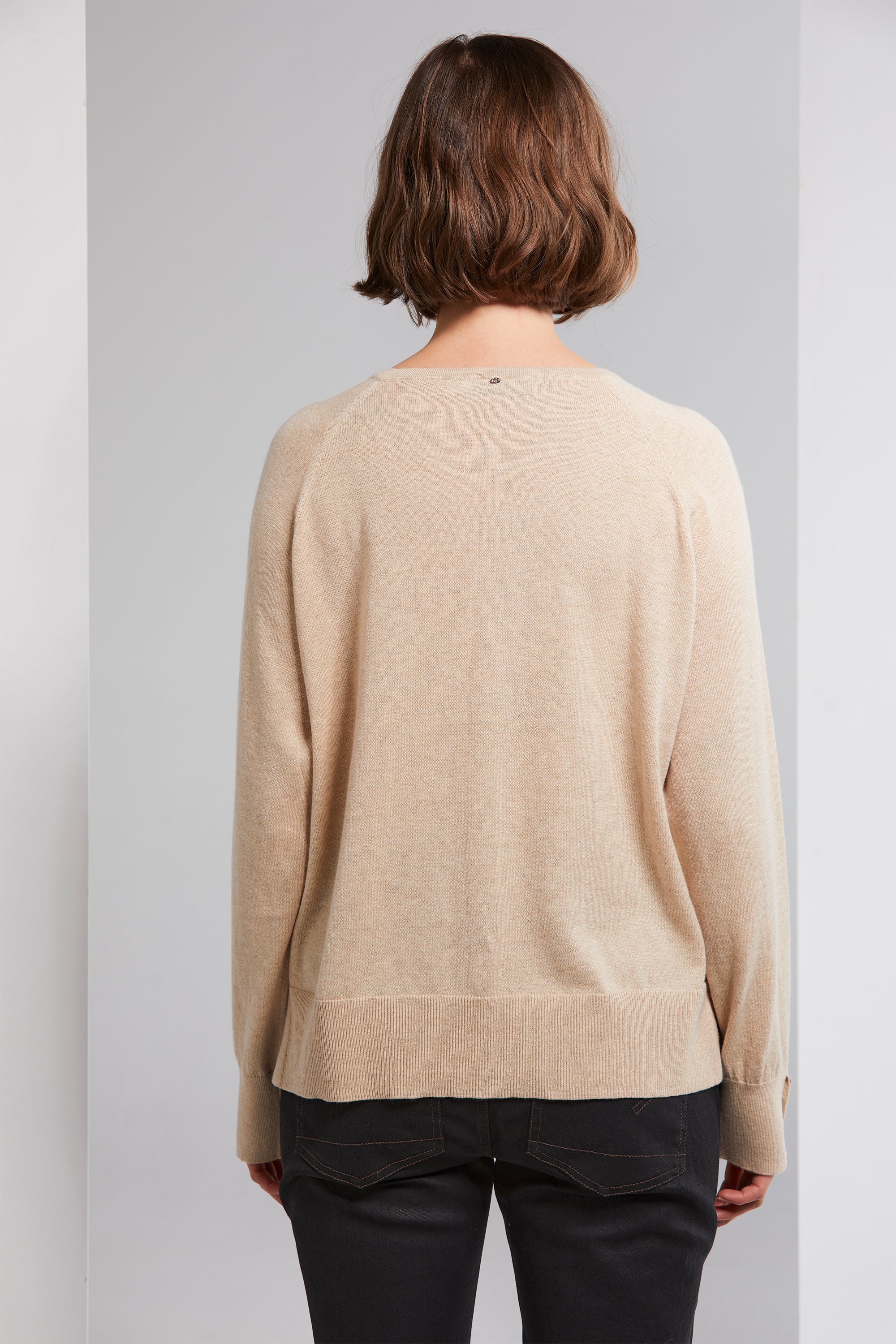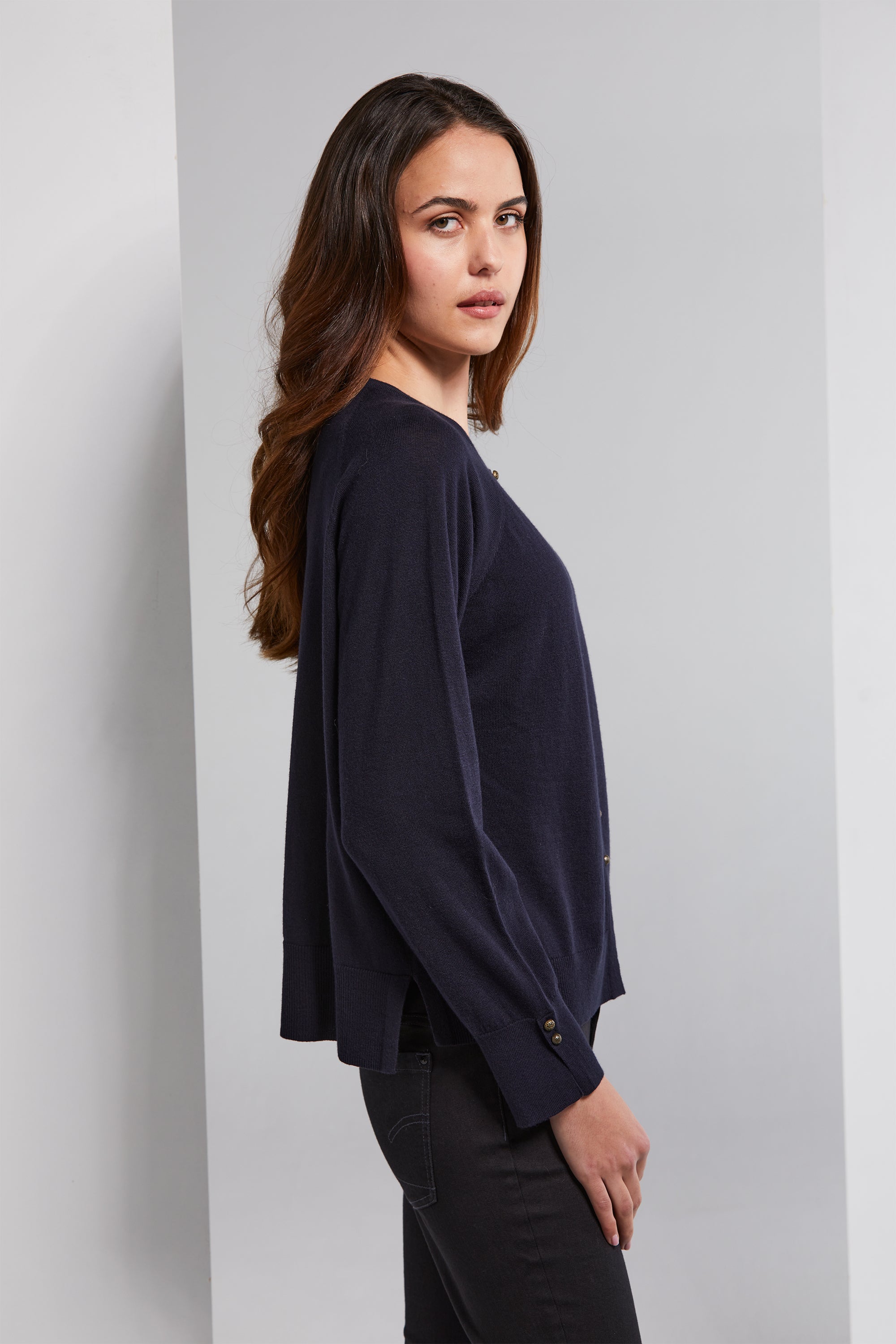 The Brussel Cardi combines elegance with comfort. Crafted from a soft organic cotton and cashmere blend, it boasts antique brass engraved metal buttons that grace the front and cuffs. The round neckline adds a classic element, while rib cuffs and hemline offer a comfortable fit. Side splits complete the look, making it a versatile and cozy addition to your wardrobe.