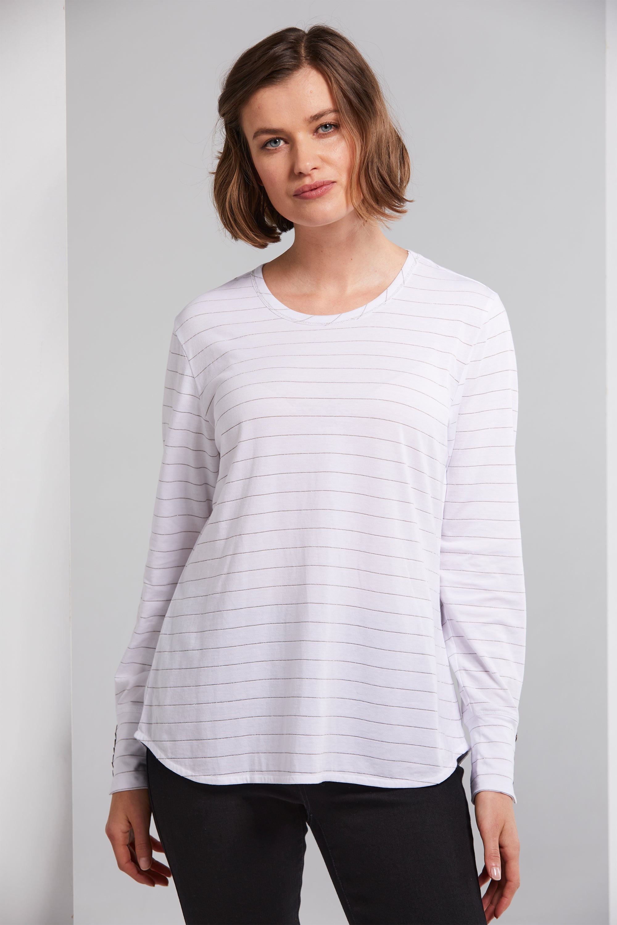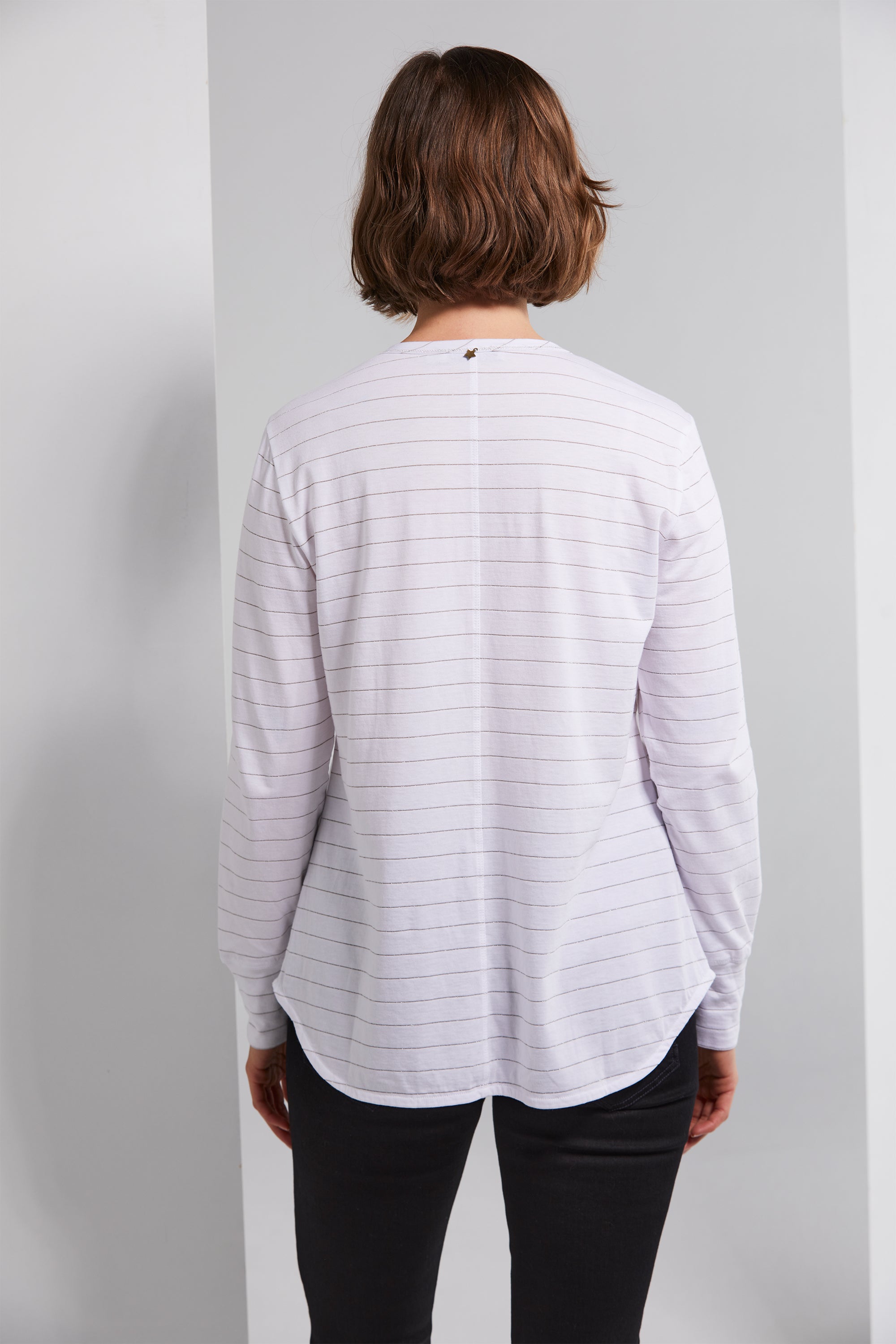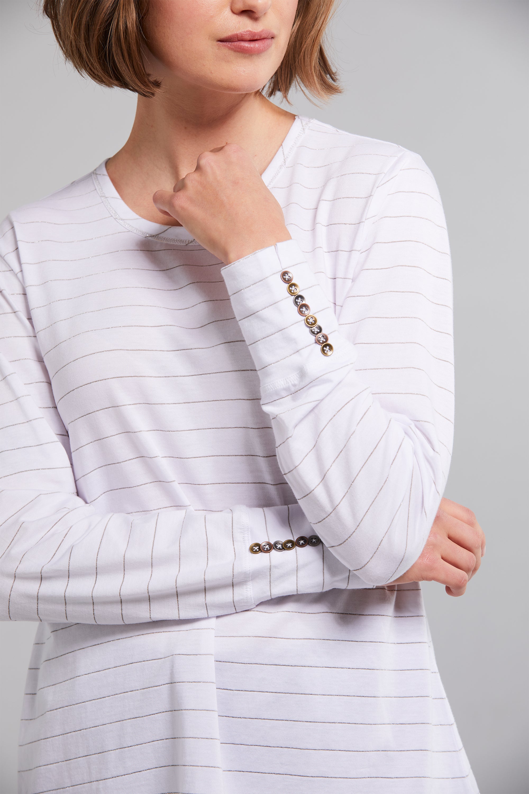 Embrace subtle elegance with the Cade Top. This white top features metallic stripes, adding a touch of sophistication to your look. It boasts a round crew neckline and a rounded hem, creating a classic silhouette. The metal button detailing at the cuff in various metallic shades adds a unique and stylish element. To complete the look, a star charm adorns the back neckline. Crafted from a blend of 50% Tencel and 50% cotton, the Cade Top is a versatile addition to your wardrobe.