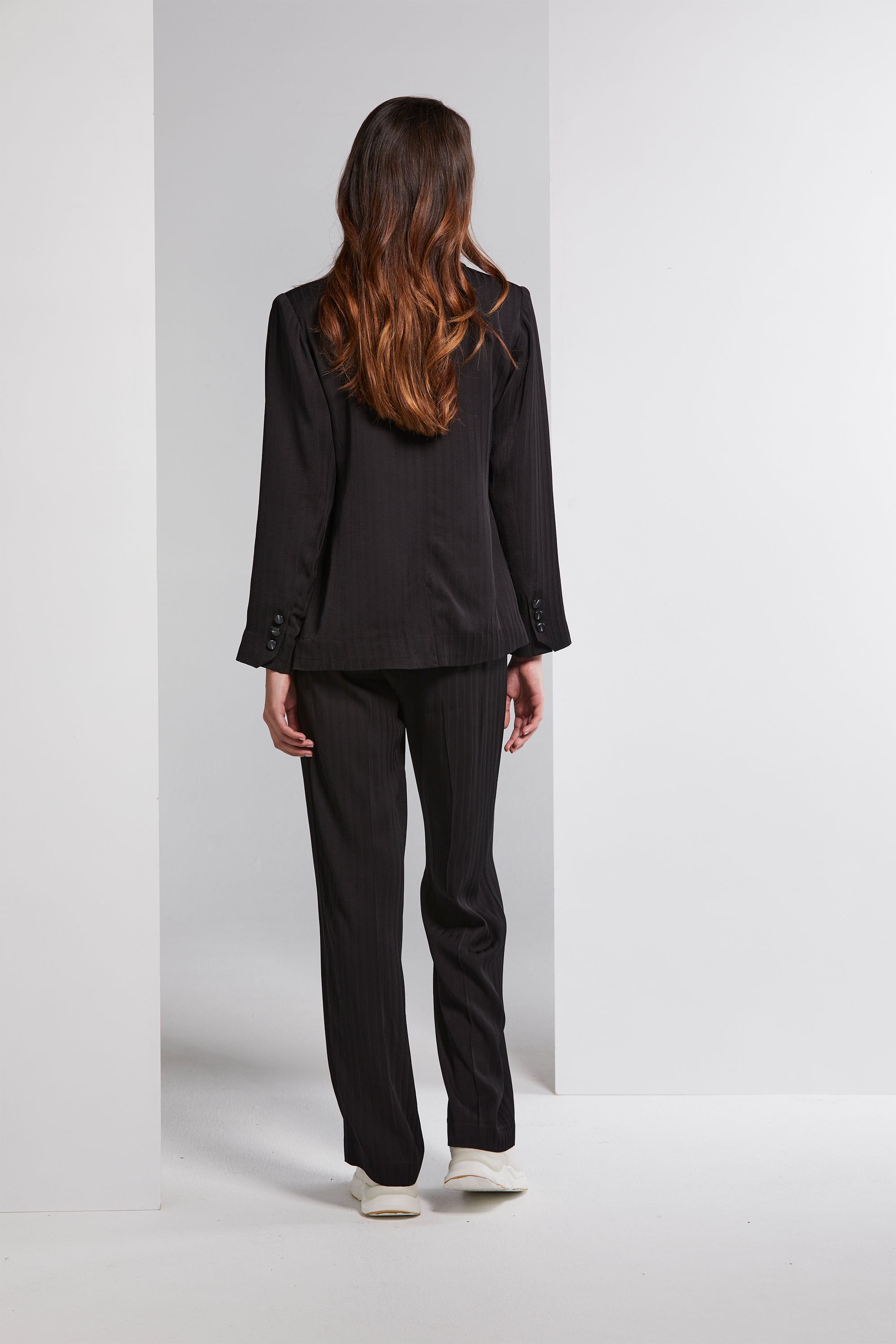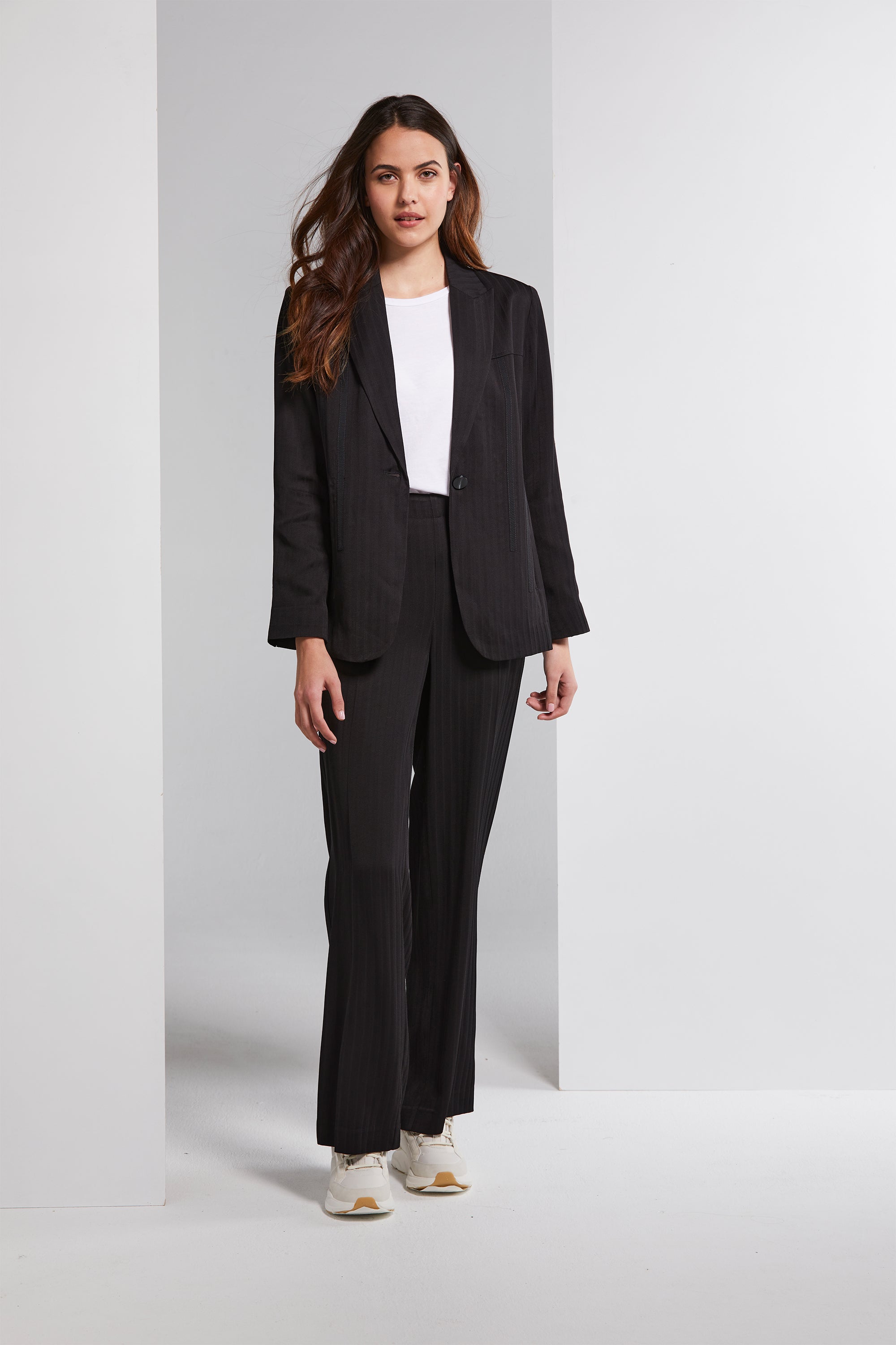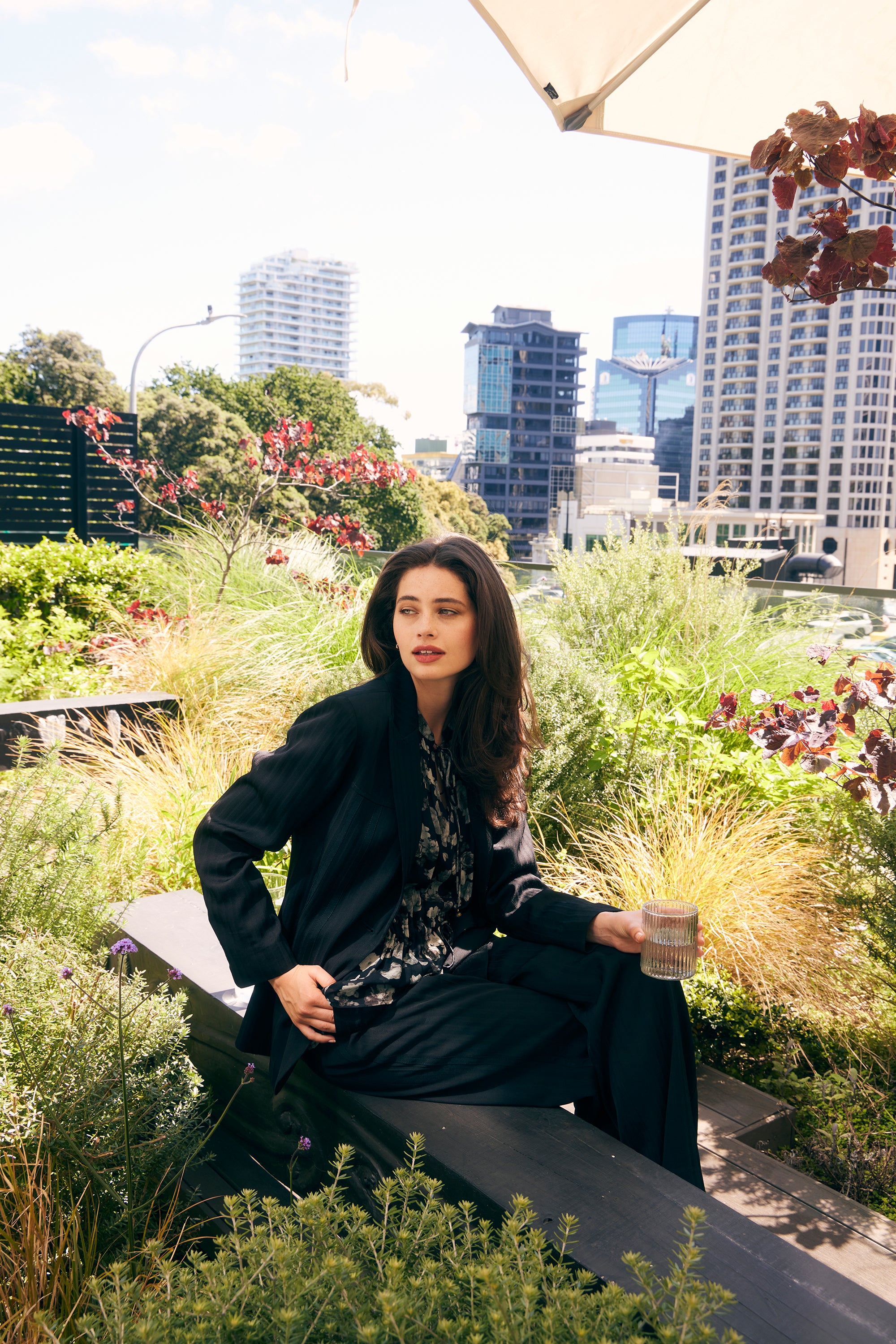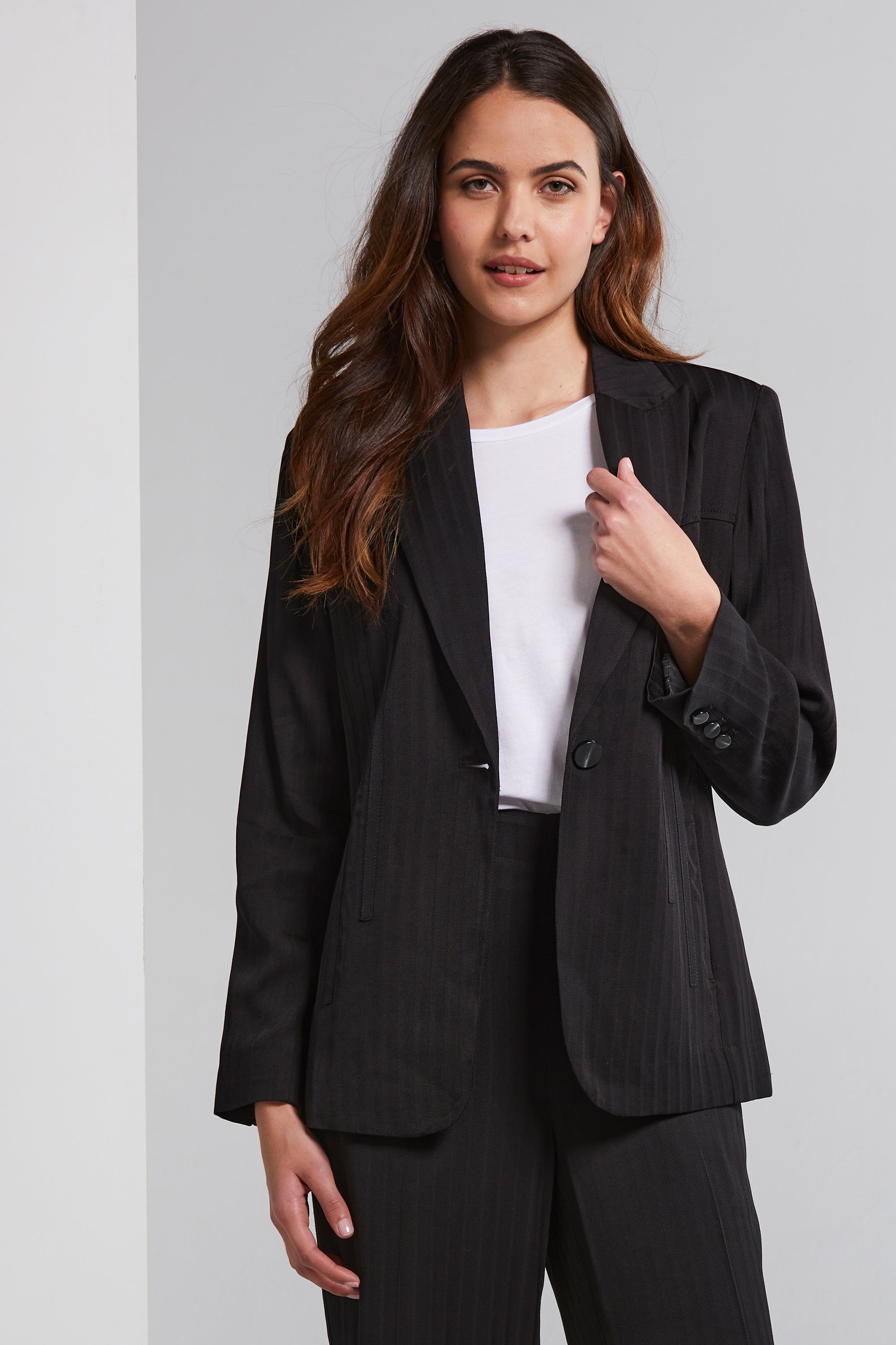 Elevate your style with the Crown Jacket, a longline, single-breasted blazer made from a luxurious viscose rayon blend in a herringbone pattern. Its on-trend tape detailing gracefully runs from the front yoke seam, adding a contemporary touch. The black tortoiseshell flat buttons at the front closure and cuffs complete the look with timeless elegance.